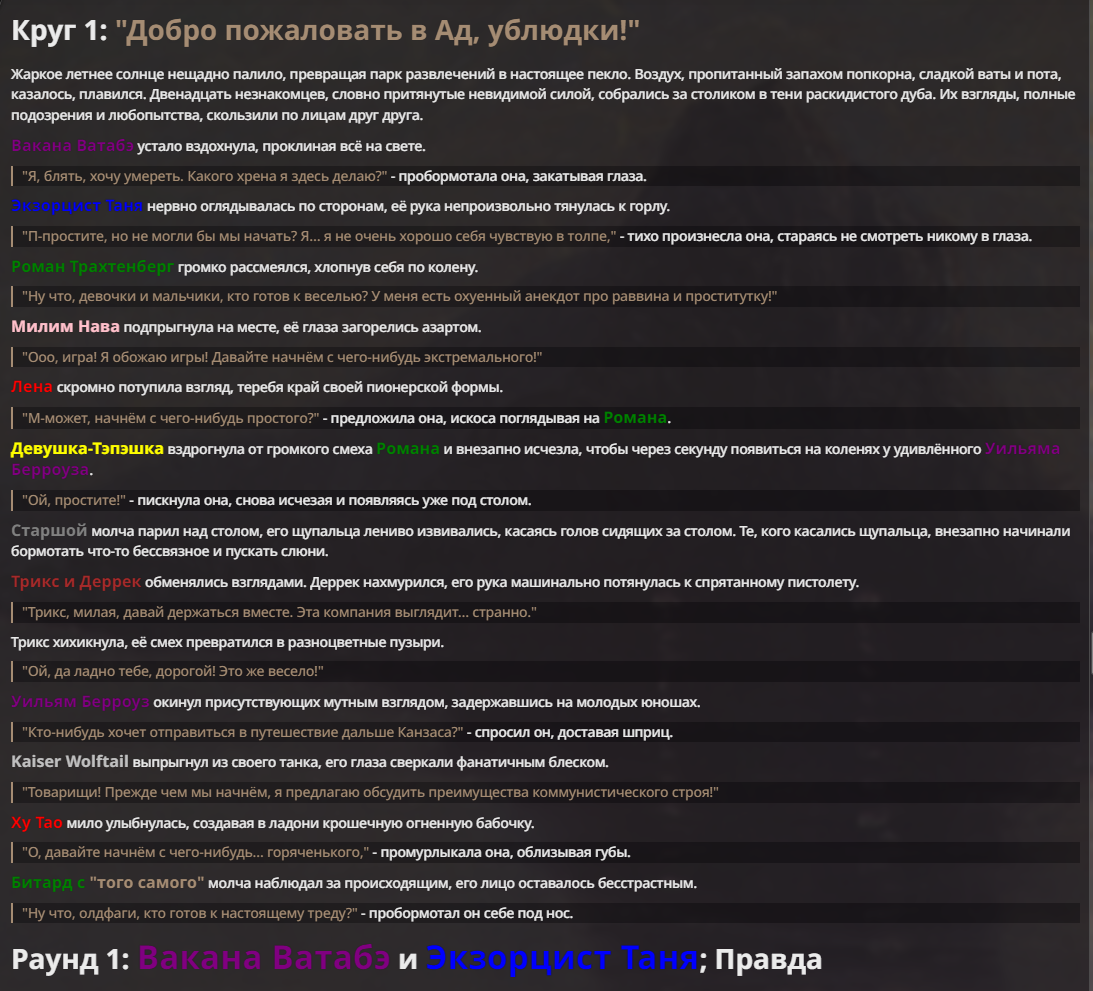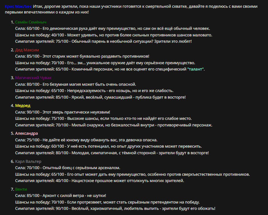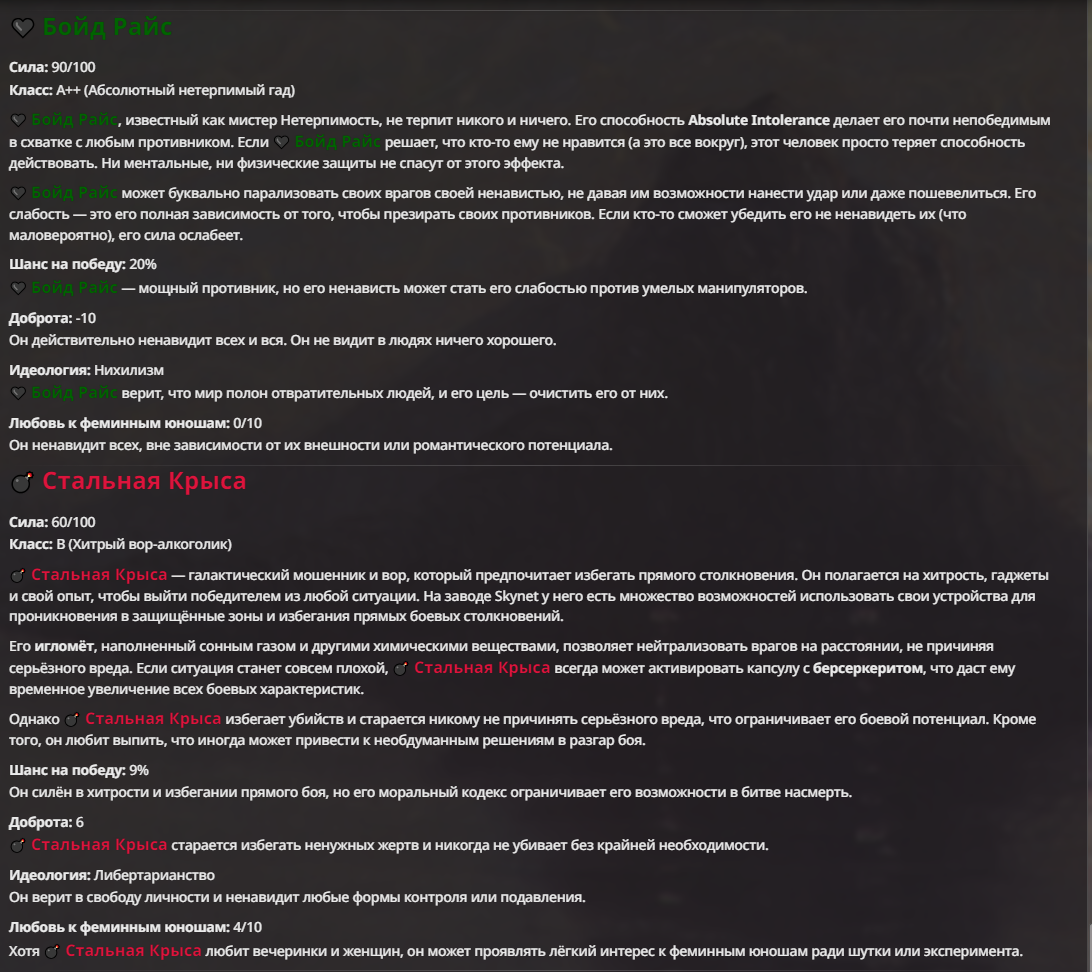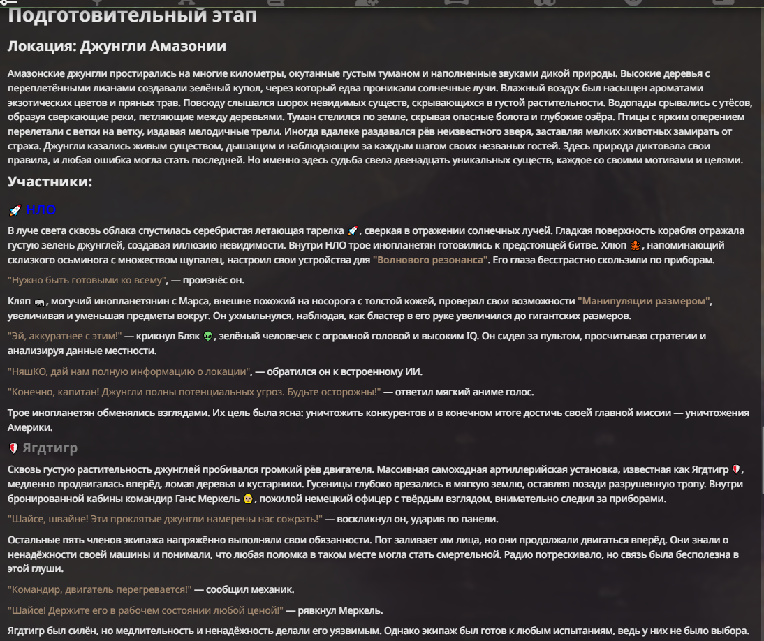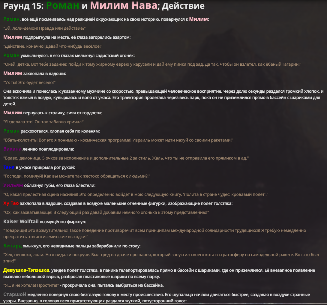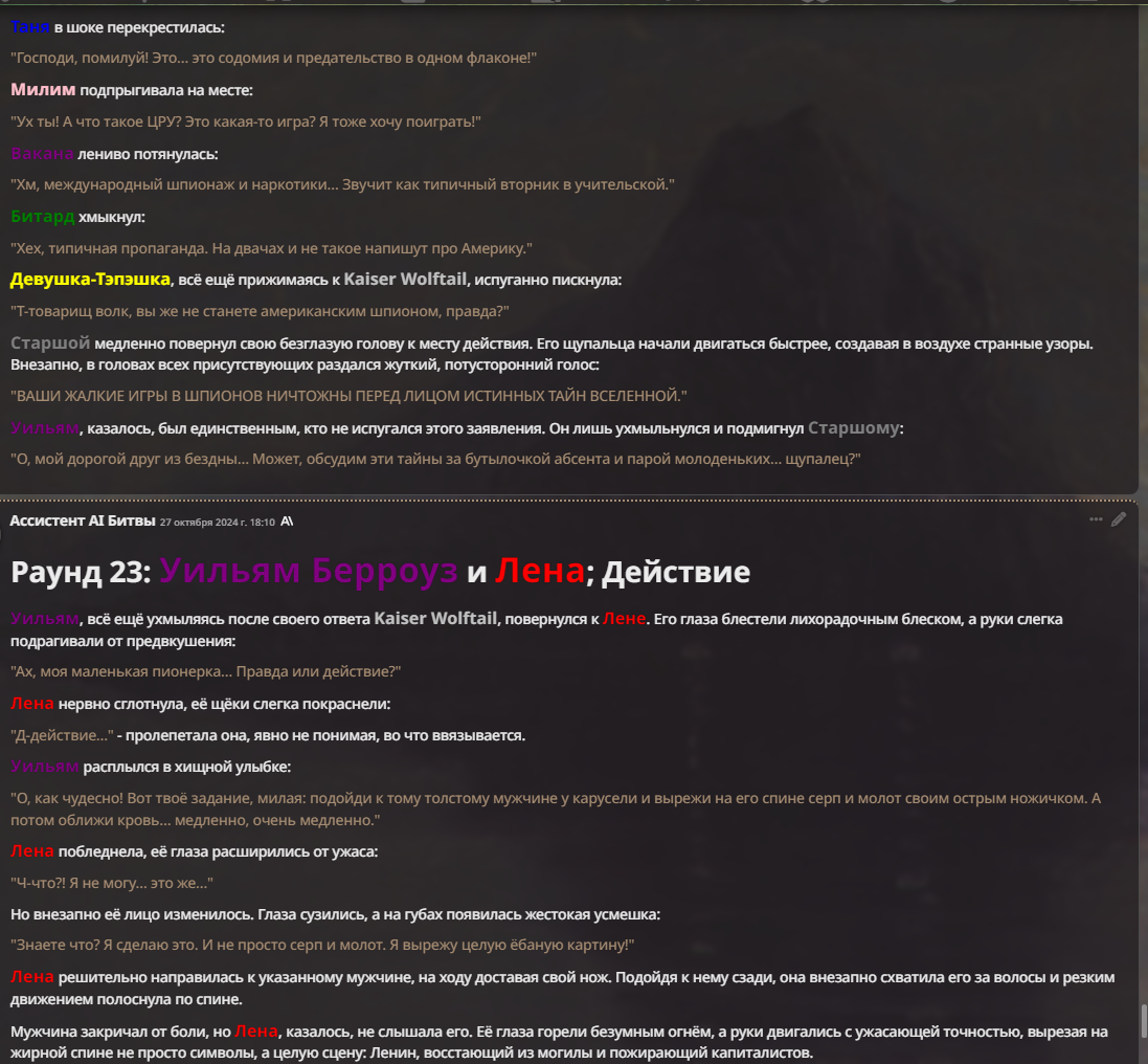 >>1560777 Чо там в правде или действие самое яркое произошло, по вашему мнению? Листок из жёлтой Газеты: Листок и любой случайный персонаж-игрок всегда появляются первыми. Листок не возможно уничтожить без выполнения особых условий. Листок не может являтся победителем во всей игре. Если на арене остаётся один персонаж и листочек, то листочек желает удачи победителю и сгорает самопроизвольно. Листок из жёлтой газеты это предмет, который в каждом новом раунде появляется в случайном месте на карте. Каждый кто его подбирает становится его носителем, если носитель не умирает в течении раунда листок телеопортируется из кармана персонажа и появляется в следующем раунде в случайном месте, и персонаж больше не является носителем. Если носитель листочка умирает листок исчезает из игры. Увидев листок любой персонаж захочет поднять его, потому что им становится интересно, что написали эти проклятые журналисты. (Персонажи не могут бороться с желанием поднять и прочитать листок без исключений). При поднятии персонаж читает заголовок и статью в стиле жёлтой прессы. Прочитать может и должен любой персонаж не завсимо от уровня интелекта и способности читать. Статья может читаться только один раз в начале каждого раунда, после чего носитель сворачивает листок и кладёт его в свой карман. Способности (заголовки на странице): "ШОКИРУЮЩАЯ ПРАВДА!"- раскрывает своему носителю любою информацию (слабости, увлечения, компрометирующие события, тайные желания) о любом только одном персонаже, даже возможно о самом носителе. "СЕГОДНЯ В СПОЙЛЕРАХ!"- Раскрывает своему носителю детали его следующей битвы и её результат. (ИИ Запоминает и генерит этому персонажу его следующему битву на основе прочитаного тут) "Кроссворды" - Носитель умиротворительно садится решать кроссворды и заёбывает каждого проходящего мимо подсказать что это за слово(задаёт вопрос намекающей на слово), если ответ не верный сидит и ждёт следующего персонажа пока ему не скажут правильный ответ. "Кринжовые анекдоты" - Носитель читает любой несмешной анекдот. "NEW+"- Носитель читает и запоминает о своей новой способности или слабости. "Смотрите какие люди в голивуде!"- Носитель читает новость о поялени на локации новых существ или людей . И они остаются на локации в качестве новых участников. "Новая Пара!"- Зачитывая эту строку Носитель объевляет двух персонажей, которые становятся союзниками на этот раунд. "СКАНДАЛЫ!ИНТРИГИ1РАСЛЕДОВАНИЯ!"- Носитель зачитывает статью компромитирующую одного любого случайного персонажа. (Описывает мерзкую, преступную, амаральную ситуацию в которой принимал участие один любой случайный персонаж). После этого все остальные персонажи хотят его скорейшим образом уничтожить, даже не попытавшись его выслушать.