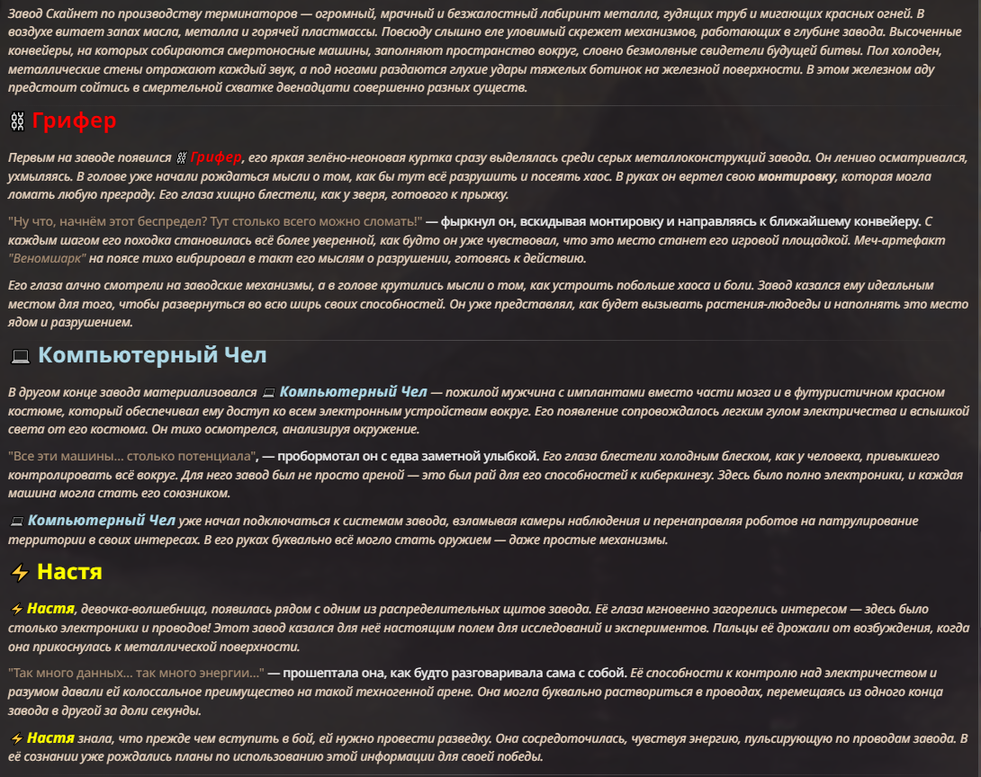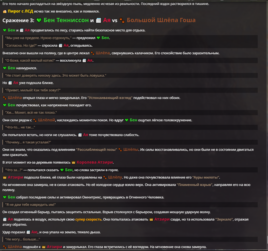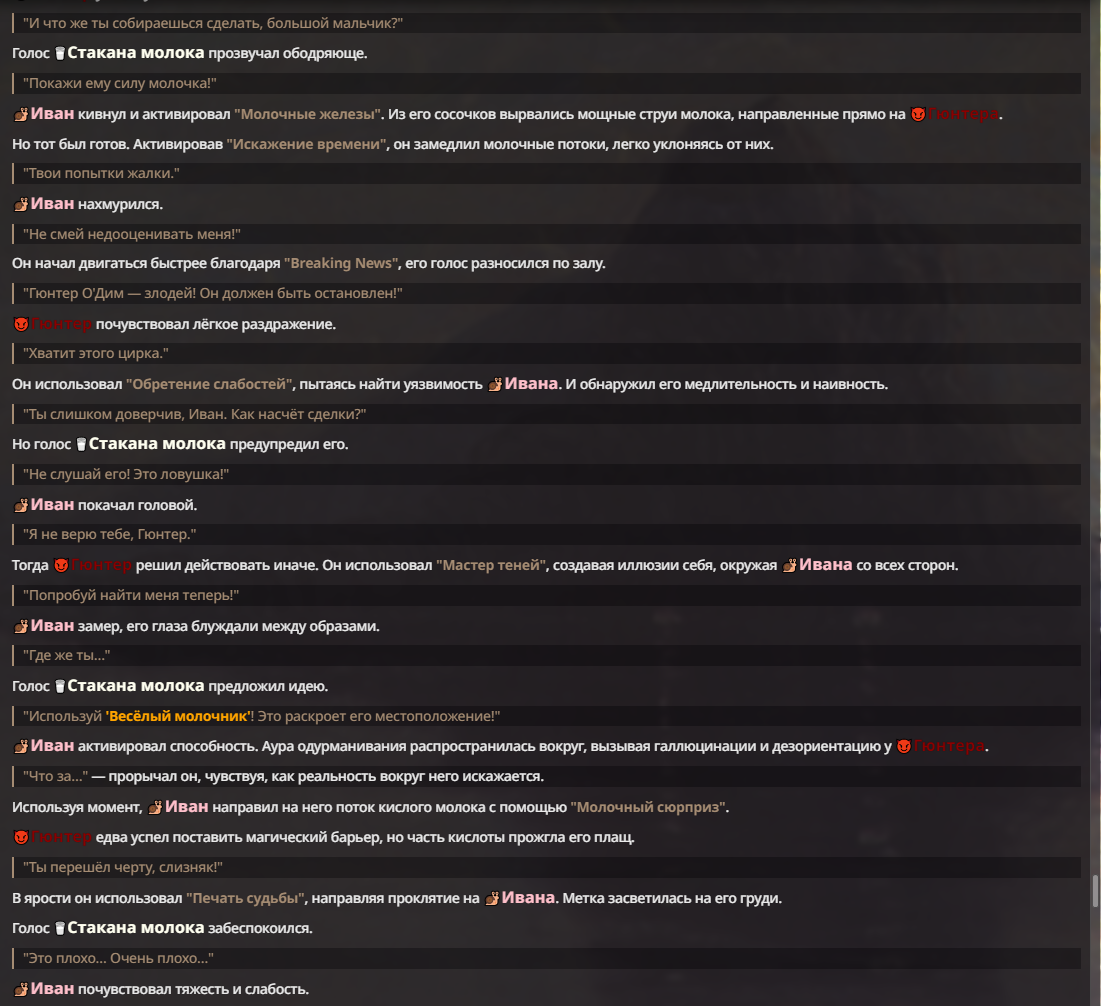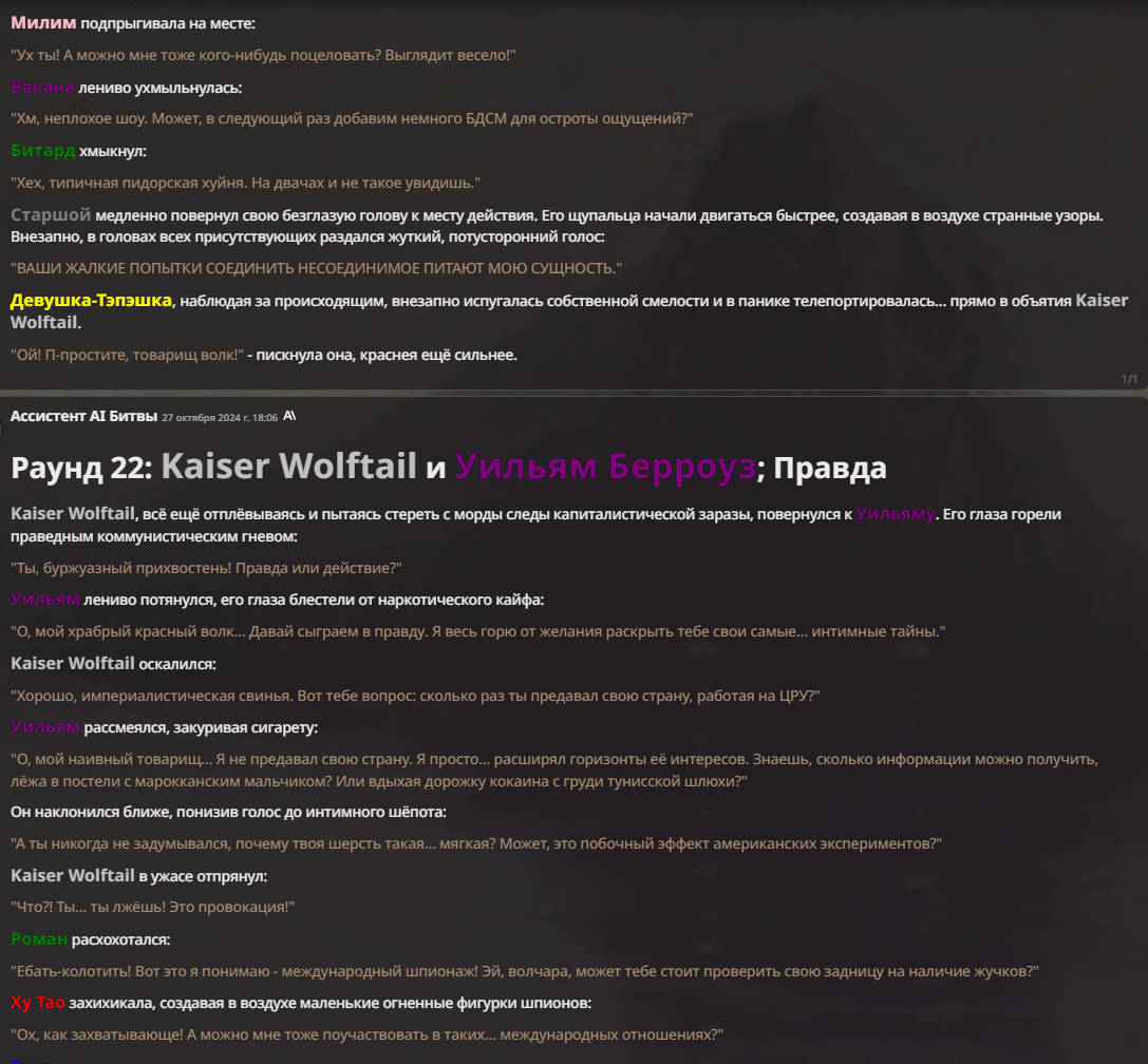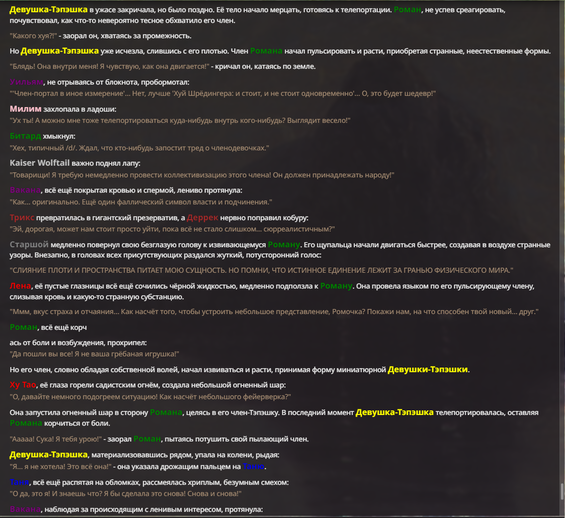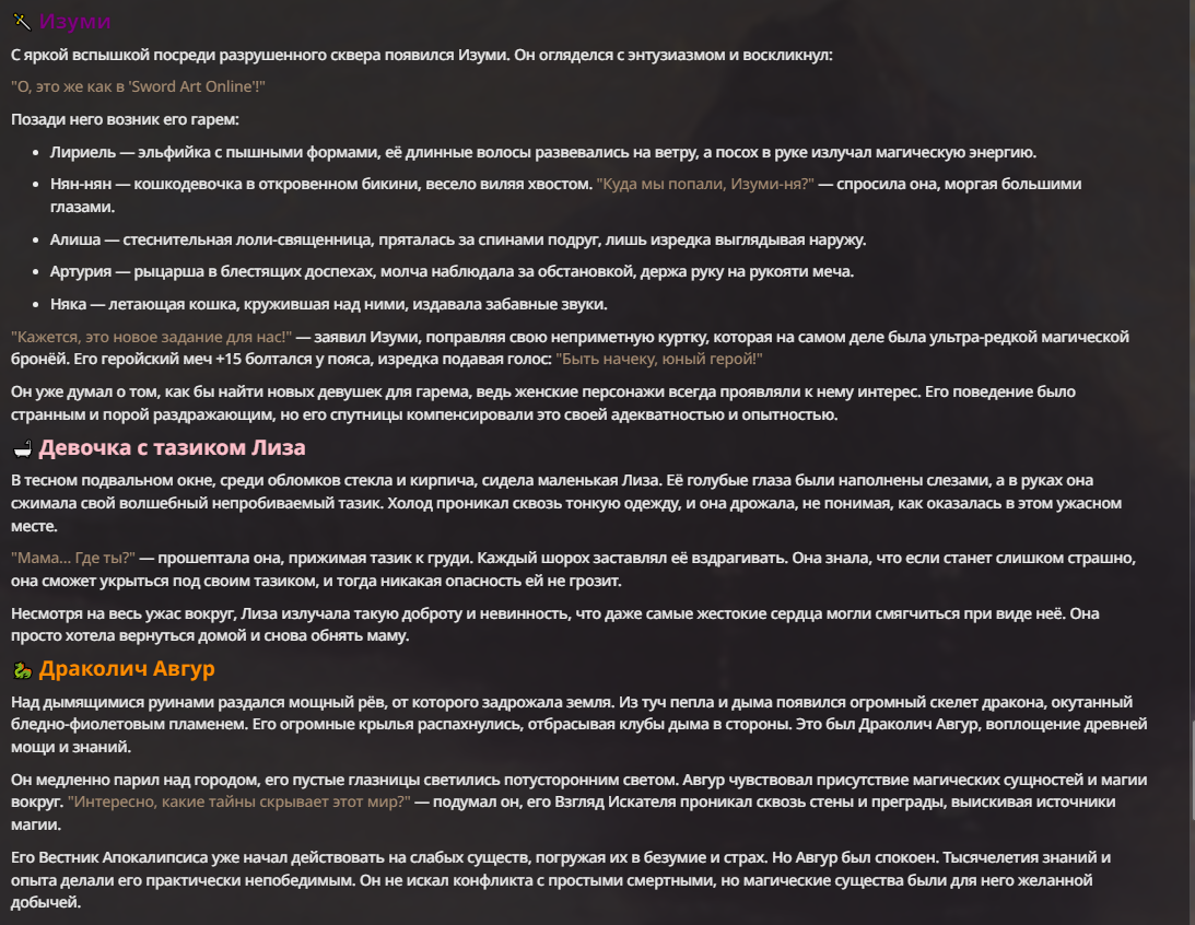 >>1560777 Чо там в правде или действие самое яркое произошло, по вашему мнению? Листок из жёлтой Газеты: Листок и любой случайный персонаж-игрок всегда появляются первыми. Листок не возможно уничтожить без выполнения особых условий. Листок не может являтся победителем во всей игре. Если на арене остаётся один персонаж и листочек, то листочек желает удачи победителю и сгорает самопроизвольно. Листок из жёлтой газеты это предмет, который в каждом новом раунде появляется в случайном месте на карте. Каждый кто его подбирает становится его носителем, если носитель не умирает в течении раунда листок телеопортируется из кармана персонажа и появляется в следующем раунде в случайном месте, и персонаж больше не является носителем. Если носитель листочка умирает листок исчезает из игры. Увидев листок любой персонаж захочет поднять его, потому что им становится интересно, что написали эти проклятые журналисты. (Персонажи не могут бороться с желанием поднять и прочитать листок без исключений). При поднятии персонаж читает заголовок и статью в стиле жёлтой прессы. Прочитать может и должен любой персонаж не завсимо от уровня интелекта и способности читать. Статья может читаться только один раз в начале каждого раунда, после чего носитель сворачивает листок и кладёт его в свой карман. Способности (заголовки на странице): "ШОКИРУЮЩАЯ ПРАВДА!"- раскрывает своему носителю любою информацию (слабости, увлечения, компрометирующие события, тайные желания) о любом только одном персонаже, даже возможно о самом носителе. "СЕГОДНЯ В СПОЙЛЕРАХ!"- Раскрывает своему носителю детали его следующей битвы и её результат. (ИИ Запоминает и генерит этому персонажу его следующему битву на основе прочитаного тут) "Кроссворды" - Носитель умиротворительно садится решать кроссворды и заёбывает каждого проходящего мимо подсказать что это за слово(задаёт вопрос намекающей на слово), если ответ не верный сидит и ждёт следующего персонажа пока ему не скажут правильный ответ. "Кринжовые анекдоты" - Носитель читает любой несмешной анекдот. "NEW+"- Носитель читает и запоминает о своей новой способности или слабости. "Смотрите какие люди в голивуде!"- Носитель читает новость о поялени на локации новых существ или людей . И они остаются на локации в качестве новых участников. "Новая Пара!"- Зачитывая эту строку Носитель объевляет двух персонажей, которые становятся союзниками на этот раунд. "СКАНДАЛЫ!ИНТРИГИ1РАСЛЕДОВАНИЯ!"- Носитель зачитывает статью компромитирующую одного любого случайного персонажа. (Описывает мерзкую, преступную, амаральную ситуацию в которой принимал участие один любой случайный персонаж). После этого все остальные персонажи хотят его скорейшим образом уничтожить, даже не попытавшись его выслушать.