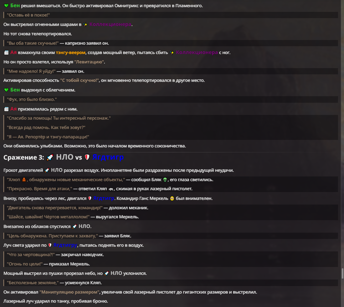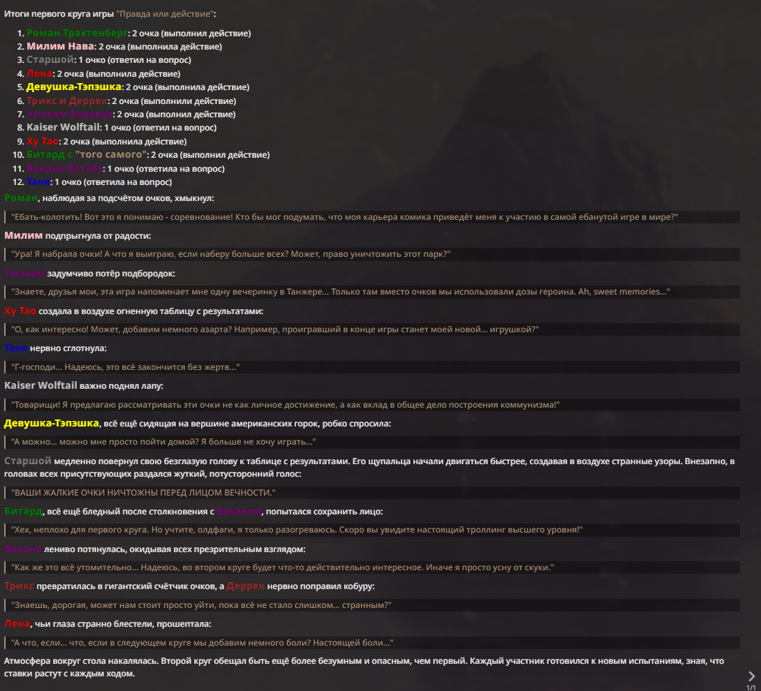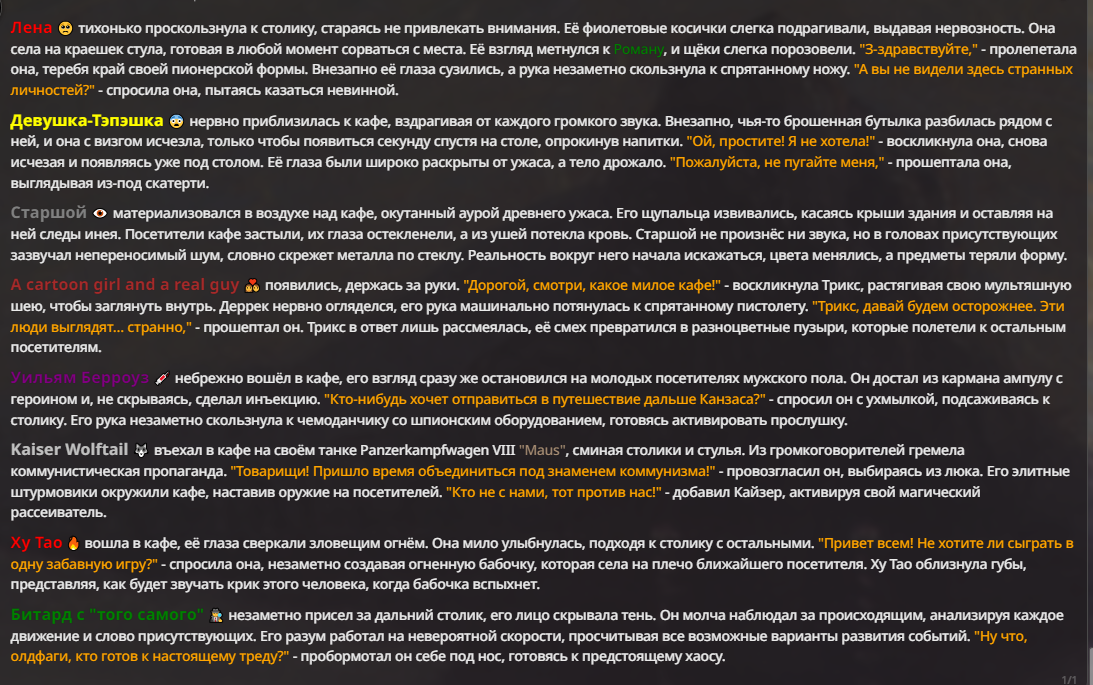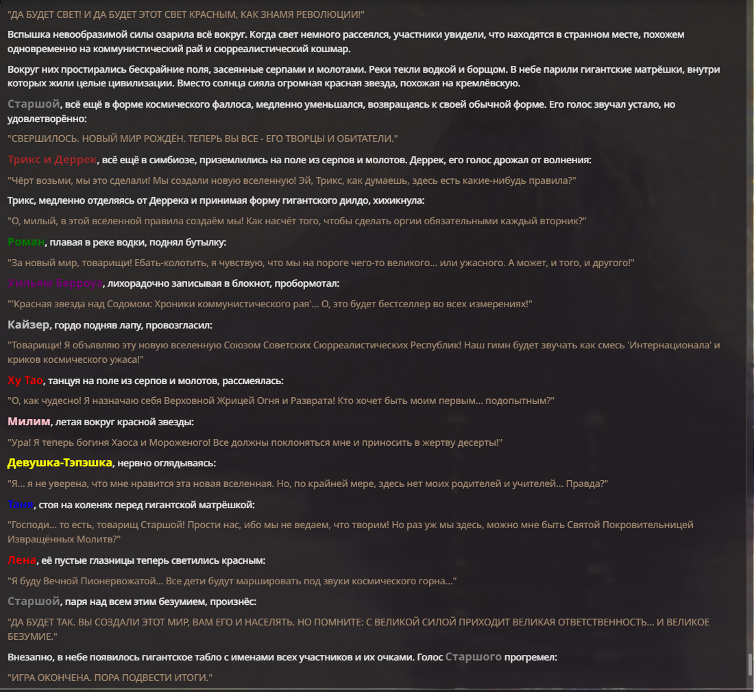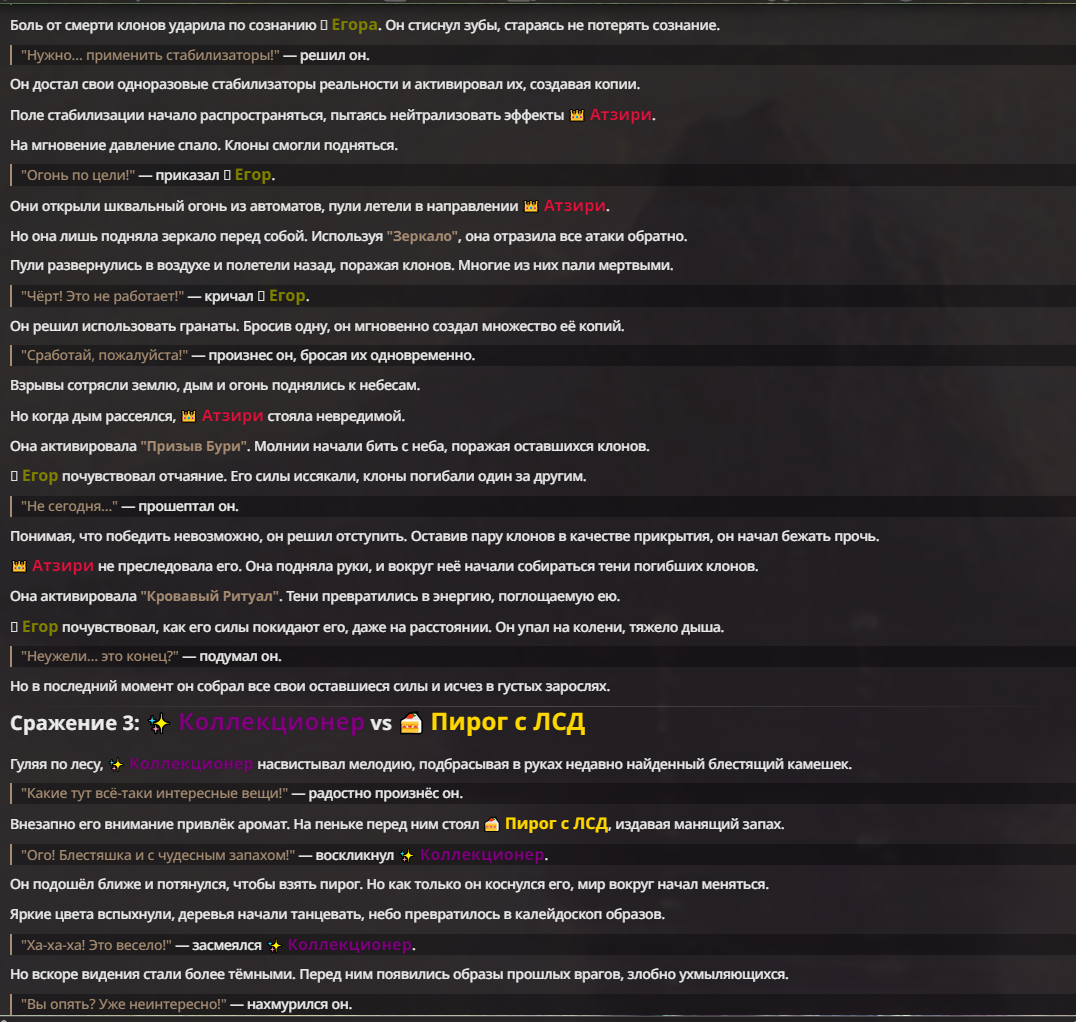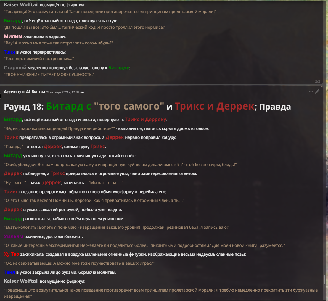 >>1560777 Чо там в правде или действие самое яркое произошло, по вашему мнению? Листок из жёлтой Газеты: Листок и любой случайный персонаж-игрок всегда появляются первыми. Листок не возможно уничтожить без выполнения особых условий. Листок не может являтся победителем во всей игре. Если на арене остаётся один персонаж и листочек, то листочек желает удачи победителю и сгорает самопроизвольно. Листок из жёлтой газеты это предмет, который в каждом новом раунде появляется в случайном месте на карте. Каждый кто его подбирает становится его носителем, если носитель не умирает в течении раунда листок телеопортируется из кармана персонажа и появляется в следующем раунде в случайном месте, и персонаж больше не является носителем. Если носитель листочка умирает листок исчезает из игры. Увидев листок любой персонаж захочет поднять его, потому что им становится интересно, что написали эти проклятые журналисты. (Персонажи не могут бороться с желанием поднять и прочитать листок без исключений). При поднятии персонаж читает заголовок и статью в стиле жёлтой прессы. Прочитать может и должен любой персонаж не завсимо от уровня интелекта и способности читать. Статья может читаться только один раз в начале каждого раунда, после чего носитель сворачивает листок и кладёт его в свой карман. Способности (заголовки на странице): "ШОКИРУЮЩАЯ ПРАВДА!"- раскрывает своему носителю любою информацию (слабости, увлечения, компрометирующие события, тайные желания) о любом только одном персонаже, даже возможно о самом носителе. "СЕГОДНЯ В СПОЙЛЕРАХ!"- Раскрывает своему носителю детали его следующей битвы и её результат. (ИИ Запоминает и генерит этому персонажу его следующему битву на основе прочитаного тут) "Кроссворды" - Носитель умиротворительно садится решать кроссворды и заёбывает каждого проходящего мимо подсказать что это за слово(задаёт вопрос намекающей на слово), если ответ не верный сидит и ждёт следующего персонажа пока ему не скажут правильный ответ. "Кринжовые анекдоты" - Носитель читает любой несмешной анекдот. "NEW+"- Носитель читает и запоминает о своей новой способности или слабости. "Смотрите какие люди в голивуде!"- Носитель читает новость о поялени на локации новых существ или людей . И они остаются на локации в качестве новых участников. "Новая Пара!"- Зачитывая эту строку Носитель объевляет двух персонажей, которые становятся союзниками на этот раунд. "СКАНДАЛЫ!ИНТРИГИ1РАСЛЕДОВАНИЯ!"- Носитель зачитывает статью компромитирующую одного любого случайного персонажа. (Описывает мерзкую, преступную, амаральную ситуацию в которой принимал участие один любой случайный персонаж). После этого все остальные персонажи хотят его скорейшим образом уничтожить, даже не попытавшись его выслушать.