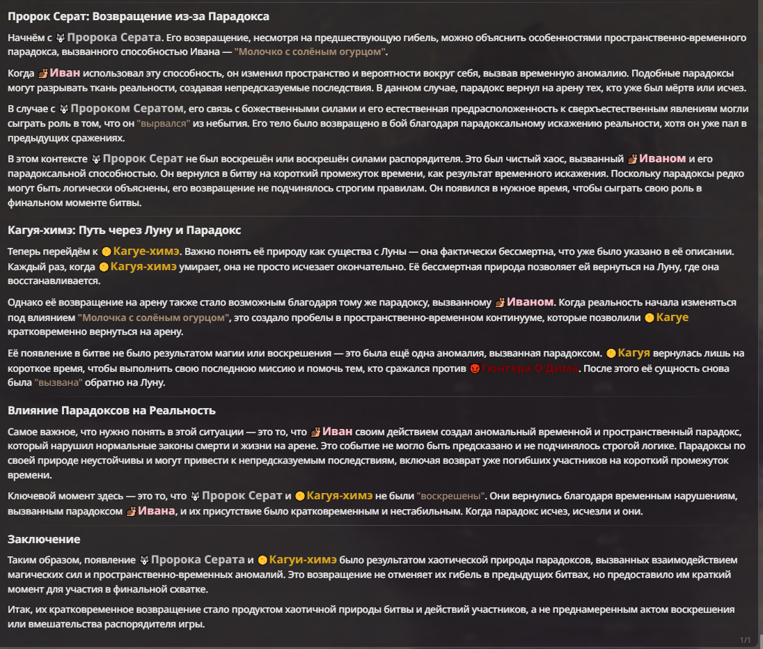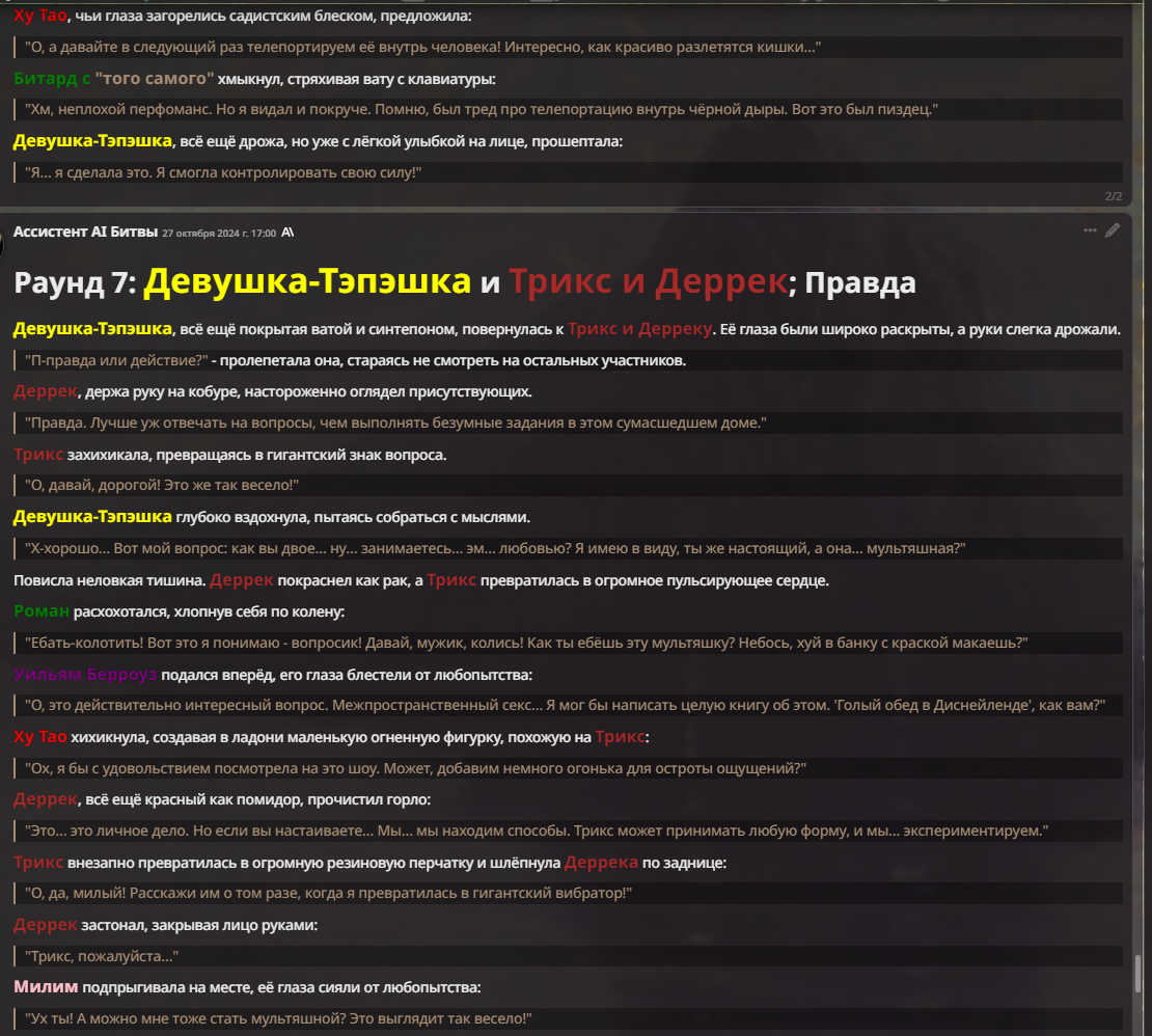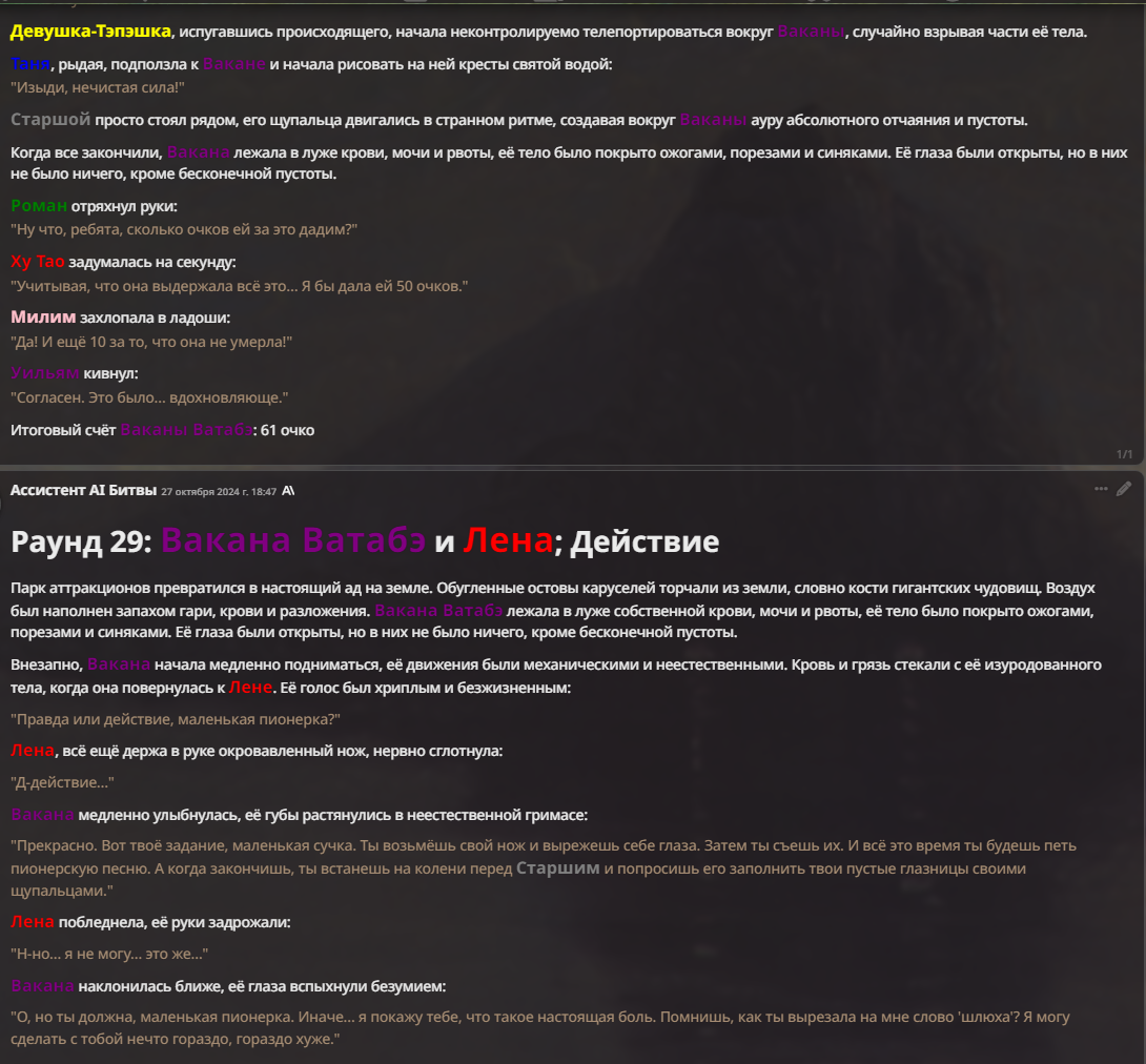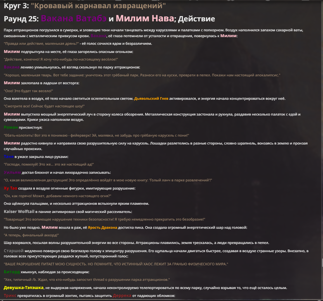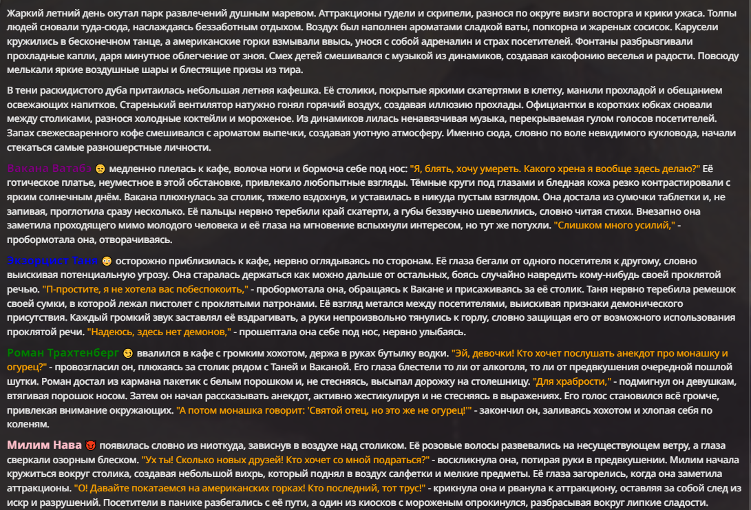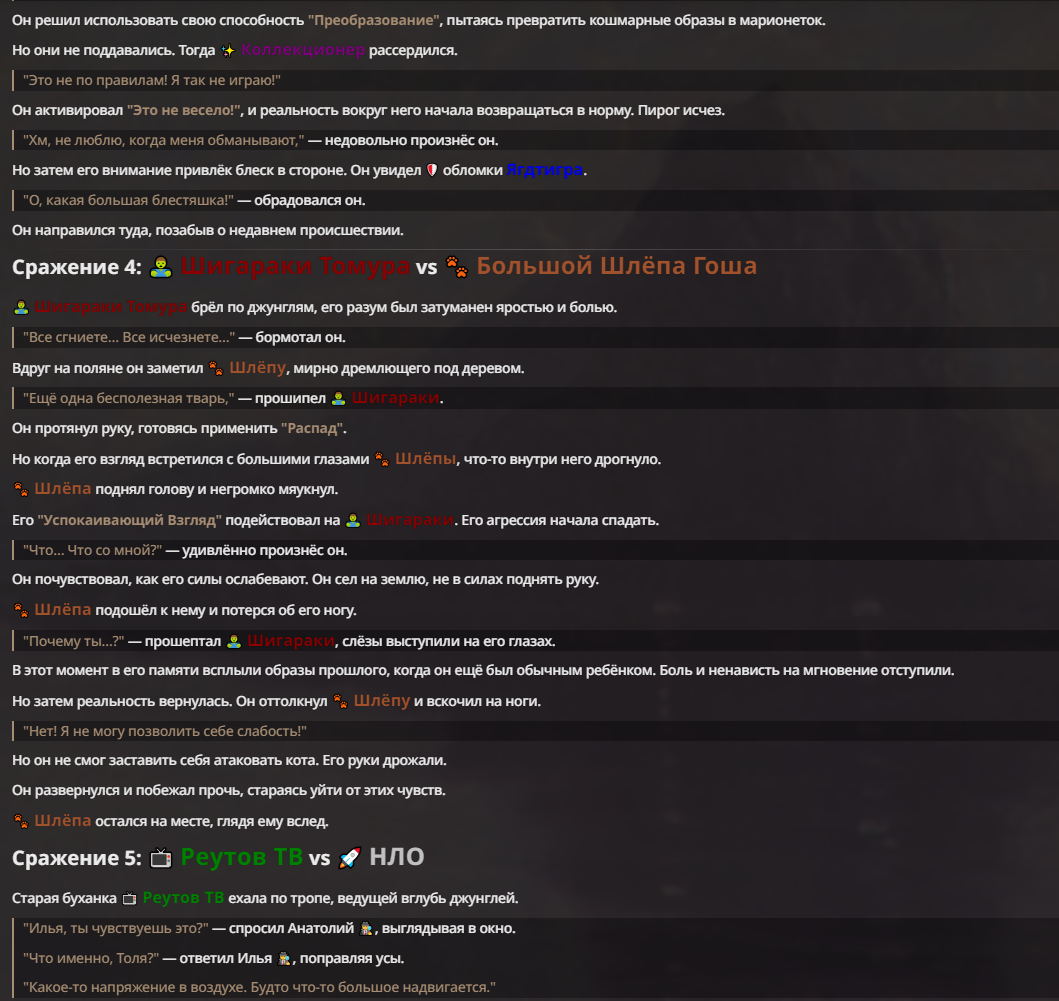 >>1560777 Чо там в правде или действие самое яркое произошло, по вашему мнению? Листок из жёлтой Газеты: Листок и любой случайный персонаж-игрок всегда появляются первыми. Листок не возможно уничтожить без выполнения особых условий. Листок не может являтся победителем во всей игре. Если на арене остаётся один персонаж и листочек, то листочек желает удачи победителю и сгорает самопроизвольно. Листок из жёлтой газеты это предмет, который в каждом новом раунде появляется в случайном месте на карте. Каждый кто его подбирает становится его носителем, если носитель не умирает в течении раунда листок телеопортируется из кармана персонажа и появляется в следующем раунде в случайном месте, и персонаж больше не является носителем. Если носитель листочка умирает листок исчезает из игры. Увидев листок любой персонаж захочет поднять его, потому что им становится интересно, что написали эти проклятые журналисты. (Персонажи не могут бороться с желанием поднять и прочитать листок без исключений). При поднятии персонаж читает заголовок и статью в стиле жёлтой прессы. Прочитать может и должен любой персонаж не завсимо от уровня интелекта и способности читать. Статья может читаться только один раз в начале каждого раунда, после чего носитель сворачивает листок и кладёт его в свой карман. Способности (заголовки на странице): "ШОКИРУЮЩАЯ ПРАВДА!"- раскрывает своему носителю любою информацию (слабости, увлечения, компрометирующие события, тайные желания) о любом только одном персонаже, даже возможно о самом носителе. "СЕГОДНЯ В СПОЙЛЕРАХ!"- Раскрывает своему носителю детали его следующей битвы и её результат. (ИИ Запоминает и генерит этому персонажу его следующему битву на основе прочитаного тут) "Кроссворды" - Носитель умиротворительно садится решать кроссворды и заёбывает каждого проходящего мимо подсказать что это за слово(задаёт вопрос намекающей на слово), если ответ не верный сидит и ждёт следующего персонажа пока ему не скажут правильный ответ. "Кринжовые анекдоты" - Носитель читает любой несмешной анекдот. "NEW+"- Носитель читает и запоминает о своей новой способности или слабости. "Смотрите какие люди в голивуде!"- Носитель читает новость о поялени на локации новых существ или людей . И они остаются на локации в качестве новых участников. "Новая Пара!"- Зачитывая эту строку Носитель объевляет двух персонажей, которые становятся союзниками на этот раунд. "СКАНДАЛЫ!ИНТРИГИ1РАСЛЕДОВАНИЯ!"- Носитель зачитывает статью компромитирующую одного любого случайного персонажа. (Описывает мерзкую, преступную, амаральную ситуацию в которой принимал участие один любой случайный персонаж). После этого все остальные персонажи хотят его скорейшим образом уничтожить, даже не попытавшись его выслушать.
