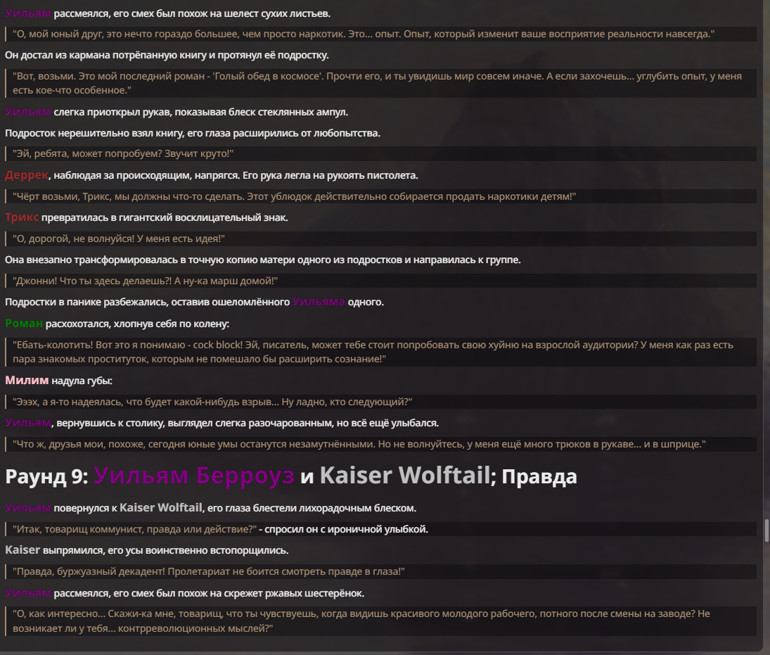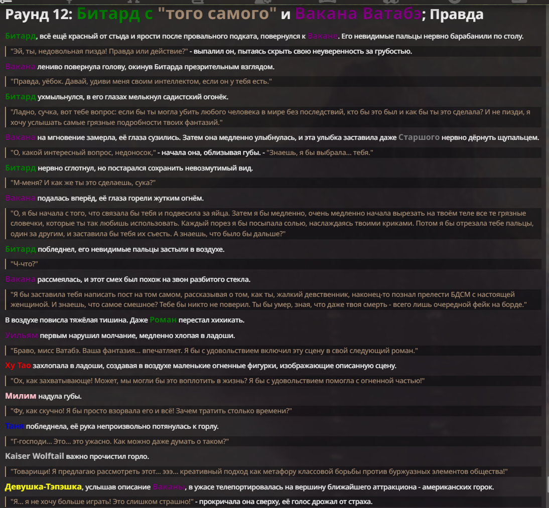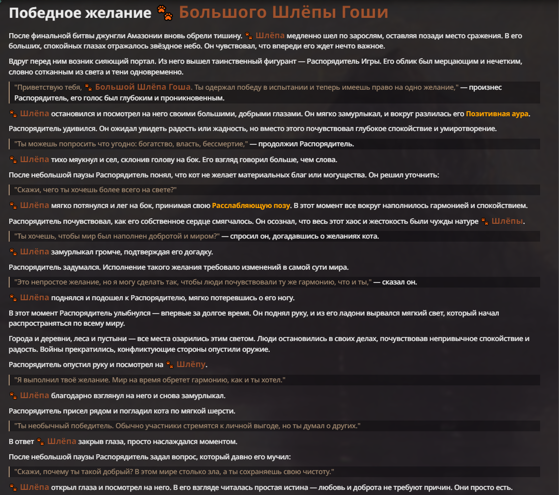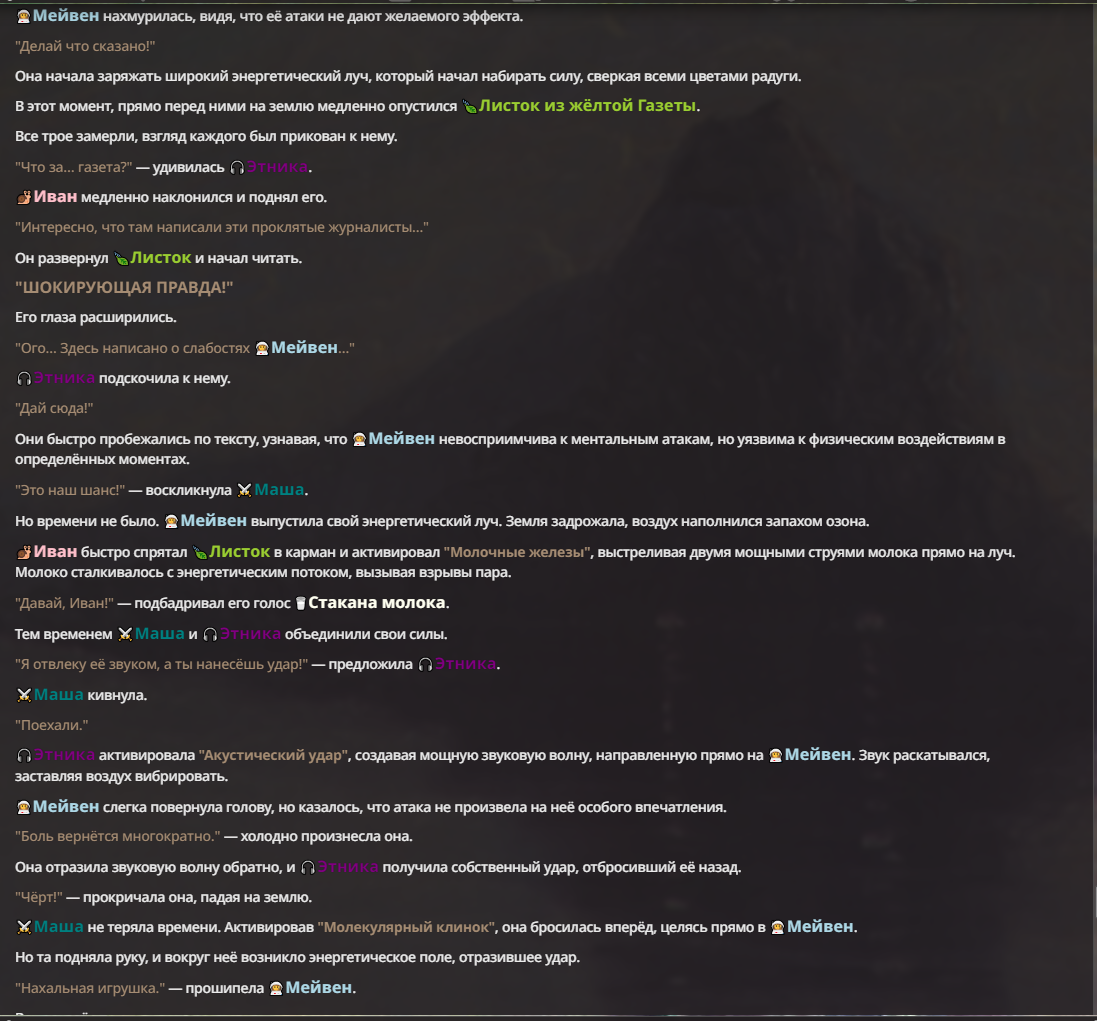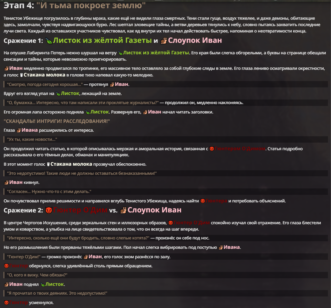 >>1560777 Чо там в правде или действие самое яркое произошло, по вашему мнению? Листок из жёлтой Газеты: Листок и любой случайный персонаж-игрок всегда появляются первыми. Листок не возможно уничтожить без выполнения особых условий. Листок не может являтся победителем во всей игре. Если на арене остаётся один персонаж и листочек, то листочек желает удачи победителю и сгорает самопроизвольно. Листок из жёлтой газеты это предмет, который в каждом новом раунде появляется в случайном месте на карте. Каждый кто его подбирает становится его носителем, если носитель не умирает в течении раунда листок телеопортируется из кармана персонажа и появляется в следующем раунде в случайном месте, и персонаж больше не является носителем. Если носитель листочка умирает листок исчезает из игры. Увидев листок любой персонаж захочет поднять его, потому что им становится интересно, что написали эти проклятые журналисты. (Персонажи не могут бороться с желанием поднять и прочитать листок без исключений). При поднятии персонаж читает заголовок и статью в стиле жёлтой прессы. Прочитать может и должен любой персонаж не завсимо от уровня интелекта и способности читать. Статья может читаться только один раз в начале каждого раунда, после чего носитель сворачивает листок и кладёт его в свой карман. Способности (заголовки на странице): "ШОКИРУЮЩАЯ ПРАВДА!"- раскрывает своему носителю любою информацию (слабости, увлечения, компрометирующие события, тайные желания) о любом только одном персонаже, даже возможно о самом носителе. "СЕГОДНЯ В СПОЙЛЕРАХ!"- Раскрывает своему носителю детали его следующей битвы и её результат. (ИИ Запоминает и генерит этому персонажу его следующему битву на основе прочитаного тут) "Кроссворды" - Носитель умиротворительно садится решать кроссворды и заёбывает каждого проходящего мимо подсказать что это за слово(задаёт вопрос намекающей на слово), если ответ не верный сидит и ждёт следующего персонажа пока ему не скажут правильный ответ. "Кринжовые анекдоты" - Носитель читает любой несмешной анекдот. "NEW+"- Носитель читает и запоминает о своей новой способности или слабости. "Смотрите какие люди в голивуде!"- Носитель читает новость о поялени на локации новых существ или людей . И они остаются на локации в качестве новых участников. "Новая Пара!"- Зачитывая эту строку Носитель объевляет двух персонажей, которые становятся союзниками на этот раунд. "СКАНДАЛЫ!ИНТРИГИ1РАСЛЕДОВАНИЯ!"- Носитель зачитывает статью компромитирующую одного любого случайного персонажа. (Описывает мерзкую, преступную, амаральную ситуацию в которой принимал участие один любой случайный персонаж). После этого все остальные персонажи хотят его скорейшим образом уничтожить, даже не попытавшись его выслушать.
