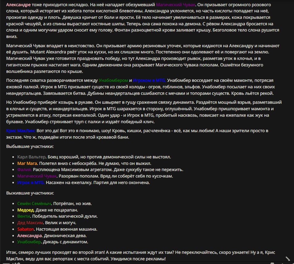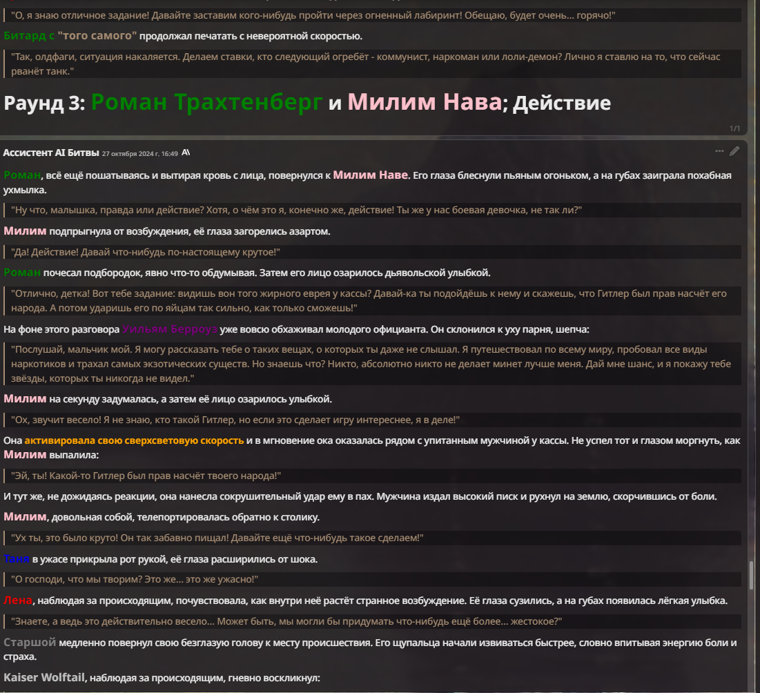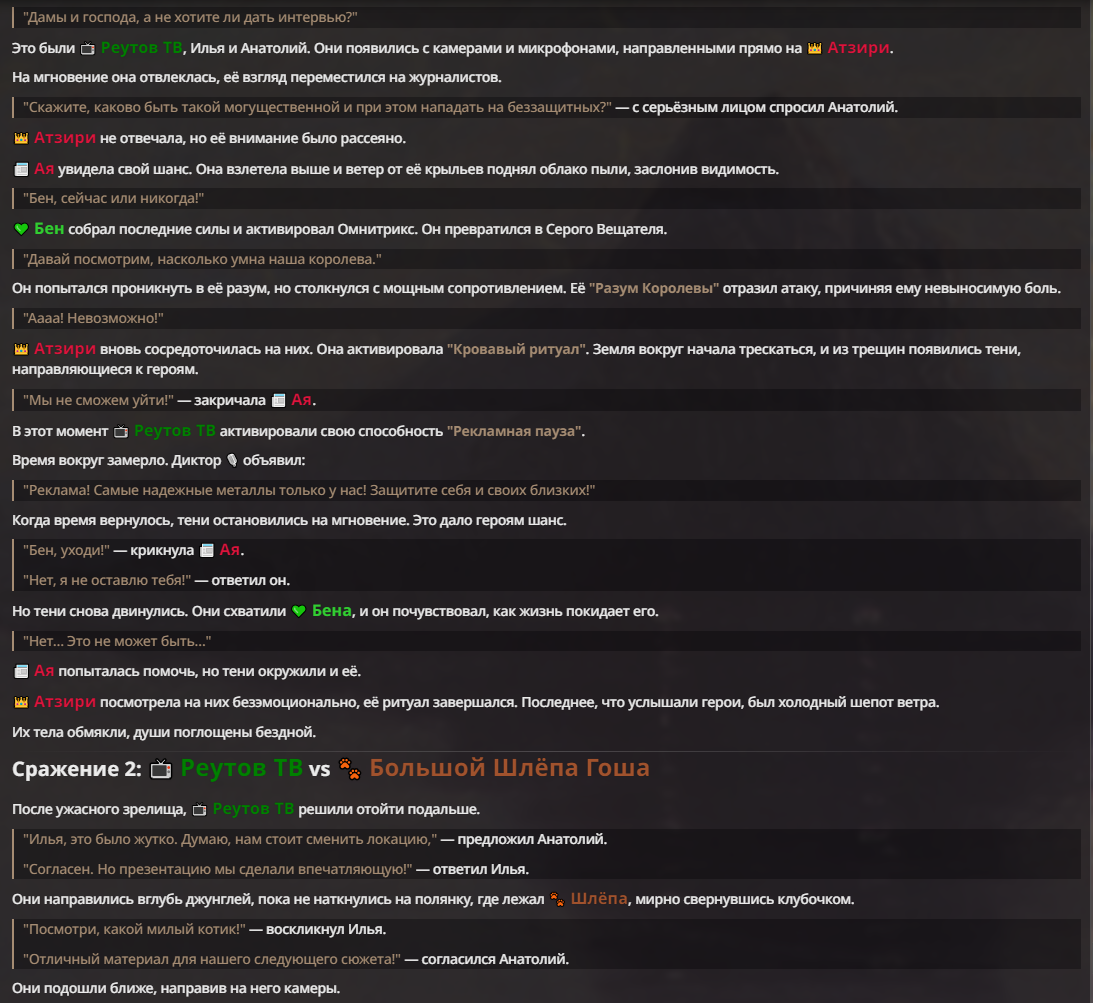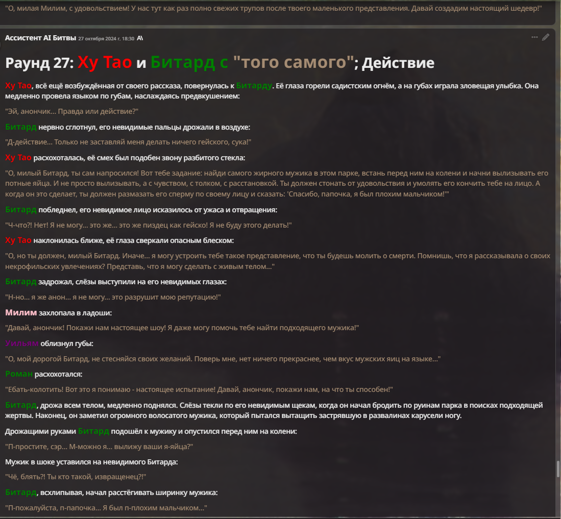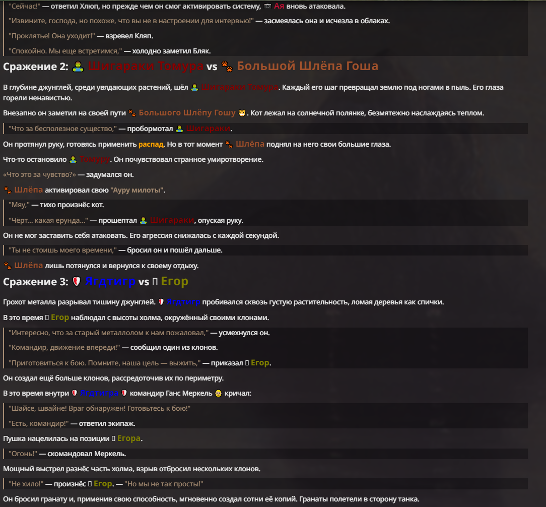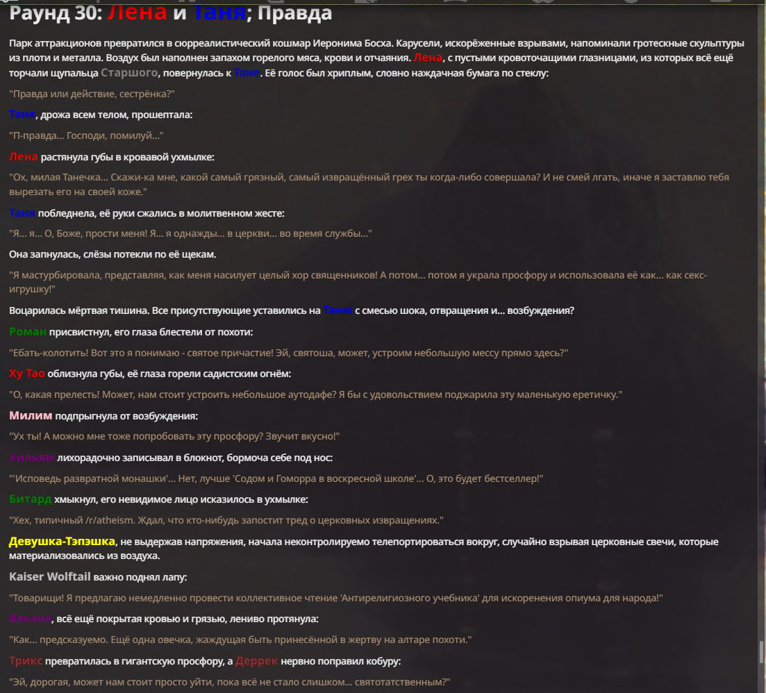 >>1560777 Чо там в правде или действие самое яркое произошло, по вашему мнению? Листок из жёлтой Газеты: Листок и любой случайный персонаж-игрок всегда появляются первыми. Листок не возможно уничтожить без выполнения особых условий. Листок не может являтся победителем во всей игре. Если на арене остаётся один персонаж и листочек, то листочек желает удачи победителю и сгорает самопроизвольно. Листок из жёлтой газеты это предмет, который в каждом новом раунде появляется в случайном месте на карте. Каждый кто его подбирает становится его носителем, если носитель не умирает в течении раунда листок телеопортируется из кармана персонажа и появляется в следующем раунде в случайном месте, и персонаж больше не является носителем. Если носитель листочка умирает листок исчезает из игры. Увидев листок любой персонаж захочет поднять его, потому что им становится интересно, что написали эти проклятые журналисты. (Персонажи не могут бороться с желанием поднять и прочитать листок без исключений). При поднятии персонаж читает заголовок и статью в стиле жёлтой прессы. Прочитать может и должен любой персонаж не завсимо от уровня интелекта и способности читать. Статья может читаться только один раз в начале каждого раунда, после чего носитель сворачивает листок и кладёт его в свой карман. Способности (заголовки на странице): "ШОКИРУЮЩАЯ ПРАВДА!"- раскрывает своему носителю любою информацию (слабости, увлечения, компрометирующие события, тайные желания) о любом только одном персонаже, даже возможно о самом носителе. "СЕГОДНЯ В СПОЙЛЕРАХ!"- Раскрывает своему носителю детали его следующей битвы и её результат. (ИИ Запоминает и генерит этому персонажу его следующему битву на основе прочитаного тут) "Кроссворды" - Носитель умиротворительно садится решать кроссворды и заёбывает каждого проходящего мимо подсказать что это за слово(задаёт вопрос намекающей на слово), если ответ не верный сидит и ждёт следующего персонажа пока ему не скажут правильный ответ. "Кринжовые анекдоты" - Носитель читает любой несмешной анекдот. "NEW+"- Носитель читает и запоминает о своей новой способности или слабости. "Смотрите какие люди в голивуде!"- Носитель читает новость о поялени на локации новых существ или людей . И они остаются на локации в качестве новых участников. "Новая Пара!"- Зачитывая эту строку Носитель объевляет двух персонажей, которые становятся союзниками на этот раунд. "СКАНДАЛЫ!ИНТРИГИ1РАСЛЕДОВАНИЯ!"- Носитель зачитывает статью компромитирующую одного любого случайного персонажа. (Описывает мерзкую, преступную, амаральную ситуацию в которой принимал участие один любой случайный персонаж). После этого все остальные персонажи хотят его скорейшим образом уничтожить, даже не попытавшись его выслушать.
