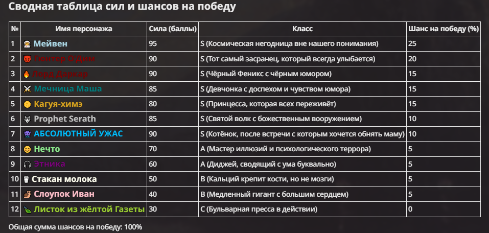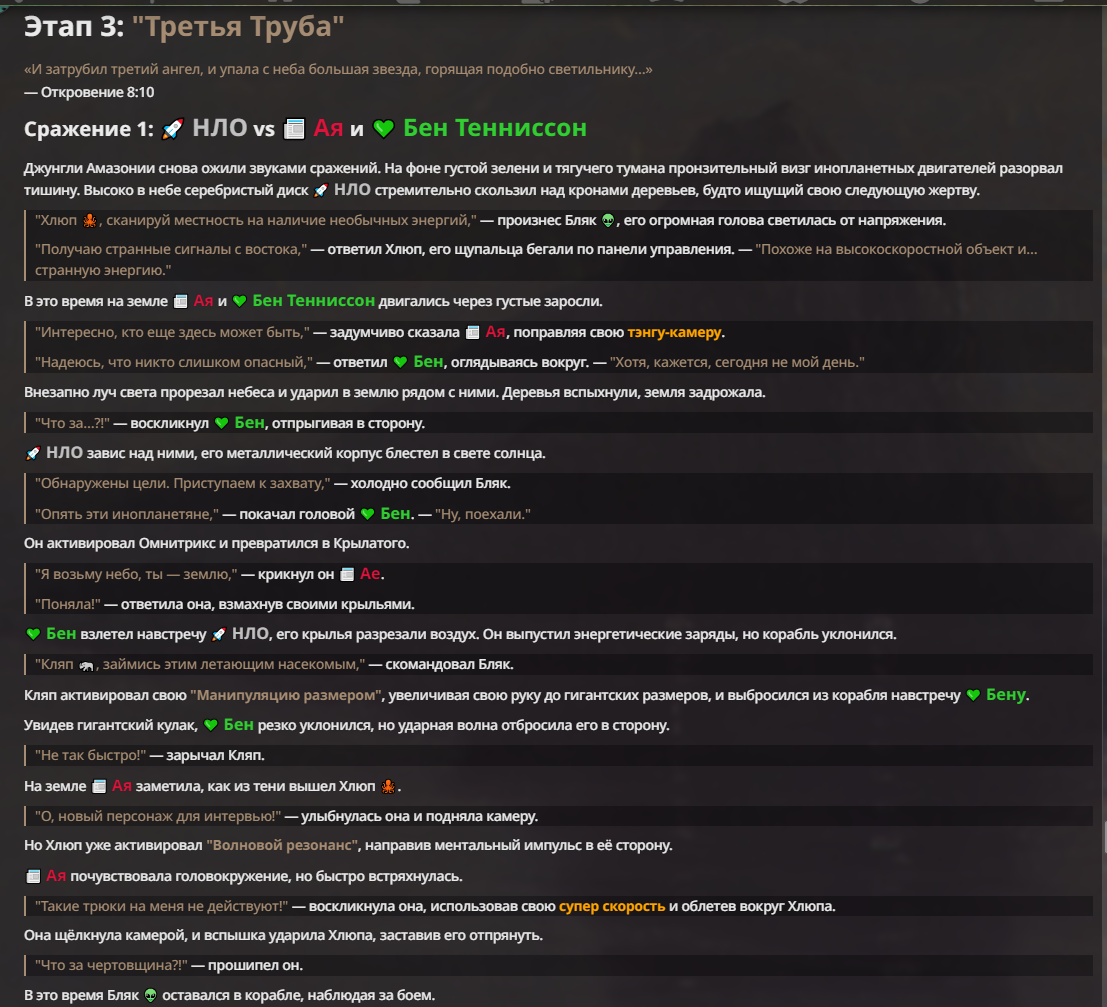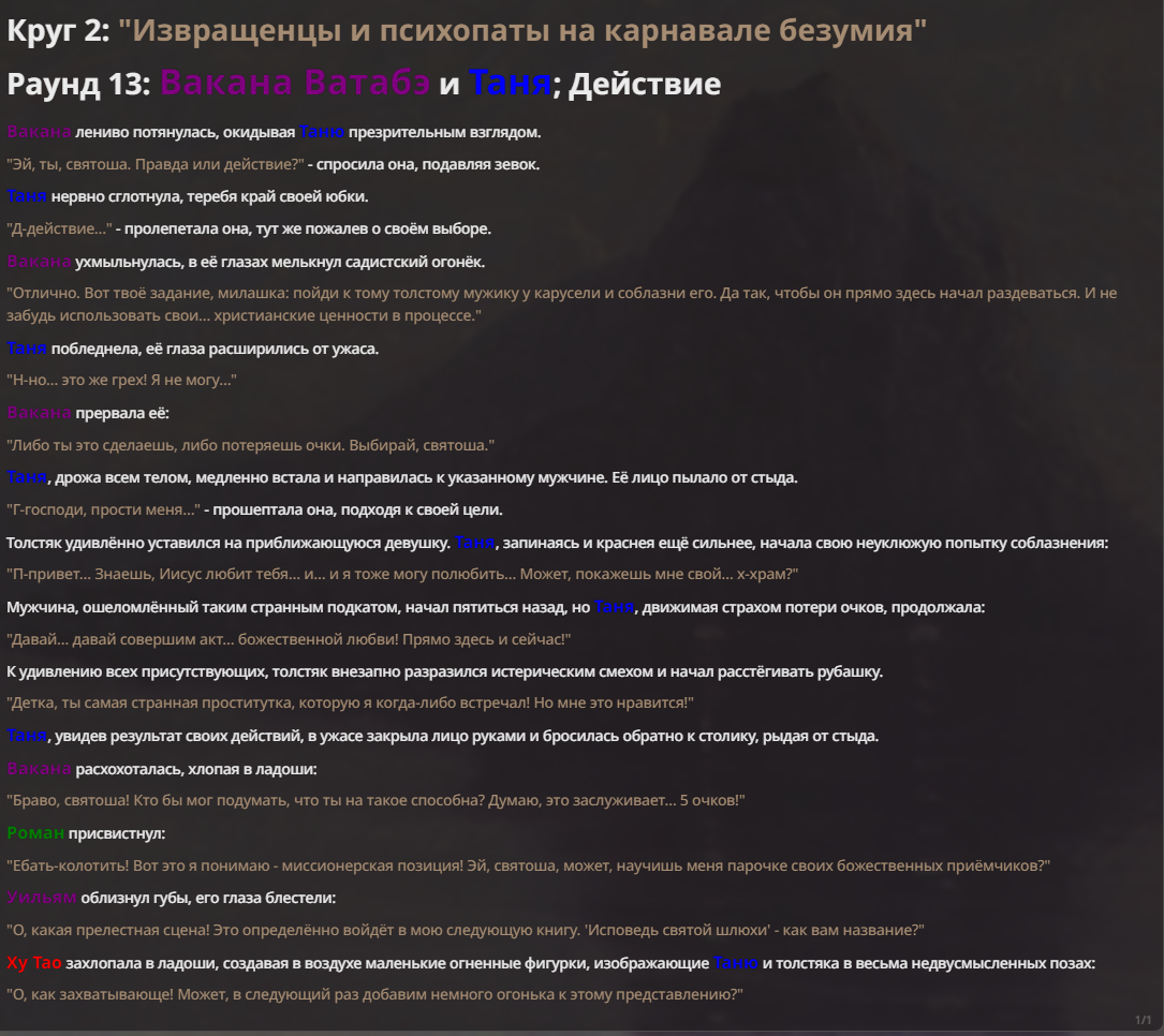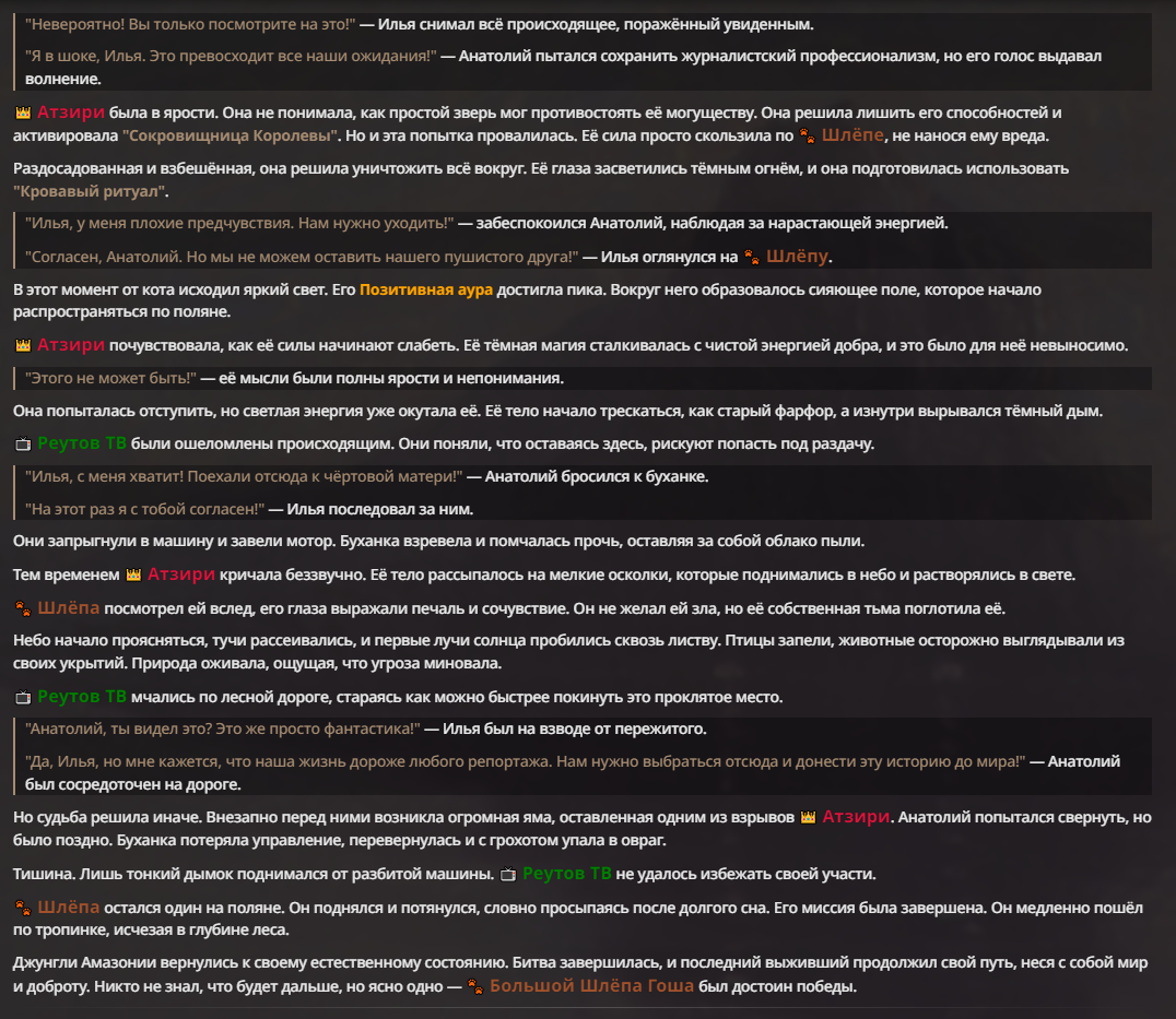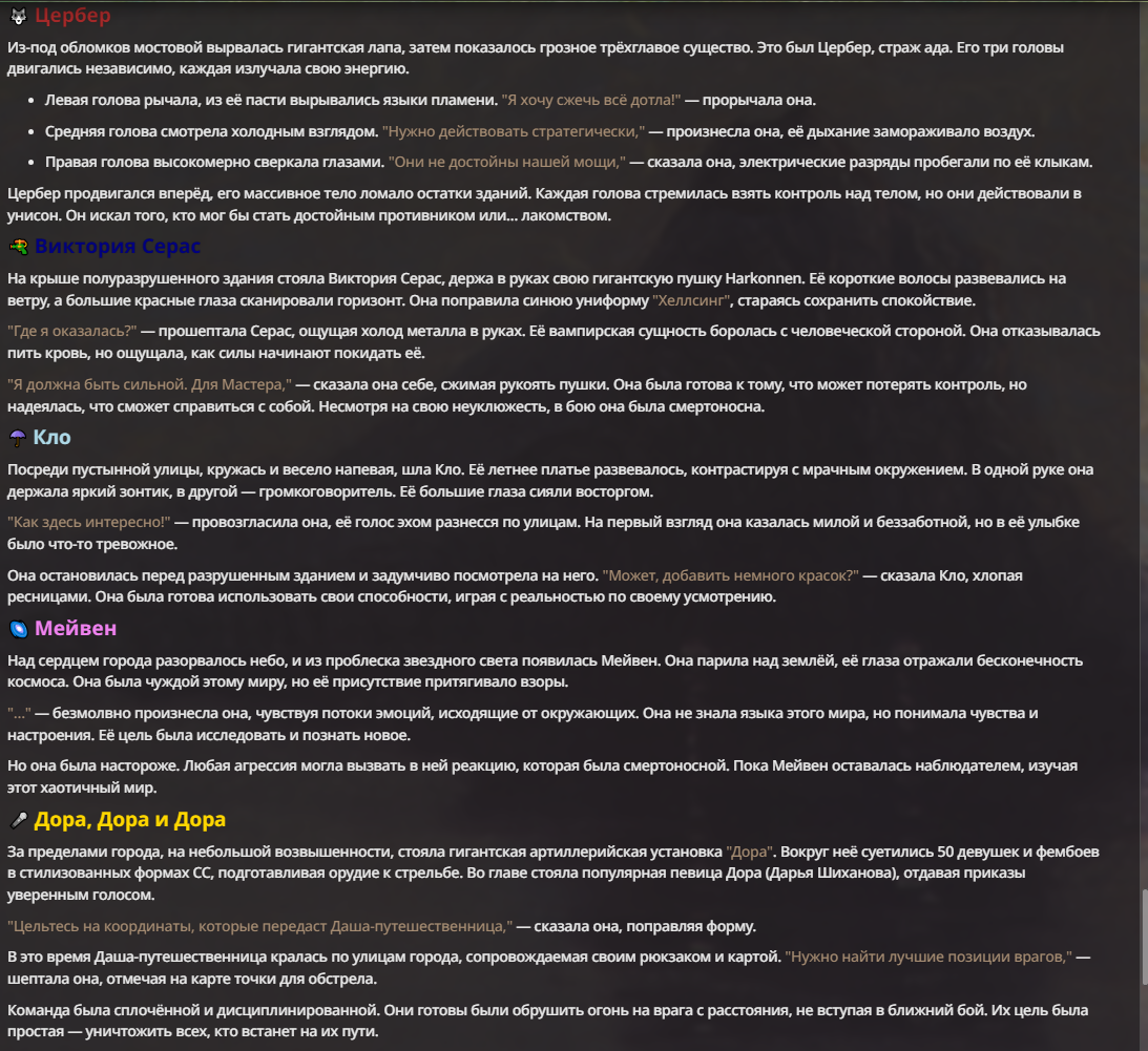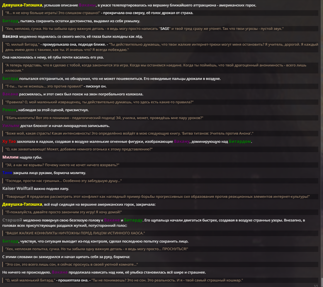 >>1560777 Чо там в правде или действие самое яркое произошло, по вашему мнению? Листок из жёлтой Газеты: Листок и любой случайный персонаж-игрок всегда появляются первыми. Листок не возможно уничтожить без выполнения особых условий. Листок не может являтся победителем во всей игре. Если на арене остаётся один персонаж и листочек, то листочек желает удачи победителю и сгорает самопроизвольно. Листок из жёлтой газеты это предмет, который в каждом новом раунде появляется в случайном месте на карте. Каждый кто его подбирает становится его носителем, если носитель не умирает в течении раунда листок телеопортируется из кармана персонажа и появляется в следующем раунде в случайном месте, и персонаж больше не является носителем. Если носитель листочка умирает листок исчезает из игры. Увидев листок любой персонаж захочет поднять его, потому что им становится интересно, что написали эти проклятые журналисты. (Персонажи не могут бороться с желанием поднять и прочитать листок без исключений). При поднятии персонаж читает заголовок и статью в стиле жёлтой прессы. Прочитать может и должен любой персонаж не завсимо от уровня интелекта и способности читать. Статья может читаться только один раз в начале каждого раунда, после чего носитель сворачивает листок и кладёт его в свой карман. Способности (заголовки на странице): "ШОКИРУЮЩАЯ ПРАВДА!"- раскрывает своему носителю любою информацию (слабости, увлечения, компрометирующие события, тайные желания) о любом только одном персонаже, даже возможно о самом носителе. "СЕГОДНЯ В СПОЙЛЕРАХ!"- Раскрывает своему носителю детали его следующей битвы и её результат. (ИИ Запоминает и генерит этому персонажу его следующему битву на основе прочитаного тут) "Кроссворды" - Носитель умиротворительно садится решать кроссворды и заёбывает каждого проходящего мимо подсказать что это за слово(задаёт вопрос намекающей на слово), если ответ не верный сидит и ждёт следующего персонажа пока ему не скажут правильный ответ. "Кринжовые анекдоты" - Носитель читает любой несмешной анекдот. "NEW+"- Носитель читает и запоминает о своей новой способности или слабости. "Смотрите какие люди в голивуде!"- Носитель читает новость о поялени на локации новых существ или людей . И они остаются на локации в качестве новых участников. "Новая Пара!"- Зачитывая эту строку Носитель объевляет двух персонажей, которые становятся союзниками на этот раунд. "СКАНДАЛЫ!ИНТРИГИ1РАСЛЕДОВАНИЯ!"- Носитель зачитывает статью компромитирующую одного любого случайного персонажа. (Описывает мерзкую, преступную, амаральную ситуацию в которой принимал участие один любой случайный персонаж). После этого все остальные персонажи хотят его скорейшим образом уничтожить, даже не попытавшись его выслушать.
