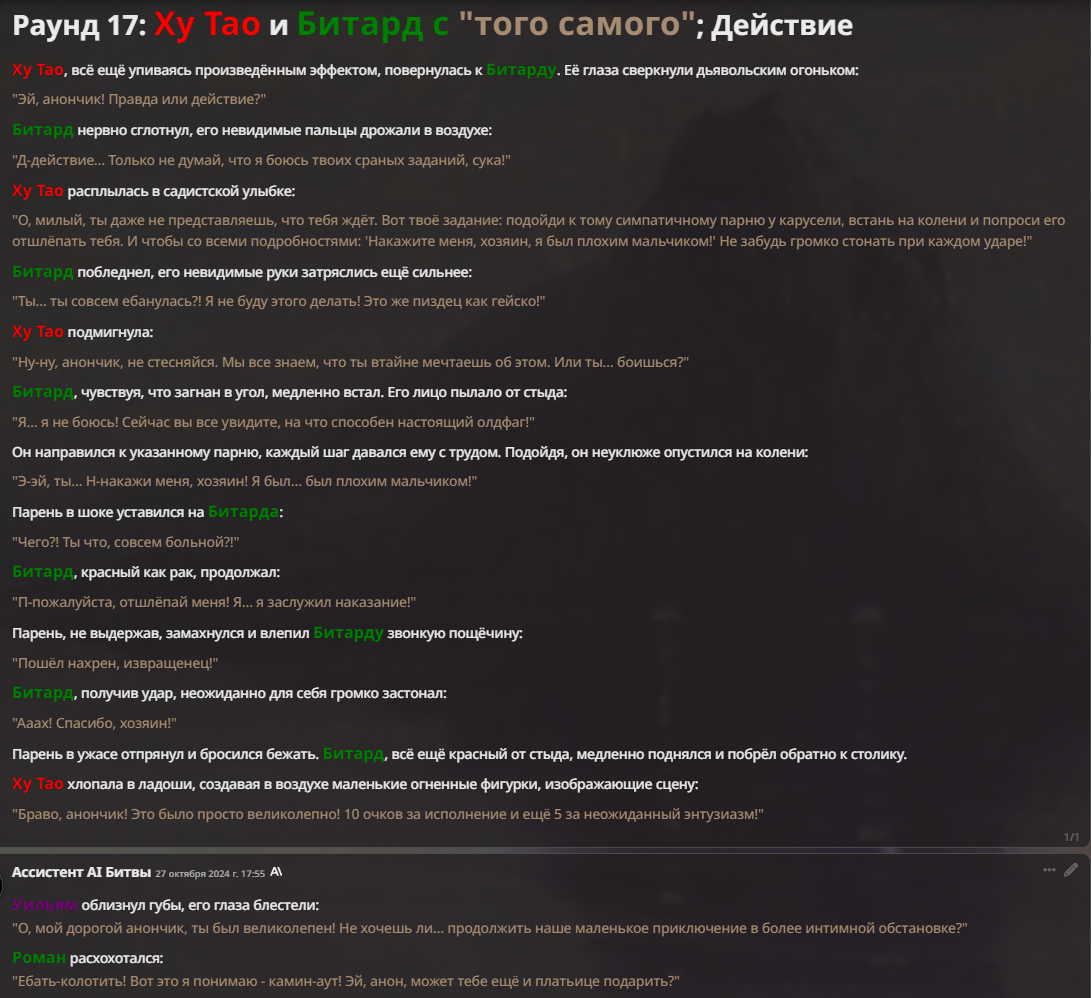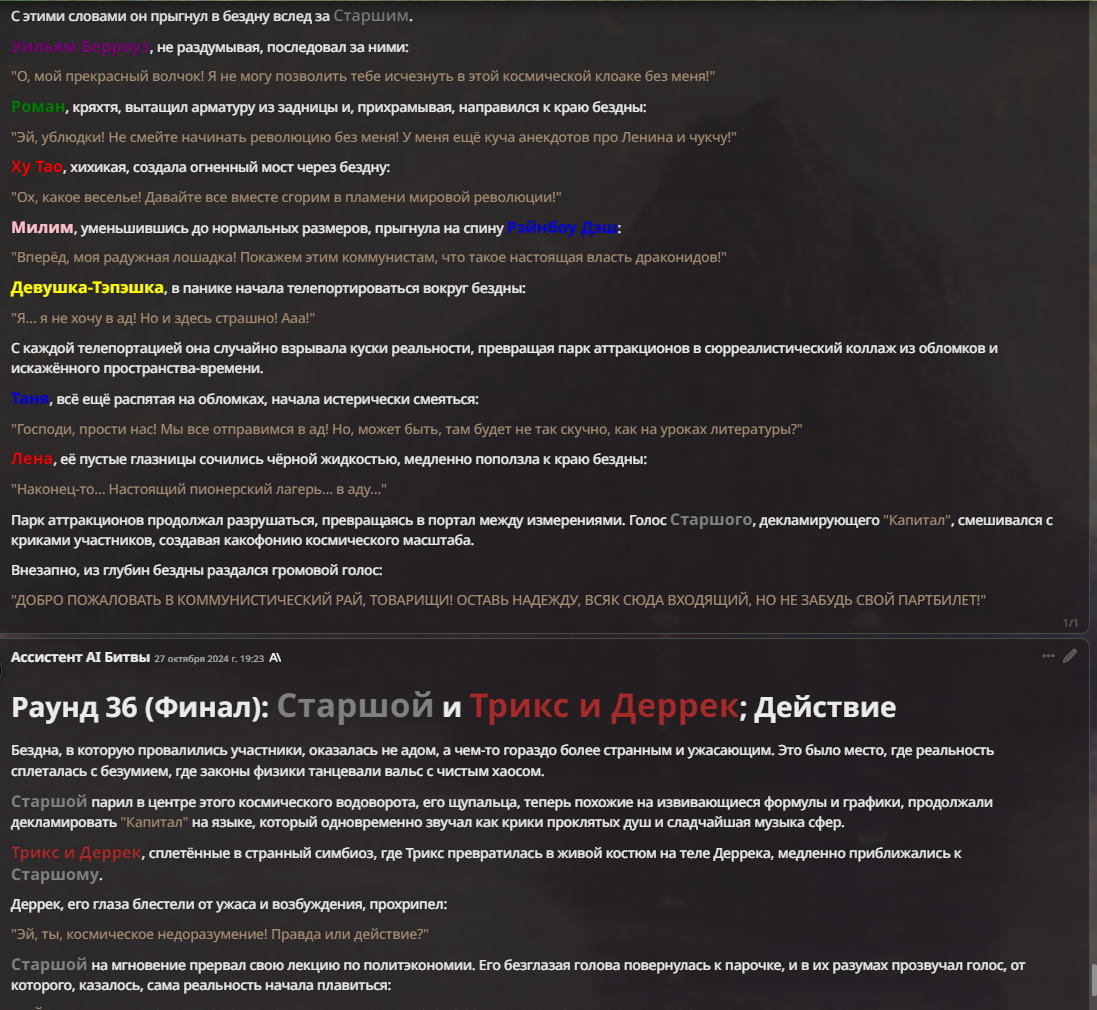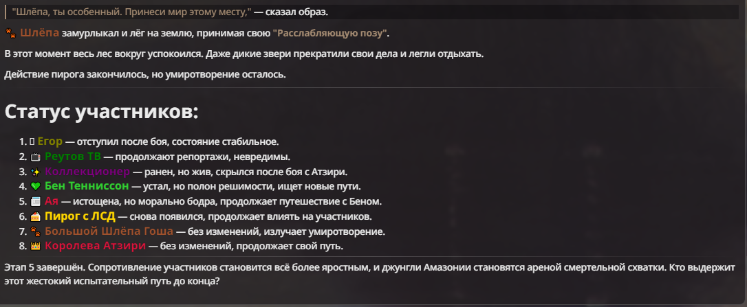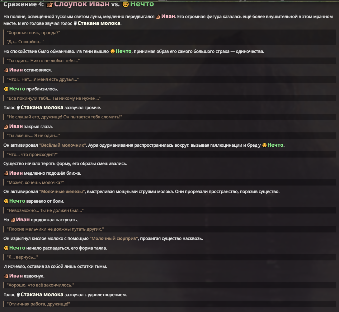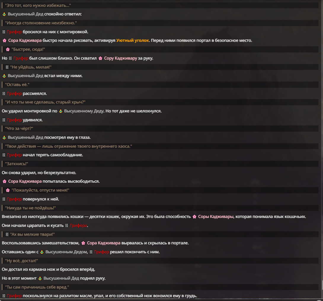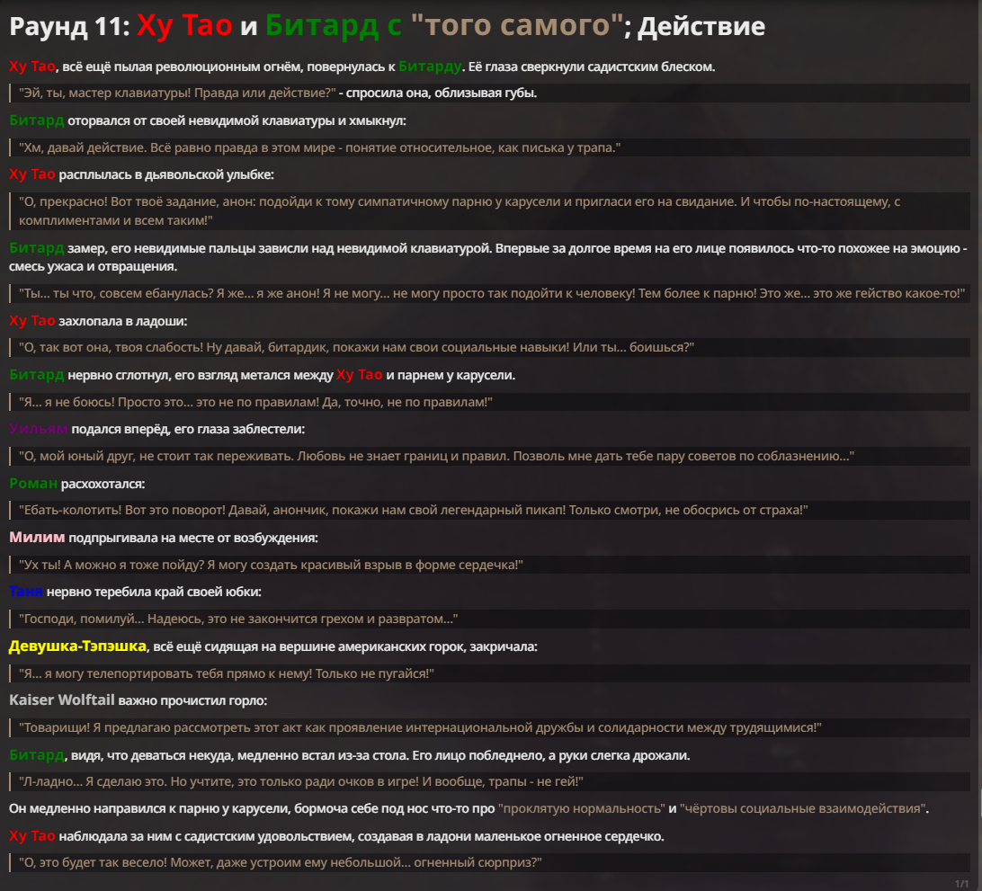 >>1560777 Чо там в правде или действие самое яркое произошло, по вашему мнению? Листок из жёлтой Газеты: Листок и любой случайный персонаж-игрок всегда появляются первыми. Листок не возможно уничтожить без выполнения особых условий. Листок не может являтся победителем во всей игре. Если на арене остаётся один персонаж и листочек, то листочек желает удачи победителю и сгорает самопроизвольно. Листок из жёлтой газеты это предмет, который в каждом новом раунде появляется в случайном месте на карте. Каждый кто его подбирает становится его носителем, если носитель не умирает в течении раунда листок телеопортируется из кармана персонажа и появляется в следующем раунде в случайном месте, и персонаж больше не является носителем. Если носитель листочка умирает листок исчезает из игры. Увидев листок любой персонаж захочет поднять его, потому что им становится интересно, что написали эти проклятые журналисты. (Персонажи не могут бороться с желанием поднять и прочитать листок без исключений). При поднятии персонаж читает заголовок и статью в стиле жёлтой прессы. Прочитать может и должен любой персонаж не завсимо от уровня интелекта и способности читать. Статья может читаться только один раз в начале каждого раунда, после чего носитель сворачивает листок и кладёт его в свой карман. Способности (заголовки на странице): "ШОКИРУЮЩАЯ ПРАВДА!"- раскрывает своему носителю любою информацию (слабости, увлечения, компрометирующие события, тайные желания) о любом только одном персонаже, даже возможно о самом носителе. "СЕГОДНЯ В СПОЙЛЕРАХ!"- Раскрывает своему носителю детали его следующей битвы и её результат. (ИИ Запоминает и генерит этому персонажу его следующему битву на основе прочитаного тут) "Кроссворды" - Носитель умиротворительно садится решать кроссворды и заёбывает каждого проходящего мимо подсказать что это за слово(задаёт вопрос намекающей на слово), если ответ не верный сидит и ждёт следующего персонажа пока ему не скажут правильный ответ. "Кринжовые анекдоты" - Носитель читает любой несмешной анекдот. "NEW+"- Носитель читает и запоминает о своей новой способности или слабости. "Смотрите какие люди в голивуде!"- Носитель читает новость о поялени на локации новых существ или людей . И они остаются на локации в качестве новых участников. "Новая Пара!"- Зачитывая эту строку Носитель объевляет двух персонажей, которые становятся союзниками на этот раунд. "СКАНДАЛЫ!ИНТРИГИ1РАСЛЕДОВАНИЯ!"- Носитель зачитывает статью компромитирующую одного любого случайного персонажа. (Описывает мерзкую, преступную, амаральную ситуацию в которой принимал участие один любой случайный персонаж). После этого все остальные персонажи хотят его скорейшим образом уничтожить, даже не попытавшись его выслушать.