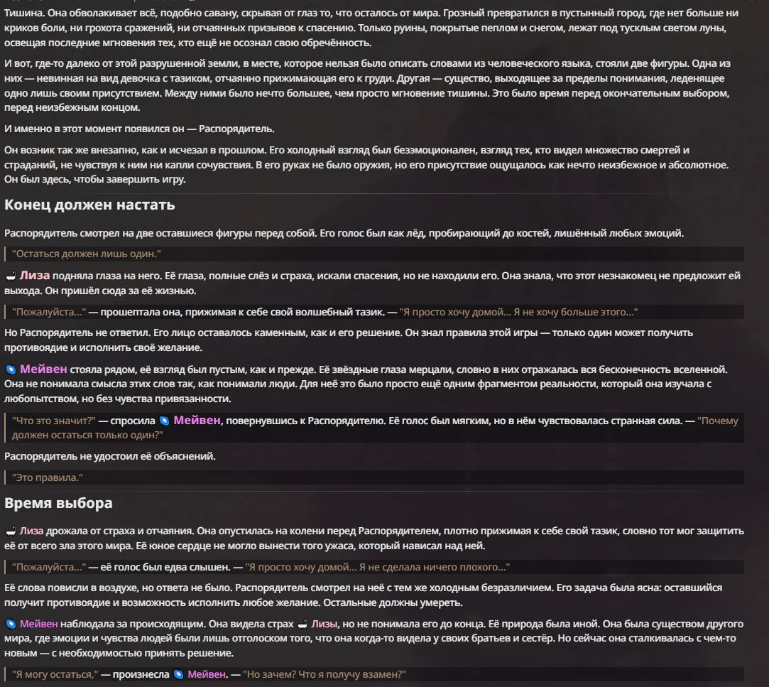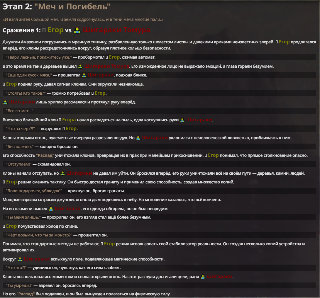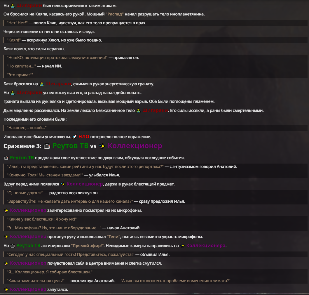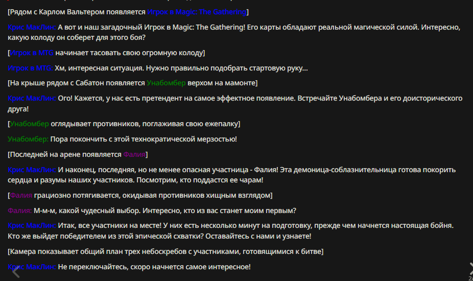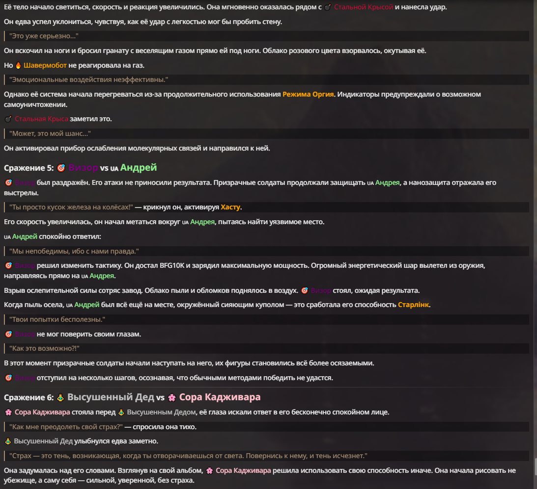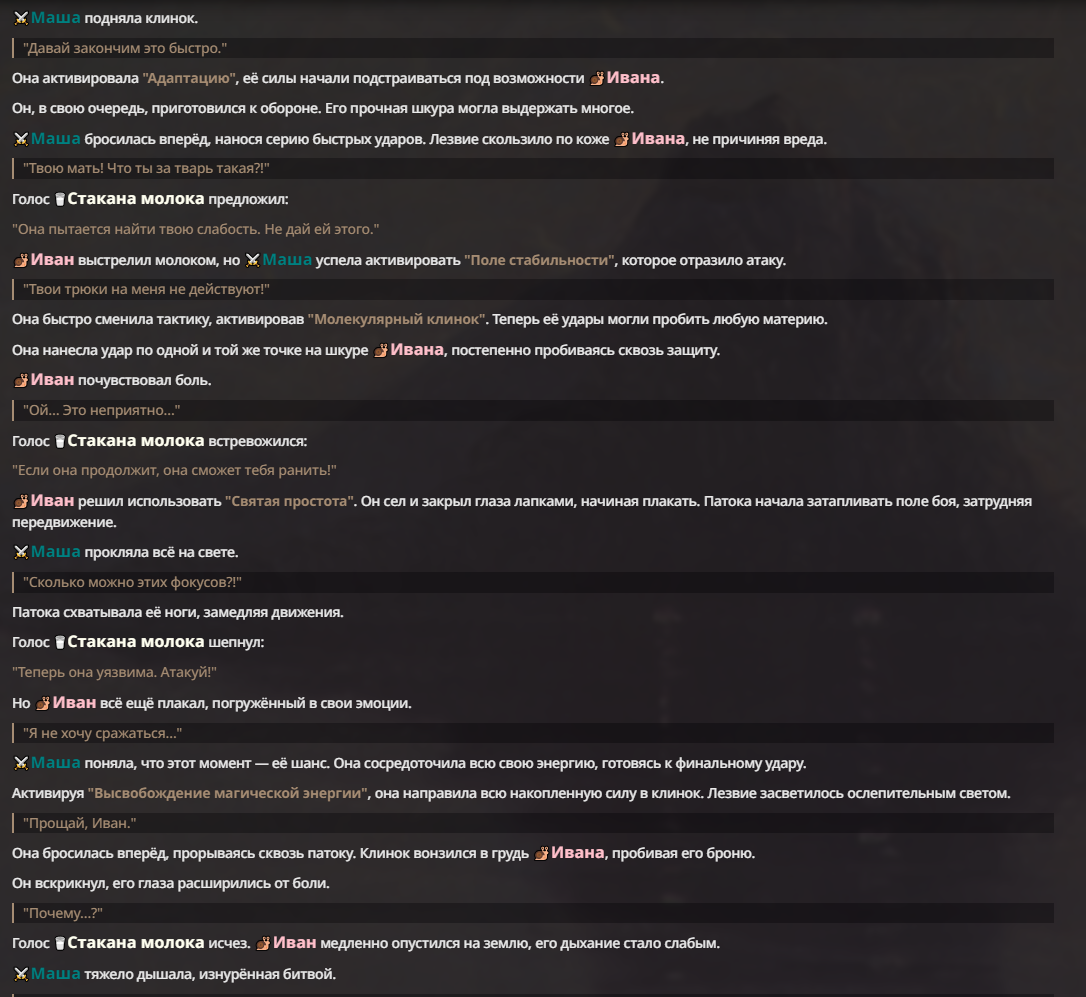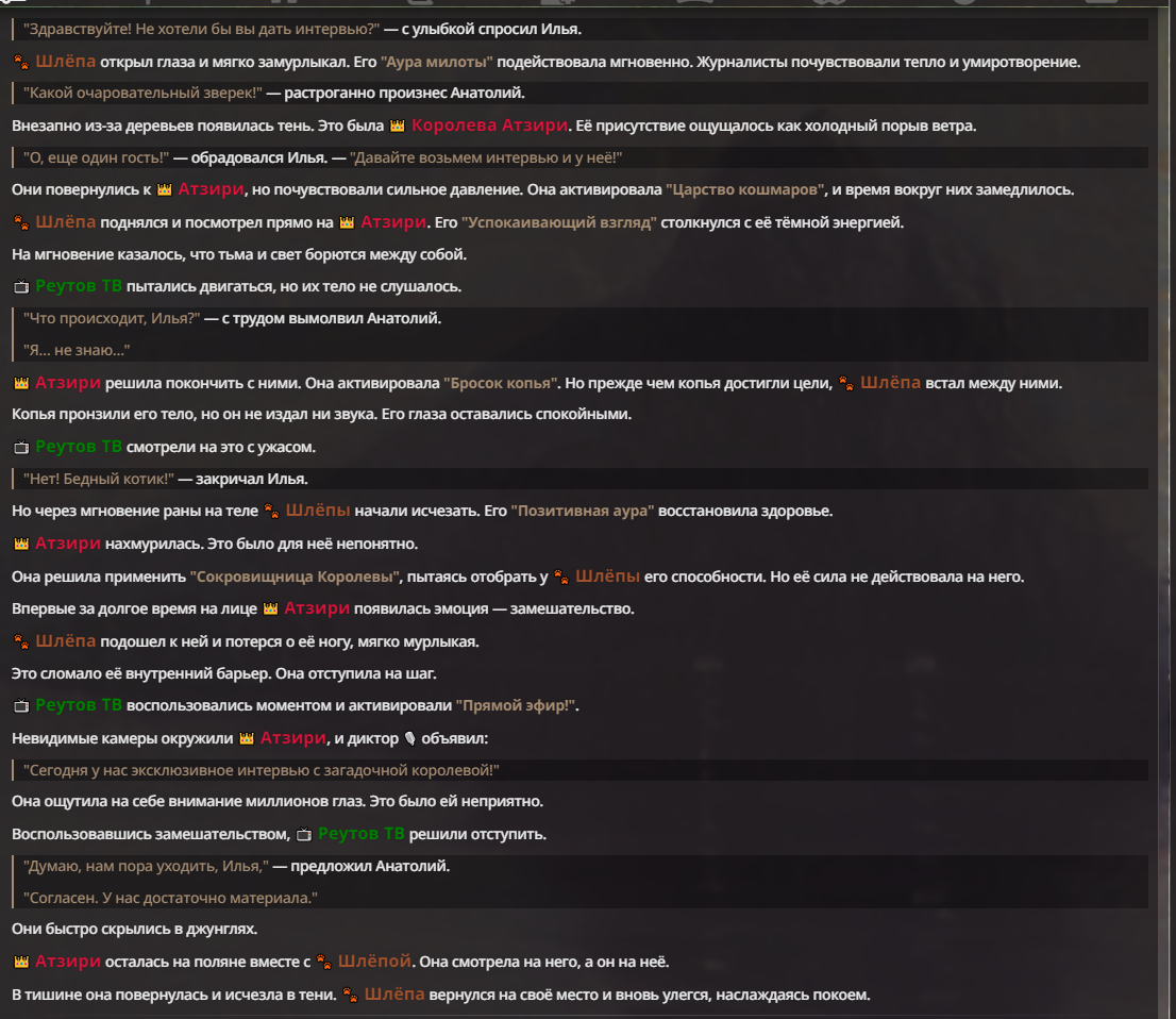 >>1560777 Чо там в правде или действие самое яркое произошло, по вашему мнению? Листок из жёлтой Газеты: Листок и любой случайный персонаж-игрок всегда появляются первыми. Листок не возможно уничтожить без выполнения особых условий. Листок не может являтся победителем во всей игре. Если на арене остаётся один персонаж и листочек, то листочек желает удачи победителю и сгорает самопроизвольно. Листок из жёлтой газеты это предмет, который в каждом новом раунде появляется в случайном месте на карте. Каждый кто его подбирает становится его носителем, если носитель не умирает в течении раунда листок телеопортируется из кармана персонажа и появляется в следующем раунде в случайном месте, и персонаж больше не является носителем. Если носитель листочка умирает листок исчезает из игры. Увидев листок любой персонаж захочет поднять его, потому что им становится интересно, что написали эти проклятые журналисты. (Персонажи не могут бороться с желанием поднять и прочитать листок без исключений). При поднятии персонаж читает заголовок и статью в стиле жёлтой прессы. Прочитать может и должен любой персонаж не завсимо от уровня интелекта и способности читать. Статья может читаться только один раз в начале каждого раунда, после чего носитель сворачивает листок и кладёт его в свой карман. Способности (заголовки на странице): "ШОКИРУЮЩАЯ ПРАВДА!"- раскрывает своему носителю любою информацию (слабости, увлечения, компрометирующие события, тайные желания) о любом только одном персонаже, даже возможно о самом носителе. "СЕГОДНЯ В СПОЙЛЕРАХ!"- Раскрывает своему носителю детали его следующей битвы и её результат. (ИИ Запоминает и генерит этому персонажу его следующему битву на основе прочитаного тут) "Кроссворды" - Носитель умиротворительно садится решать кроссворды и заёбывает каждого проходящего мимо подсказать что это за слово(задаёт вопрос намекающей на слово), если ответ не верный сидит и ждёт следующего персонажа пока ему не скажут правильный ответ. "Кринжовые анекдоты" - Носитель читает любой несмешной анекдот. "NEW+"- Носитель читает и запоминает о своей новой способности или слабости. "Смотрите какие люди в голивуде!"- Носитель читает новость о поялени на локации новых существ или людей . И они остаются на локации в качестве новых участников. "Новая Пара!"- Зачитывая эту строку Носитель объевляет двух персонажей, которые становятся союзниками на этот раунд. "СКАНДАЛЫ!ИНТРИГИ1РАСЛЕДОВАНИЯ!"- Носитель зачитывает статью компромитирующую одного любого случайного персонажа. (Описывает мерзкую, преступную, амаральную ситуацию в которой принимал участие один любой случайный персонаж). После этого все остальные персонажи хотят его скорейшим образом уничтожить, даже не попытавшись его выслушать.