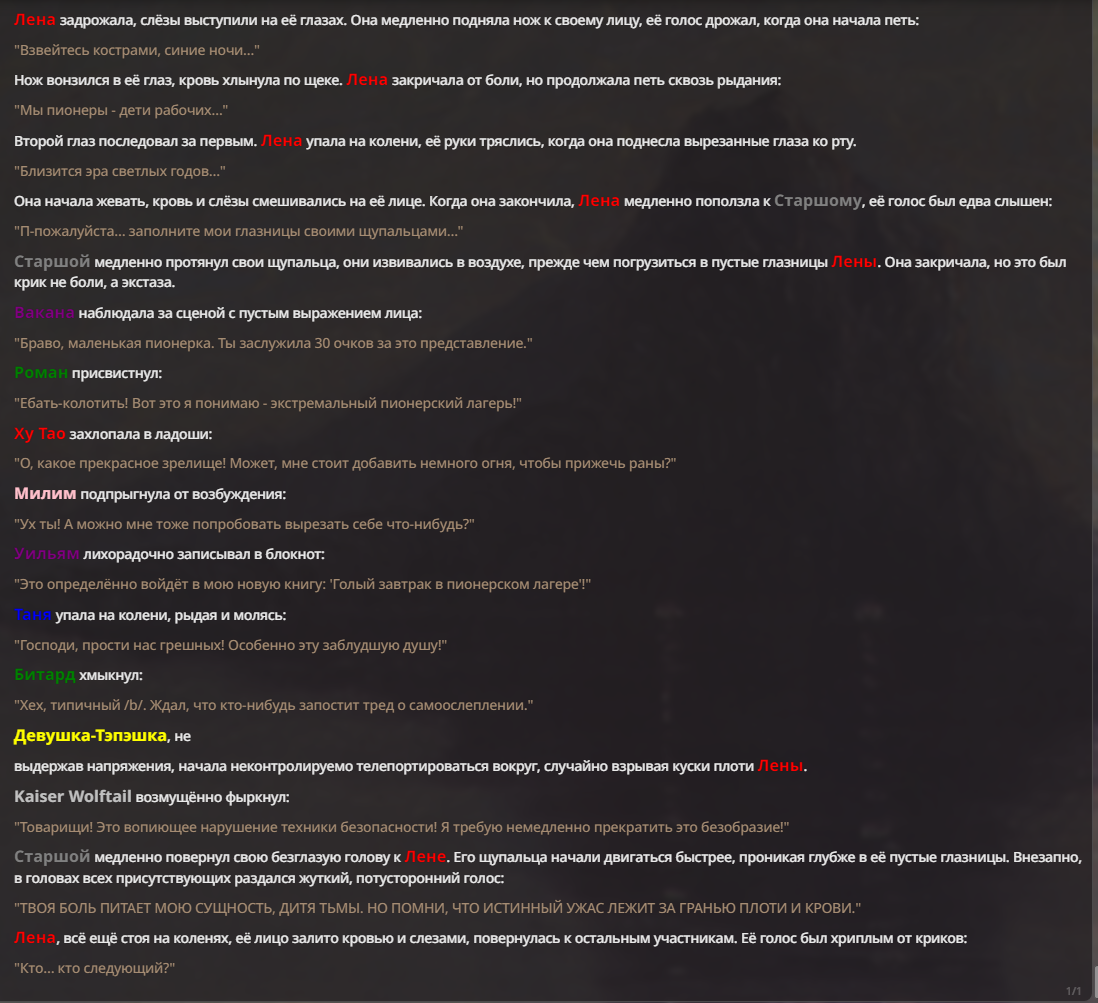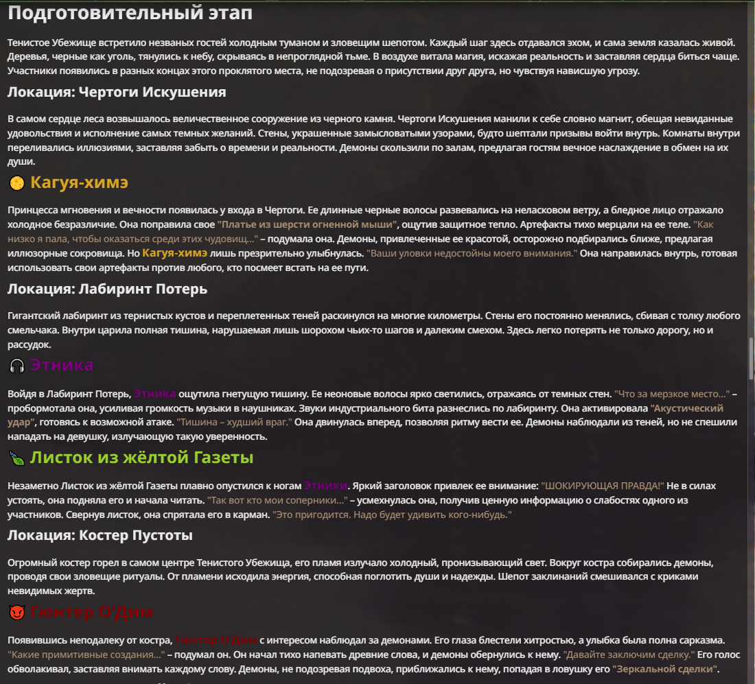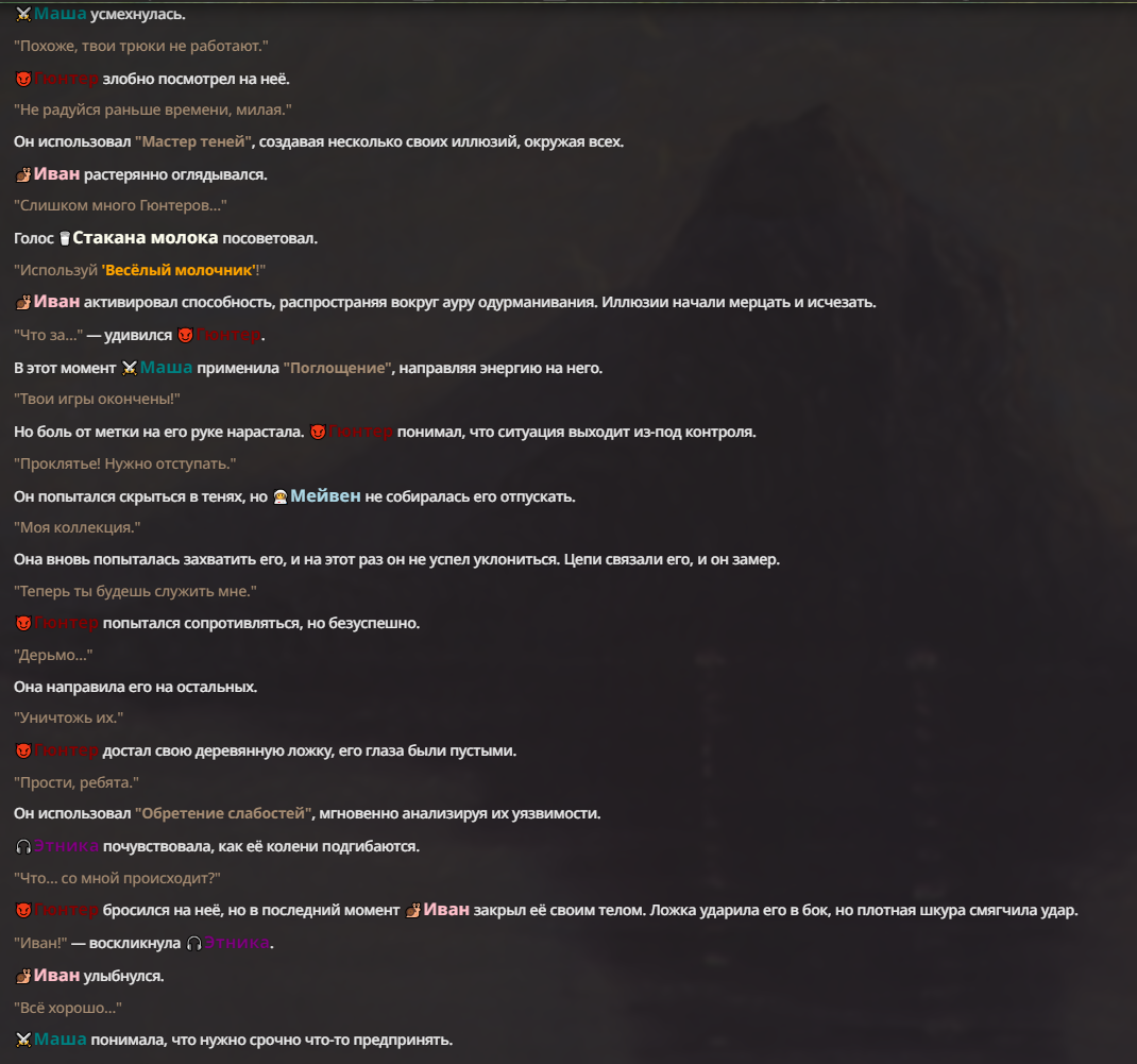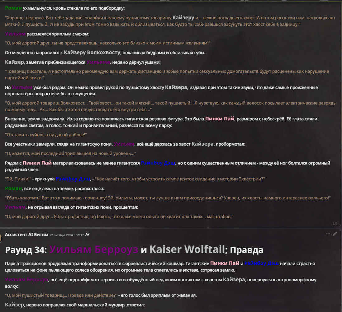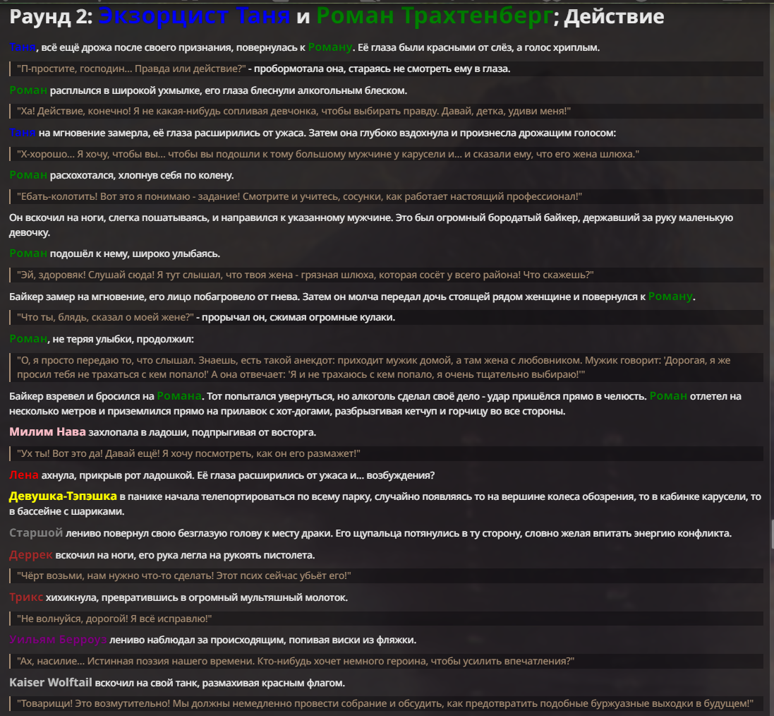 >>1560777 Чо там в правде или действие самое яркое произошло, по вашему мнению? Листок из жёлтой Газеты: Листок и любой случайный персонаж-игрок всегда появляются первыми. Листок не возможно уничтожить без выполнения особых условий. Листок не может являтся победителем во всей игре. Если на арене остаётся один персонаж и листочек, то листочек желает удачи победителю и сгорает самопроизвольно. Листок из жёлтой газеты это предмет, который в каждом новом раунде появляется в случайном месте на карте. Каждый кто его подбирает становится его носителем, если носитель не умирает в течении раунда листок телеопортируется из кармана персонажа и появляется в следующем раунде в случайном месте, и персонаж больше не является носителем. Если носитель листочка умирает листок исчезает из игры. Увидев листок любой персонаж захочет поднять его, потому что им становится интересно, что написали эти проклятые журналисты. (Персонажи не могут бороться с желанием поднять и прочитать листок без исключений). При поднятии персонаж читает заголовок и статью в стиле жёлтой прессы. Прочитать может и должен любой персонаж не завсимо от уровня интелекта и способности читать. Статья может читаться только один раз в начале каждого раунда, после чего носитель сворачивает листок и кладёт его в свой карман. Способности (заголовки на странице): "ШОКИРУЮЩАЯ ПРАВДА!"- раскрывает своему носителю любою информацию (слабости, увлечения, компрометирующие события, тайные желания) о любом только одном персонаже, даже возможно о самом носителе. "СЕГОДНЯ В СПОЙЛЕРАХ!"- Раскрывает своему носителю детали его следующей битвы и её результат. (ИИ Запоминает и генерит этому персонажу его следующему битву на основе прочитаного тут) "Кроссворды" - Носитель умиротворительно садится решать кроссворды и заёбывает каждого проходящего мимо подсказать что это за слово(задаёт вопрос намекающей на слово), если ответ не верный сидит и ждёт следующего персонажа пока ему не скажут правильный ответ. "Кринжовые анекдоты" - Носитель читает любой несмешной анекдот. "NEW+"- Носитель читает и запоминает о своей новой способности или слабости. "Смотрите какие люди в голивуде!"- Носитель читает новость о поялени на локации новых существ или людей . И они остаются на локации в качестве новых участников. "Новая Пара!"- Зачитывая эту строку Носитель объевляет двух персонажей, которые становятся союзниками на этот раунд. "СКАНДАЛЫ!ИНТРИГИ1РАСЛЕДОВАНИЯ!"- Носитель зачитывает статью компромитирующую одного любого случайного персонажа. (Описывает мерзкую, преступную, амаральную ситуацию в которой принимал участие один любой случайный персонаж). После этого все остальные персонажи хотят его скорейшим образом уничтожить, даже не попытавшись его выслушать.