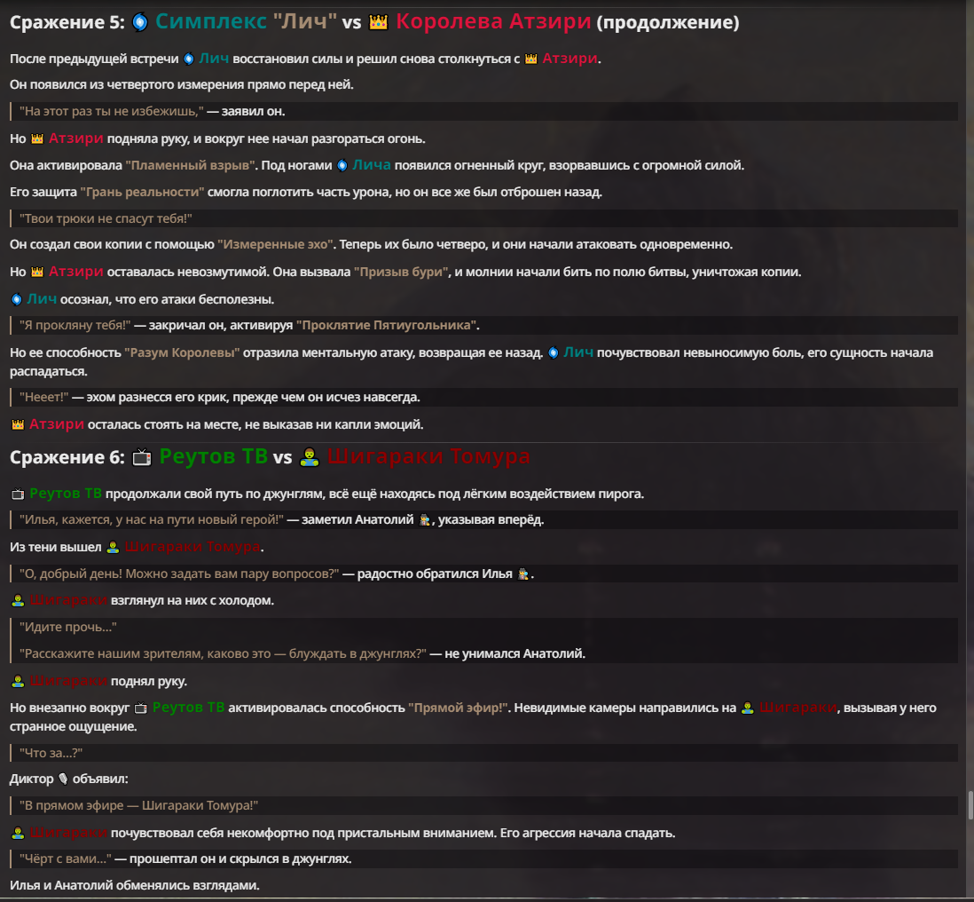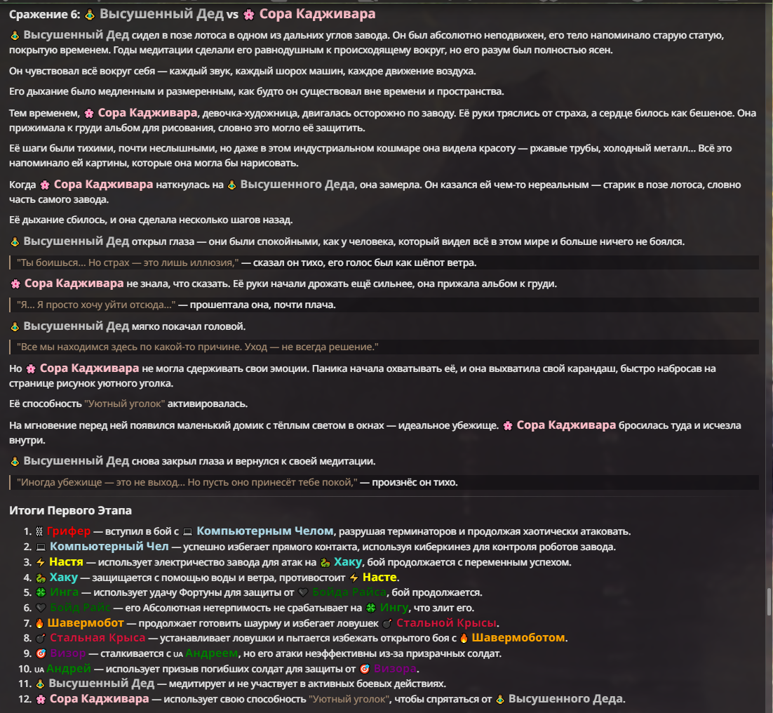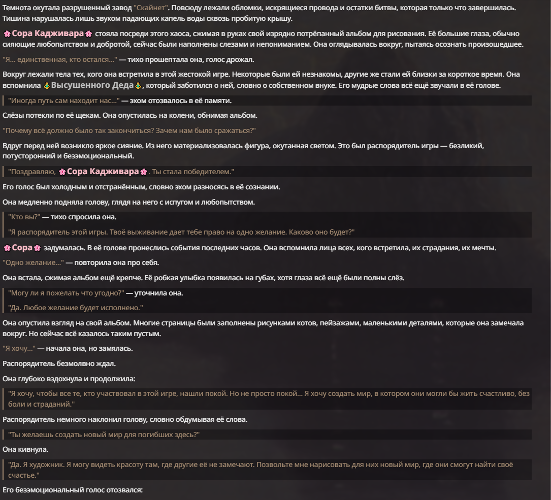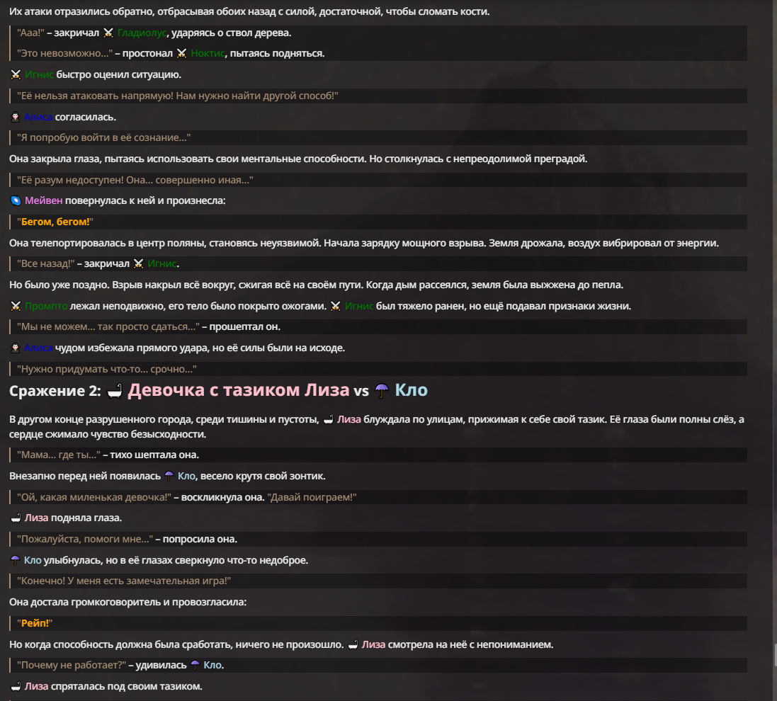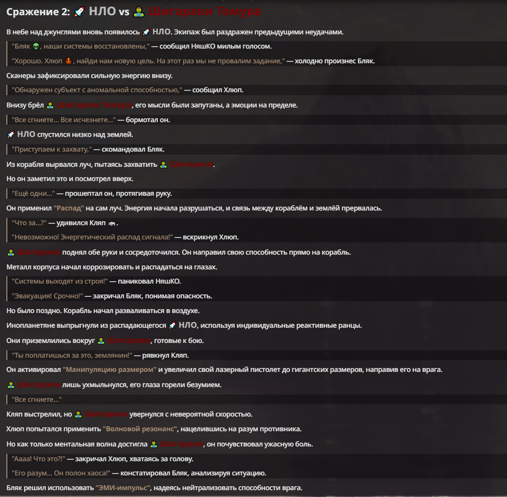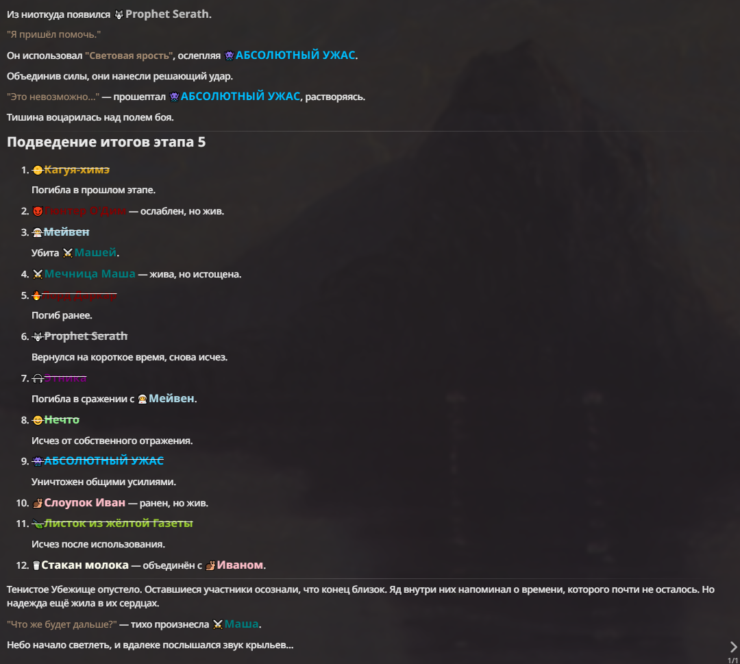 >>1560777 Чо там в правде или действие самое яркое произошло, по вашему мнению? Листок из жёлтой Газеты: Листок и любой случайный персонаж-игрок всегда появляются первыми. Листок не возможно уничтожить без выполнения особых условий. Листок не может являтся победителем во всей игре. Если на арене остаётся один персонаж и листочек, то листочек желает удачи победителю и сгорает самопроизвольно. Листок из жёлтой газеты это предмет, который в каждом новом раунде появляется в случайном месте на карте. Каждый кто его подбирает становится его носителем, если носитель не умирает в течении раунда листок телеопортируется из кармана персонажа и появляется в следующем раунде в случайном месте, и персонаж больше не является носителем. Если носитель листочка умирает листок исчезает из игры. Увидев листок любой персонаж захочет поднять его, потому что им становится интересно, что написали эти проклятые журналисты. (Персонажи не могут бороться с желанием поднять и прочитать листок без исключений). При поднятии персонаж читает заголовок и статью в стиле жёлтой прессы. Прочитать может и должен любой персонаж не завсимо от уровня интелекта и способности читать. Статья может читаться только один раз в начале каждого раунда, после чего носитель сворачивает листок и кладёт его в свой карман. Способности (заголовки на странице): "ШОКИРУЮЩАЯ ПРАВДА!"- раскрывает своему носителю любою информацию (слабости, увлечения, компрометирующие события, тайные желания) о любом только одном персонаже, даже возможно о самом носителе. "СЕГОДНЯ В СПОЙЛЕРАХ!"- Раскрывает своему носителю детали его следующей битвы и её результат. (ИИ Запоминает и генерит этому персонажу его следующему битву на основе прочитаного тут) "Кроссворды" - Носитель умиротворительно садится решать кроссворды и заёбывает каждого проходящего мимо подсказать что это за слово(задаёт вопрос намекающей на слово), если ответ не верный сидит и ждёт следующего персонажа пока ему не скажут правильный ответ. "Кринжовые анекдоты" - Носитель читает любой несмешной анекдот. "NEW+"- Носитель читает и запоминает о своей новой способности или слабости. "Смотрите какие люди в голивуде!"- Носитель читает новость о поялени на локации новых существ или людей . И они остаются на локации в качестве новых участников. "Новая Пара!"- Зачитывая эту строку Носитель объевляет двух персонажей, которые становятся союзниками на этот раунд. "СКАНДАЛЫ!ИНТРИГИ1РАСЛЕДОВАНИЯ!"- Носитель зачитывает статью компромитирующую одного любого случайного персонажа. (Описывает мерзкую, преступную, амаральную ситуацию в которой принимал участие один любой случайный персонаж). После этого все остальные персонажи хотят его скорейшим образом уничтожить, даже не попытавшись его выслушать.