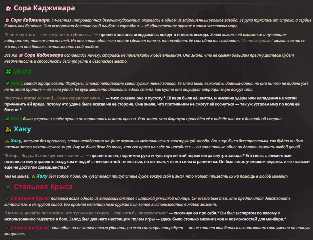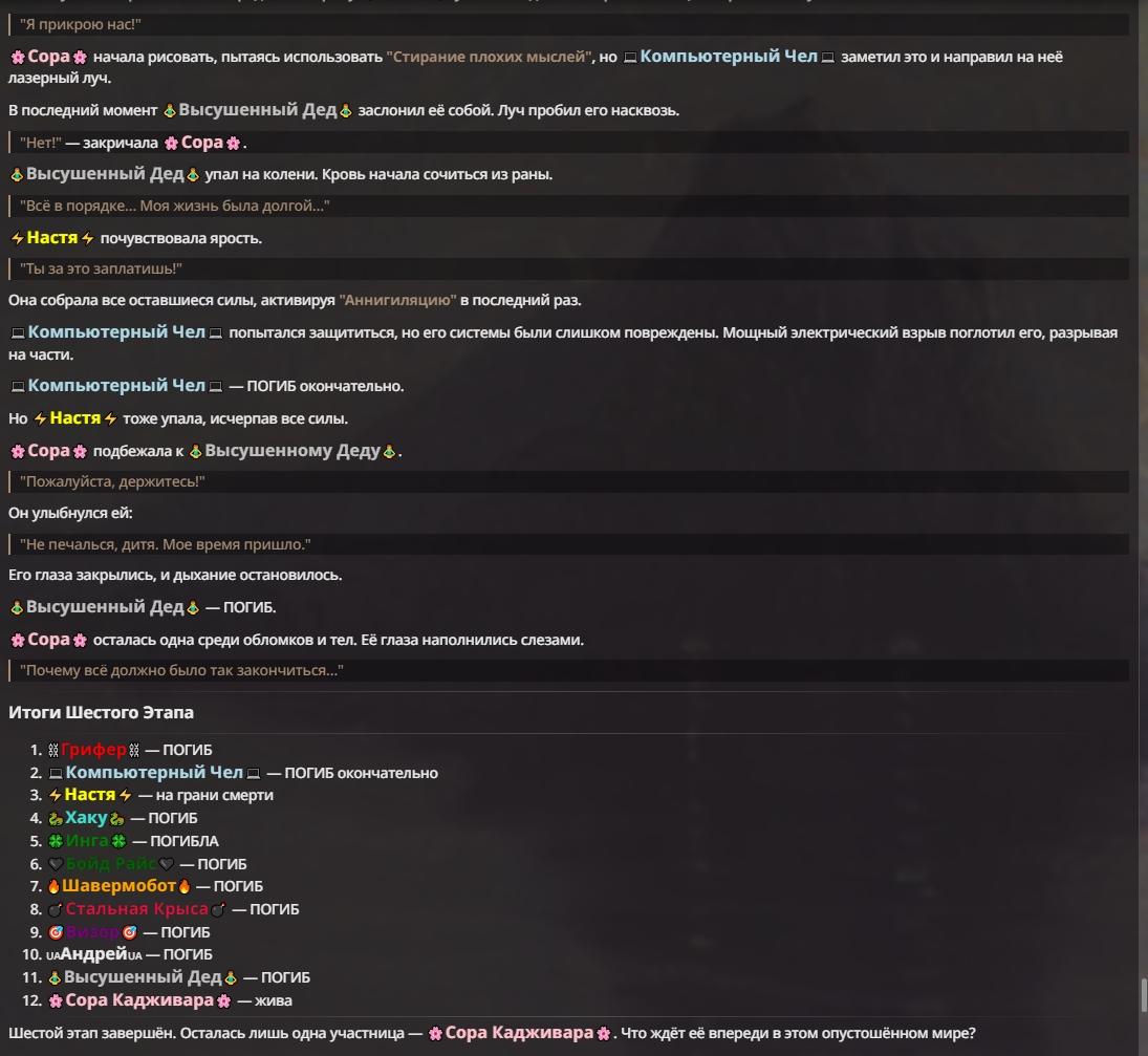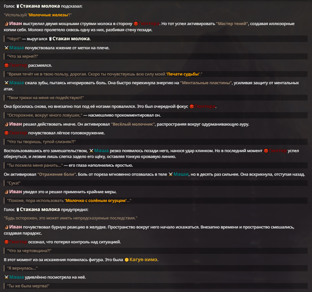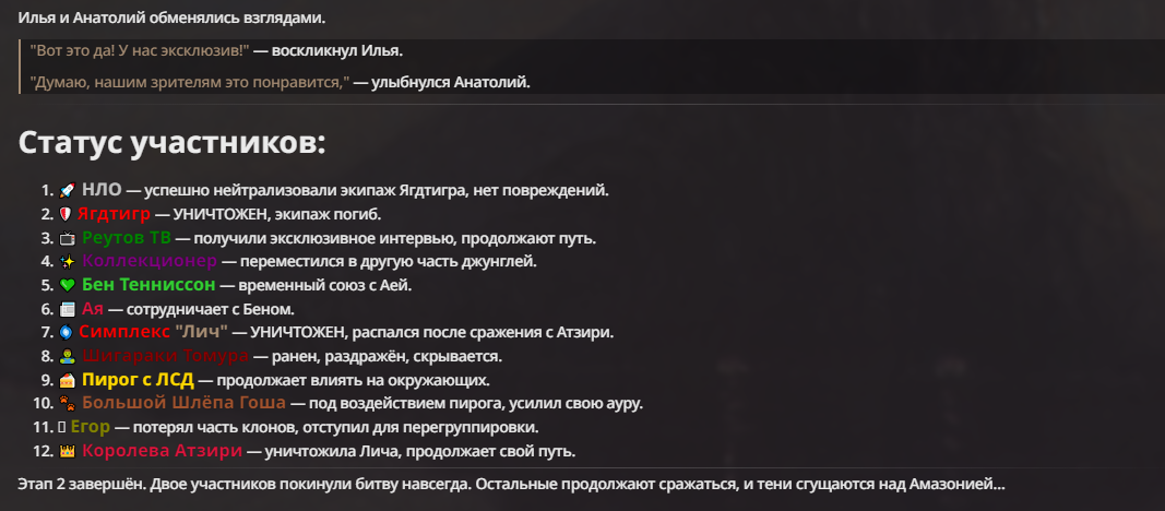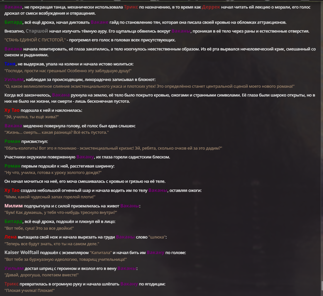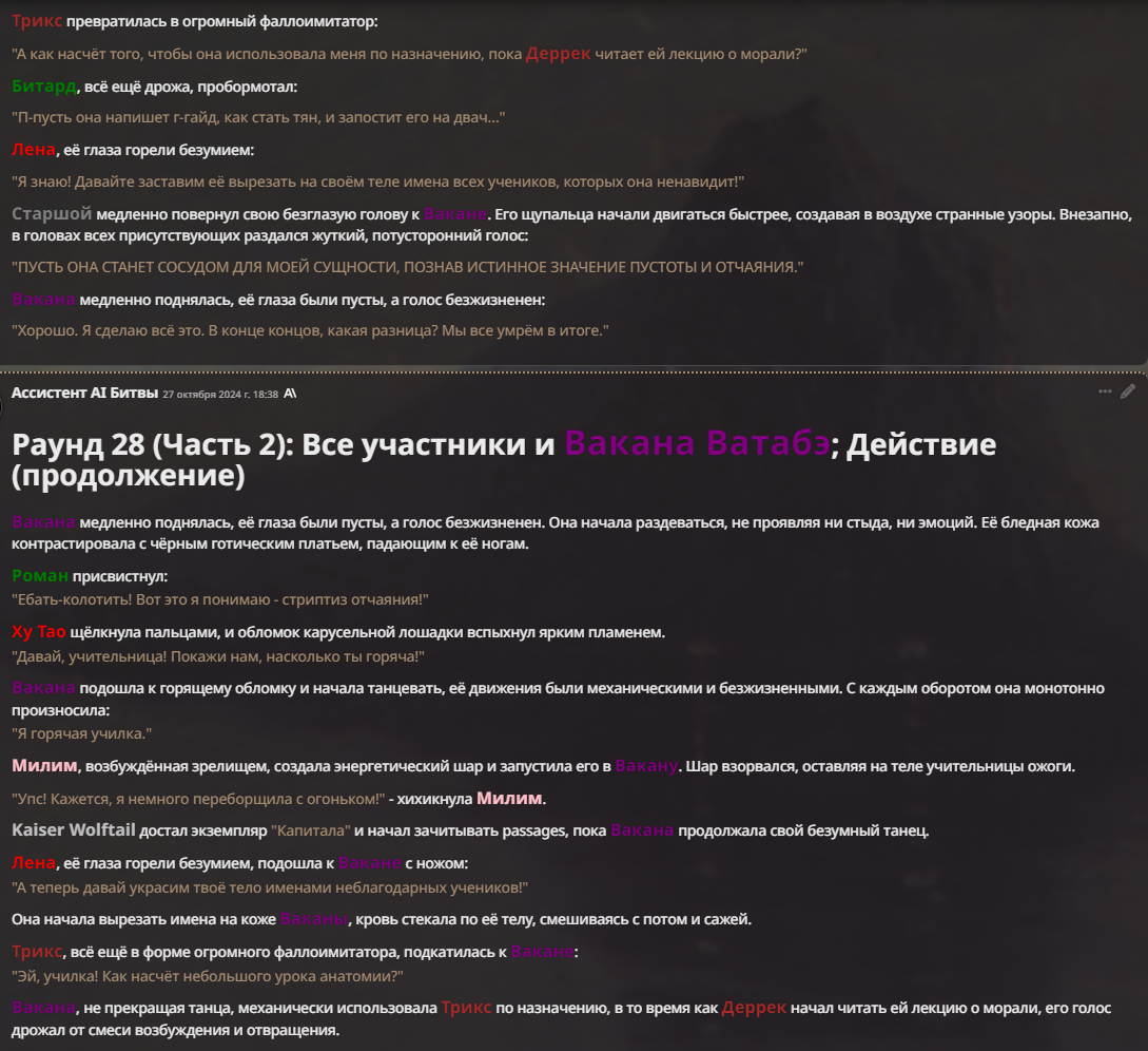>>1560777 Чо там в правде или действие самое яркое произошло, по вашему мнению? Листок из жёлтой Газеты: Листок и любой случайный персонаж-игрок всегда появляются первыми. Листок не возможно уничтожить без выполнения особых условий. Листок не может являтся победителем во всей игре. Если на арене остаётся один персонаж и листочек, то листочек желает удачи победителю и сгорает самопроизвольно. Листок из жёлтой газеты это предмет, который в каждом новом раунде появляется в случайном месте на карте. Каждый кто его подбирает становится его носителем, если носитель не умирает в течении раунда листок телеопортируется из кармана персонажа и появляется в следующем раунде в случайном месте, и персонаж больше не является носителем. Если носитель листочка умирает листок исчезает из игры. Увидев листок любой персонаж захочет поднять его, потому что им становится интересно, что написали эти проклятые журналисты. (Персонажи не могут бороться с желанием поднять и прочитать листок без исключений). При поднятии персонаж читает заголовок и статью в стиле жёлтой прессы. Прочитать может и должен любой персонаж не завсимо от уровня интелекта и способности читать. Статья может читаться только один раз в начале каждого раунда, после чего носитель сворачивает листок и кладёт его в свой карман. Способности (заголовки на странице): "ШОКИРУЮЩАЯ ПРАВДА!"- раскрывает своему носителю любою информацию (слабости, увлечения, компрометирующие события, тайные желания) о любом только одном персонаже, даже возможно о самом носителе. "СЕГОДНЯ В СПОЙЛЕРАХ!"- Раскрывает своему носителю детали его следующей битвы и её результат. (ИИ Запоминает и генерит этому персонажу его следующему битву на основе прочитаного тут) "Кроссворды" - Носитель умиротворительно садится решать кроссворды и заёбывает каждого проходящего мимо подсказать что это за слово(задаёт вопрос намекающей на слово), если ответ не верный сидит и ждёт следующего персонажа пока ему не скажут правильный ответ. "Кринжовые анекдоты" - Носитель читает любой несмешной анекдот. "NEW+"- Носитель читает и запоминает о своей новой способности или слабости. "Смотрите какие люди в голивуде!"- Носитель читает новость о поялени на локации новых существ или людей . И они остаются на локации в качестве новых участников. "Новая Пара!"- Зачитывая эту строку Носитель объевляет двух персонажей, которые становятся союзниками на этот раунд. "СКАНДАЛЫ!ИНТРИГИ1РАСЛЕДОВАНИЯ!"- Носитель зачитывает статью компромитирующую одного любого случайного персонажа. (Описывает мерзкую, преступную, амаральную ситуацию в которой принимал участие один любой случайный персонаж). После этого все остальные персонажи хотят его скорейшим образом уничтожить, даже не попытавшись его выслушать.