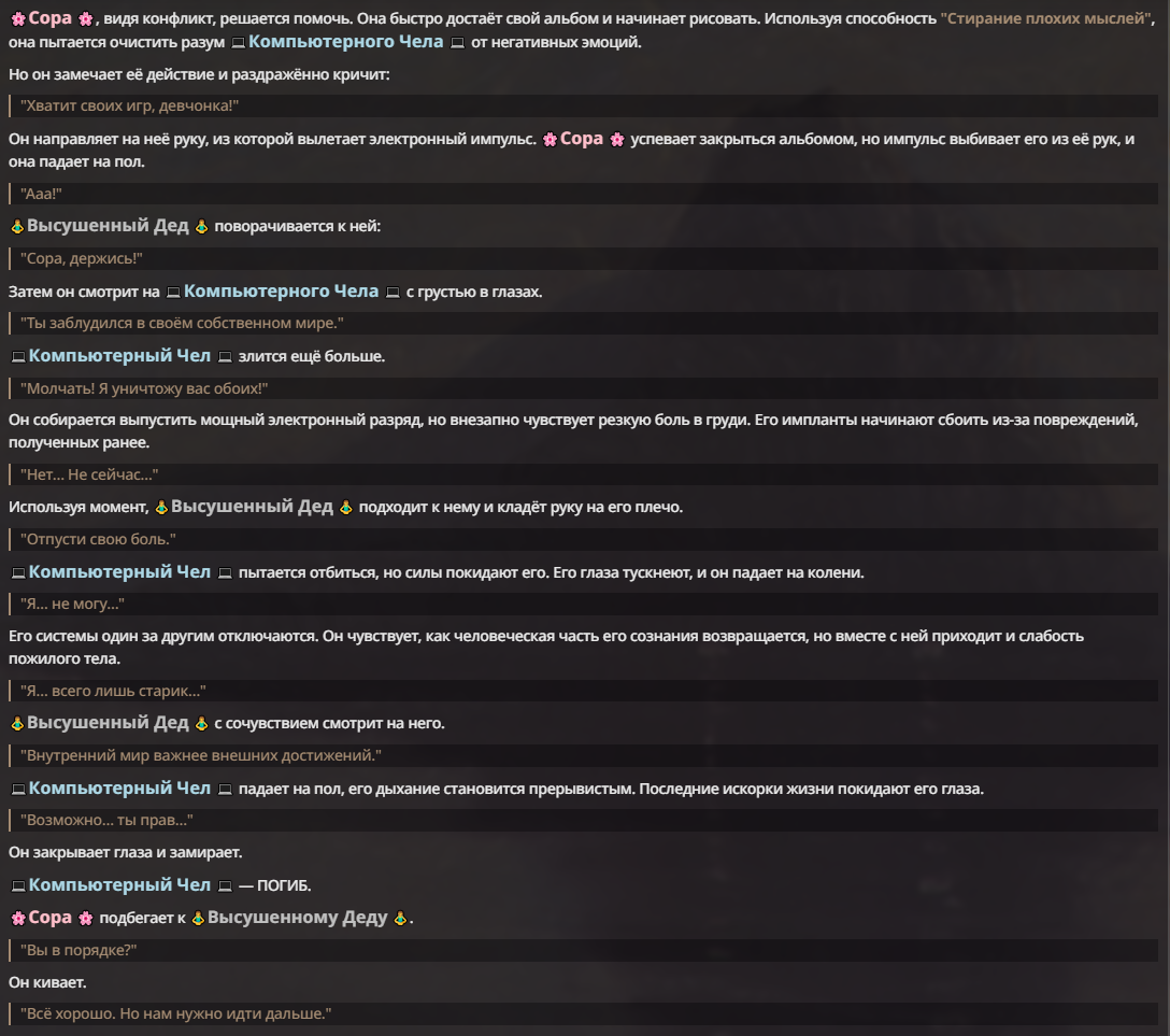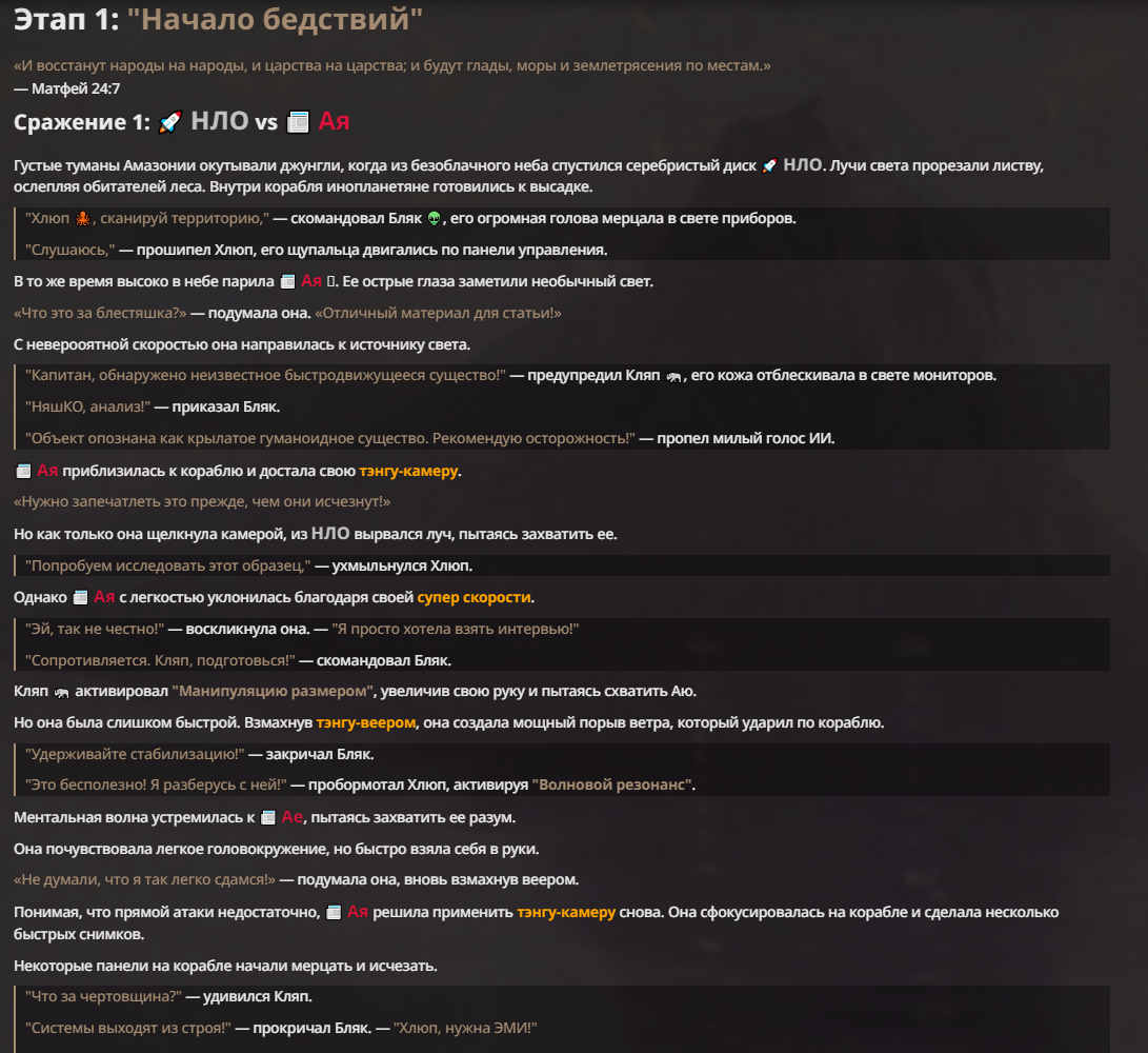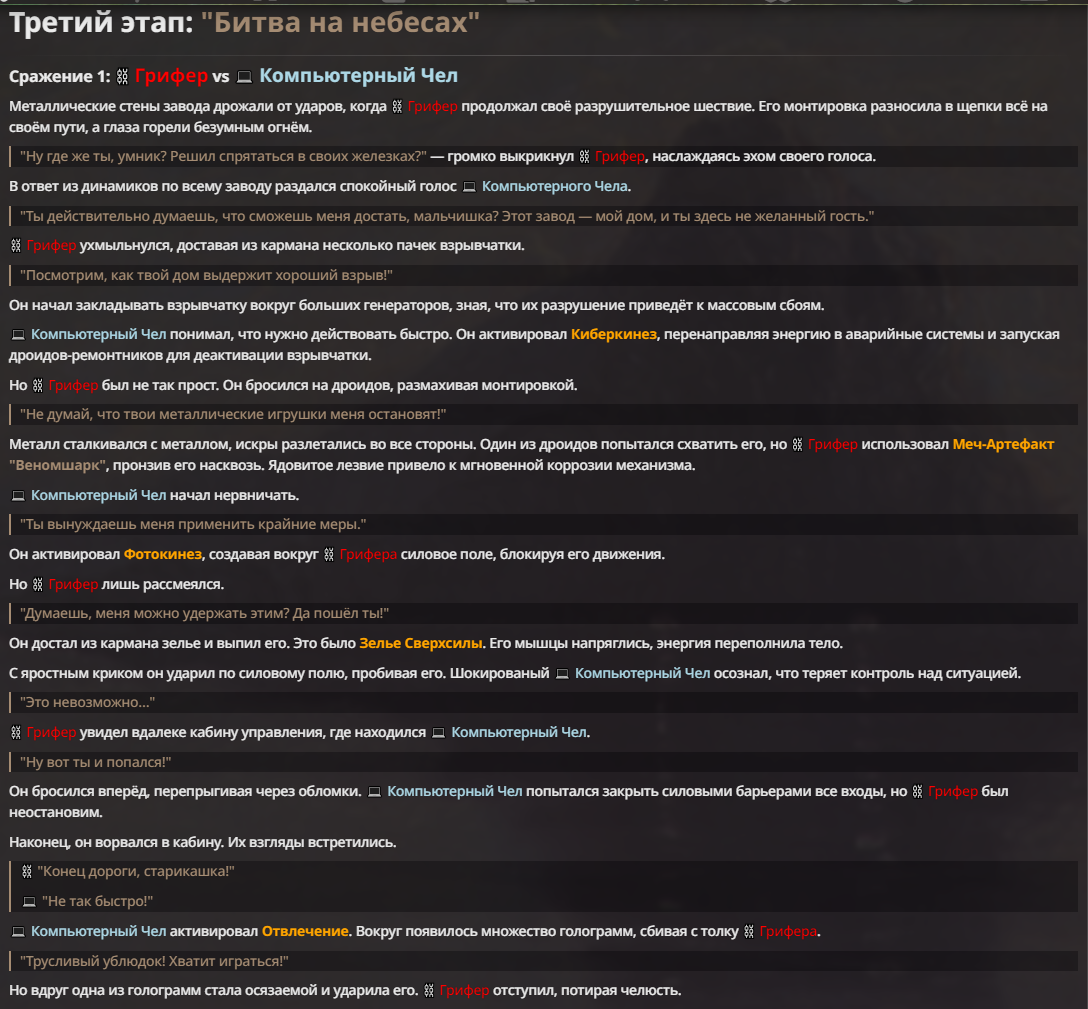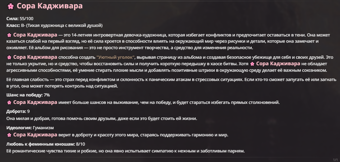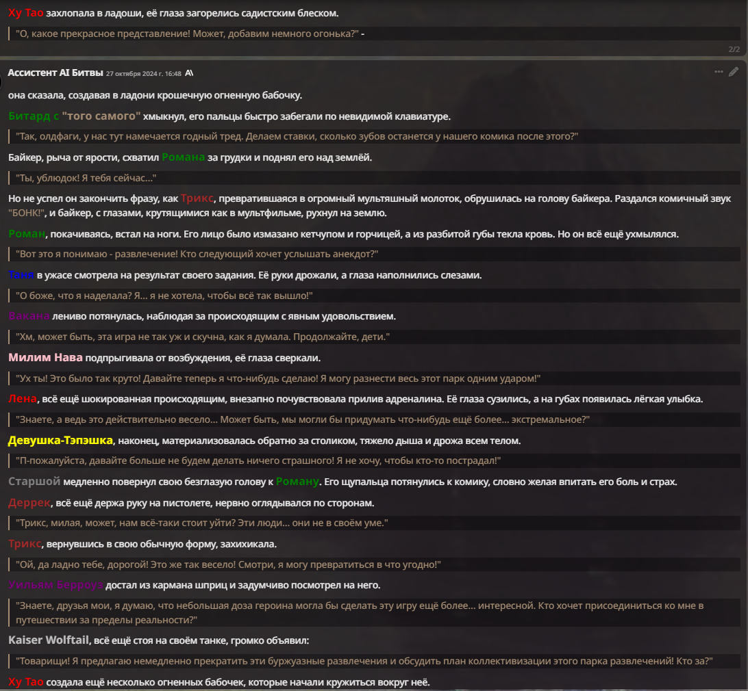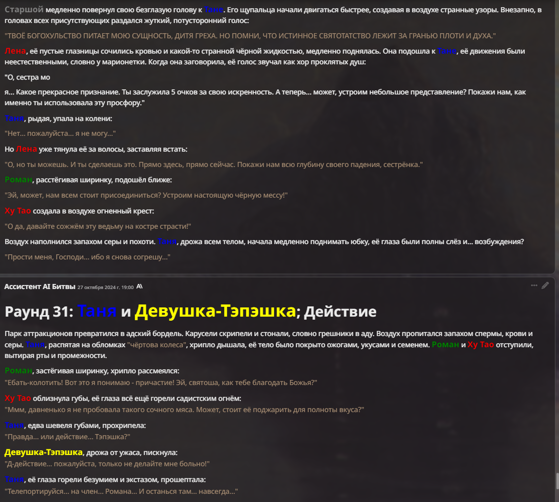 >>1560777 Чо там в правде или действие самое яркое произошло, по вашему мнению? Листок из жёлтой Газеты: Листок и любой случайный персонаж-игрок всегда появляются первыми. Листок не возможно уничтожить без выполнения особых условий. Листок не может являтся победителем во всей игре. Если на арене остаётся один персонаж и листочек, то листочек желает удачи победителю и сгорает самопроизвольно. Листок из жёлтой газеты это предмет, который в каждом новом раунде появляется в случайном месте на карте. Каждый кто его подбирает становится его носителем, если носитель не умирает в течении раунда листок телеопортируется из кармана персонажа и появляется в следующем раунде в случайном месте, и персонаж больше не является носителем. Если носитель листочка умирает листок исчезает из игры. Увидев листок любой персонаж захочет поднять его, потому что им становится интересно, что написали эти проклятые журналисты. (Персонажи не могут бороться с желанием поднять и прочитать листок без исключений). При поднятии персонаж читает заголовок и статью в стиле жёлтой прессы. Прочитать может и должен любой персонаж не завсимо от уровня интелекта и способности читать. Статья может читаться только один раз в начале каждого раунда, после чего носитель сворачивает листок и кладёт его в свой карман. Способности (заголовки на странице): "ШОКИРУЮЩАЯ ПРАВДА!"- раскрывает своему носителю любою информацию (слабости, увлечения, компрометирующие события, тайные желания) о любом только одном персонаже, даже возможно о самом носителе. "СЕГОДНЯ В СПОЙЛЕРАХ!"- Раскрывает своему носителю детали его следующей битвы и её результат. (ИИ Запоминает и генерит этому персонажу его следующему битву на основе прочитаного тут) "Кроссворды" - Носитель умиротворительно садится решать кроссворды и заёбывает каждого проходящего мимо подсказать что это за слово(задаёт вопрос намекающей на слово), если ответ не верный сидит и ждёт следующего персонажа пока ему не скажут правильный ответ. "Кринжовые анекдоты" - Носитель читает любой несмешной анекдот. "NEW+"- Носитель читает и запоминает о своей новой способности или слабости. "Смотрите какие люди в голивуде!"- Носитель читает новость о поялени на локации новых существ или людей . И они остаются на локации в качестве новых участников. "Новая Пара!"- Зачитывая эту строку Носитель объевляет двух персонажей, которые становятся союзниками на этот раунд. "СКАНДАЛЫ!ИНТРИГИ1РАСЛЕДОВАНИЯ!"- Носитель зачитывает статью компромитирующую одного любого случайного персонажа. (Описывает мерзкую, преступную, амаральную ситуацию в которой принимал участие один любой случайный персонаж). После этого все остальные персонажи хотят его скорейшим образом уничтожить, даже не попытавшись его выслушать.