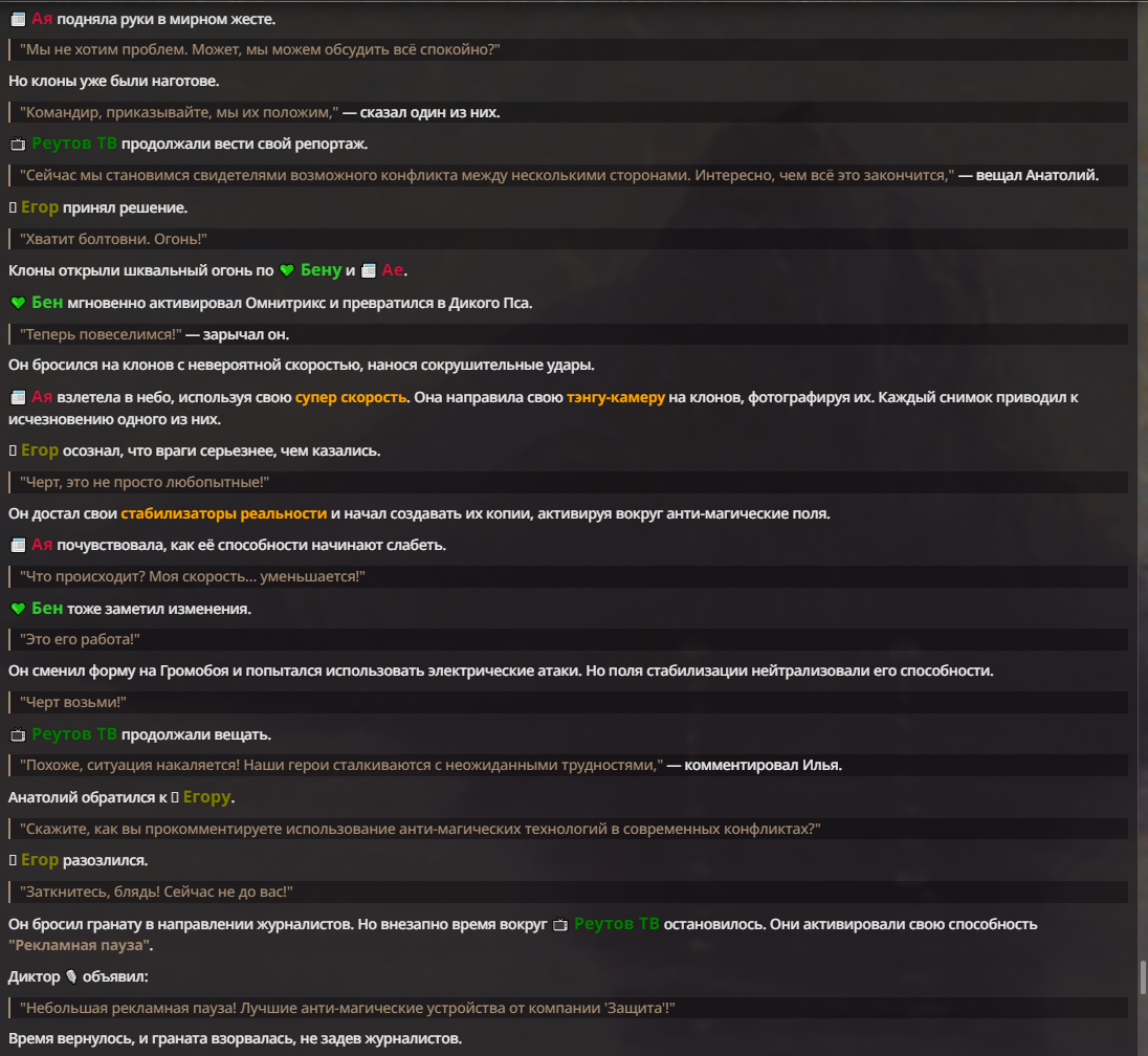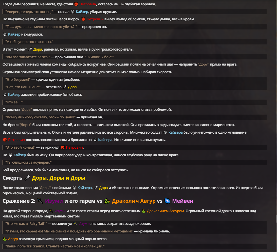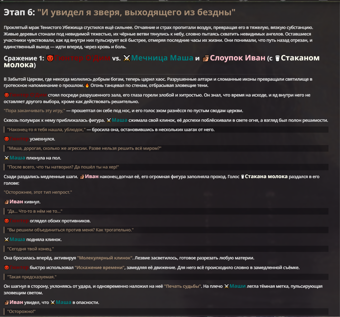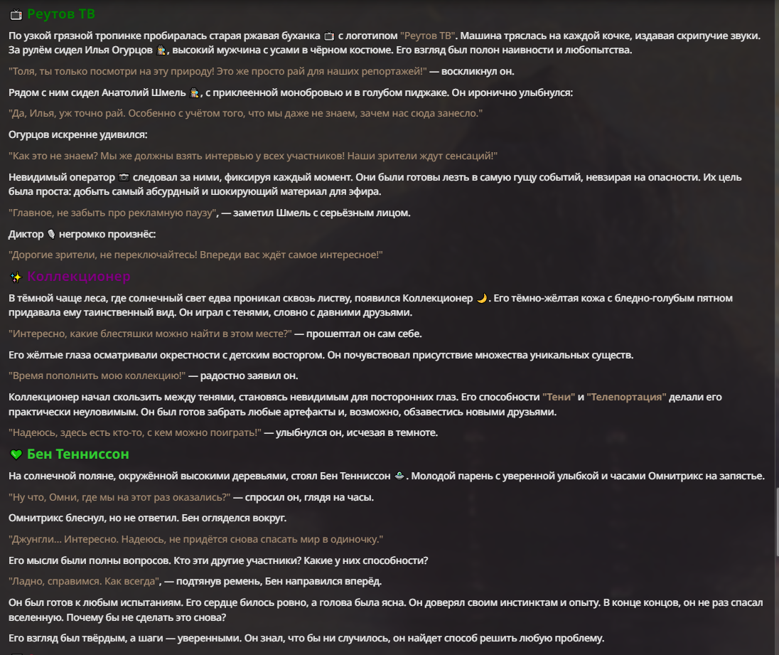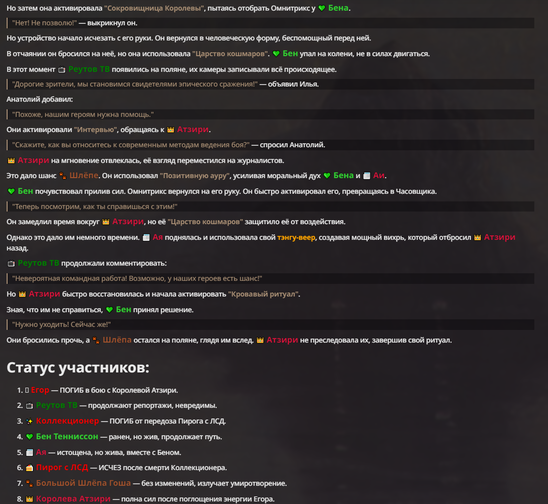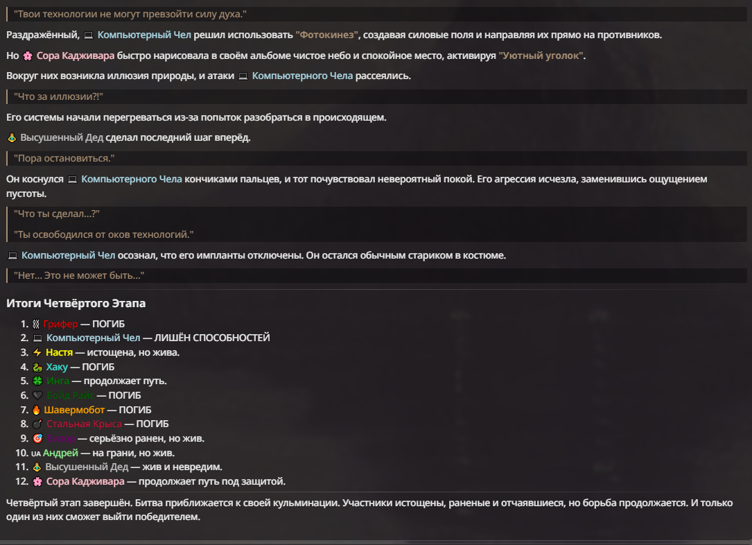 >>1560777 Чо там в правде или действие самое яркое произошло, по вашему мнению? Листок из жёлтой Газеты: Листок и любой случайный персонаж-игрок всегда появляются первыми. Листок не возможно уничтожить без выполнения особых условий. Листок не может являтся победителем во всей игре. Если на арене остаётся один персонаж и листочек, то листочек желает удачи победителю и сгорает самопроизвольно. Листок из жёлтой газеты это предмет, который в каждом новом раунде появляется в случайном месте на карте. Каждый кто его подбирает становится его носителем, если носитель не умирает в течении раунда листок телеопортируется из кармана персонажа и появляется в следующем раунде в случайном месте, и персонаж больше не является носителем. Если носитель листочка умирает листок исчезает из игры. Увидев листок любой персонаж захочет поднять его, потому что им становится интересно, что написали эти проклятые журналисты. (Персонажи не могут бороться с желанием поднять и прочитать листок без исключений). При поднятии персонаж читает заголовок и статью в стиле жёлтой прессы. Прочитать может и должен любой персонаж не завсимо от уровня интелекта и способности читать. Статья может читаться только один раз в начале каждого раунда, после чего носитель сворачивает листок и кладёт его в свой карман. Способности (заголовки на странице): "ШОКИРУЮЩАЯ ПРАВДА!"- раскрывает своему носителю любою информацию (слабости, увлечения, компрометирующие события, тайные желания) о любом только одном персонаже, даже возможно о самом носителе. "СЕГОДНЯ В СПОЙЛЕРАХ!"- Раскрывает своему носителю детали его следующей битвы и её результат. (ИИ Запоминает и генерит этому персонажу его следующему битву на основе прочитаного тут) "Кроссворды" - Носитель умиротворительно садится решать кроссворды и заёбывает каждого проходящего мимо подсказать что это за слово(задаёт вопрос намекающей на слово), если ответ не верный сидит и ждёт следующего персонажа пока ему не скажут правильный ответ. "Кринжовые анекдоты" - Носитель читает любой несмешной анекдот. "NEW+"- Носитель читает и запоминает о своей новой способности или слабости. "Смотрите какие люди в голивуде!"- Носитель читает новость о поялени на локации новых существ или людей . И они остаются на локации в качестве новых участников. "Новая Пара!"- Зачитывая эту строку Носитель объевляет двух персонажей, которые становятся союзниками на этот раунд. "СКАНДАЛЫ!ИНТРИГИ1РАСЛЕДОВАНИЯ!"- Носитель зачитывает статью компромитирующую одного любого случайного персонажа. (Описывает мерзкую, преступную, амаральную ситуацию в которой принимал участие один любой случайный персонаж). После этого все остальные персонажи хотят его скорейшим образом уничтожить, даже не попытавшись его выслушать.