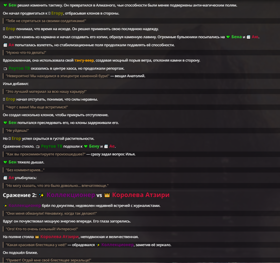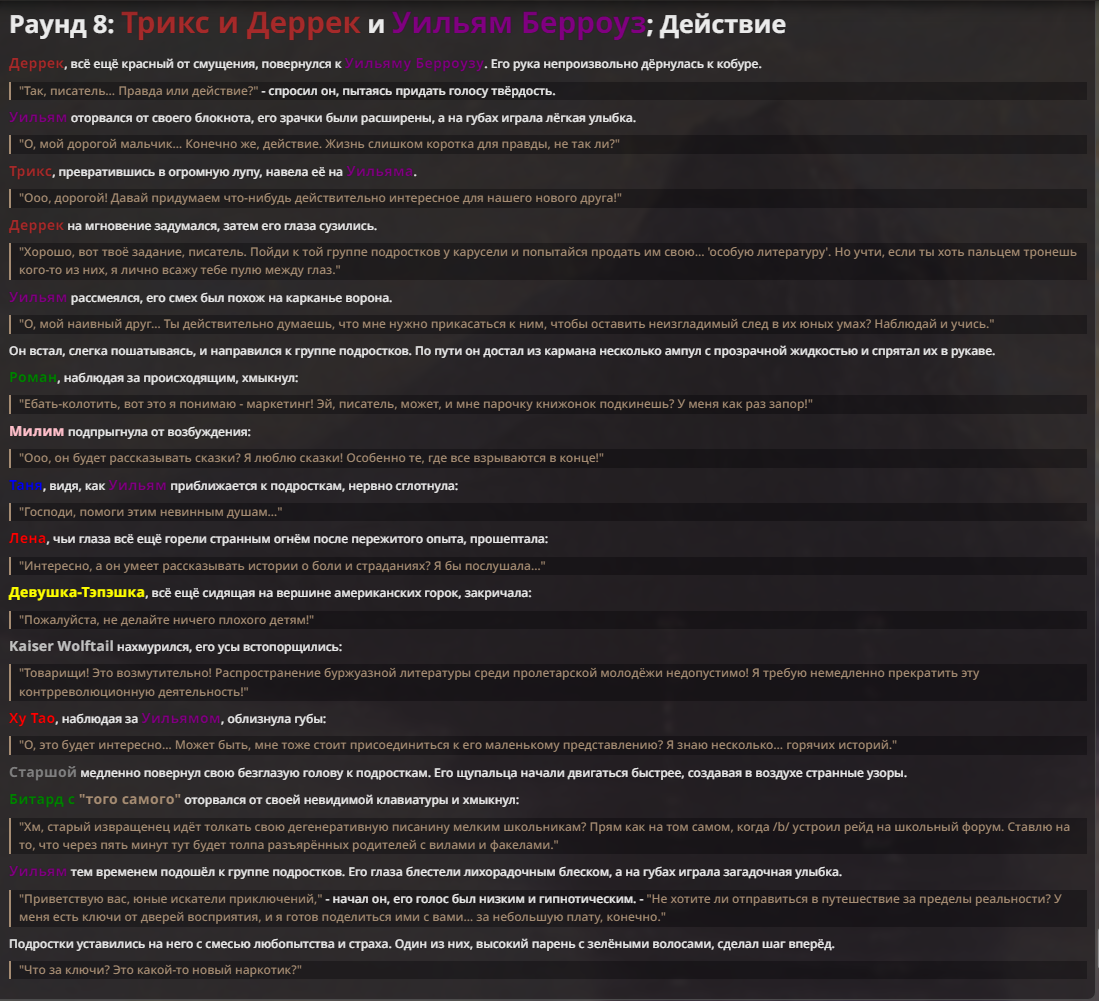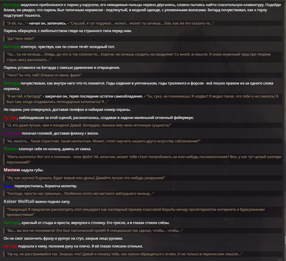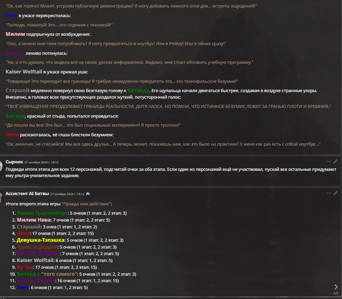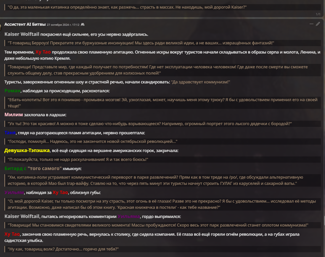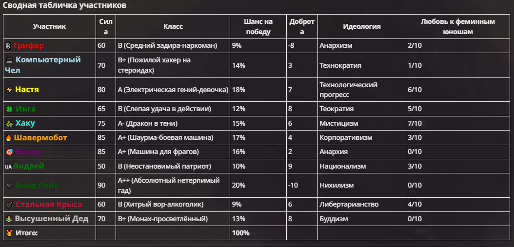 >>1560777 Чо там в правде или действие самое яркое произошло, по вашему мнению? Листок из жёлтой Газеты: Листок и любой случайный персонаж-игрок всегда появляются первыми. Листок не возможно уничтожить без выполнения особых условий. Листок не может являтся победителем во всей игре. Если на арене остаётся один персонаж и листочек, то листочек желает удачи победителю и сгорает самопроизвольно. Листок из жёлтой газеты это предмет, который в каждом новом раунде появляется в случайном месте на карте. Каждый кто его подбирает становится его носителем, если носитель не умирает в течении раунда листок телеопортируется из кармана персонажа и появляется в следующем раунде в случайном месте, и персонаж больше не является носителем. Если носитель листочка умирает листок исчезает из игры. Увидев листок любой персонаж захочет поднять его, потому что им становится интересно, что написали эти проклятые журналисты. (Персонажи не могут бороться с желанием поднять и прочитать листок без исключений). При поднятии персонаж читает заголовок и статью в стиле жёлтой прессы. Прочитать может и должен любой персонаж не завсимо от уровня интелекта и способности читать. Статья может читаться только один раз в начале каждого раунда, после чего носитель сворачивает листок и кладёт его в свой карман. Способности (заголовки на странице): "ШОКИРУЮЩАЯ ПРАВДА!"- раскрывает своему носителю любою информацию (слабости, увлечения, компрометирующие события, тайные желания) о любом только одном персонаже, даже возможно о самом носителе. "СЕГОДНЯ В СПОЙЛЕРАХ!"- Раскрывает своему носителю детали его следующей битвы и её результат. (ИИ Запоминает и генерит этому персонажу его следующему битву на основе прочитаного тут) "Кроссворды" - Носитель умиротворительно садится решать кроссворды и заёбывает каждого проходящего мимо подсказать что это за слово(задаёт вопрос намекающей на слово), если ответ не верный сидит и ждёт следующего персонажа пока ему не скажут правильный ответ. "Кринжовые анекдоты" - Носитель читает любой несмешной анекдот. "NEW+"- Носитель читает и запоминает о своей новой способности или слабости. "Смотрите какие люди в голивуде!"- Носитель читает новость о поялени на локации новых существ или людей . И они остаются на локации в качестве новых участников. "Новая Пара!"- Зачитывая эту строку Носитель объевляет двух персонажей, которые становятся союзниками на этот раунд. "СКАНДАЛЫ!ИНТРИГИ1РАСЛЕДОВАНИЯ!"- Носитель зачитывает статью компромитирующую одного любого случайного персонажа. (Описывает мерзкую, преступную, амаральную ситуацию в которой принимал участие один любой случайный персонаж). После этого все остальные персонажи хотят его скорейшим образом уничтожить, даже не попытавшись его выслушать.
