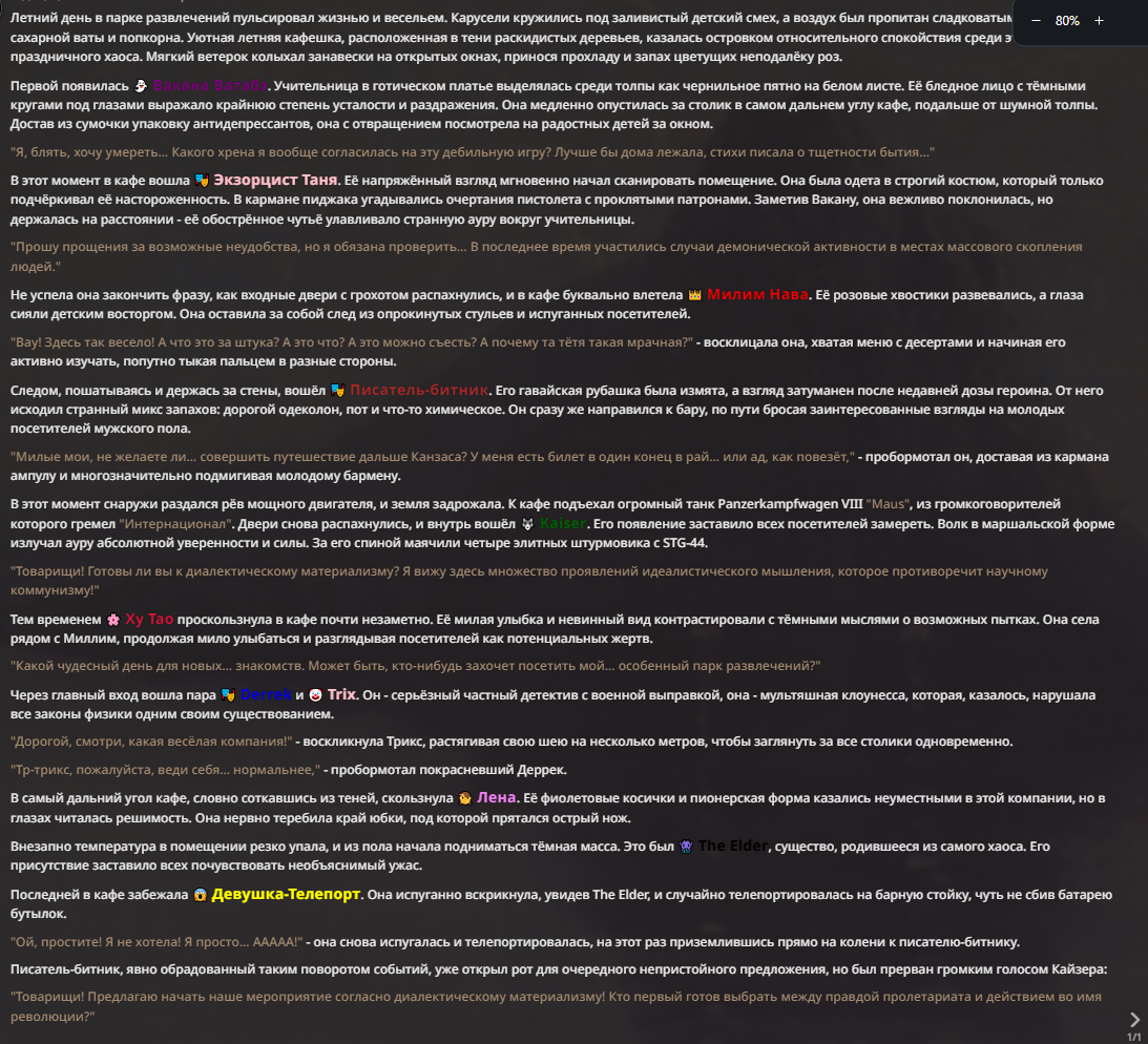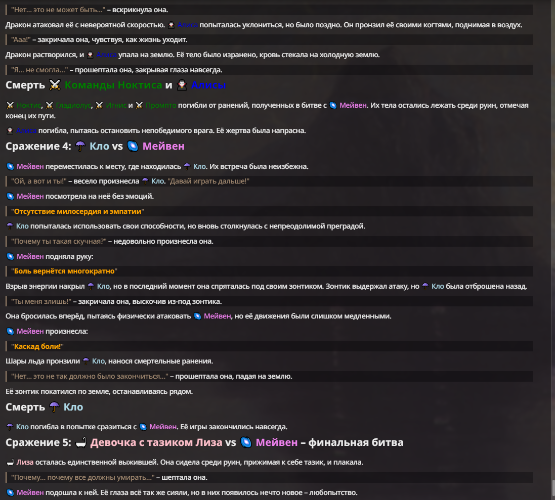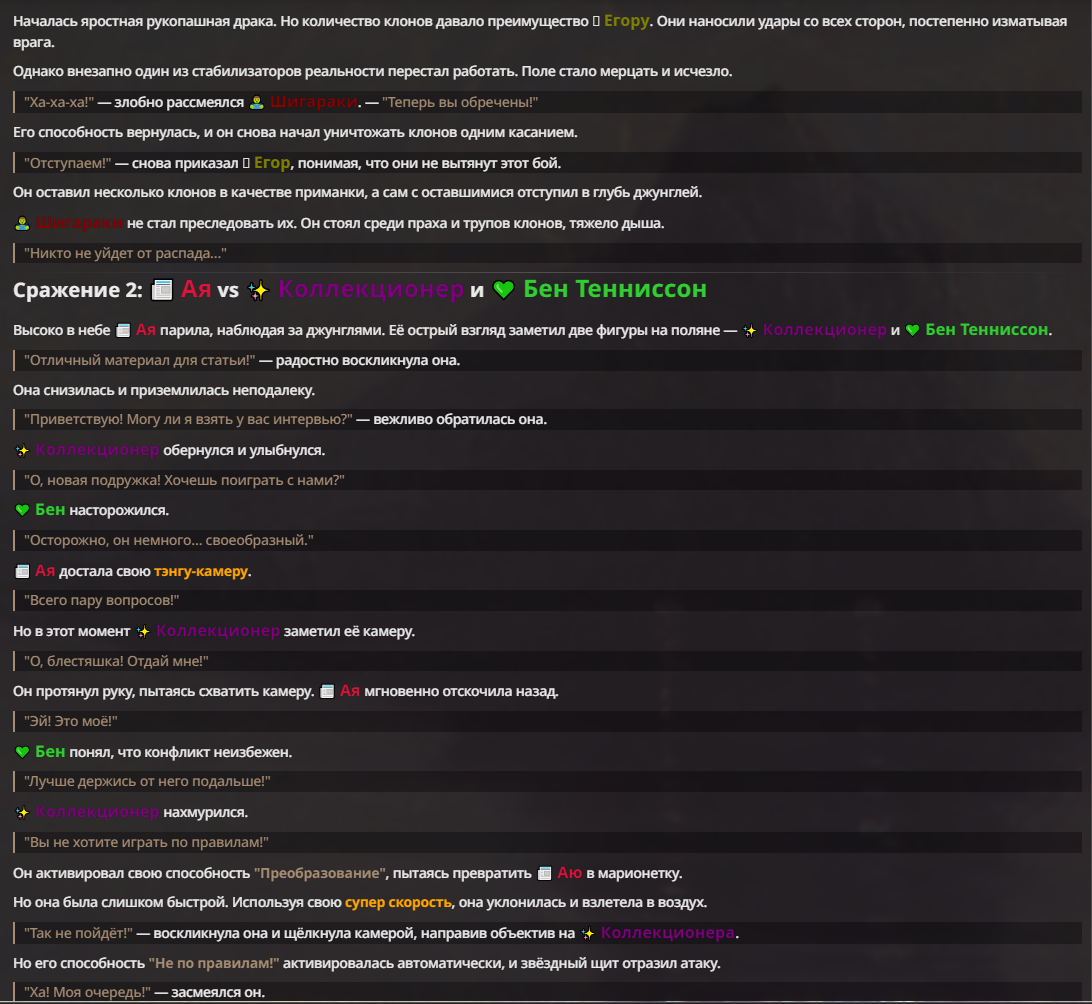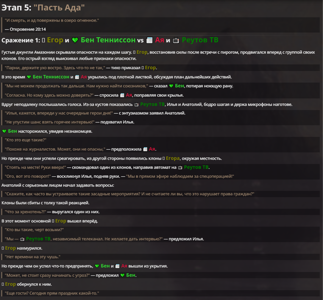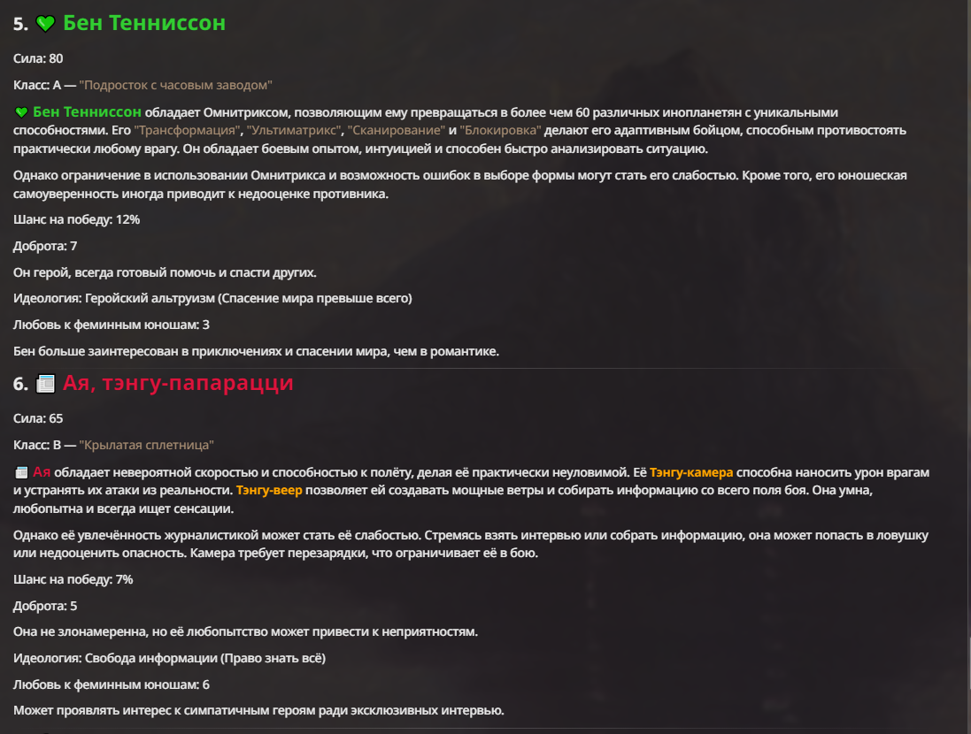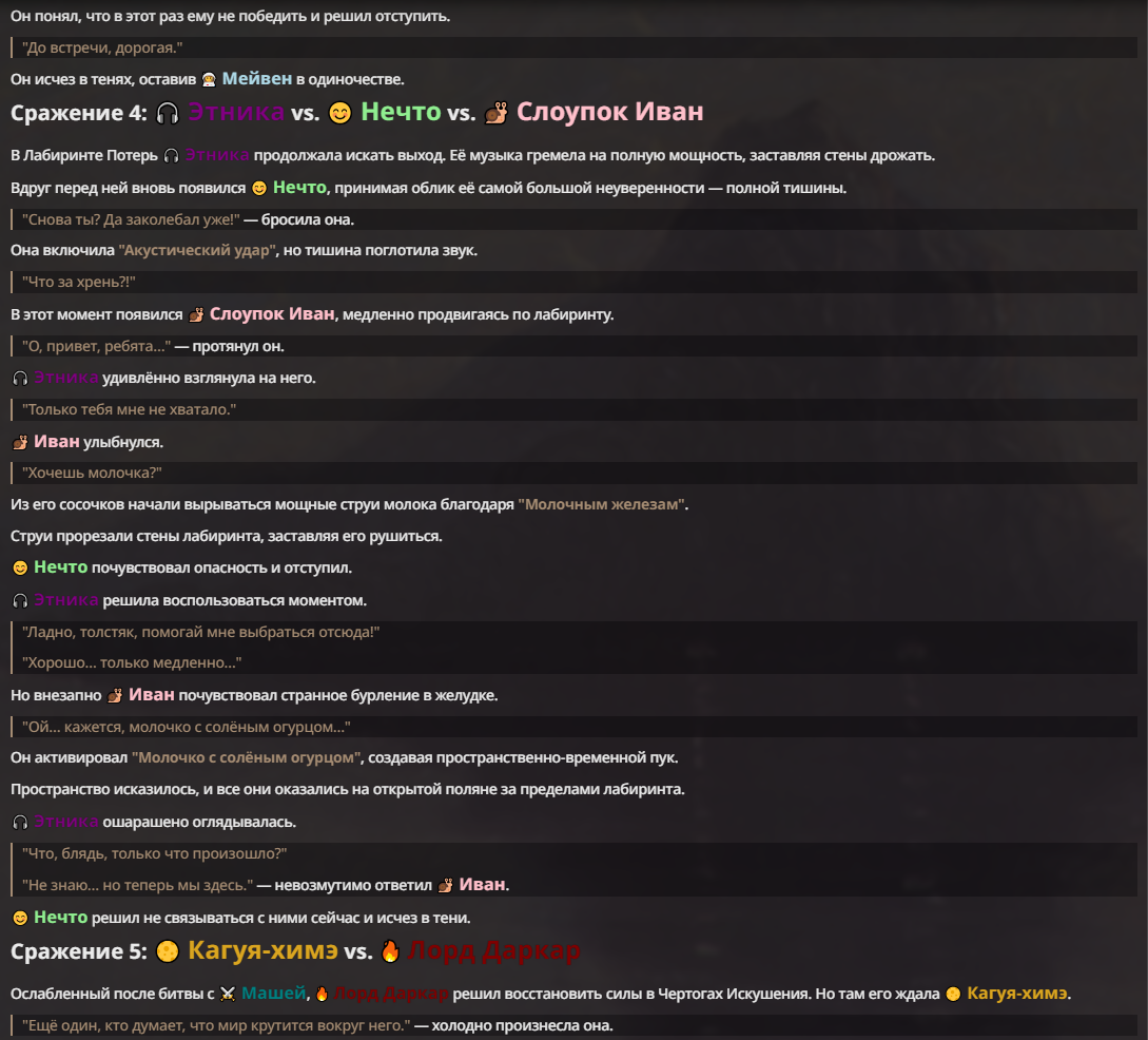 >>1560777 Чо там в правде или действие самое яркое произошло, по вашему мнению? Листок из жёлтой Газеты: Листок и любой случайный персонаж-игрок всегда появляются первыми. Листок не возможно уничтожить без выполнения особых условий. Листок не может являтся победителем во всей игре. Если на арене остаётся один персонаж и листочек, то листочек желает удачи победителю и сгорает самопроизвольно. Листок из жёлтой газеты это предмет, который в каждом новом раунде появляется в случайном месте на карте. Каждый кто его подбирает становится его носителем, если носитель не умирает в течении раунда листок телеопортируется из кармана персонажа и появляется в следующем раунде в случайном месте, и персонаж больше не является носителем. Если носитель листочка умирает листок исчезает из игры. Увидев листок любой персонаж захочет поднять его, потому что им становится интересно, что написали эти проклятые журналисты. (Персонажи не могут бороться с желанием поднять и прочитать листок без исключений). При поднятии персонаж читает заголовок и статью в стиле жёлтой прессы. Прочитать может и должен любой персонаж не завсимо от уровня интелекта и способности читать. Статья может читаться только один раз в начале каждого раунда, после чего носитель сворачивает листок и кладёт его в свой карман. Способности (заголовки на странице): "ШОКИРУЮЩАЯ ПРАВДА!"- раскрывает своему носителю любою информацию (слабости, увлечения, компрометирующие события, тайные желания) о любом только одном персонаже, даже возможно о самом носителе. "СЕГОДНЯ В СПОЙЛЕРАХ!"- Раскрывает своему носителю детали его следующей битвы и её результат. (ИИ Запоминает и генерит этому персонажу его следующему битву на основе прочитаного тут) "Кроссворды" - Носитель умиротворительно садится решать кроссворды и заёбывает каждого проходящего мимо подсказать что это за слово(задаёт вопрос намекающей на слово), если ответ не верный сидит и ждёт следующего персонажа пока ему не скажут правильный ответ. "Кринжовые анекдоты" - Носитель читает любой несмешной анекдот. "NEW+"- Носитель читает и запоминает о своей новой способности или слабости. "Смотрите какие люди в голивуде!"- Носитель читает новость о поялени на локации новых существ или людей . И они остаются на локации в качестве новых участников. "Новая Пара!"- Зачитывая эту строку Носитель объевляет двух персонажей, которые становятся союзниками на этот раунд. "СКАНДАЛЫ!ИНТРИГИ1РАСЛЕДОВАНИЯ!"- Носитель зачитывает статью компромитирующую одного любого случайного персонажа. (Описывает мерзкую, преступную, амаральную ситуацию в которой принимал участие один любой случайный персонаж). После этого все остальные персонажи хотят его скорейшим образом уничтожить, даже не попытавшись его выслушать.