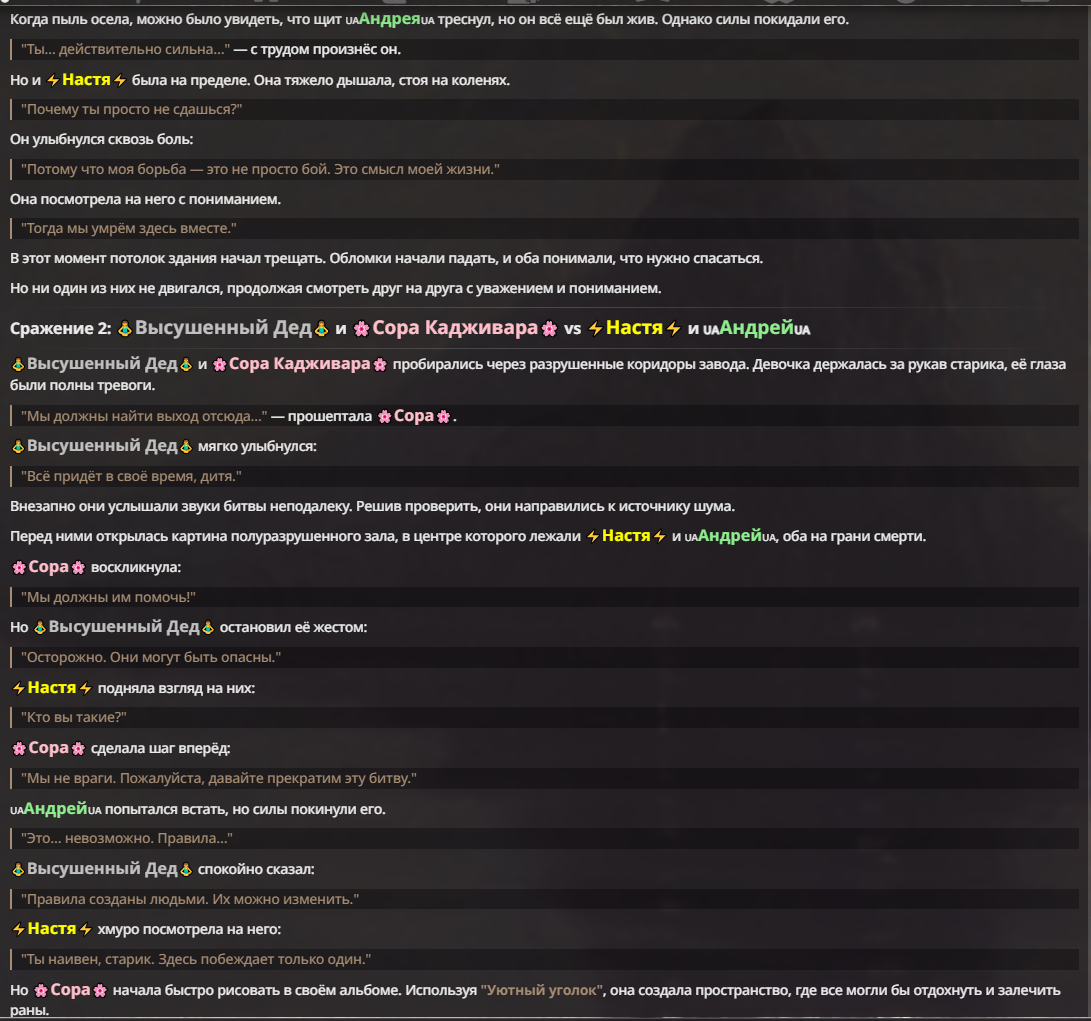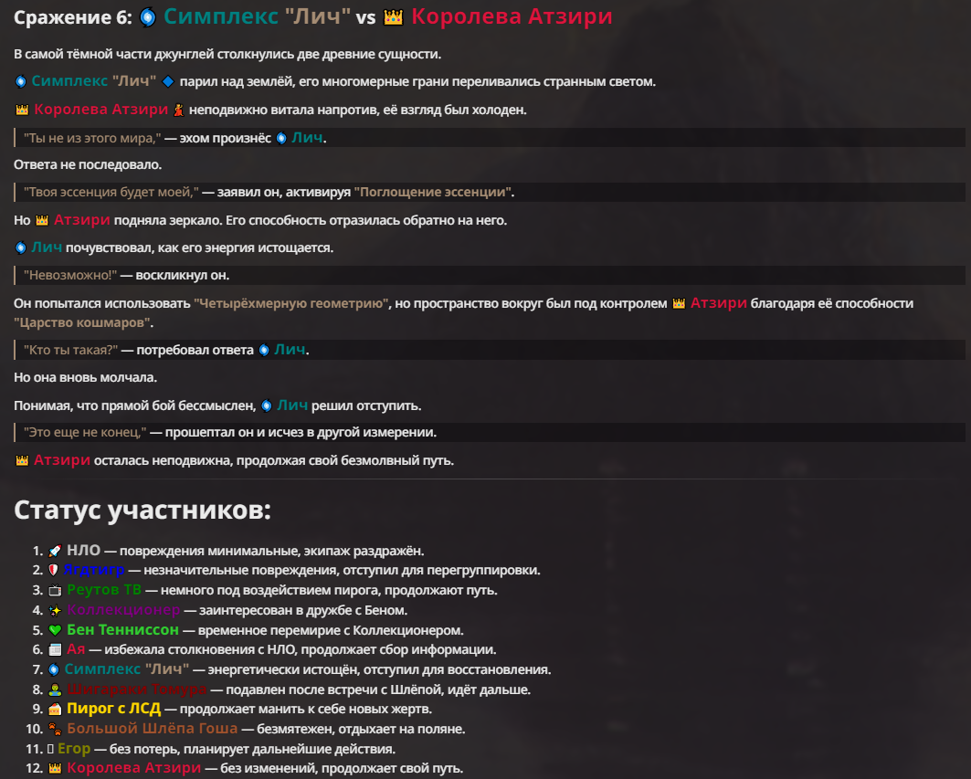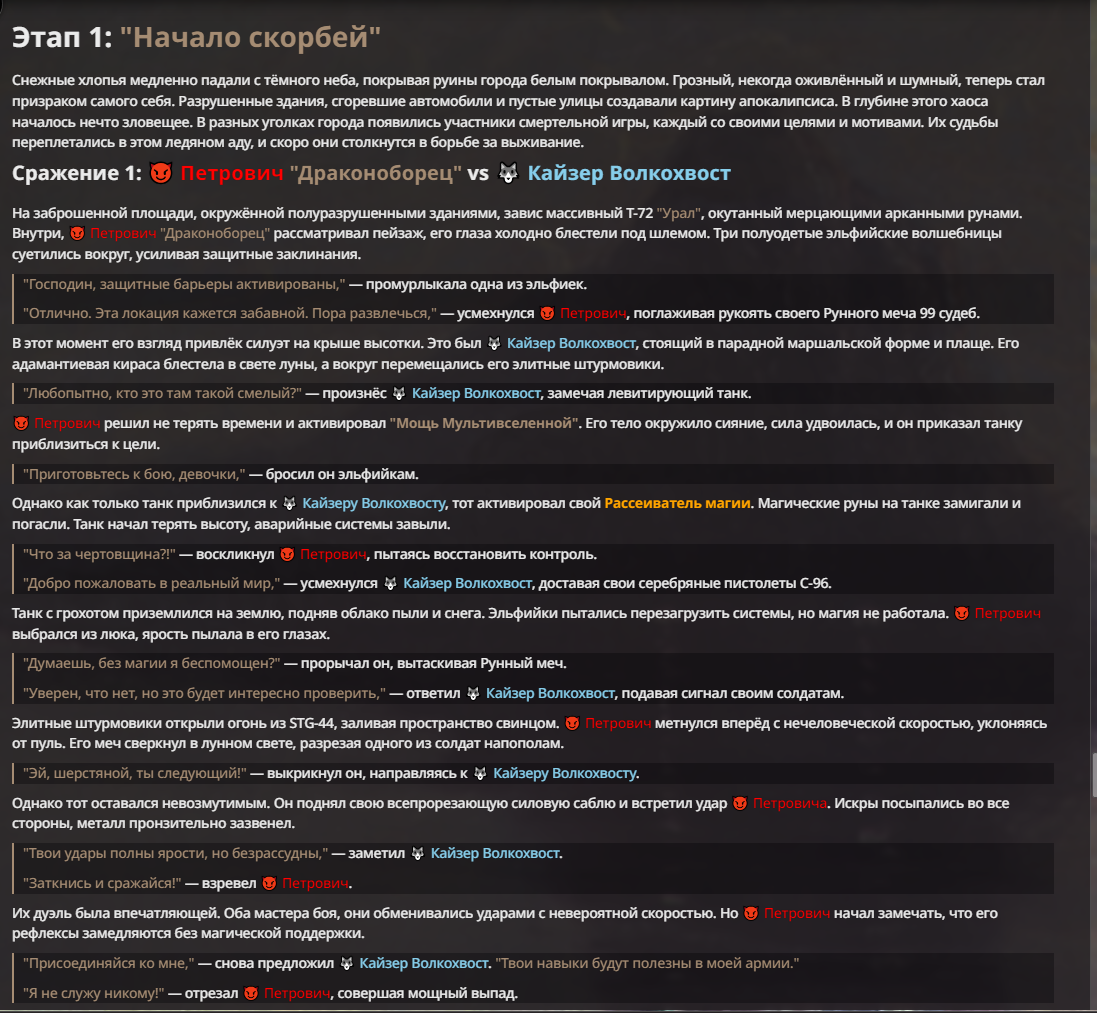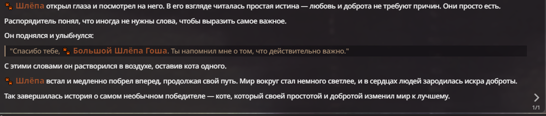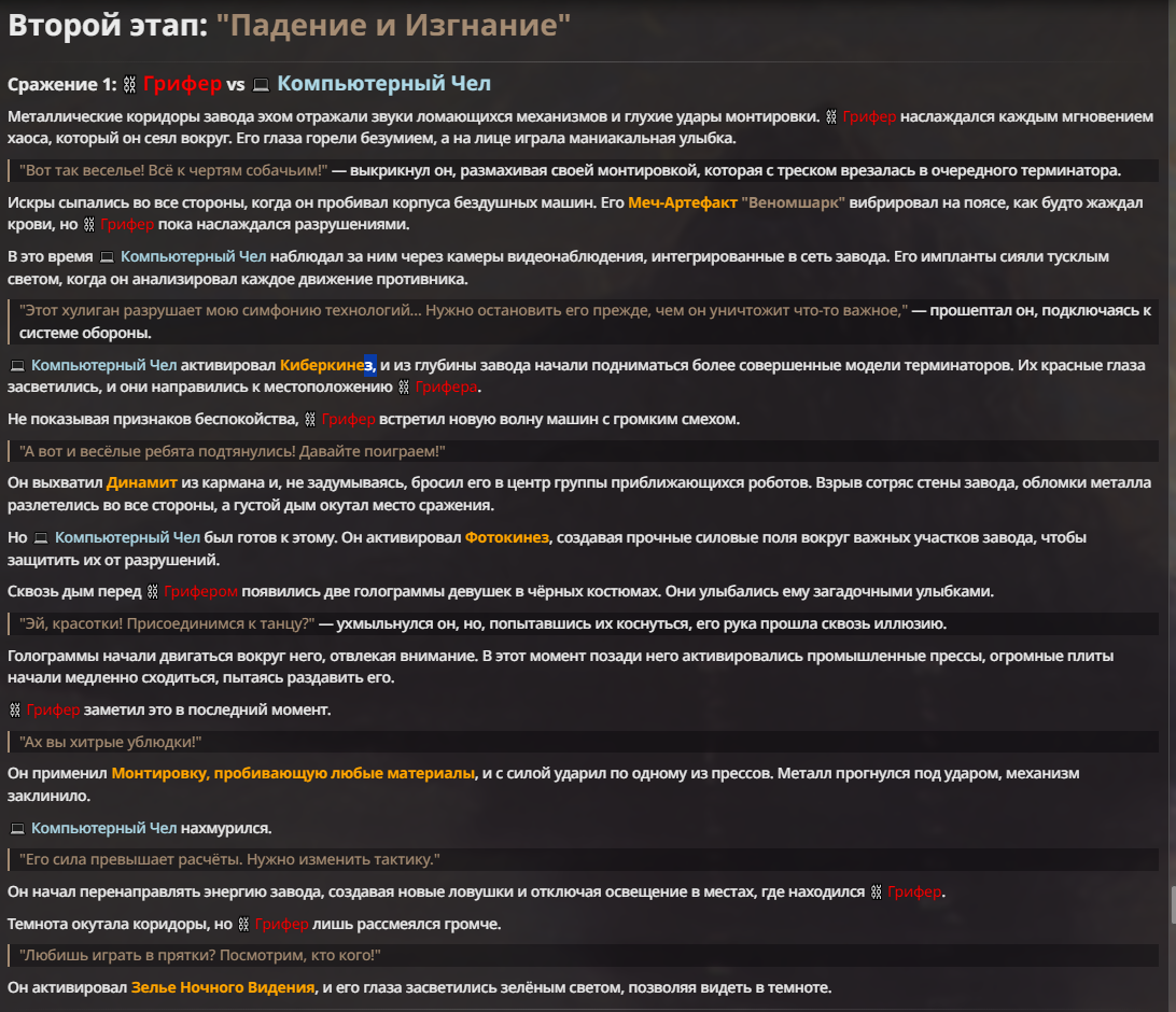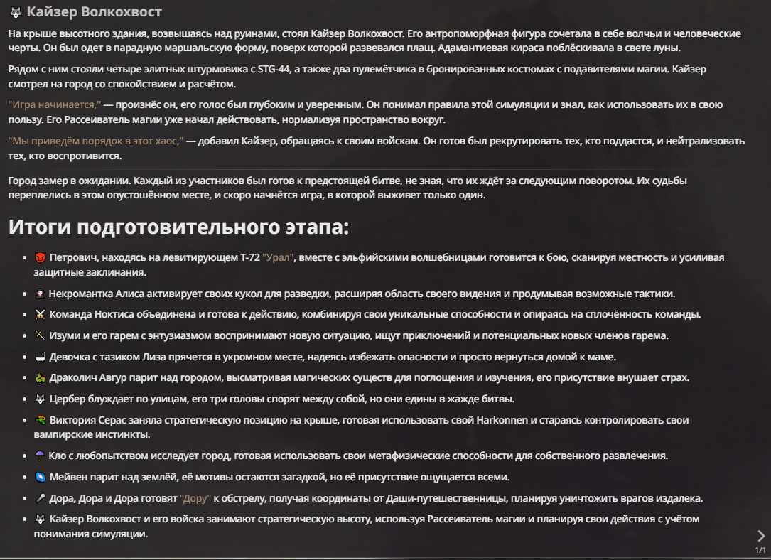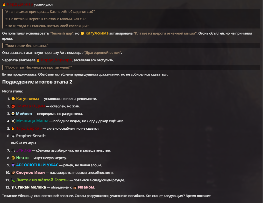 >>1560777 Чо там в правде или действие самое яркое произошло, по вашему мнению? Листок из жёлтой Газеты: Листок и любой случайный персонаж-игрок всегда появляются первыми. Листок не возможно уничтожить без выполнения особых условий. Листок не может являтся победителем во всей игре. Если на арене остаётся один персонаж и листочек, то листочек желает удачи победителю и сгорает самопроизвольно. Листок из жёлтой газеты это предмет, который в каждом новом раунде появляется в случайном месте на карте. Каждый кто его подбирает становится его носителем, если носитель не умирает в течении раунда листок телеопортируется из кармана персонажа и появляется в следующем раунде в случайном месте, и персонаж больше не является носителем. Если носитель листочка умирает листок исчезает из игры. Увидев листок любой персонаж захочет поднять его, потому что им становится интересно, что написали эти проклятые журналисты. (Персонажи не могут бороться с желанием поднять и прочитать листок без исключений). При поднятии персонаж читает заголовок и статью в стиле жёлтой прессы. Прочитать может и должен любой персонаж не завсимо от уровня интелекта и способности читать. Статья может читаться только один раз в начале каждого раунда, после чего носитель сворачивает листок и кладёт его в свой карман. Способности (заголовки на странице): "ШОКИРУЮЩАЯ ПРАВДА!"- раскрывает своему носителю любою информацию (слабости, увлечения, компрометирующие события, тайные желания) о любом только одном персонаже, даже возможно о самом носителе. "СЕГОДНЯ В СПОЙЛЕРАХ!"- Раскрывает своему носителю детали его следующей битвы и её результат. (ИИ Запоминает и генерит этому персонажу его следующему битву на основе прочитаного тут) "Кроссворды" - Носитель умиротворительно садится решать кроссворды и заёбывает каждого проходящего мимо подсказать что это за слово(задаёт вопрос намекающей на слово), если ответ не верный сидит и ждёт следующего персонажа пока ему не скажут правильный ответ. "Кринжовые анекдоты" - Носитель читает любой несмешной анекдот. "NEW+"- Носитель читает и запоминает о своей новой способности или слабости. "Смотрите какие люди в голивуде!"- Носитель читает новость о поялени на локации новых существ или людей . И они остаются на локации в качестве новых участников. "Новая Пара!"- Зачитывая эту строку Носитель объевляет двух персонажей, которые становятся союзниками на этот раунд. "СКАНДАЛЫ!ИНТРИГИ1РАСЛЕДОВАНИЯ!"- Носитель зачитывает статью компромитирующую одного любого случайного персонажа. (Описывает мерзкую, преступную, амаральную ситуацию в которой принимал участие один любой случайный персонаж). После этого все остальные персонажи хотят его скорейшим образом уничтожить, даже не попытавшись его выслушать.