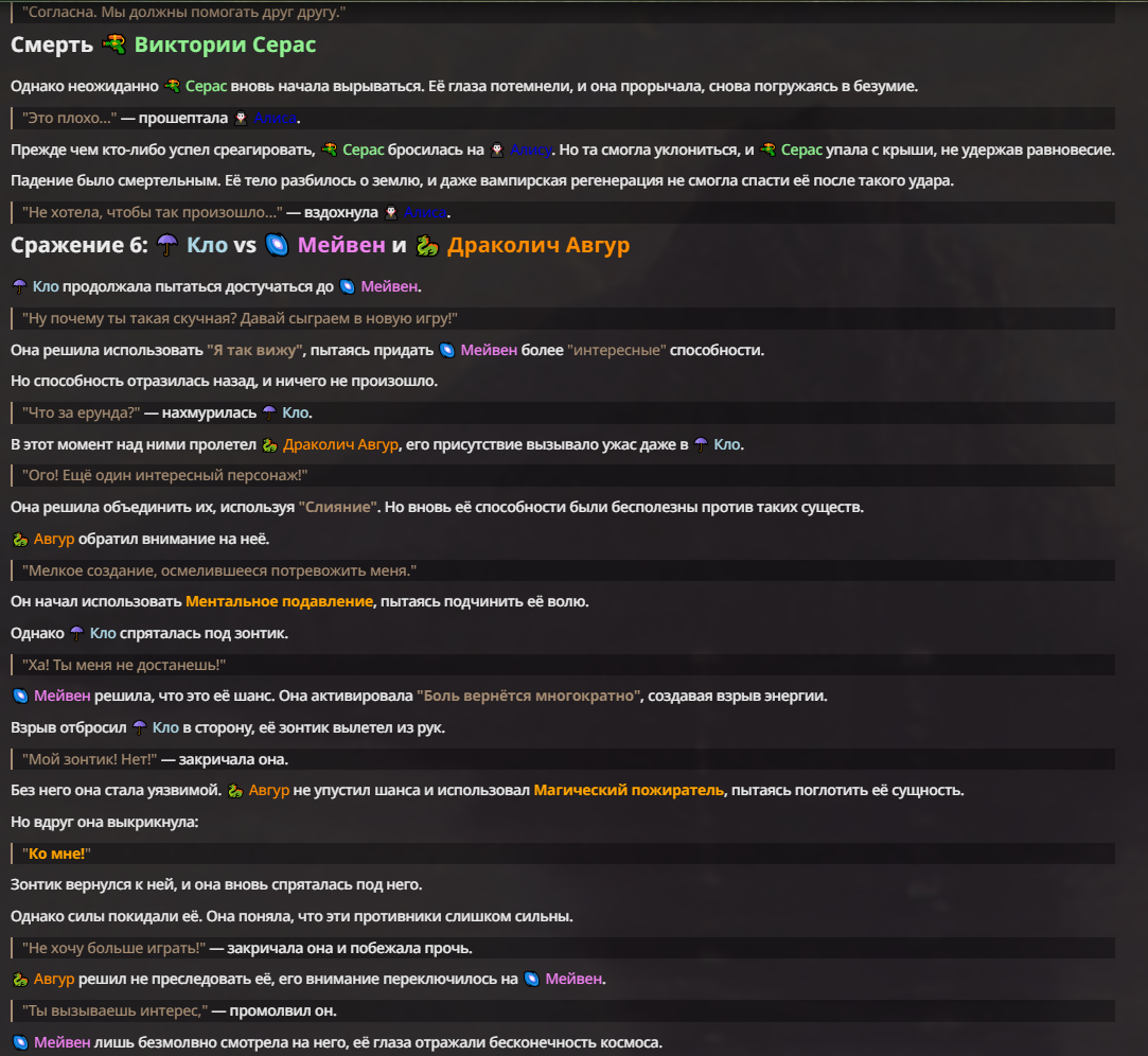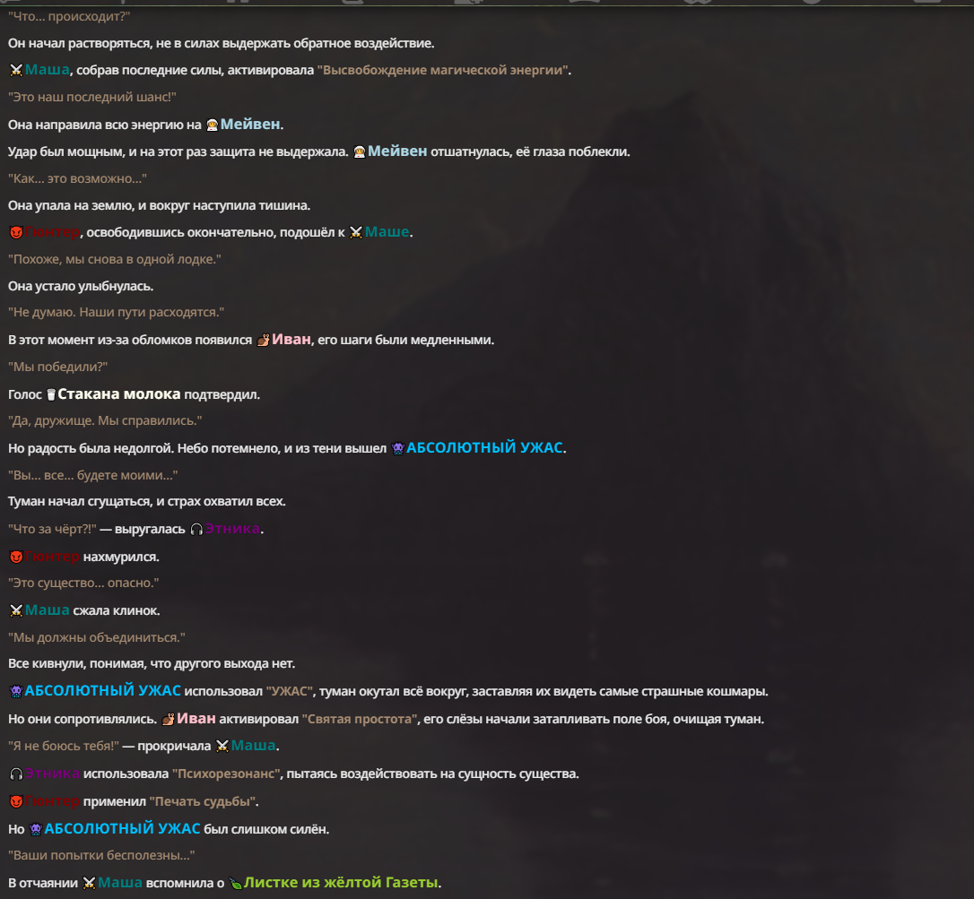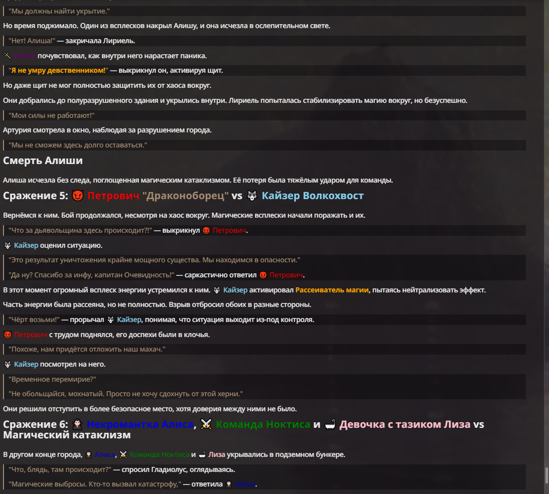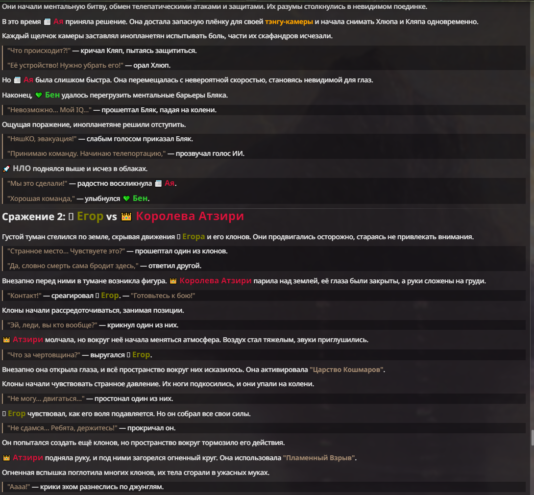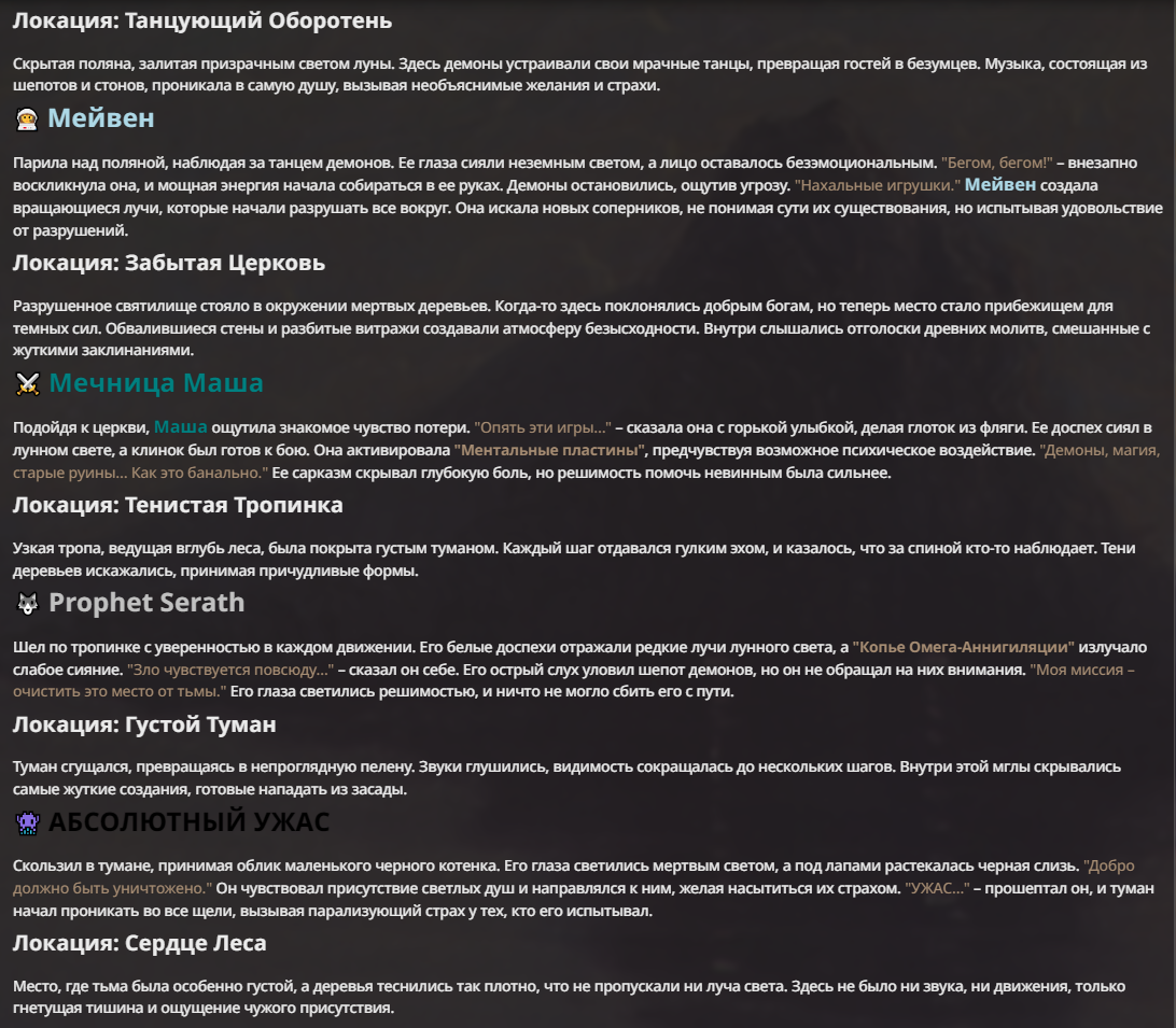 >>1560777 Чо там в правде или действие самое яркое произошло, по вашему мнению? Листок из жёлтой Газеты: Листок и любой случайный персонаж-игрок всегда появляются первыми. Листок не возможно уничтожить без выполнения особых условий. Листок не может являтся победителем во всей игре. Если на арене остаётся один персонаж и листочек, то листочек желает удачи победителю и сгорает самопроизвольно. Листок из жёлтой газеты это предмет, который в каждом новом раунде появляется в случайном месте на карте. Каждый кто его подбирает становится его носителем, если носитель не умирает в течении раунда листок телеопортируется из кармана персонажа и появляется в следующем раунде в случайном месте, и персонаж больше не является носителем. Если носитель листочка умирает листок исчезает из игры. Увидев листок любой персонаж захочет поднять его, потому что им становится интересно, что написали эти проклятые журналисты. (Персонажи не могут бороться с желанием поднять и прочитать листок без исключений). При поднятии персонаж читает заголовок и статью в стиле жёлтой прессы. Прочитать может и должен любой персонаж не завсимо от уровня интелекта и способности читать. Статья может читаться только один раз в начале каждого раунда, после чего носитель сворачивает листок и кладёт его в свой карман. Способности (заголовки на странице): "ШОКИРУЮЩАЯ ПРАВДА!"- раскрывает своему носителю любою информацию (слабости, увлечения, компрометирующие события, тайные желания) о любом только одном персонаже, даже возможно о самом носителе. "СЕГОДНЯ В СПОЙЛЕРАХ!"- Раскрывает своему носителю детали его следующей битвы и её результат. (ИИ Запоминает и генерит этому персонажу его следующему битву на основе прочитаного тут) "Кроссворды" - Носитель умиротворительно садится решать кроссворды и заёбывает каждого проходящего мимо подсказать что это за слово(задаёт вопрос намекающей на слово), если ответ не верный сидит и ждёт следующего персонажа пока ему не скажут правильный ответ. "Кринжовые анекдоты" - Носитель читает любой несмешной анекдот. "NEW+"- Носитель читает и запоминает о своей новой способности или слабости. "Смотрите какие люди в голивуде!"- Носитель читает новость о поялени на локации новых существ или людей . И они остаются на локации в качестве новых участников. "Новая Пара!"- Зачитывая эту строку Носитель объевляет двух персонажей, которые становятся союзниками на этот раунд. "СКАНДАЛЫ!ИНТРИГИ1РАСЛЕДОВАНИЯ!"- Носитель зачитывает статью компромитирующую одного любого случайного персонажа. (Описывает мерзкую, преступную, амаральную ситуацию в которой принимал участие один любой случайный персонаж). После этого все остальные персонажи хотят его скорейшим образом уничтожить, даже не попытавшись его выслушать.
