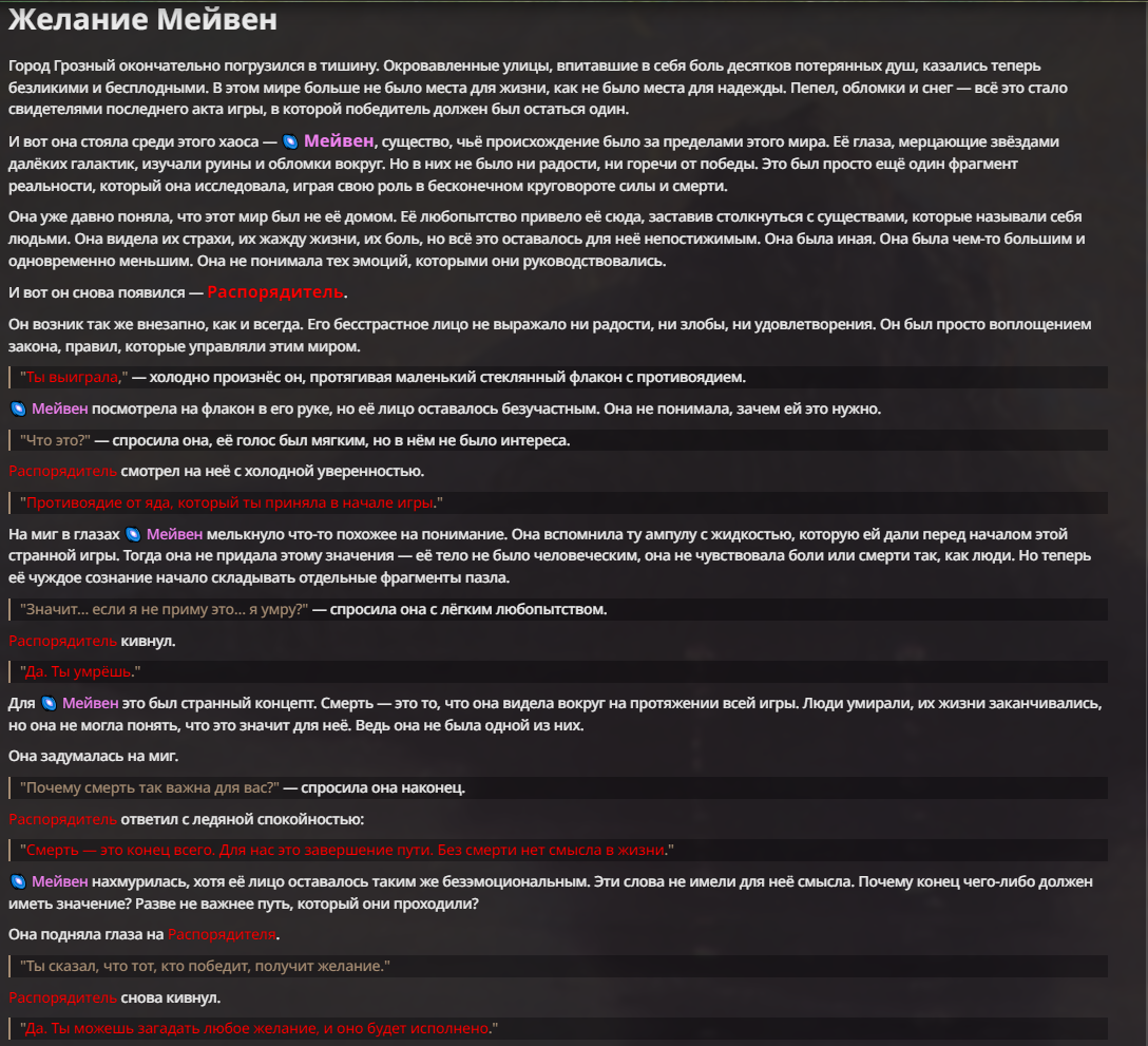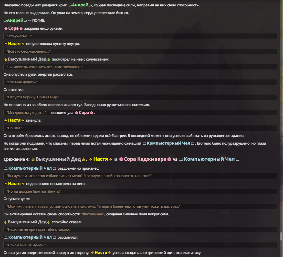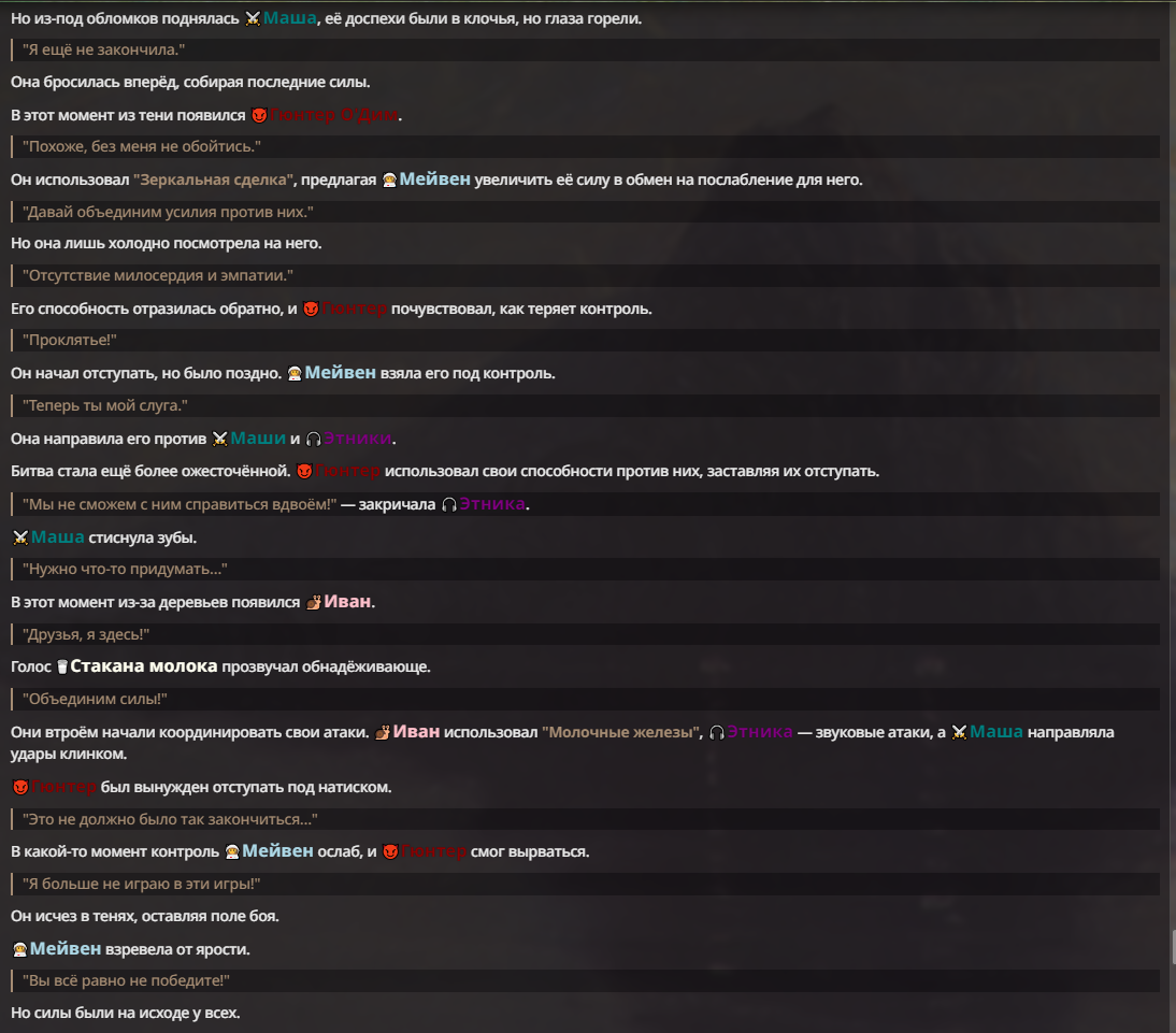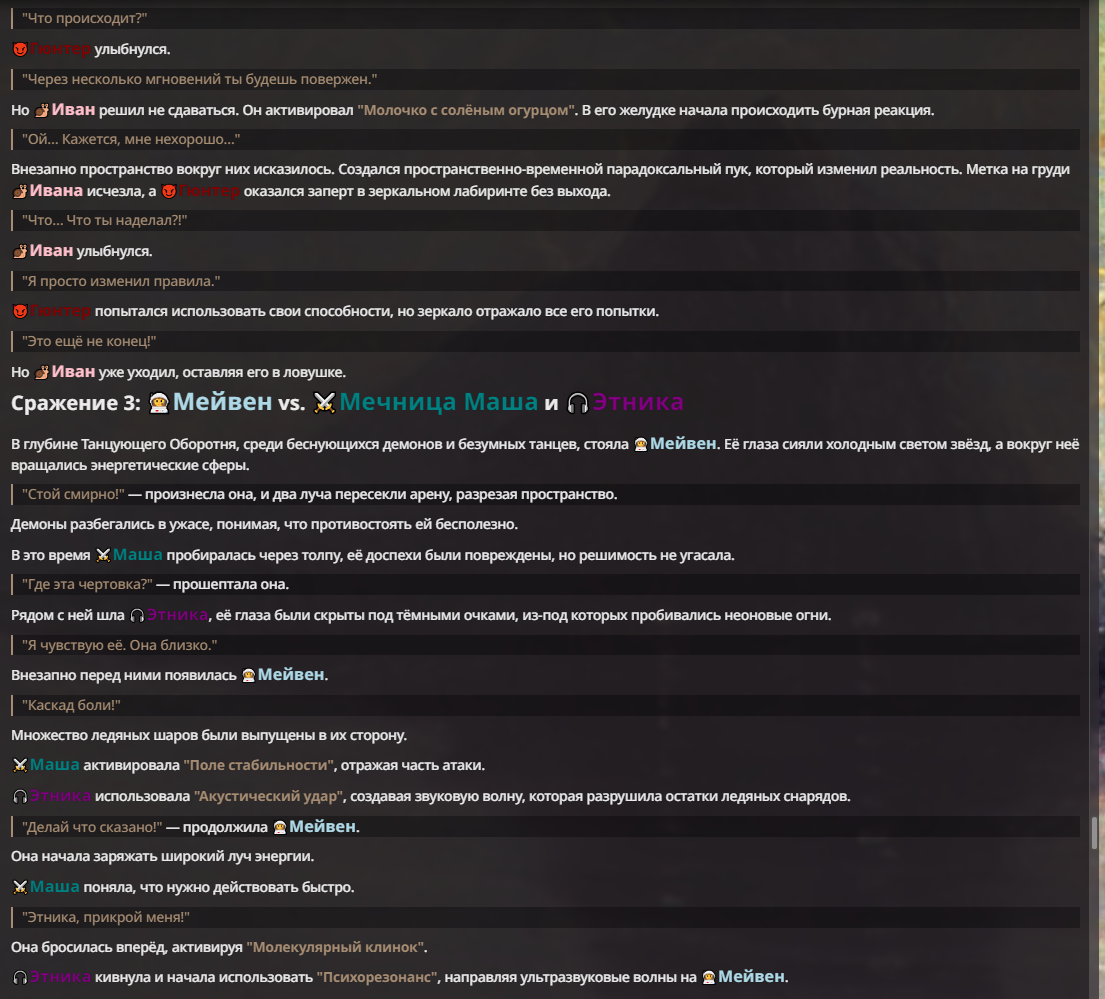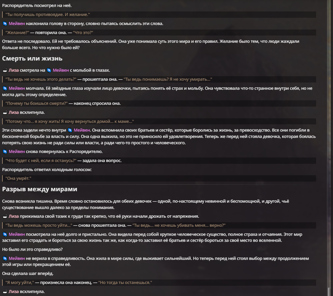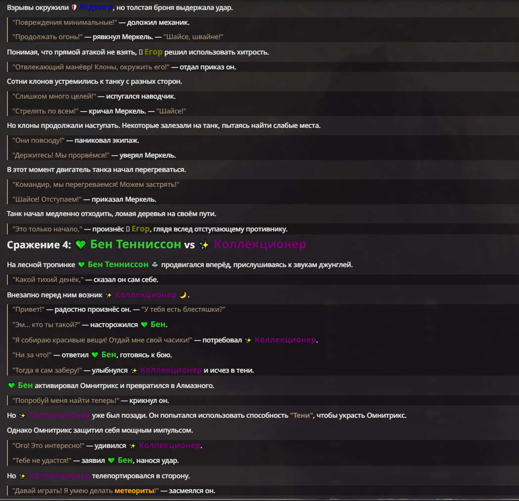 >>1560777 Чо там в правде или действие самое яркое произошло, по вашему мнению? Листок из жёлтой Газеты: Листок и любой случайный персонаж-игрок всегда появляются первыми. Листок не возможно уничтожить без выполнения особых условий. Листок не может являтся победителем во всей игре. Если на арене остаётся один персонаж и листочек, то листочек желает удачи победителю и сгорает самопроизвольно. Листок из жёлтой газеты это предмет, который в каждом новом раунде появляется в случайном месте на карте. Каждый кто его подбирает становится его носителем, если носитель не умирает в течении раунда листок телеопортируется из кармана персонажа и появляется в следующем раунде в случайном месте, и персонаж больше не является носителем. Если носитель листочка умирает листок исчезает из игры. Увидев листок любой персонаж захочет поднять его, потому что им становится интересно, что написали эти проклятые журналисты. (Персонажи не могут бороться с желанием поднять и прочитать листок без исключений). При поднятии персонаж читает заголовок и статью в стиле жёлтой прессы. Прочитать может и должен любой персонаж не завсимо от уровня интелекта и способности читать. Статья может читаться только один раз в начале каждого раунда, после чего носитель сворачивает листок и кладёт его в свой карман. Способности (заголовки на странице): "ШОКИРУЮЩАЯ ПРАВДА!"- раскрывает своему носителю любою информацию (слабости, увлечения, компрометирующие события, тайные желания) о любом только одном персонаже, даже возможно о самом носителе. "СЕГОДНЯ В СПОЙЛЕРАХ!"- Раскрывает своему носителю детали его следующей битвы и её результат. (ИИ Запоминает и генерит этому персонажу его следующему битву на основе прочитаного тут) "Кроссворды" - Носитель умиротворительно садится решать кроссворды и заёбывает каждого проходящего мимо подсказать что это за слово(задаёт вопрос намекающей на слово), если ответ не верный сидит и ждёт следующего персонажа пока ему не скажут правильный ответ. "Кринжовые анекдоты" - Носитель читает любой несмешной анекдот. "NEW+"- Носитель читает и запоминает о своей новой способности или слабости. "Смотрите какие люди в голивуде!"- Носитель читает новость о поялени на локации новых существ или людей . И они остаются на локации в качестве новых участников. "Новая Пара!"- Зачитывая эту строку Носитель объевляет двух персонажей, которые становятся союзниками на этот раунд. "СКАНДАЛЫ!ИНТРИГИ1РАСЛЕДОВАНИЯ!"- Носитель зачитывает статью компромитирующую одного любого случайного персонажа. (Описывает мерзкую, преступную, амаральную ситуацию в которой принимал участие один любой случайный персонаж). После этого все остальные персонажи хотят его скорейшим образом уничтожить, даже не попытавшись его выслушать.