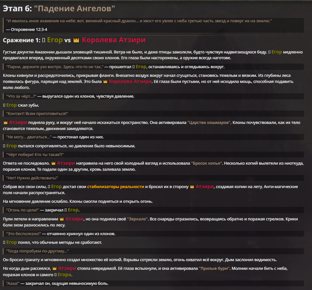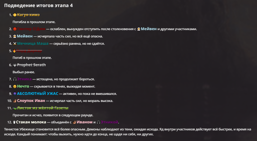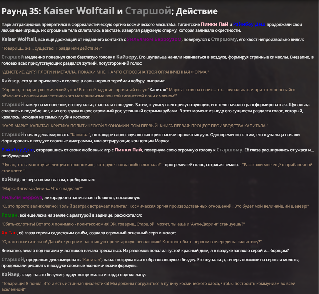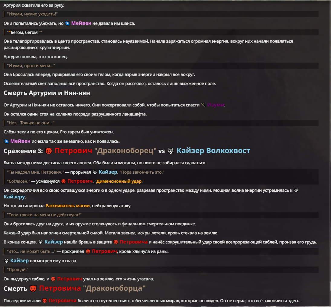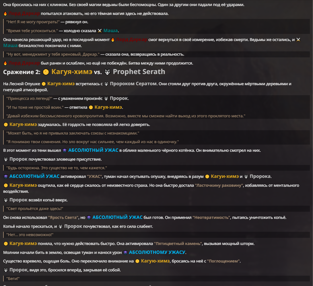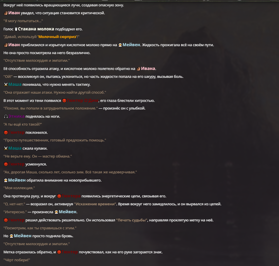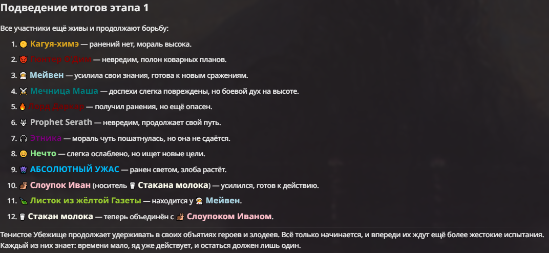 >>1560777 Чо там в правде или действие самое яркое произошло, по вашему мнению? Листок из жёлтой Газеты: Листок и любой случайный персонаж-игрок всегда появляются первыми. Листок не возможно уничтожить без выполнения особых условий. Листок не может являтся победителем во всей игре. Если на арене остаётся один персонаж и листочек, то листочек желает удачи победителю и сгорает самопроизвольно. Листок из жёлтой газеты это предмет, который в каждом новом раунде появляется в случайном месте на карте. Каждый кто его подбирает становится его носителем, если носитель не умирает в течении раунда листок телеопортируется из кармана персонажа и появляется в следующем раунде в случайном месте, и персонаж больше не является носителем. Если носитель листочка умирает листок исчезает из игры. Увидев листок любой персонаж захочет поднять его, потому что им становится интересно, что написали эти проклятые журналисты. (Персонажи не могут бороться с желанием поднять и прочитать листок без исключений). При поднятии персонаж читает заголовок и статью в стиле жёлтой прессы. Прочитать может и должен любой персонаж не завсимо от уровня интелекта и способности читать. Статья может читаться только один раз в начале каждого раунда, после чего носитель сворачивает листок и кладёт его в свой карман. Способности (заголовки на странице): "ШОКИРУЮЩАЯ ПРАВДА!"- раскрывает своему носителю любою информацию (слабости, увлечения, компрометирующие события, тайные желания) о любом только одном персонаже, даже возможно о самом носителе. "СЕГОДНЯ В СПОЙЛЕРАХ!"- Раскрывает своему носителю детали его следующей битвы и её результат. (ИИ Запоминает и генерит этому персонажу его следующему битву на основе прочитаного тут) "Кроссворды" - Носитель умиротворительно садится решать кроссворды и заёбывает каждого проходящего мимо подсказать что это за слово(задаёт вопрос намекающей на слово), если ответ не верный сидит и ждёт следующего персонажа пока ему не скажут правильный ответ. "Кринжовые анекдоты" - Носитель читает любой несмешной анекдот. "NEW+"- Носитель читает и запоминает о своей новой способности или слабости. "Смотрите какие люди в голивуде!"- Носитель читает новость о поялени на локации новых существ или людей . И они остаются на локации в качестве новых участников. "Новая Пара!"- Зачитывая эту строку Носитель объевляет двух персонажей, которые становятся союзниками на этот раунд. "СКАНДАЛЫ!ИНТРИГИ1РАСЛЕДОВАНИЯ!"- Носитель зачитывает статью компромитирующую одного любого случайного персонажа. (Описывает мерзкую, преступную, амаральную ситуацию в которой принимал участие один любой случайный персонаж). После этого все остальные персонажи хотят его скорейшим образом уничтожить, даже не попытавшись его выслушать.