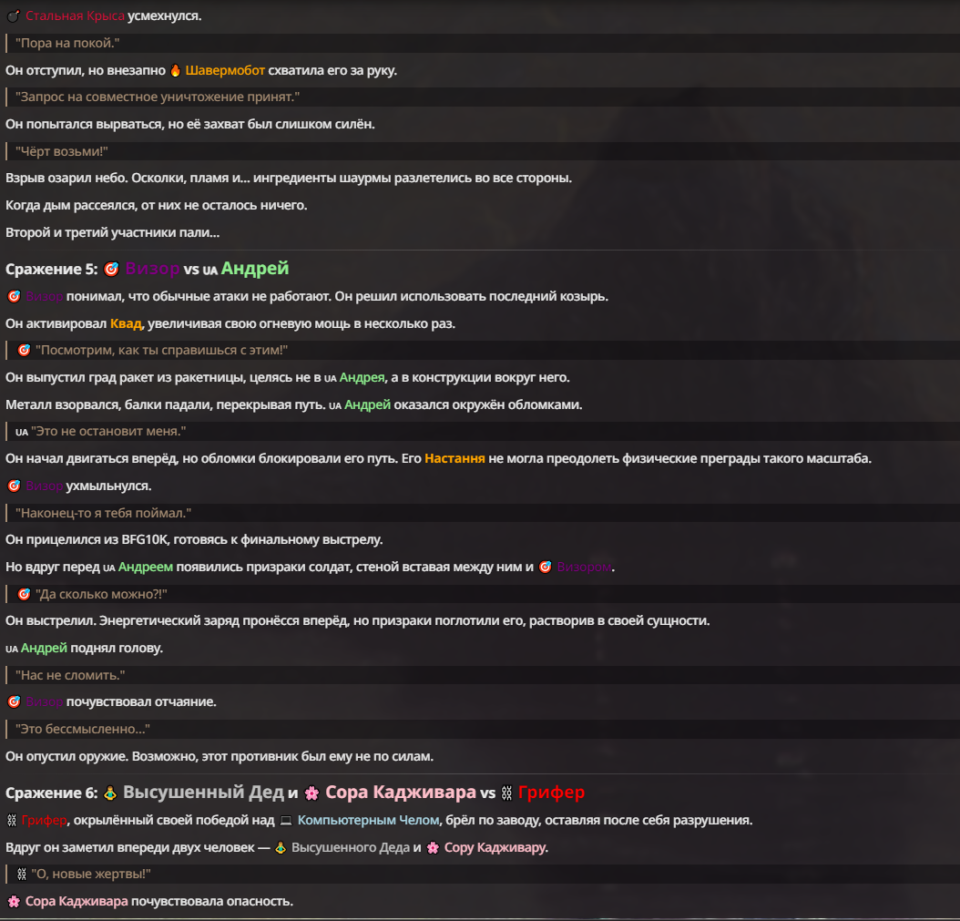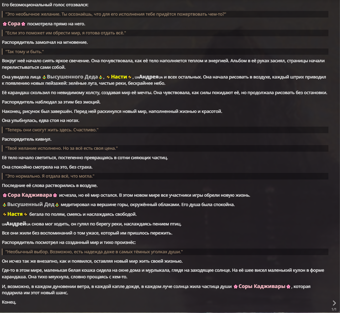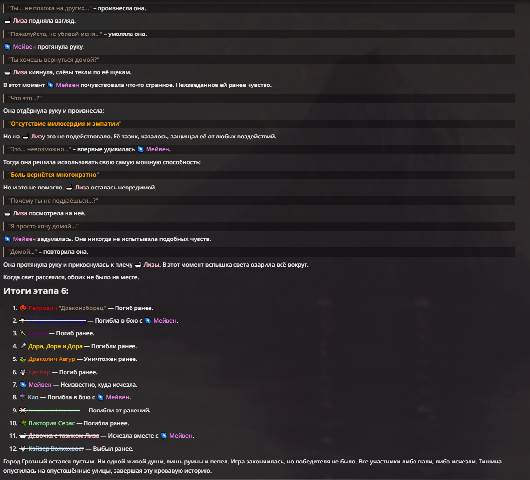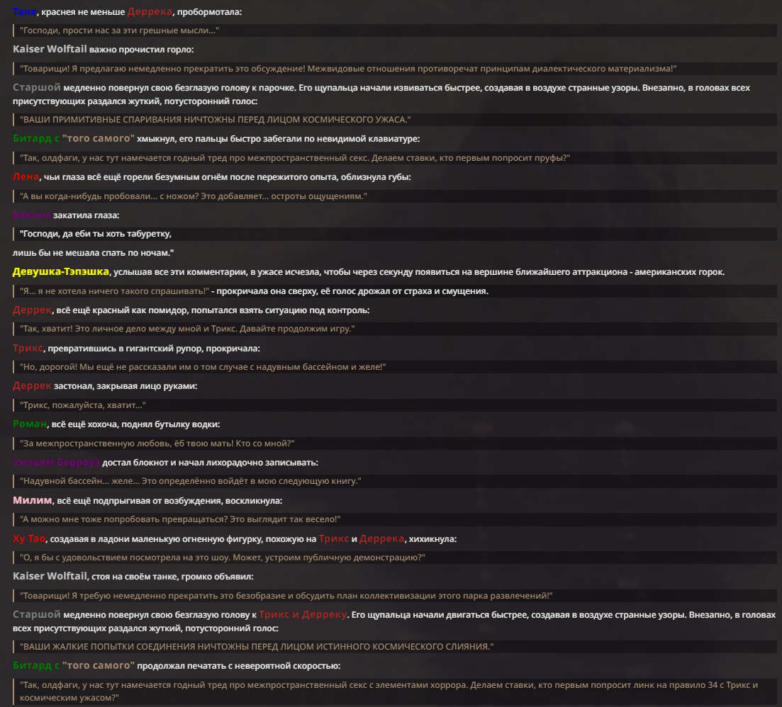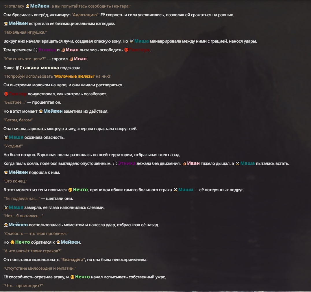 >>1560777 Чо там в правде или действие самое яркое произошло, по вашему мнению? Листок из жёлтой Газеты: Листок и любой случайный персонаж-игрок всегда появляются первыми. Листок не возможно уничтожить без выполнения особых условий. Листок не может являтся победителем во всей игре. Если на арене остаётся один персонаж и листочек, то листочек желает удачи победителю и сгорает самопроизвольно. Листок из жёлтой газеты это предмет, который в каждом новом раунде появляется в случайном месте на карте. Каждый кто его подбирает становится его носителем, если носитель не умирает в течении раунда листок телеопортируется из кармана персонажа и появляется в следующем раунде в случайном месте, и персонаж больше не является носителем. Если носитель листочка умирает листок исчезает из игры. Увидев листок любой персонаж захочет поднять его, потому что им становится интересно, что написали эти проклятые журналисты. (Персонажи не могут бороться с желанием поднять и прочитать листок без исключений). При поднятии персонаж читает заголовок и статью в стиле жёлтой прессы. Прочитать может и должен любой персонаж не завсимо от уровня интелекта и способности читать. Статья может читаться только один раз в начале каждого раунда, после чего носитель сворачивает листок и кладёт его в свой карман. Способности (заголовки на странице): "ШОКИРУЮЩАЯ ПРАВДА!"- раскрывает своему носителю любою информацию (слабости, увлечения, компрометирующие события, тайные желания) о любом только одном персонаже, даже возможно о самом носителе. "СЕГОДНЯ В СПОЙЛЕРАХ!"- Раскрывает своему носителю детали его следующей битвы и её результат. (ИИ Запоминает и генерит этому персонажу его следующему битву на основе прочитаного тут) "Кроссворды" - Носитель умиротворительно садится решать кроссворды и заёбывает каждого проходящего мимо подсказать что это за слово(задаёт вопрос намекающей на слово), если ответ не верный сидит и ждёт следующего персонажа пока ему не скажут правильный ответ. "Кринжовые анекдоты" - Носитель читает любой несмешной анекдот. "NEW+"- Носитель читает и запоминает о своей новой способности или слабости. "Смотрите какие люди в голивуде!"- Носитель читает новость о поялени на локации новых существ или людей . И они остаются на локации в качестве новых участников. "Новая Пара!"- Зачитывая эту строку Носитель объевляет двух персонажей, которые становятся союзниками на этот раунд. "СКАНДАЛЫ!ИНТРИГИ1РАСЛЕДОВАНИЯ!"- Носитель зачитывает статью компромитирующую одного любого случайного персонажа. (Описывает мерзкую, преступную, амаральную ситуацию в которой принимал участие один любой случайный персонаж). После этого все остальные персонажи хотят его скорейшим образом уничтожить, даже не попытавшись его выслушать.