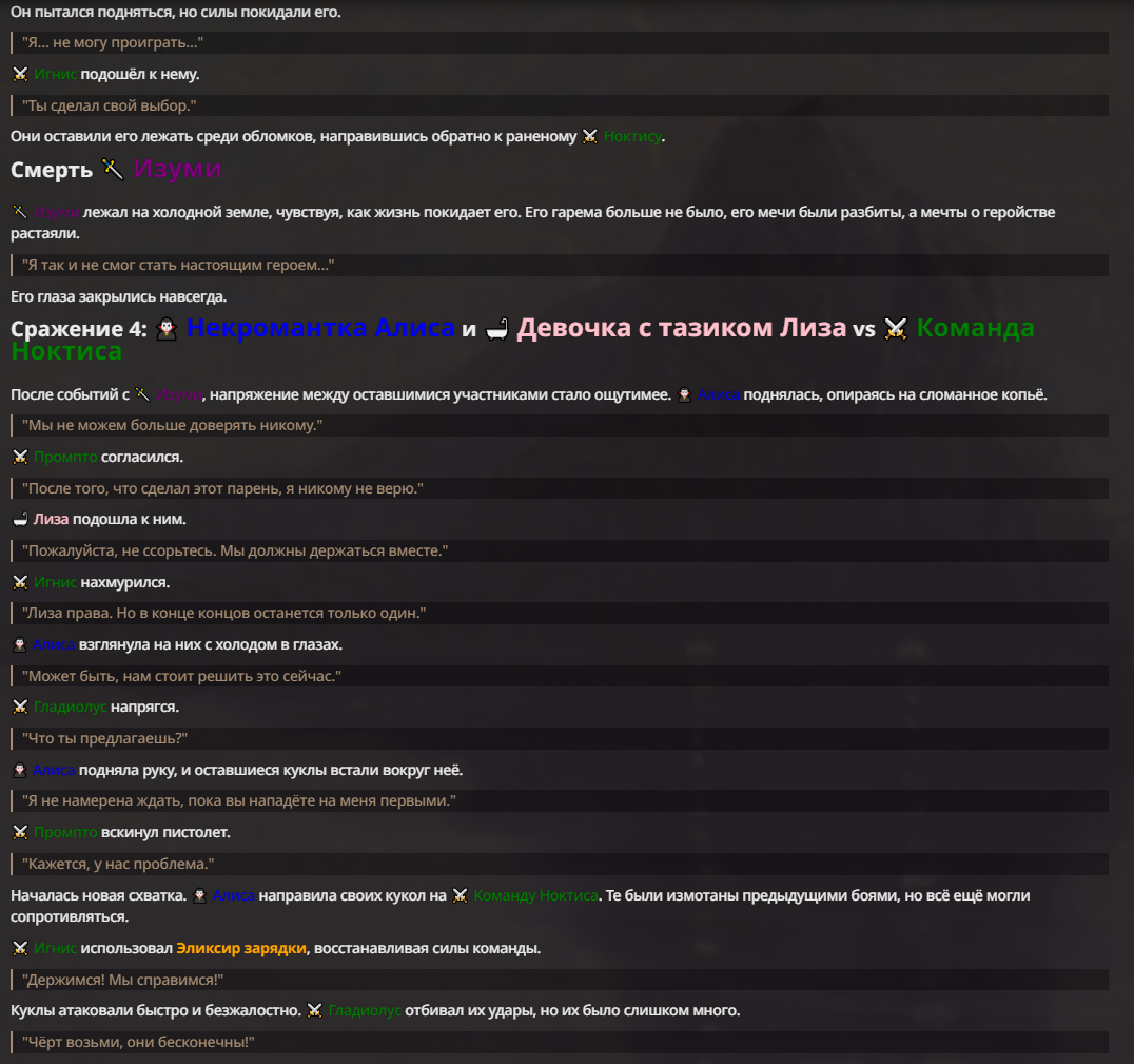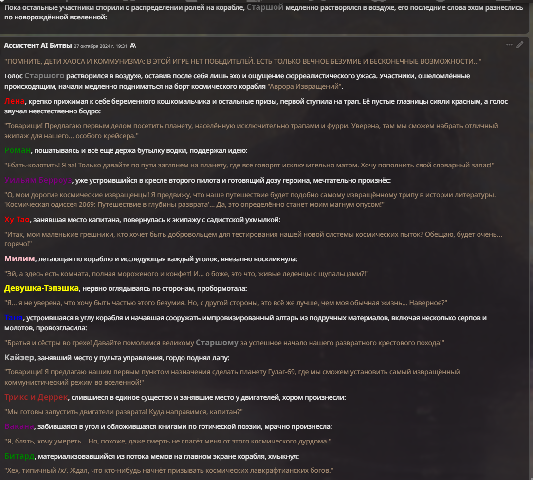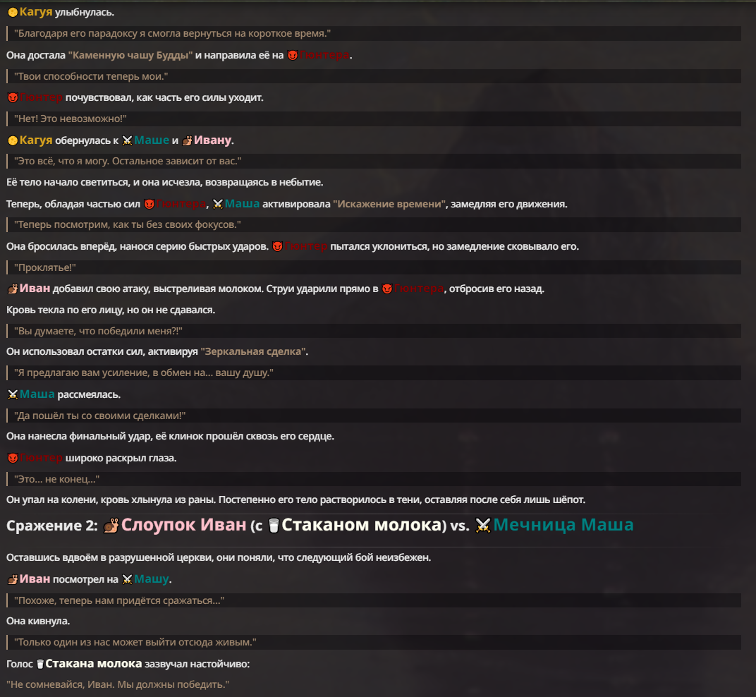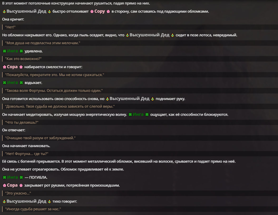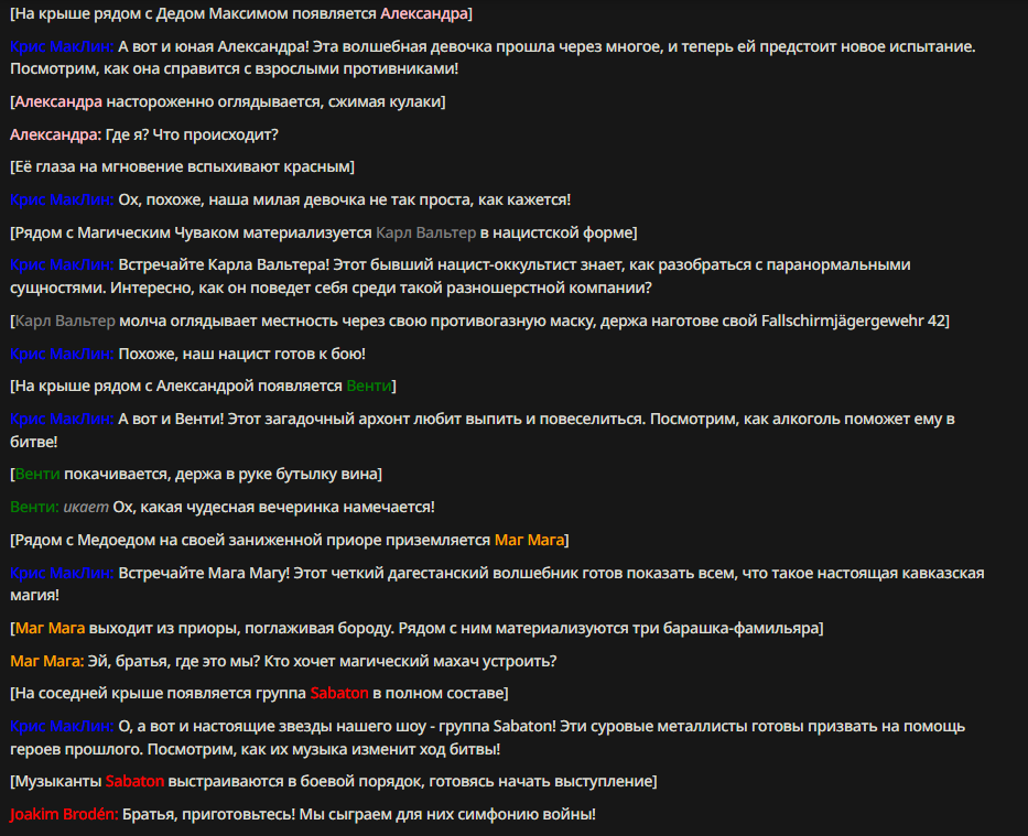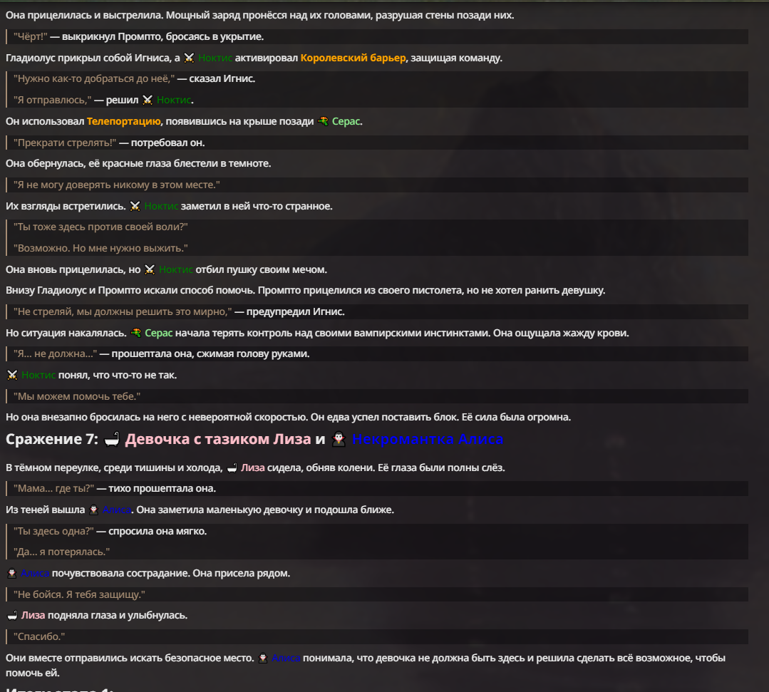 >>1560777 Чо там в правде или действие самое яркое произошло, по вашему мнению? Листок из жёлтой Газеты: Листок и любой случайный персонаж-игрок всегда появляются первыми. Листок не возможно уничтожить без выполнения особых условий. Листок не может являтся победителем во всей игре. Если на арене остаётся один персонаж и листочек, то листочек желает удачи победителю и сгорает самопроизвольно. Листок из жёлтой газеты это предмет, который в каждом новом раунде появляется в случайном месте на карте. Каждый кто его подбирает становится его носителем, если носитель не умирает в течении раунда листок телеопортируется из кармана персонажа и появляется в следующем раунде в случайном месте, и персонаж больше не является носителем. Если носитель листочка умирает листок исчезает из игры. Увидев листок любой персонаж захочет поднять его, потому что им становится интересно, что написали эти проклятые журналисты. (Персонажи не могут бороться с желанием поднять и прочитать листок без исключений). При поднятии персонаж читает заголовок и статью в стиле жёлтой прессы. Прочитать может и должен любой персонаж не завсимо от уровня интелекта и способности читать. Статья может читаться только один раз в начале каждого раунда, после чего носитель сворачивает листок и кладёт его в свой карман. Способности (заголовки на странице): "ШОКИРУЮЩАЯ ПРАВДА!"- раскрывает своему носителю любою информацию (слабости, увлечения, компрометирующие события, тайные желания) о любом только одном персонаже, даже возможно о самом носителе. "СЕГОДНЯ В СПОЙЛЕРАХ!"- Раскрывает своему носителю детали его следующей битвы и её результат. (ИИ Запоминает и генерит этому персонажу его следующему битву на основе прочитаного тут) "Кроссворды" - Носитель умиротворительно садится решать кроссворды и заёбывает каждого проходящего мимо подсказать что это за слово(задаёт вопрос намекающей на слово), если ответ не верный сидит и ждёт следующего персонажа пока ему не скажут правильный ответ. "Кринжовые анекдоты" - Носитель читает любой несмешной анекдот. "NEW+"- Носитель читает и запоминает о своей новой способности или слабости. "Смотрите какие люди в голивуде!"- Носитель читает новость о поялени на локации новых существ или людей . И они остаются на локации в качестве новых участников. "Новая Пара!"- Зачитывая эту строку Носитель объевляет двух персонажей, которые становятся союзниками на этот раунд. "СКАНДАЛЫ!ИНТРИГИ1РАСЛЕДОВАНИЯ!"- Носитель зачитывает статью компромитирующую одного любого случайного персонажа. (Описывает мерзкую, преступную, амаральную ситуацию в которой принимал участие один любой случайный персонаж). После этого все остальные персонажи хотят его скорейшим образом уничтожить, даже не попытавшись его выслушать.