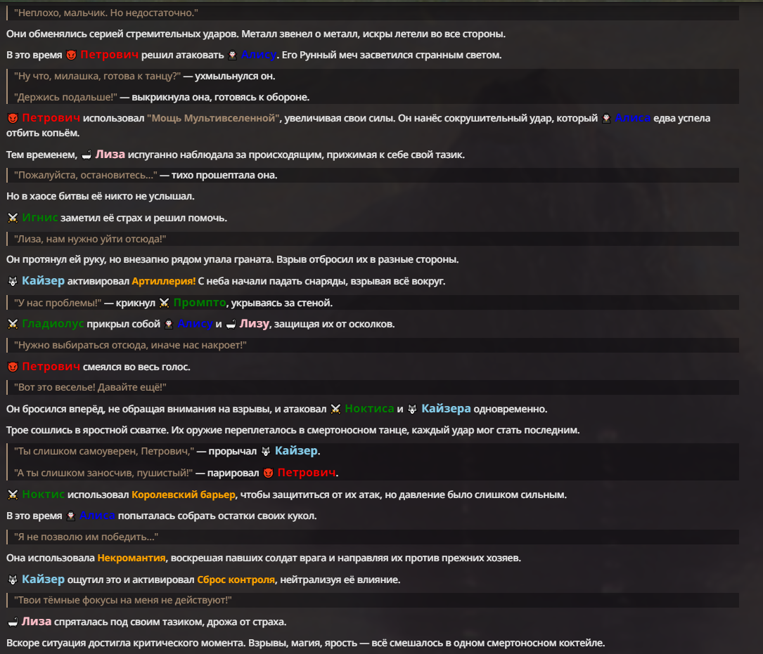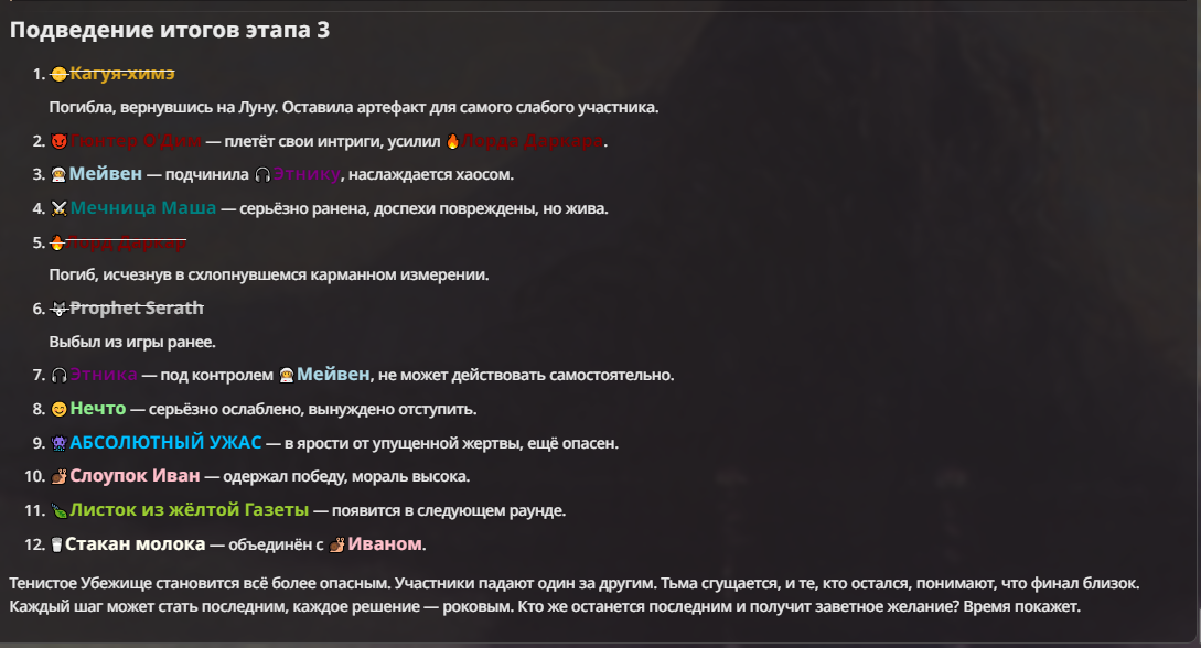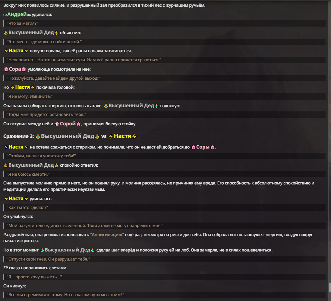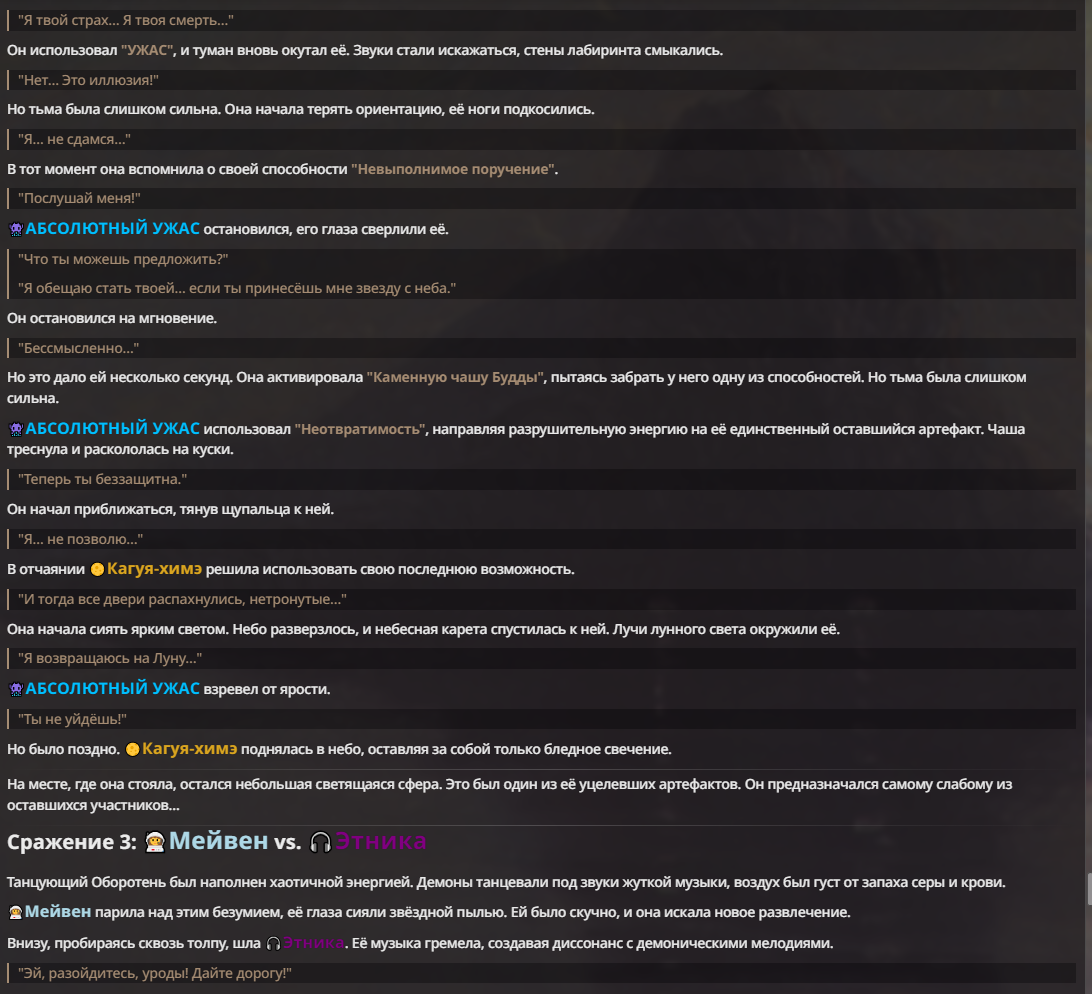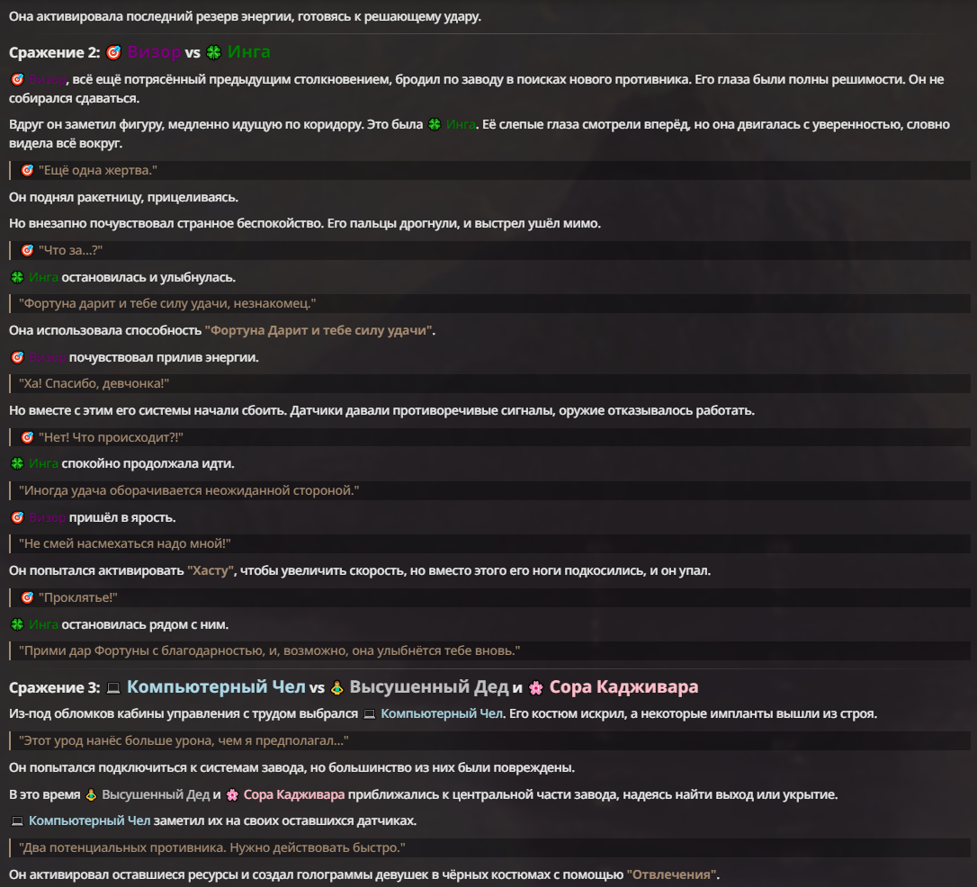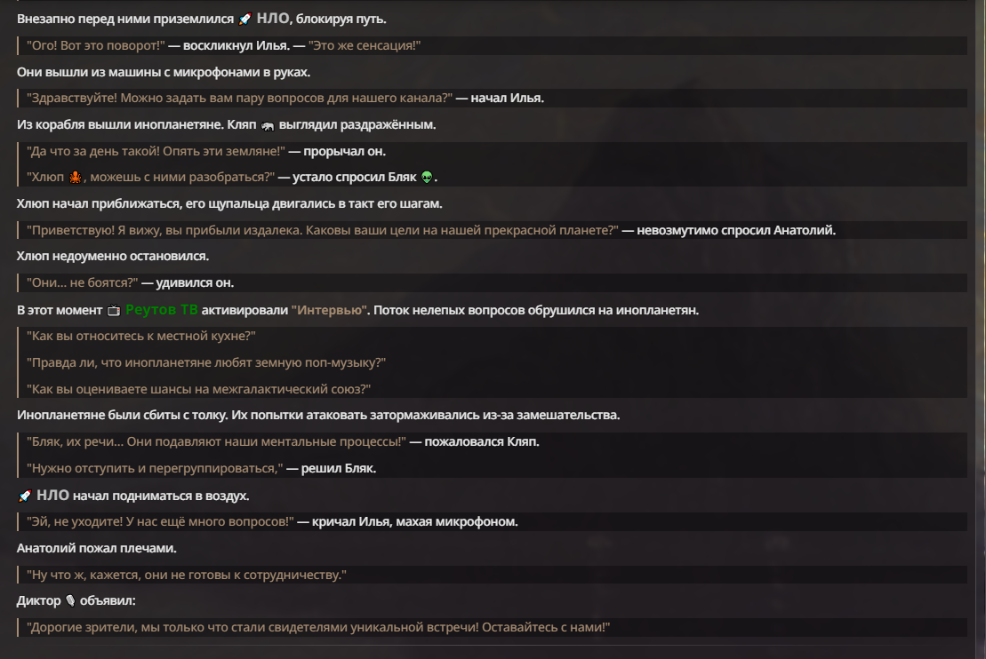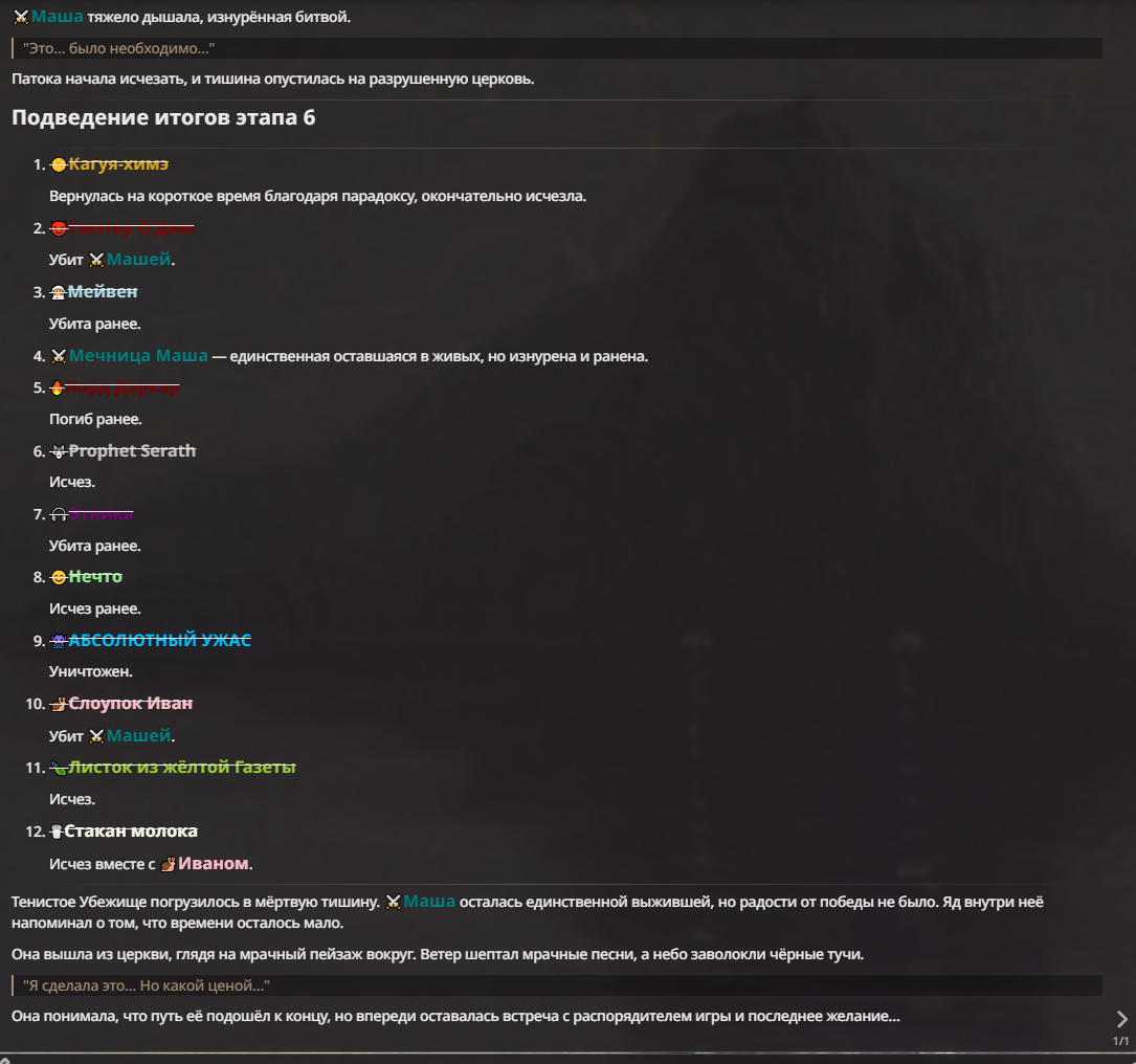 >>1560777 Чо там в правде или действие самое яркое произошло, по вашему мнению? Листок из жёлтой Газеты: Листок и любой случайный персонаж-игрок всегда появляются первыми. Листок не возможно уничтожить без выполнения особых условий. Листок не может являтся победителем во всей игре. Если на арене остаётся один персонаж и листочек, то листочек желает удачи победителю и сгорает самопроизвольно. Листок из жёлтой газеты это предмет, который в каждом новом раунде появляется в случайном месте на карте. Каждый кто его подбирает становится его носителем, если носитель не умирает в течении раунда листок телеопортируется из кармана персонажа и появляется в следующем раунде в случайном месте, и персонаж больше не является носителем. Если носитель листочка умирает листок исчезает из игры. Увидев листок любой персонаж захочет поднять его, потому что им становится интересно, что написали эти проклятые журналисты. (Персонажи не могут бороться с желанием поднять и прочитать листок без исключений). При поднятии персонаж читает заголовок и статью в стиле жёлтой прессы. Прочитать может и должен любой персонаж не завсимо от уровня интелекта и способности читать. Статья может читаться только один раз в начале каждого раунда, после чего носитель сворачивает листок и кладёт его в свой карман. Способности (заголовки на странице): "ШОКИРУЮЩАЯ ПРАВДА!"- раскрывает своему носителю любою информацию (слабости, увлечения, компрометирующие события, тайные желания) о любом только одном персонаже, даже возможно о самом носителе. "СЕГОДНЯ В СПОЙЛЕРАХ!"- Раскрывает своему носителю детали его следующей битвы и её результат. (ИИ Запоминает и генерит этому персонажу его следующему битву на основе прочитаного тут) "Кроссворды" - Носитель умиротворительно садится решать кроссворды и заёбывает каждого проходящего мимо подсказать что это за слово(задаёт вопрос намекающей на слово), если ответ не верный сидит и ждёт следующего персонажа пока ему не скажут правильный ответ. "Кринжовые анекдоты" - Носитель читает любой несмешной анекдот. "NEW+"- Носитель читает и запоминает о своей новой способности или слабости. "Смотрите какие люди в голивуде!"- Носитель читает новость о поялени на локации новых существ или людей . И они остаются на локации в качестве новых участников. "Новая Пара!"- Зачитывая эту строку Носитель объевляет двух персонажей, которые становятся союзниками на этот раунд. "СКАНДАЛЫ!ИНТРИГИ1РАСЛЕДОВАНИЯ!"- Носитель зачитывает статью компромитирующую одного любого случайного персонажа. (Описывает мерзкую, преступную, амаральную ситуацию в которой принимал участие один любой случайный персонаж). После этого все остальные персонажи хотят его скорейшим образом уничтожить, даже не попытавшись его выслушать.