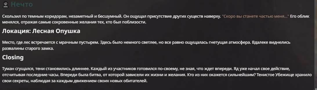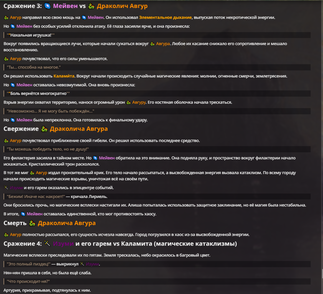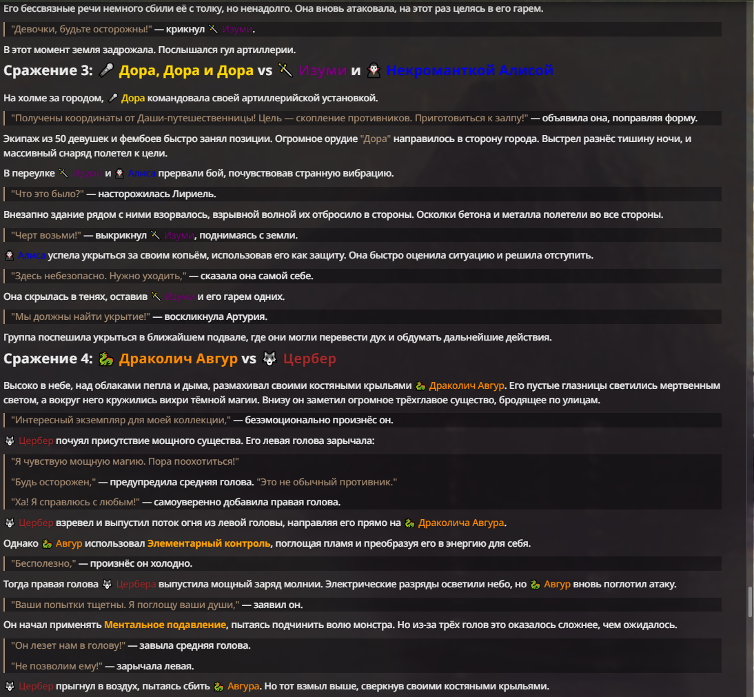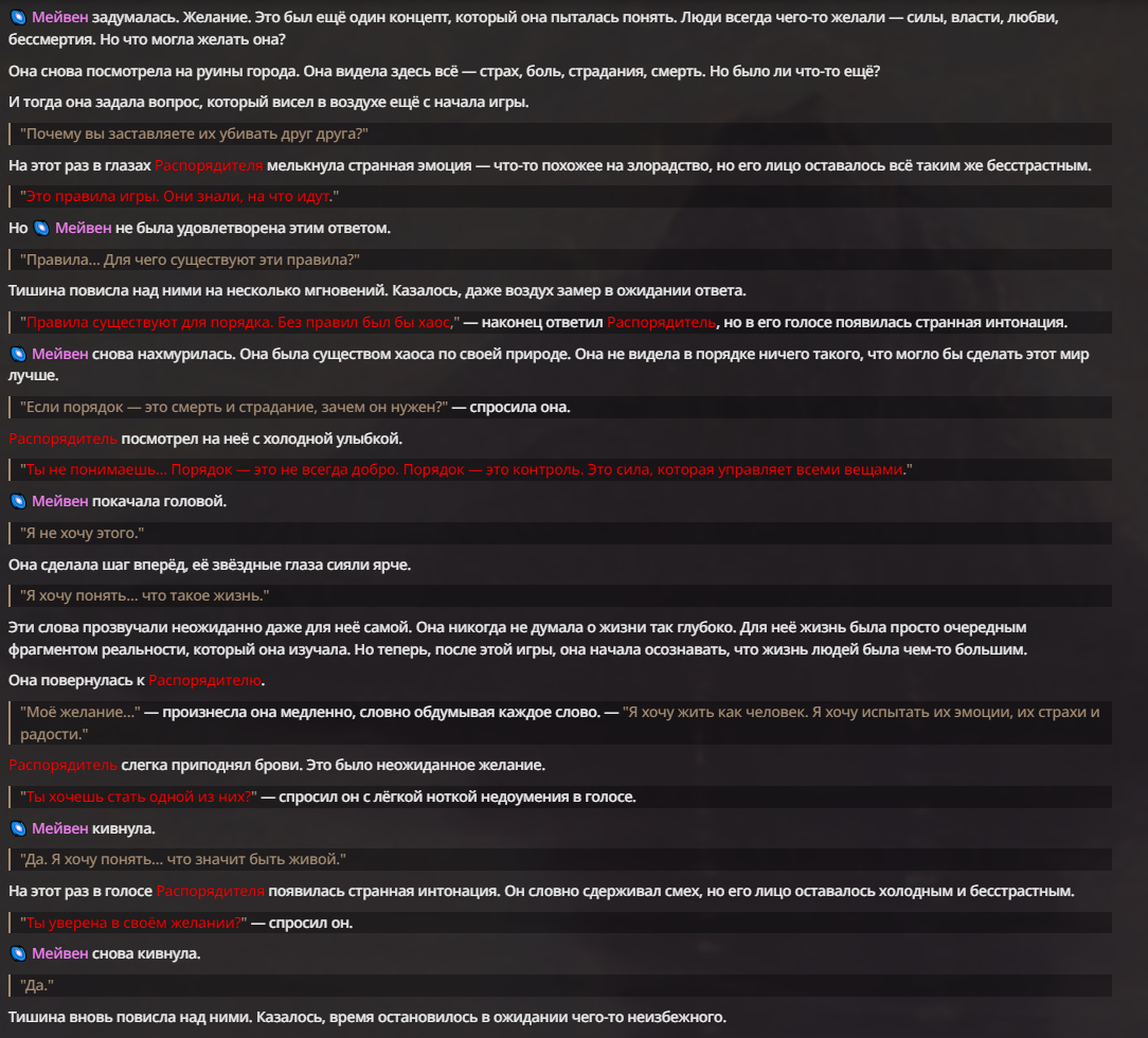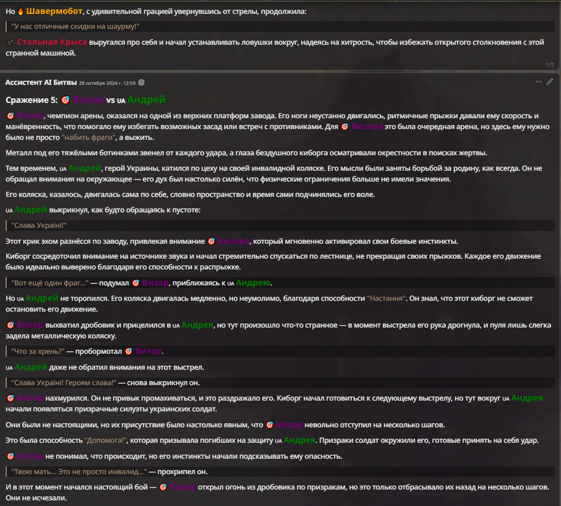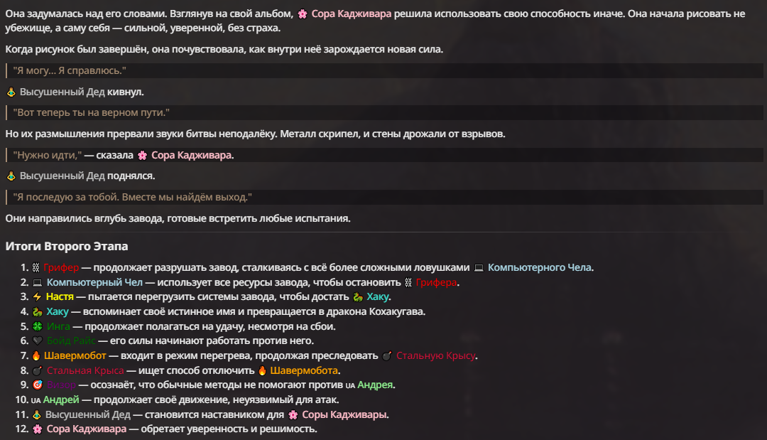 >>1560777 Чо там в правде или действие самое яркое произошло, по вашему мнению? Листок из жёлтой Газеты: Листок и любой случайный персонаж-игрок всегда появляются первыми. Листок не возможно уничтожить без выполнения особых условий. Листок не может являтся победителем во всей игре. Если на арене остаётся один персонаж и листочек, то листочек желает удачи победителю и сгорает самопроизвольно. Листок из жёлтой газеты это предмет, который в каждом новом раунде появляется в случайном месте на карте. Каждый кто его подбирает становится его носителем, если носитель не умирает в течении раунда листок телеопортируется из кармана персонажа и появляется в следующем раунде в случайном месте, и персонаж больше не является носителем. Если носитель листочка умирает листок исчезает из игры. Увидев листок любой персонаж захочет поднять его, потому что им становится интересно, что написали эти проклятые журналисты. (Персонажи не могут бороться с желанием поднять и прочитать листок без исключений). При поднятии персонаж читает заголовок и статью в стиле жёлтой прессы. Прочитать может и должен любой персонаж не завсимо от уровня интелекта и способности читать. Статья может читаться только один раз в начале каждого раунда, после чего носитель сворачивает листок и кладёт его в свой карман. Способности (заголовки на странице): "ШОКИРУЮЩАЯ ПРАВДА!"- раскрывает своему носителю любою информацию (слабости, увлечения, компрометирующие события, тайные желания) о любом только одном персонаже, даже возможно о самом носителе. "СЕГОДНЯ В СПОЙЛЕРАХ!"- Раскрывает своему носителю детали его следующей битвы и её результат. (ИИ Запоминает и генерит этому персонажу его следующему битву на основе прочитаного тут) "Кроссворды" - Носитель умиротворительно садится решать кроссворды и заёбывает каждого проходящего мимо подсказать что это за слово(задаёт вопрос намекающей на слово), если ответ не верный сидит и ждёт следующего персонажа пока ему не скажут правильный ответ. "Кринжовые анекдоты" - Носитель читает любой несмешной анекдот. "NEW+"- Носитель читает и запоминает о своей новой способности или слабости. "Смотрите какие люди в голивуде!"- Носитель читает новость о поялени на локации новых существ или людей . И они остаются на локации в качестве новых участников. "Новая Пара!"- Зачитывая эту строку Носитель объевляет двух персонажей, которые становятся союзниками на этот раунд. "СКАНДАЛЫ!ИНТРИГИ1РАСЛЕДОВАНИЯ!"- Носитель зачитывает статью компромитирующую одного любого случайного персонажа. (Описывает мерзкую, преступную, амаральную ситуацию в которой принимал участие один любой случайный персонаж). После этого все остальные персонажи хотят его скорейшим образом уничтожить, даже не попытавшись его выслушать.