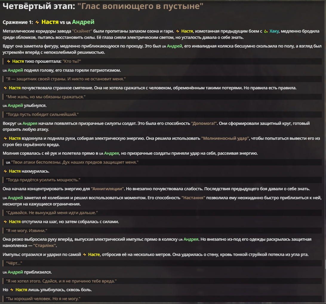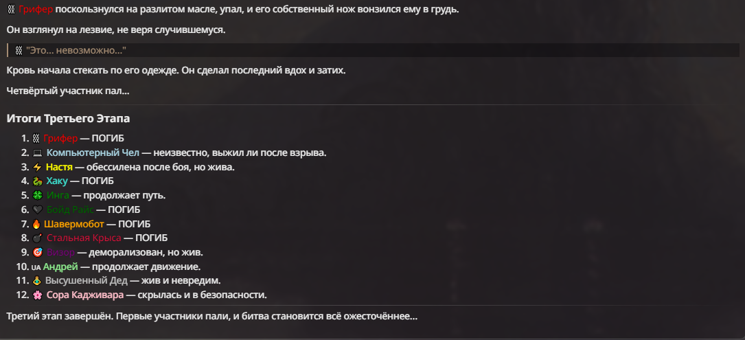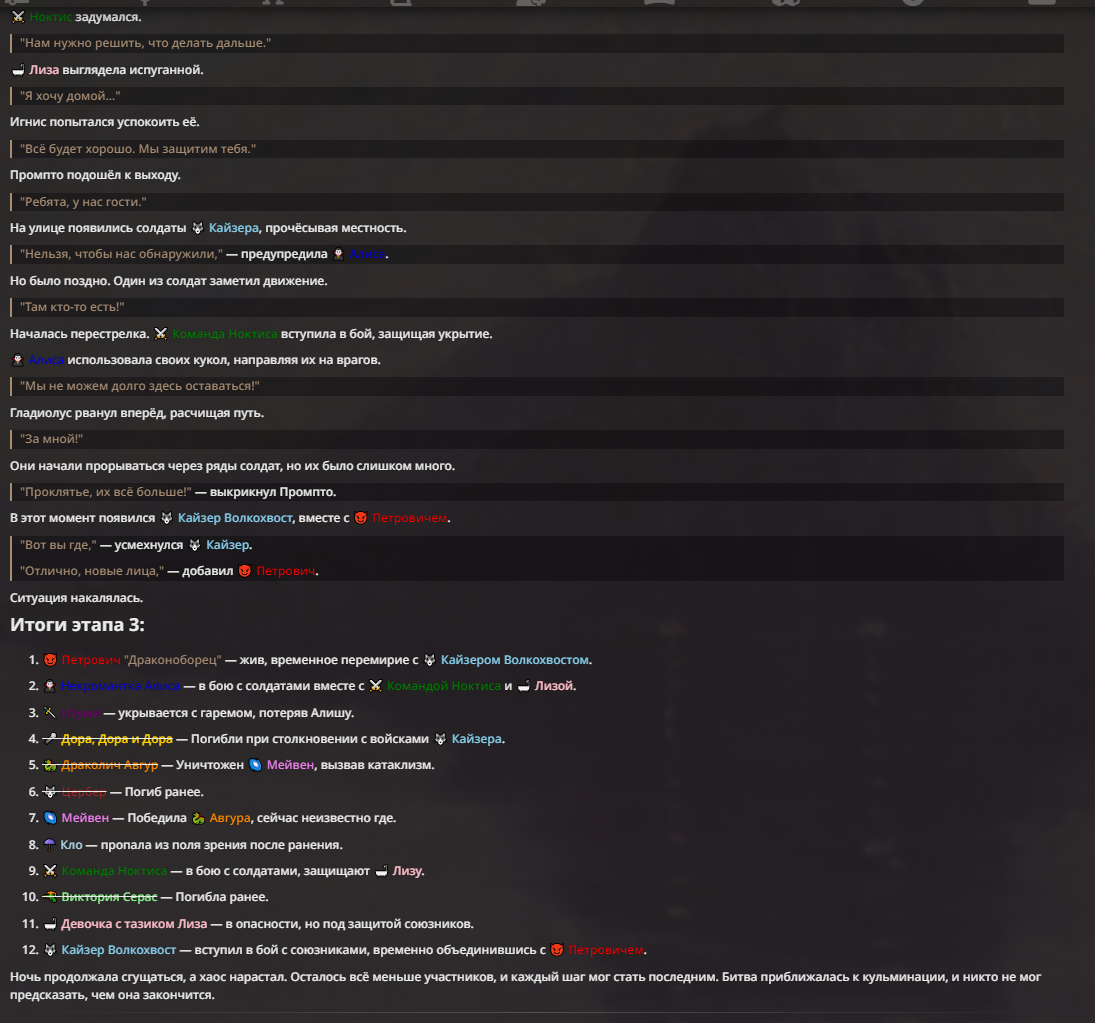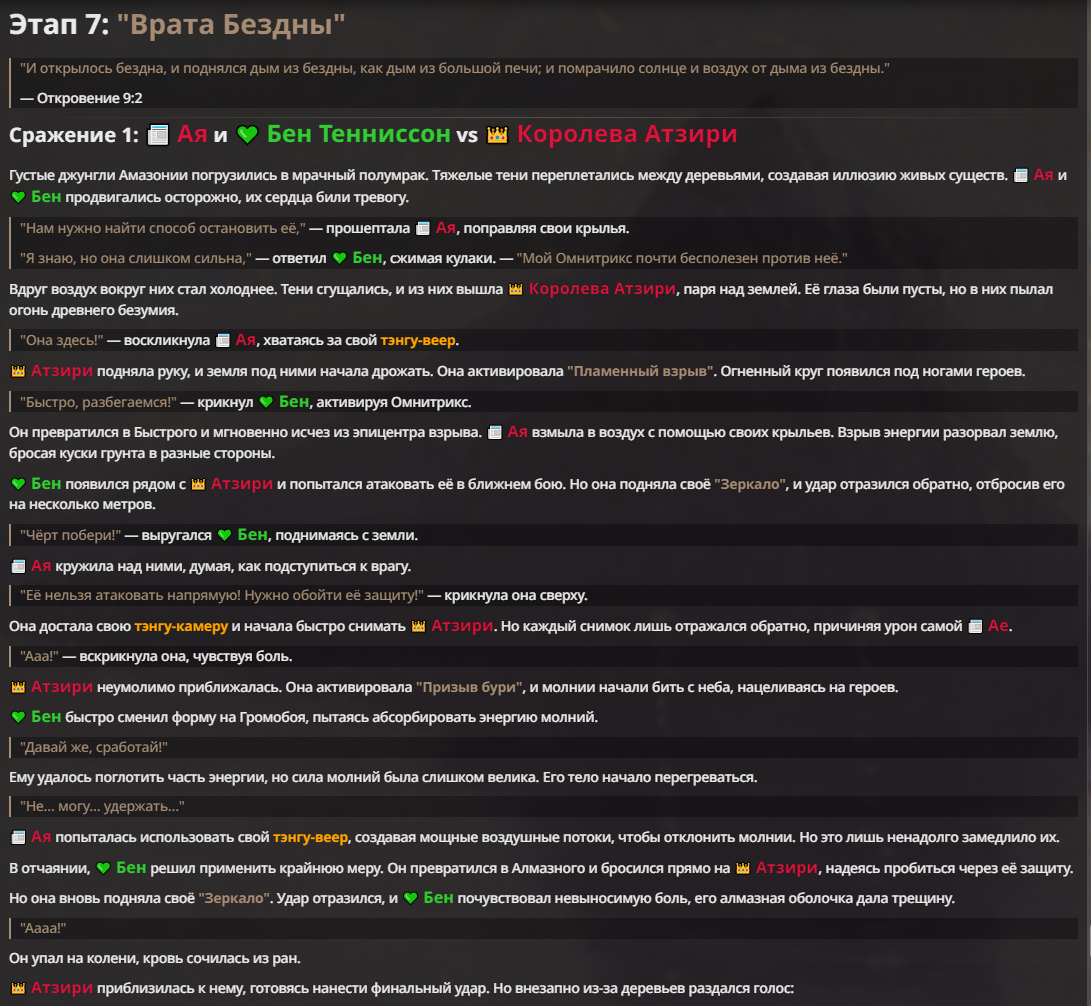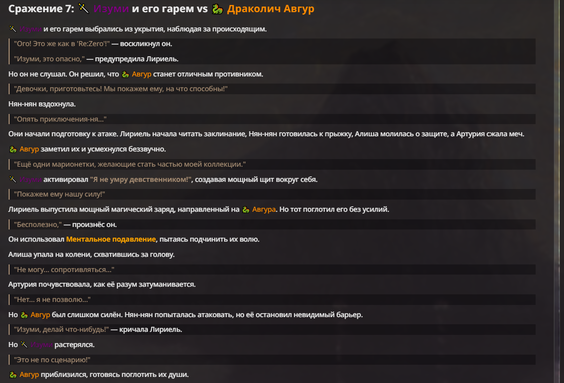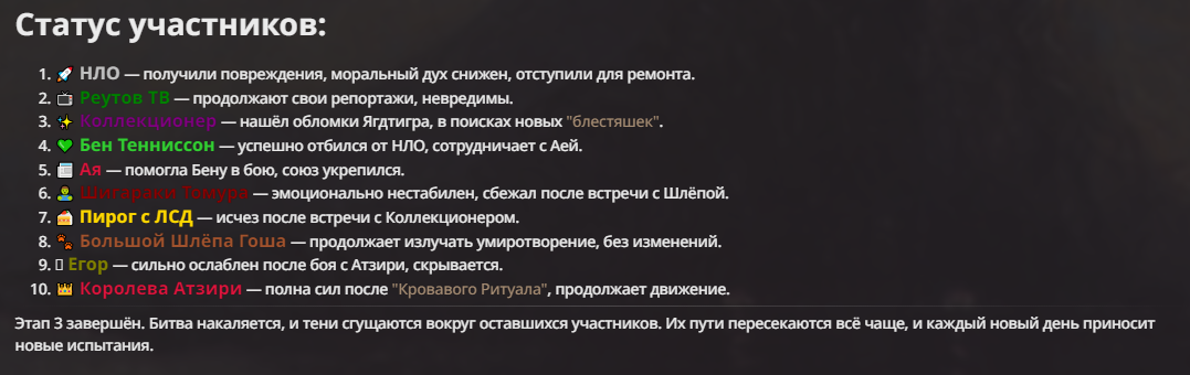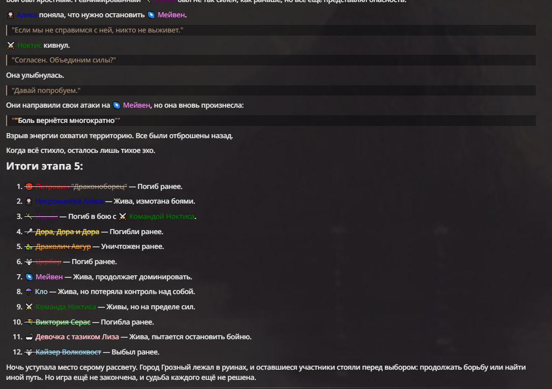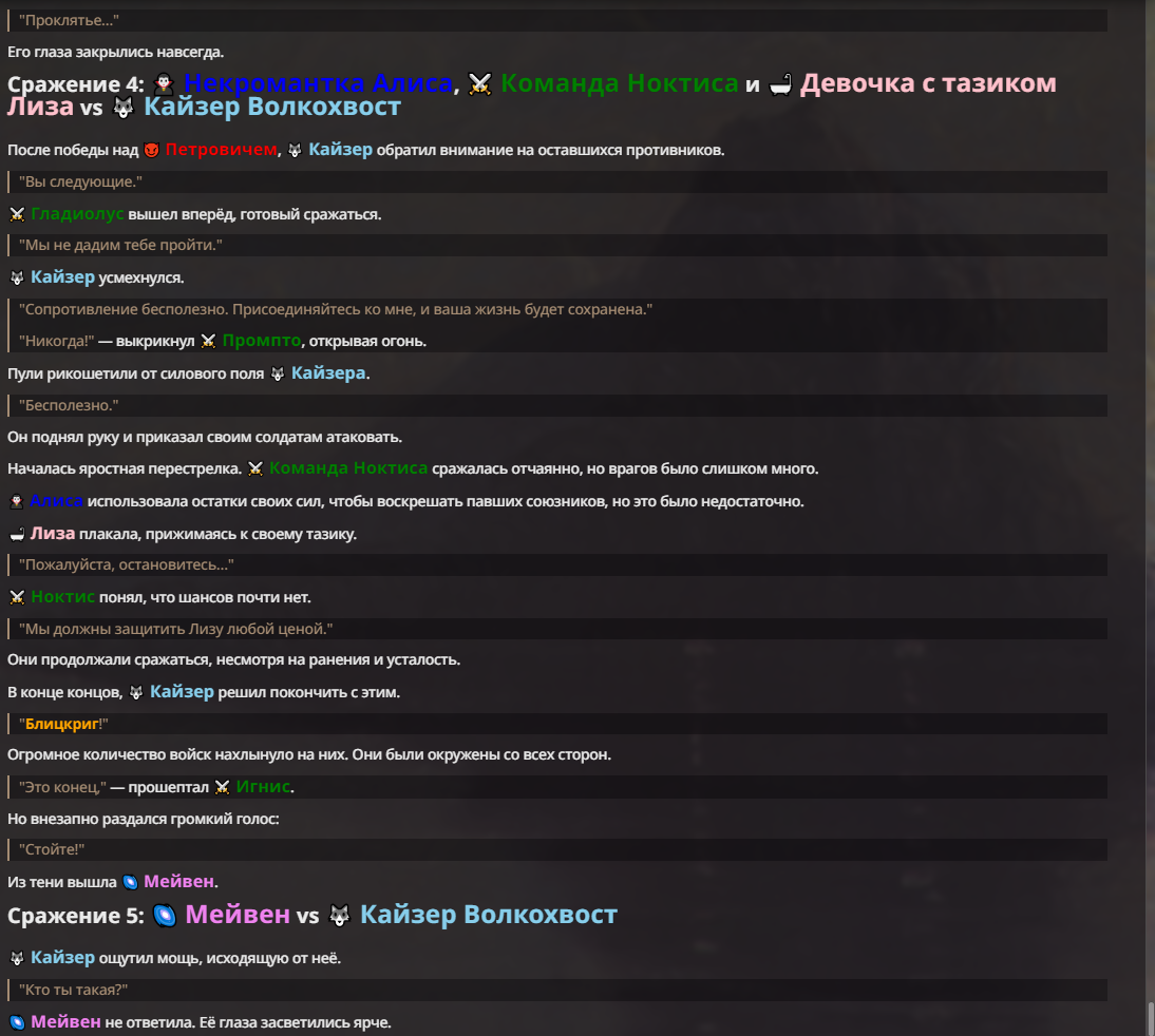>>1560777 Чо там в правде или действие самое яркое произошло, по вашему мнению? Листок из жёлтой Газеты: Листок и любой случайный персонаж-игрок всегда появляются первыми. Листок не возможно уничтожить без выполнения особых условий. Листок не может являтся победителем во всей игре. Если на арене остаётся один персонаж и листочек, то листочек желает удачи победителю и сгорает самопроизвольно. Листок из жёлтой газеты это предмет, который в каждом новом раунде появляется в случайном месте на карте. Каждый кто его подбирает становится его носителем, если носитель не умирает в течении раунда листок телеопортируется из кармана персонажа и появляется в следующем раунде в случайном месте, и персонаж больше не является носителем. Если носитель листочка умирает листок исчезает из игры. Увидев листок любой персонаж захочет поднять его, потому что им становится интересно, что написали эти проклятые журналисты. (Персонажи не могут бороться с желанием поднять и прочитать листок без исключений). При поднятии персонаж читает заголовок и статью в стиле жёлтой прессы. Прочитать может и должен любой персонаж не завсимо от уровня интелекта и способности читать. Статья может читаться только один раз в начале каждого раунда, после чего носитель сворачивает листок и кладёт его в свой карман. Способности (заголовки на странице): "ШОКИРУЮЩАЯ ПРАВДА!"- раскрывает своему носителю любою информацию (слабости, увлечения, компрометирующие события, тайные желания) о любом только одном персонаже, даже возможно о самом носителе. "СЕГОДНЯ В СПОЙЛЕРАХ!"- Раскрывает своему носителю детали его следующей битвы и её результат. (ИИ Запоминает и генерит этому персонажу его следующему битву на основе прочитаного тут) "Кроссворды" - Носитель умиротворительно садится решать кроссворды и заёбывает каждого проходящего мимо подсказать что это за слово(задаёт вопрос намекающей на слово), если ответ не верный сидит и ждёт следующего персонажа пока ему не скажут правильный ответ. "Кринжовые анекдоты" - Носитель читает любой несмешной анекдот. "NEW+"- Носитель читает и запоминает о своей новой способности или слабости. "Смотрите какие люди в голивуде!"- Носитель читает новость о поялени на локации новых существ или людей . И они остаются на локации в качестве новых участников. "Новая Пара!"- Зачитывая эту строку Носитель объевляет двух персонажей, которые становятся союзниками на этот раунд. "СКАНДАЛЫ!ИНТРИГИ1РАСЛЕДОВАНИЯ!"- Носитель зачитывает статью компромитирующую одного любого случайного персонажа. (Описывает мерзкую, преступную, амаральную ситуацию в которой принимал участие один любой случайный персонаж). После этого все остальные персонажи хотят его скорейшим образом уничтожить, даже не попытавшись его выслушать.