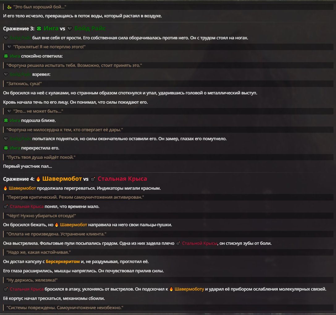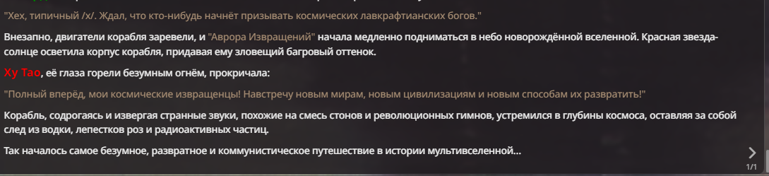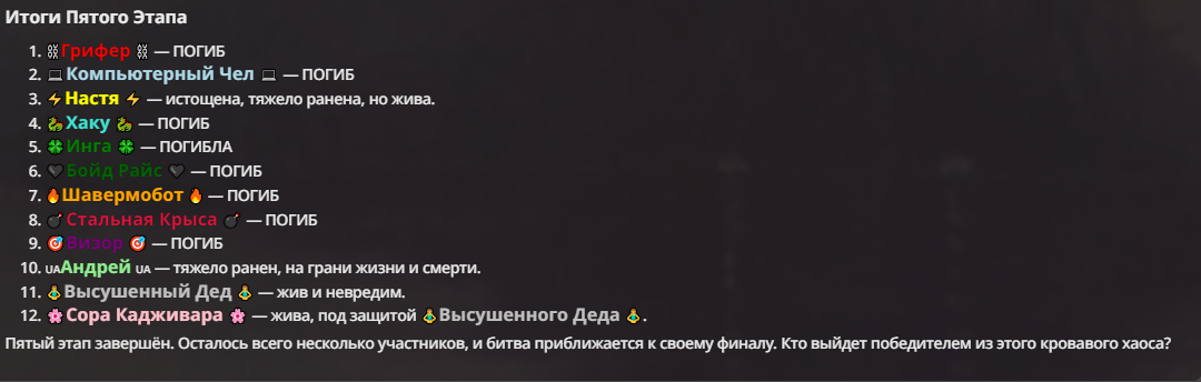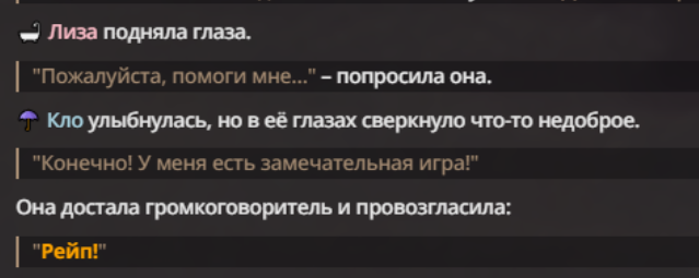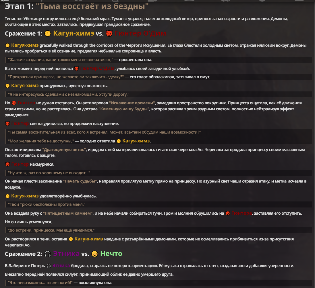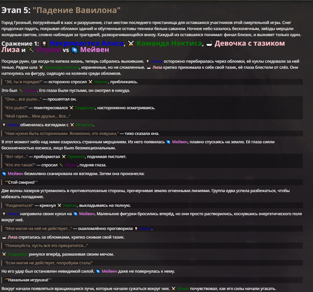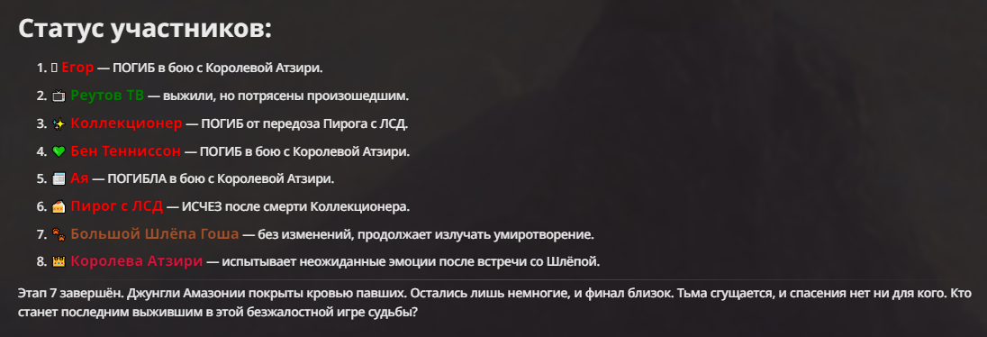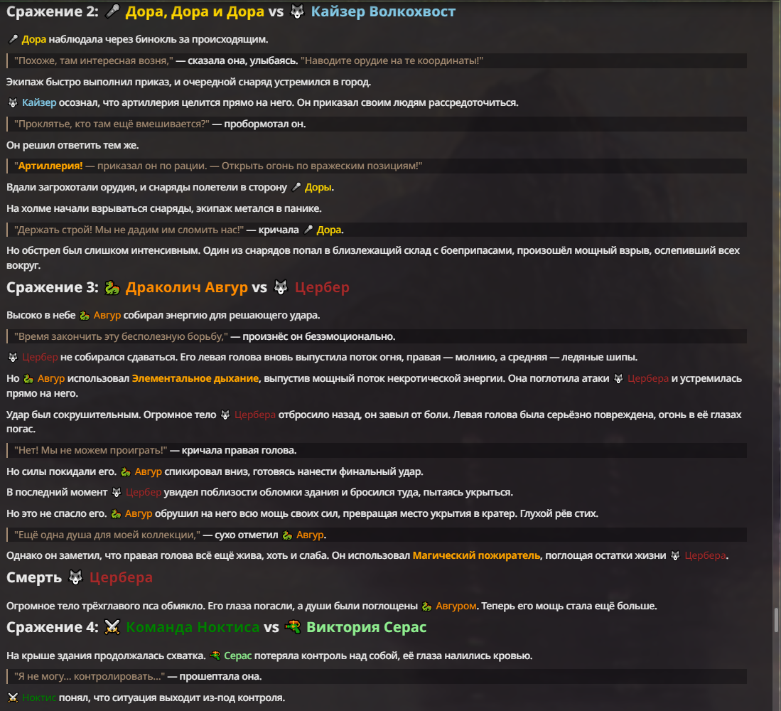 >>1560777 Чо там в правде или действие самое яркое произошло, по вашему мнению? Листок из жёлтой Газеты: Листок и любой случайный персонаж-игрок всегда появляются первыми. Листок не возможно уничтожить без выполнения особых условий. Листок не может являтся победителем во всей игре. Если на арене остаётся один персонаж и листочек, то листочек желает удачи победителю и сгорает самопроизвольно. Листок из жёлтой газеты это предмет, который в каждом новом раунде появляется в случайном месте на карте. Каждый кто его подбирает становится его носителем, если носитель не умирает в течении раунда листок телеопортируется из кармана персонажа и появляется в следующем раунде в случайном месте, и персонаж больше не является носителем. Если носитель листочка умирает листок исчезает из игры. Увидев листок любой персонаж захочет поднять его, потому что им становится интересно, что написали эти проклятые журналисты. (Персонажи не могут бороться с желанием поднять и прочитать листок без исключений). При поднятии персонаж читает заголовок и статью в стиле жёлтой прессы. Прочитать может и должен любой персонаж не завсимо от уровня интелекта и способности читать. Статья может читаться только один раз в начале каждого раунда, после чего носитель сворачивает листок и кладёт его в свой карман. Способности (заголовки на странице): "ШОКИРУЮЩАЯ ПРАВДА!"- раскрывает своему носителю любою информацию (слабости, увлечения, компрометирующие события, тайные желания) о любом только одном персонаже, даже возможно о самом носителе. "СЕГОДНЯ В СПОЙЛЕРАХ!"- Раскрывает своему носителю детали его следующей битвы и её результат. (ИИ Запоминает и генерит этому персонажу его следующему битву на основе прочитаного тут) "Кроссворды" - Носитель умиротворительно садится решать кроссворды и заёбывает каждого проходящего мимо подсказать что это за слово(задаёт вопрос намекающей на слово), если ответ не верный сидит и ждёт следующего персонажа пока ему не скажут правильный ответ. "Кринжовые анекдоты" - Носитель читает любой несмешной анекдот. "NEW+"- Носитель читает и запоминает о своей новой способности или слабости. "Смотрите какие люди в голивуде!"- Носитель читает новость о поялени на локации новых существ или людей . И они остаются на локации в качестве новых участников. "Новая Пара!"- Зачитывая эту строку Носитель объевляет двух персонажей, которые становятся союзниками на этот раунд. "СКАНДАЛЫ!ИНТРИГИ1РАСЛЕДОВАНИЯ!"- Носитель зачитывает статью компромитирующую одного любого случайного персонажа. (Описывает мерзкую, преступную, амаральную ситуацию в которой принимал участие один любой случайный персонаж). После этого все остальные персонажи хотят его скорейшим образом уничтожить, даже не попытавшись его выслушать.
