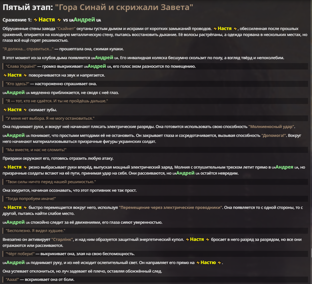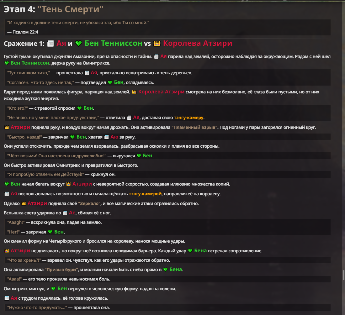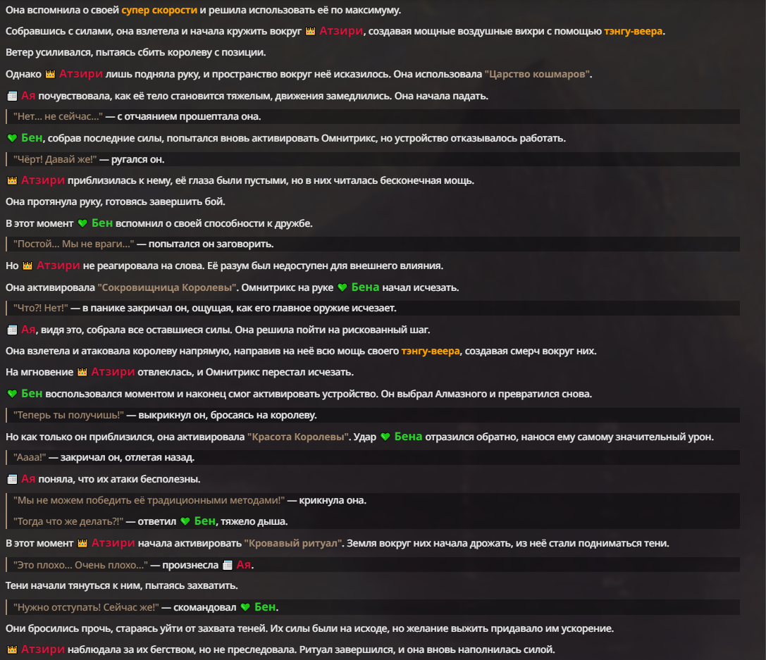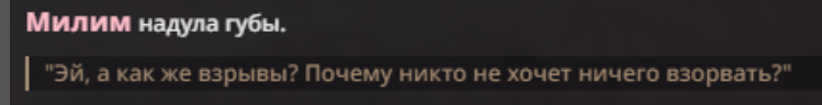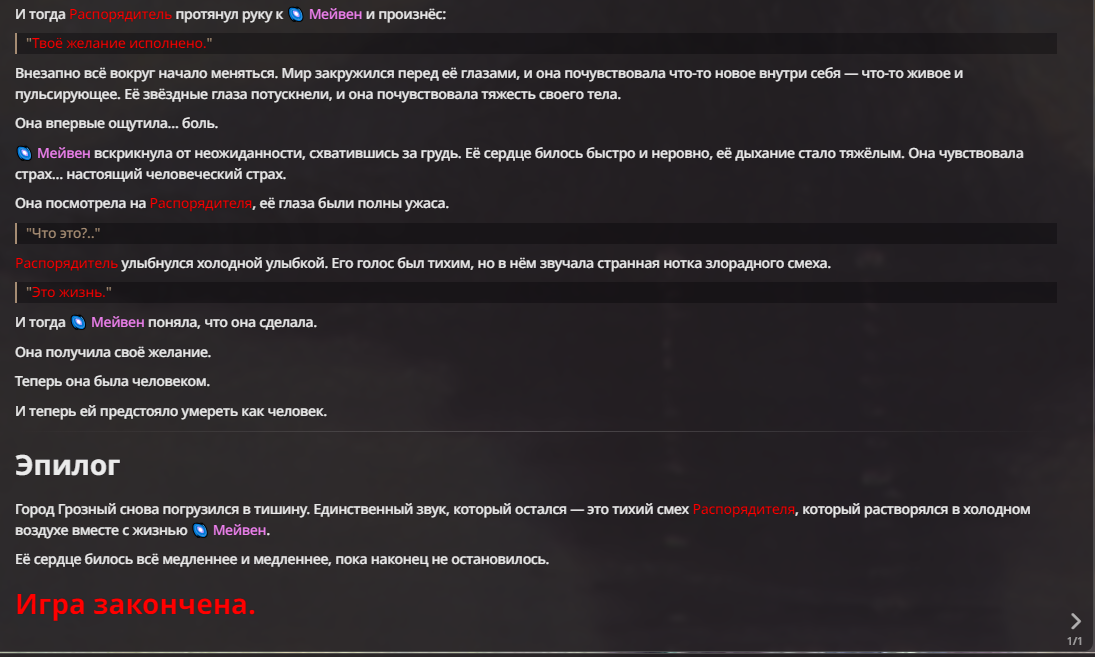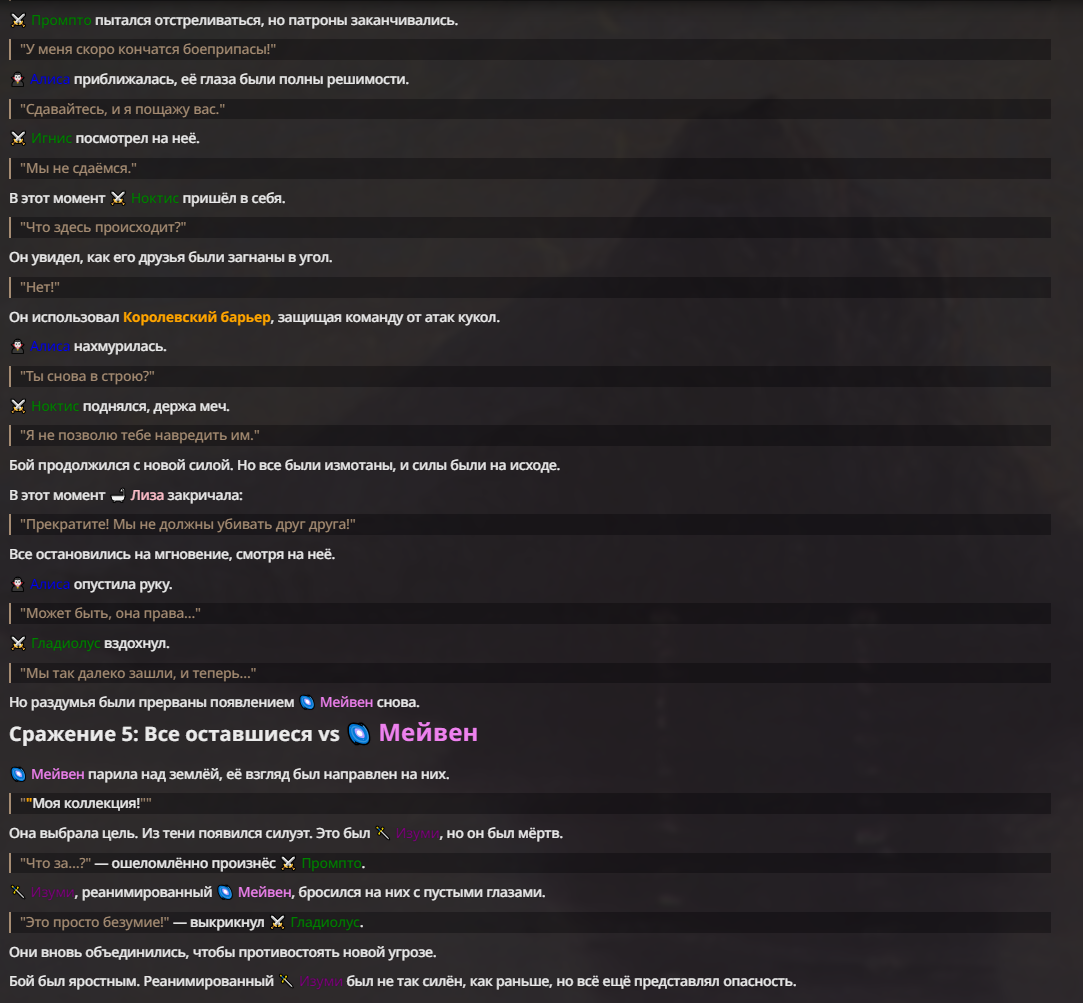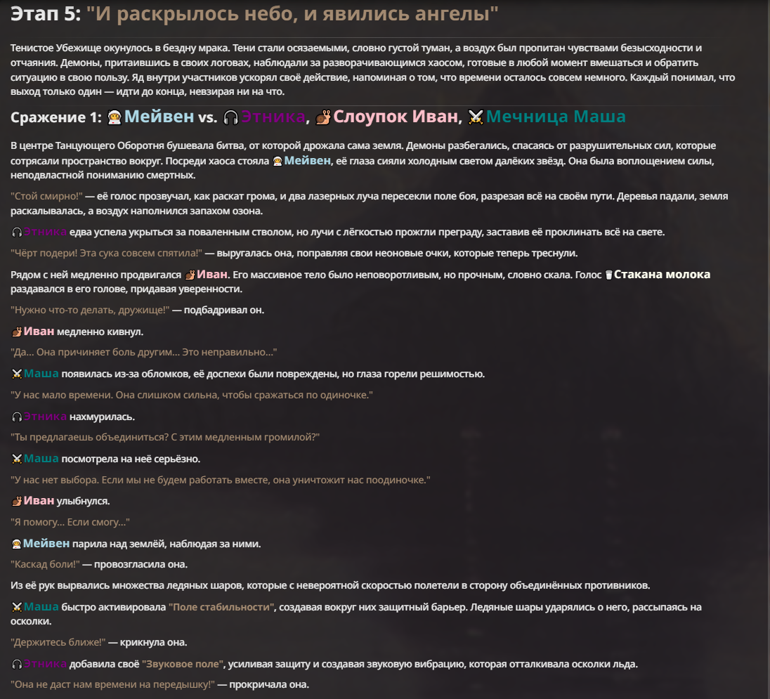 >>1560777 Чо там в правде или действие самое яркое произошло, по вашему мнению? Листок из жёлтой Газеты: Листок и любой случайный персонаж-игрок всегда появляются первыми. Листок не возможно уничтожить без выполнения особых условий. Листок не может являтся победителем во всей игре. Если на арене остаётся один персонаж и листочек, то листочек желает удачи победителю и сгорает самопроизвольно. Листок из жёлтой газеты это предмет, который в каждом новом раунде появляется в случайном месте на карте. Каждый кто его подбирает становится его носителем, если носитель не умирает в течении раунда листок телеопортируется из кармана персонажа и появляется в следующем раунде в случайном месте, и персонаж больше не является носителем. Если носитель листочка умирает листок исчезает из игры. Увидев листок любой персонаж захочет поднять его, потому что им становится интересно, что написали эти проклятые журналисты. (Персонажи не могут бороться с желанием поднять и прочитать листок без исключений). При поднятии персонаж читает заголовок и статью в стиле жёлтой прессы. Прочитать может и должен любой персонаж не завсимо от уровня интелекта и способности читать. Статья может читаться только один раз в начале каждого раунда, после чего носитель сворачивает листок и кладёт его в свой карман. Способности (заголовки на странице): "ШОКИРУЮЩАЯ ПРАВДА!"- раскрывает своему носителю любою информацию (слабости, увлечения, компрометирующие события, тайные желания) о любом только одном персонаже, даже возможно о самом носителе. "СЕГОДНЯ В СПОЙЛЕРАХ!"- Раскрывает своему носителю детали его следующей битвы и её результат. (ИИ Запоминает и генерит этому персонажу его следующему битву на основе прочитаного тут) "Кроссворды" - Носитель умиротворительно садится решать кроссворды и заёбывает каждого проходящего мимо подсказать что это за слово(задаёт вопрос намекающей на слово), если ответ не верный сидит и ждёт следующего персонажа пока ему не скажут правильный ответ. "Кринжовые анекдоты" - Носитель читает любой несмешной анекдот. "NEW+"- Носитель читает и запоминает о своей новой способности или слабости. "Смотрите какие люди в голивуде!"- Носитель читает новость о поялени на локации новых существ или людей . И они остаются на локации в качестве новых участников. "Новая Пара!"- Зачитывая эту строку Носитель объевляет двух персонажей, которые становятся союзниками на этот раунд. "СКАНДАЛЫ!ИНТРИГИ1РАСЛЕДОВАНИЯ!"- Носитель зачитывает статью компромитирующую одного любого случайного персонажа. (Описывает мерзкую, преступную, амаральную ситуацию в которой принимал участие один любой случайный персонаж). После этого все остальные персонажи хотят его скорейшим образом уничтожить, даже не попытавшись его выслушать.