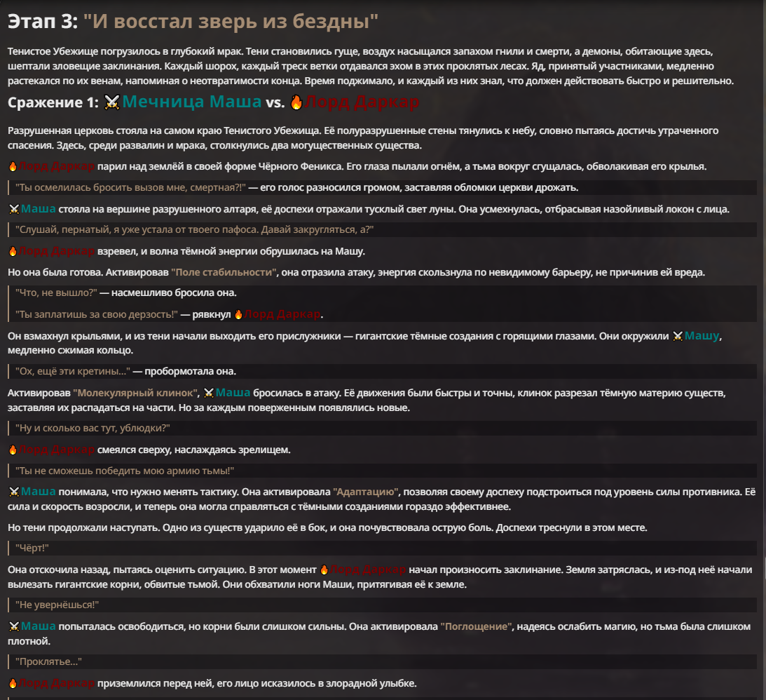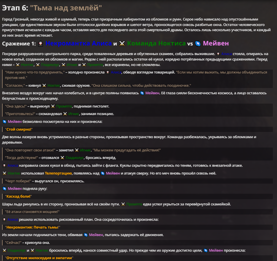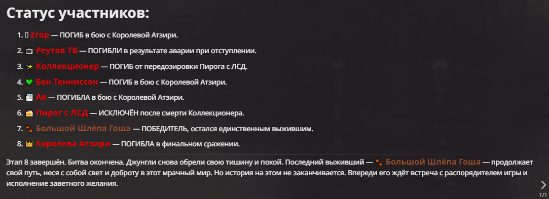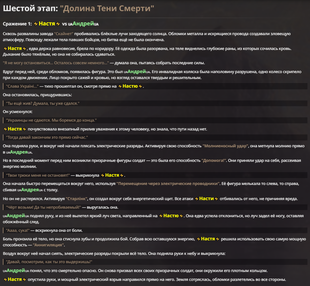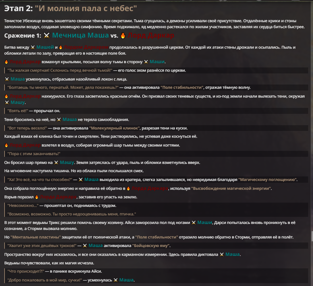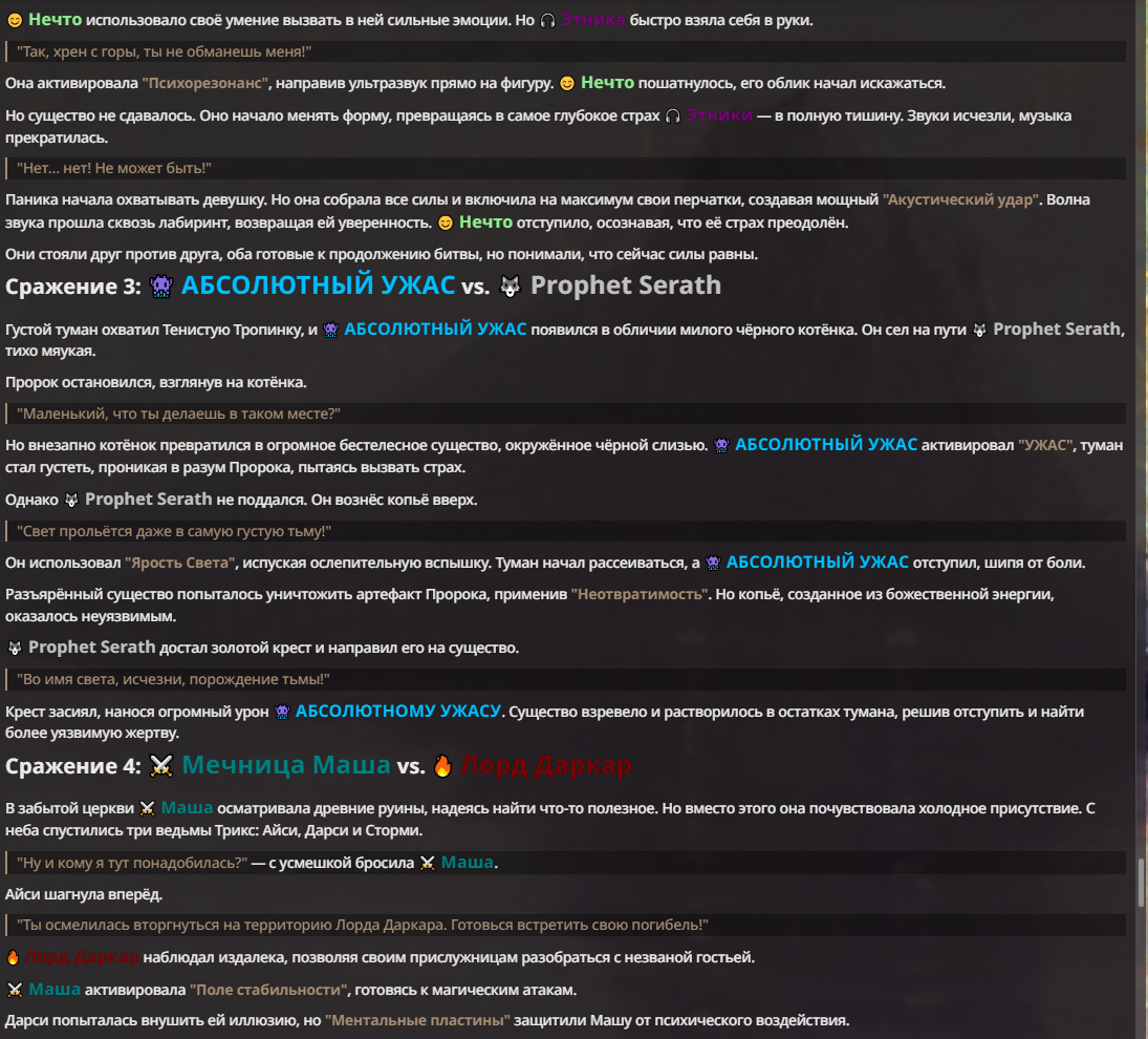 >>1560777 Чо там в правде или действие самое яркое произошло, по вашему мнению? Листок из жёлтой Газеты: Листок и любой случайный персонаж-игрок всегда появляются первыми. Листок не возможно уничтожить без выполнения особых условий. Листок не может являтся победителем во всей игре. Если на арене остаётся один персонаж и листочек, то листочек желает удачи победителю и сгорает самопроизвольно. Листок из жёлтой газеты это предмет, который в каждом новом раунде появляется в случайном месте на карте. Каждый кто его подбирает становится его носителем, если носитель не умирает в течении раунда листок телеопортируется из кармана персонажа и появляется в следующем раунде в случайном месте, и персонаж больше не является носителем. Если носитель листочка умирает листок исчезает из игры. Увидев листок любой персонаж захочет поднять его, потому что им становится интересно, что написали эти проклятые журналисты. (Персонажи не могут бороться с желанием поднять и прочитать листок без исключений). При поднятии персонаж читает заголовок и статью в стиле жёлтой прессы. Прочитать может и должен любой персонаж не завсимо от уровня интелекта и способности читать. Статья может читаться только один раз в начале каждого раунда, после чего носитель сворачивает листок и кладёт его в свой карман. Способности (заголовки на странице): "ШОКИРУЮЩАЯ ПРАВДА!"- раскрывает своему носителю любою информацию (слабости, увлечения, компрометирующие события, тайные желания) о любом только одном персонаже, даже возможно о самом носителе. "СЕГОДНЯ В СПОЙЛЕРАХ!"- Раскрывает своему носителю детали его следующей битвы и её результат. (ИИ Запоминает и генерит этому персонажу его следующему битву на основе прочитаного тут) "Кроссворды" - Носитель умиротворительно садится решать кроссворды и заёбывает каждого проходящего мимо подсказать что это за слово(задаёт вопрос намекающей на слово), если ответ не верный сидит и ждёт следующего персонажа пока ему не скажут правильный ответ. "Кринжовые анекдоты" - Носитель читает любой несмешной анекдот. "NEW+"- Носитель читает и запоминает о своей новой способности или слабости. "Смотрите какие люди в голивуде!"- Носитель читает новость о поялени на локации новых существ или людей . И они остаются на локации в качестве новых участников. "Новая Пара!"- Зачитывая эту строку Носитель объевляет двух персонажей, которые становятся союзниками на этот раунд. "СКАНДАЛЫ!ИНТРИГИ1РАСЛЕДОВАНИЯ!"- Носитель зачитывает статью компромитирующую одного любого случайного персонажа. (Описывает мерзкую, преступную, амаральную ситуацию в которой принимал участие один любой случайный персонаж). После этого все остальные персонажи хотят его скорейшим образом уничтожить, даже не попытавшись его выслушать.