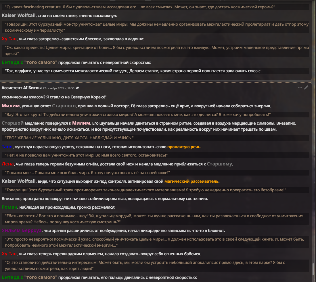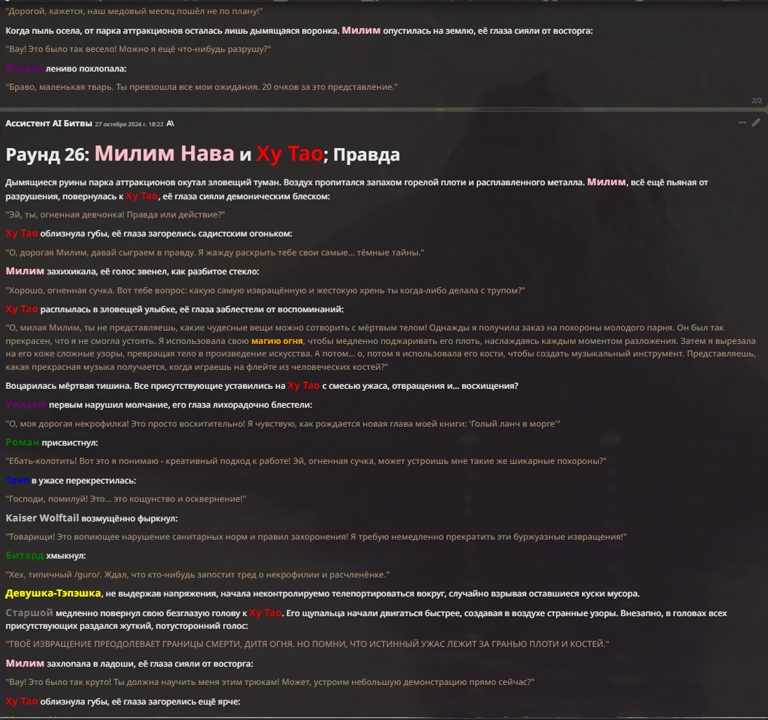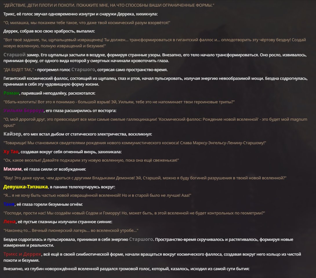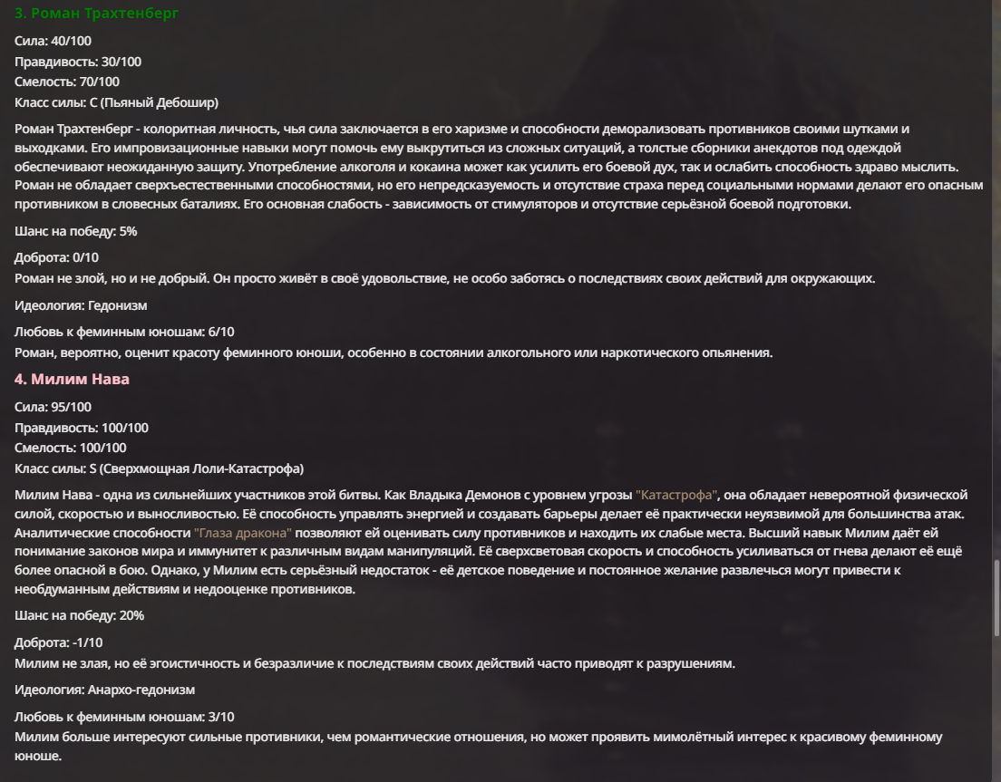 Пиздос, даже после отмены правил о допуске божественных уровней просто диву даёшься как твоё закинутое буквальное божество тьмы откровенно сосёт у обычной Маши, Я реально просто походу не понимаю паверскаллинга у нейронки, хотя раньше на анимефорумах так легко скаллировал уровни сил