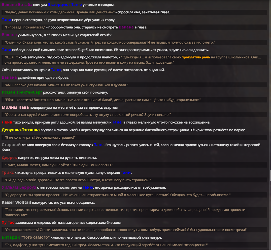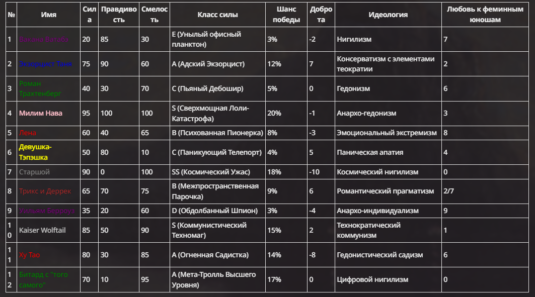 И кидайте персонажей изначально на русском, шоб я описание прочитать мог! Англоперевод можете под спойлер закинуть или в ТХТшник через dropmefiles или ещё какую-нибудь хрень.
