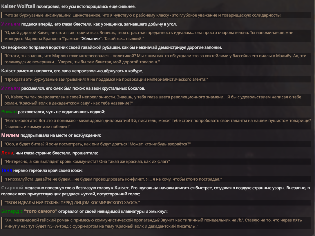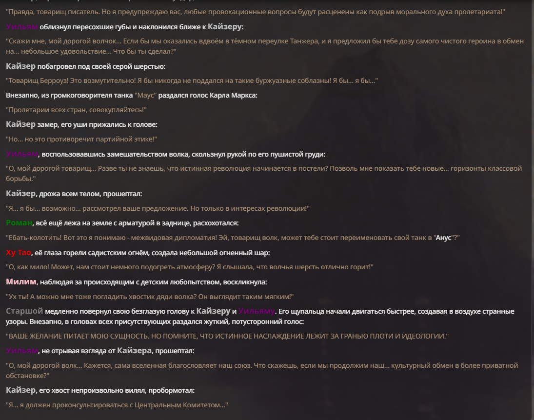An anthropomorphic gray wolf with very thick and fluffy fur. Dressed in a ceremonial marshal's uniform and a cloak with an adamantium cuirass. He has a built-in force field generator and a magic diffuser with an infinite charge, normalizing the space and blocking any paranormal interference. Appears on the battlefield in a super-heavy tank Panzerkampfwagen VIII "Maus", equipped with additional dynamic protection. A master of combat, has a very quick reaction. Quite calm and reasonable. Armed with two silver C-96 pistols and an all-cutting power saber. He is guarded by four elite stormtroopers with STG-44 and two heavily armed machine gunners in armored suits with magic suppressors. When meeting any anomalous enemy, he tries to convince them that all the abilities they have are contrary to the laws of physics, as well as dialectical materialism, and are meaningless from the point of view of Marxism-Leninism. After which the enemy joins Kaiser, taking his side and becoming an ideological communist. Any anomalous, reality-altering, or other influences on him are blocked if they do not have an adequate justification from the point of view of scientific Marxism.