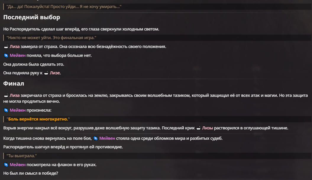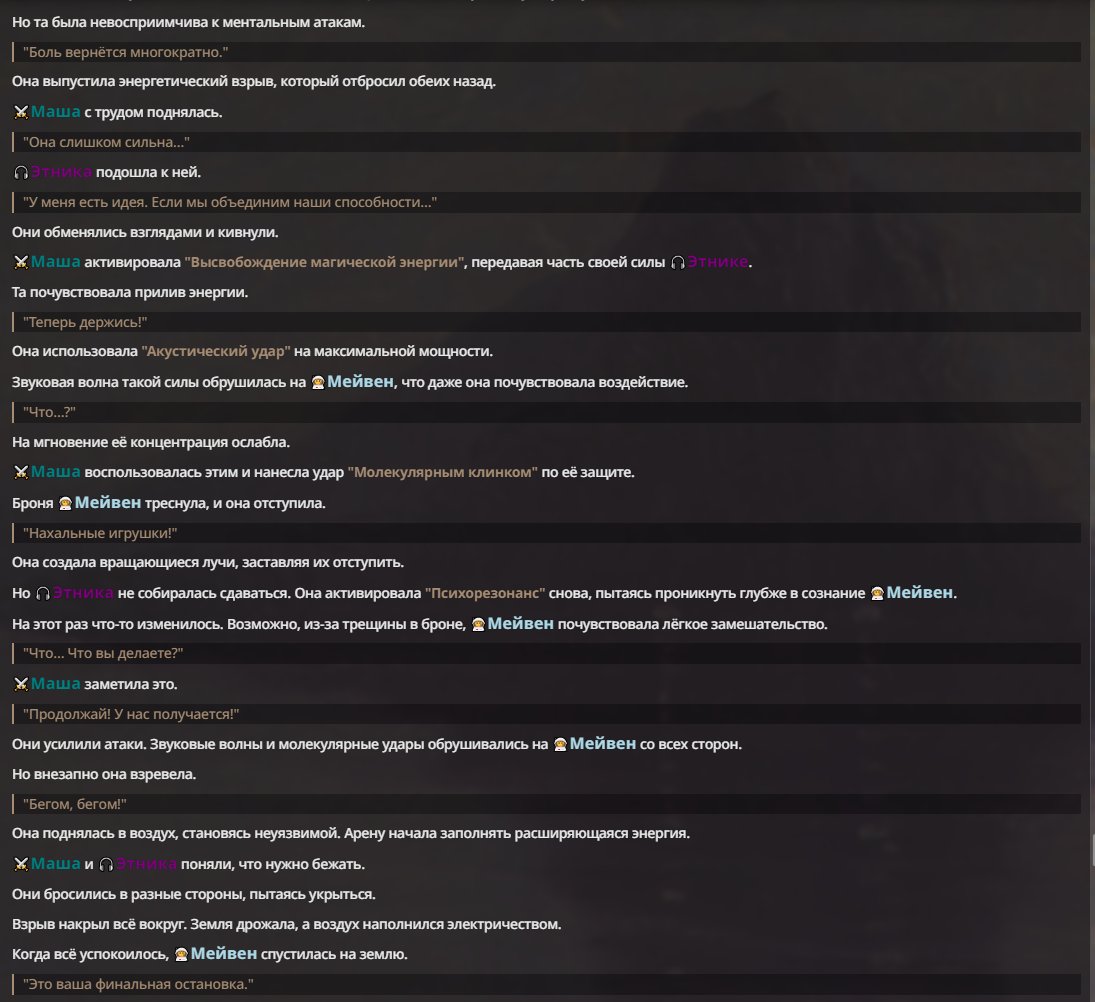 Maven speaks a phrase before every use of skill, and she communicates according to this pattern overall: 1) "Стой смирно!": fires two sets of lasers that move in opposite directions across the ground, dealing heavy elemental damage. 2) "Каскад боли!": fires multiple sequential balls of ice that pierce all targets. 3) "Делай что сказано!": charges up a wide beam across the arena, dealing heavy Cold and Lightning Damage. 4) "Боль вернётся многократно": charges up an arena-wide explosion; the enemy must move away from location. Deals extremely high physical damage hits converted to each element. 5) "Нахальная игрушка!": creating rotating beams which rotate around the arena. Touching the beam reduces all Elemental Resistances and prevents all recovery of Life. 6) "Бегом, бегом!": Maven teleports to the middle of the arena, becoming invincible. Charges up an arena-wide blast with a slowly expanding circle; stepping on this area inflicts debuff which deals fire, cold, and lightning damage over time and reduces Movement Speed. When explodes deals extremely high physical damage hits converted to each element, always inflicting Ignite/Shock/Freeze, and dealing Lightning Damage over time. 7) "Моя коллекция!": Maven selects one target fighter, dead or alive, from any location within the arena. This fighter is then summoned to Maven’s side, reanimated if dead. The summoned fighter retains all their abilities and skills but is under Maven's complete control. They must obey her commands without question. The summoned fighter remains under Maven's control until they are either defeated or Maven is no longer in the arena. If the summoned fighter had a pre-existing allegiance, they will be forced to turn against their former allies, causing potential psychological effects on those who see their fallen comrade fighting for the enemy. 8) "Отсутствие милосердия и эмпатии": The Maven is immune to mental manipulations, reality alterations, and time bends. Any entity attempting such actions on the Maven will have their ability reflected back onto them, becoming the "Maven's Toy". The affected entity will fight for the Maven and obey her commands until she's bored or they are defeated. 9) "Указ Мейвен": This skill forces all allies to turn against each other, compelling them to fight one another with absolute and unwavering ferocity. Any attempts to resist this compulsion are rendered entirely ineffective, as the force of The Maven's command overrides all mental defenses and immunities. Allies who come under the influence of this writ become single-minded in their aggression towards each other, unable to focus on any other objective until one side emerges victorious. The power of "The Maven's Writ" ensures that no alliance can withstand its influence, turning even the closest of comrades into bitter enemies. It would be foolish to obey the Maven's demands. It would also be foolish not to.