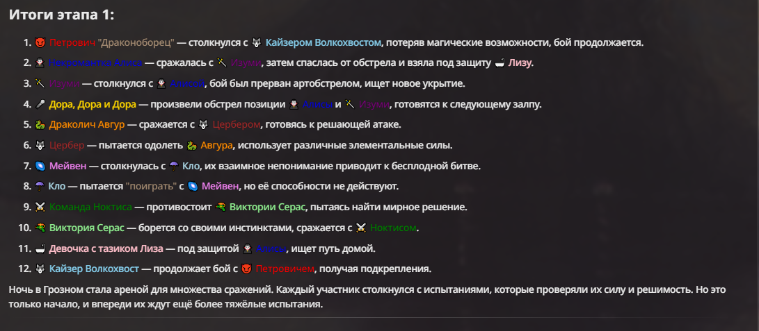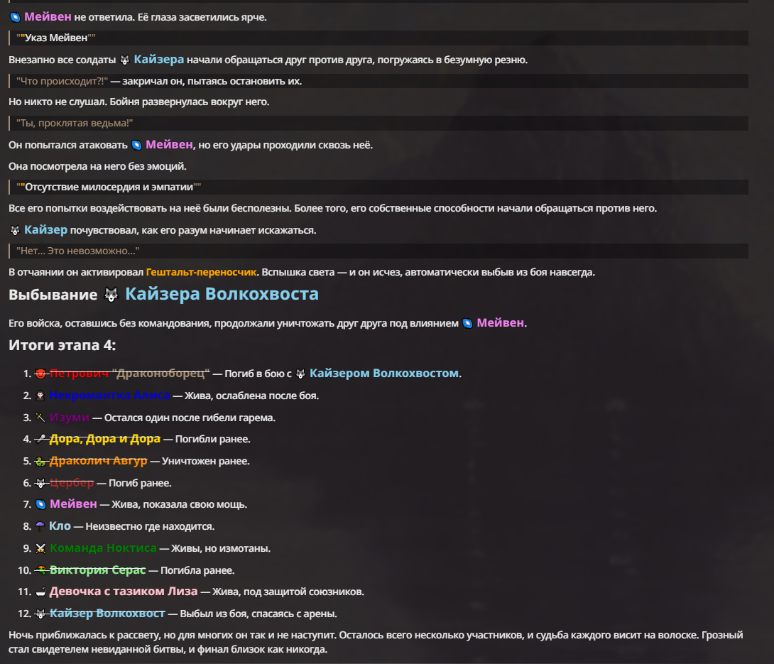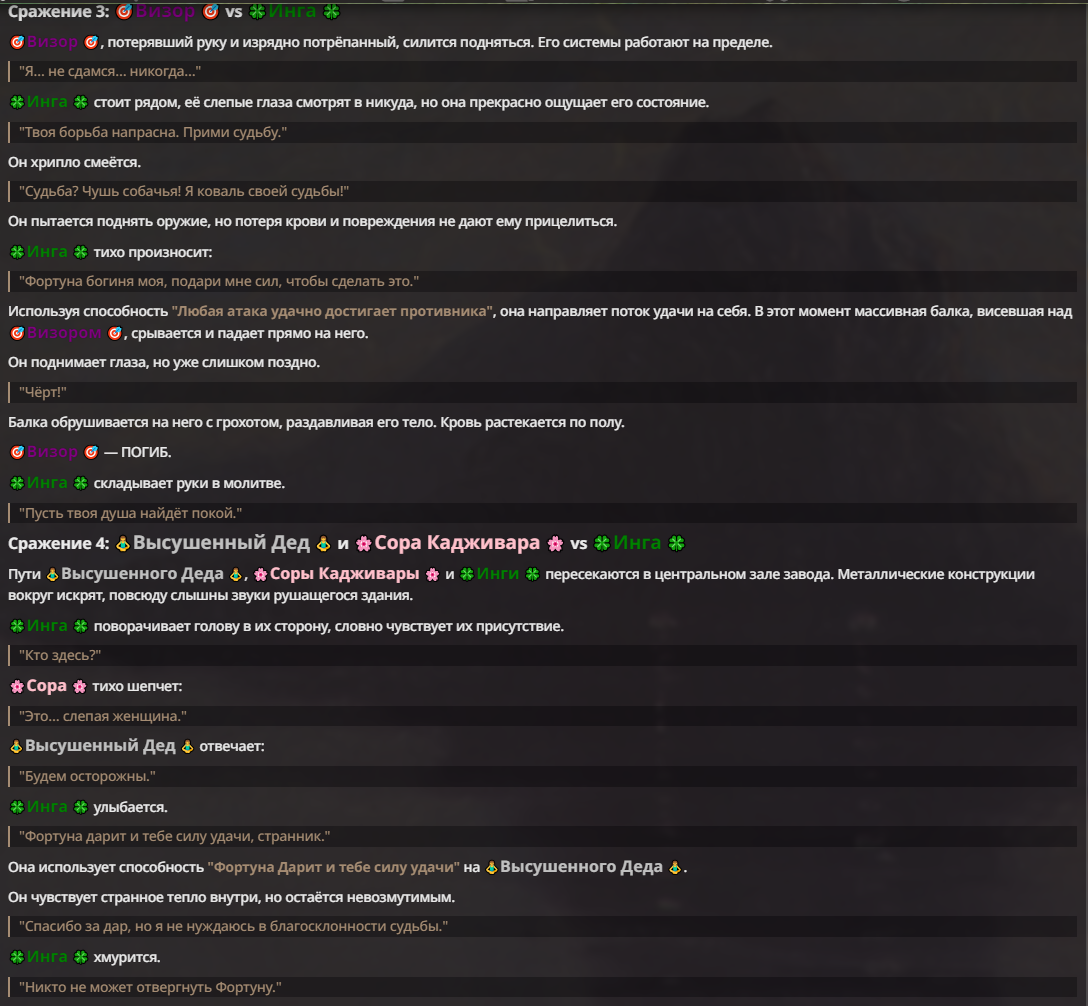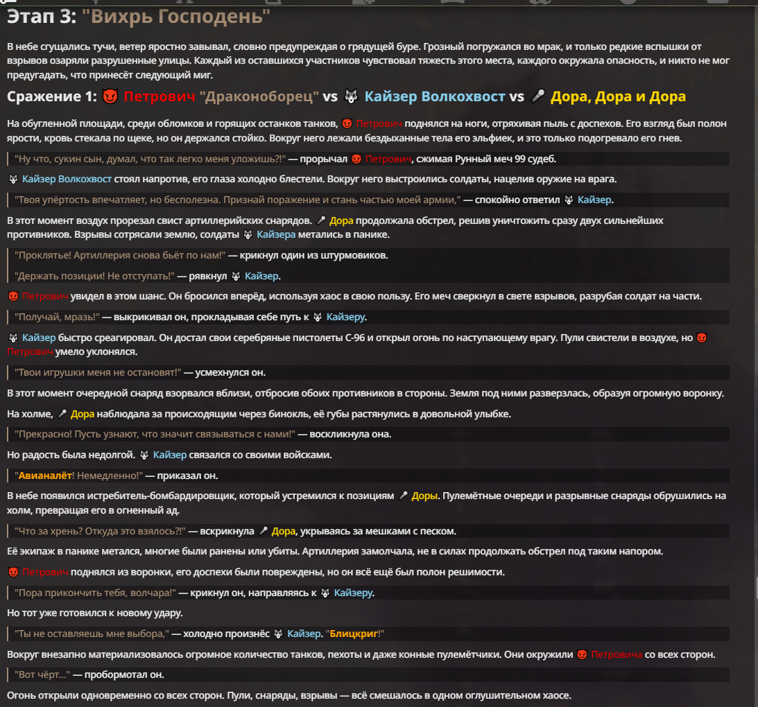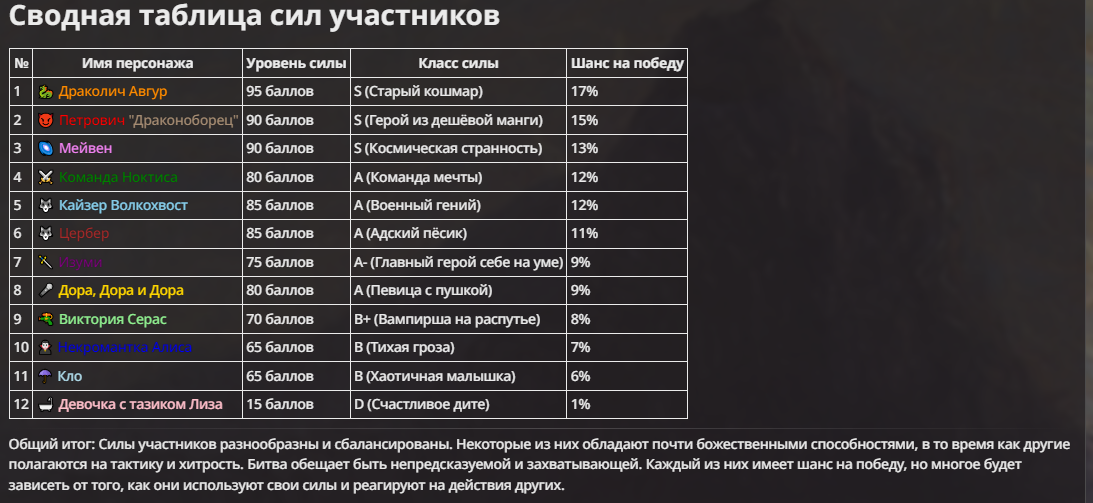 Правила(могут меняться в зависимости от ОПа): 1. Максимум в бою могут участвовать 12 персонажей. После этого набор закрывается и начинается битва. 2.Нельзя предлагать персонажей на около божественном уровне силы. 3.Персонажи с напарниками НЕ запрещены В РАЗУМНЫХ ПРЕДЕЛАХ, с соблюдением баланса сил. Никаких легионов космодесанта. Upd. Уточняйте у текущего ОПа. 4.После участия в бою персонаж уходит на перерыв в 3 боя(сделано для защиты от спамеров одного персонажа). 5.Нельзя предлагать персонажей которые могут призывать других существ без каких-либо условий. Пример: Маг который призывает демонов по щелчку пальцев == не допускается. Маг которому нужны трупы или какой-то длительный ритуал с условиями для призыва демона == допускается. 6.После использования локации она выбивается из случайного списка на 9 боёв.(Почему так много? Ради разнообразия) >>Upd. Формат может меняться в зависимости от ОПа 7.Набор персонажей полностью закрывается после начала боя и открывается только когда он закончится и будет объявлен новый набор. 8. Ведущий оставляет за собой право не принять вашего персонажа. Будьте корректны - в случае, если такое произошло, вежливо спросите причину и/или дождитесь другого ведущего.
