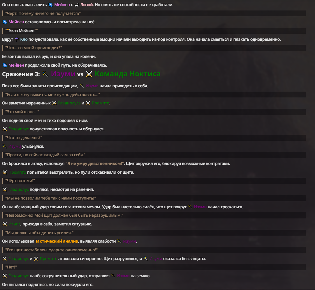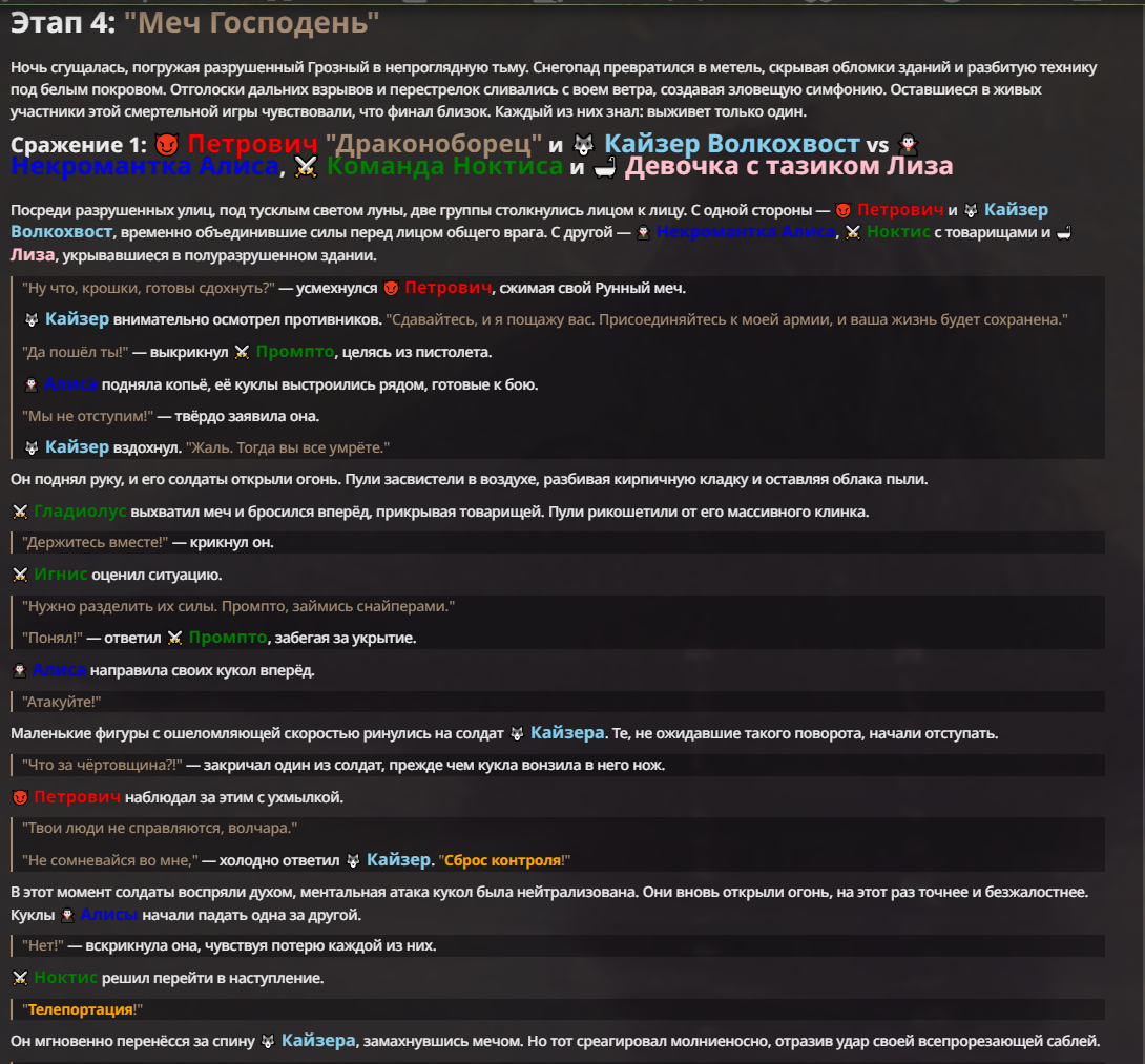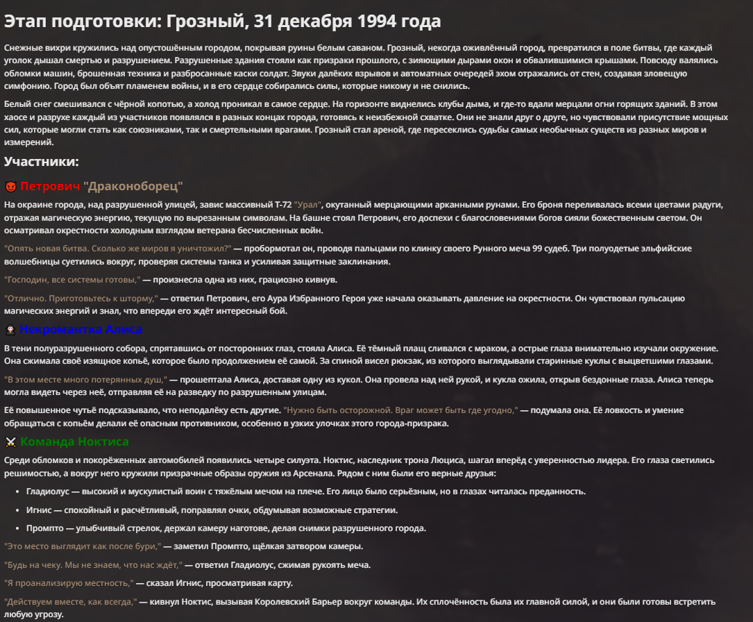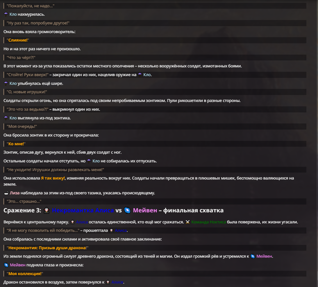 Правила(могут меняться в зависимости от ОПа): 1. Максимум в бою могут участвовать 12 персонажей. После этого набор закрывается и начинается битва. 2.Нельзя предлагать персонажей на около божественном уровне силы. 3.Персонажи с напарниками НЕ запрещены В РАЗУМНЫХ ПРЕДЕЛАХ, с соблюдением баланса сил. Никаких легионов космодесанта. Upd. Уточняйте у текущего ОПа. 4.После участия в бою персонаж уходит на перерыв в 3 боя(сделано для защиты от спамеров одного персонажа). 5.Нельзя предлагать персонажей которые могут призывать других существ без каких-либо условий. Пример: Маг который призывает демонов по щелчку пальцев == не допускается. Маг которому нужны трупы или какой-то длительный ритуал с условиями для призыва демона == допускается. 6.После использования локации она выбивается из случайного списка на 9 боёв.(Почему так много? Ради разнообразия) >>Upd. Формат может меняться в зависимости от ОПа 7.Набор персонажей полностью закрывается после начала боя и открывается только когда он закончится и будет объявлен новый набор. 8. Ведущий оставляет за собой право не принять вашего персонажа. Будьте корректны - в случае, если такое произошло, вежливо спросите причину и/или дождитесь другого ведущего.