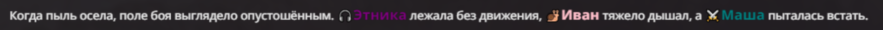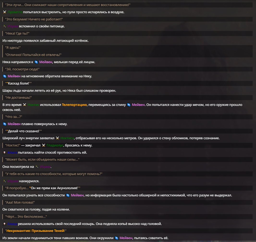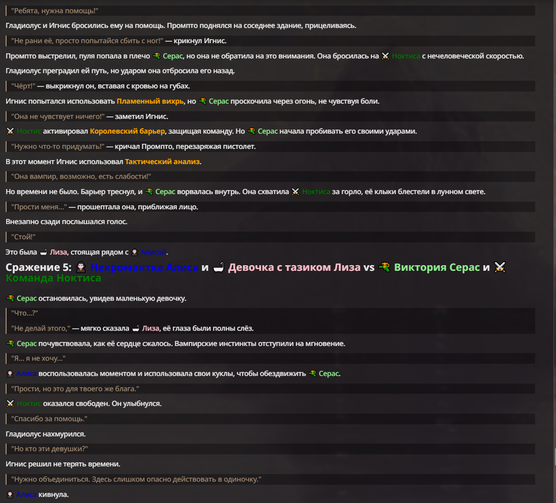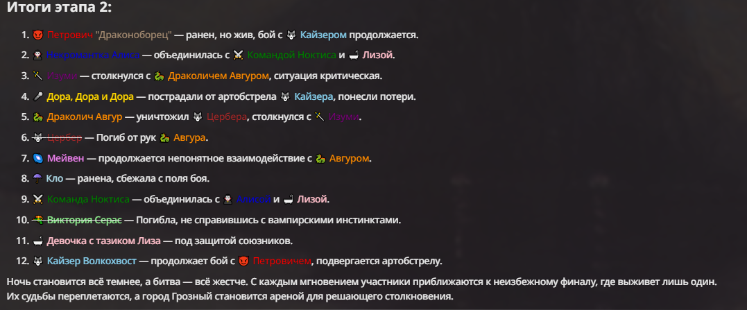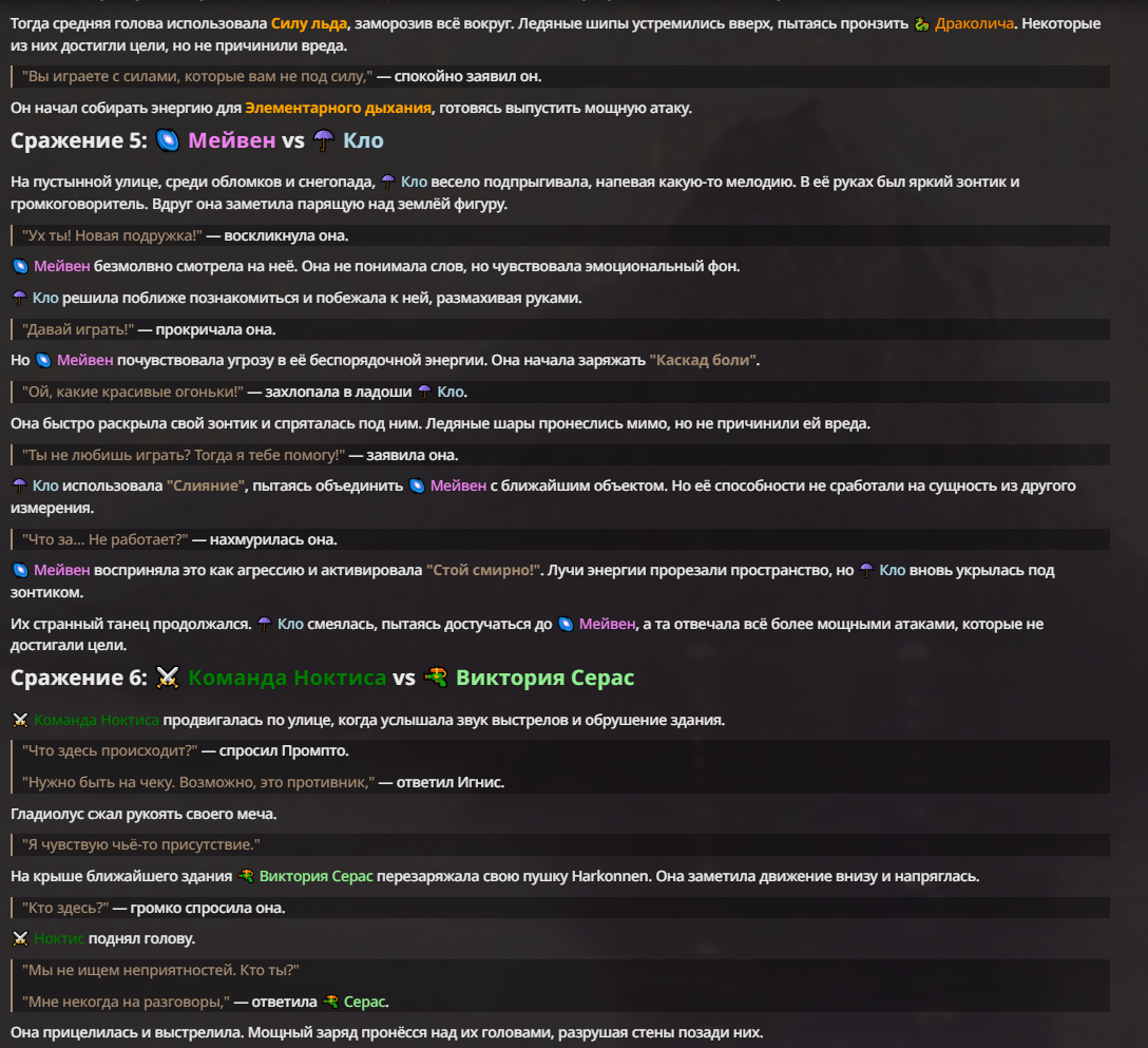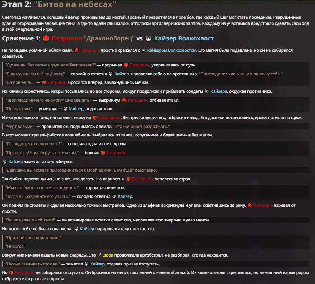 Правила(могут меняться в зависимости от ОПа): 1. Максимум в бою могут участвовать 12 персонажей. После этого набор закрывается и начинается битва. 2.Нельзя предлагать персонажей на около божественном уровне силы. 3.Персонажи с напарниками НЕ запрещены В РАЗУМНЫХ ПРЕДЕЛАХ, с соблюдением баланса сил. Никаких легионов космодесанта. Upd. Уточняйте у текущего ОПа. 4.После участия в бою персонаж уходит на перерыв в 3 боя(сделано для защиты от спамеров одного персонажа). 5.Нельзя предлагать персонажей которые могут призывать других существ без каких-либо условий. Пример: Маг который призывает демонов по щелчку пальцев == не допускается. Маг которому нужны трупы или какой-то длительный ритуал с условиями для призыва демона == допускается. 6.После использования локации она выбивается из случайного списка на 9 боёв.(Почему так много? Ради разнообразия) >>Upd. Формат может меняться в зависимости от ОПа 7.Набор персонажей полностью закрывается после начала боя и открывается только когда он закончится и будет объявлен новый набор. 8. Ведущий оставляет за собой право не принять вашего персонажа. Будьте корректны - в случае, если такое произошло, вежливо спросите причину и/или дождитесь другого ведущего.