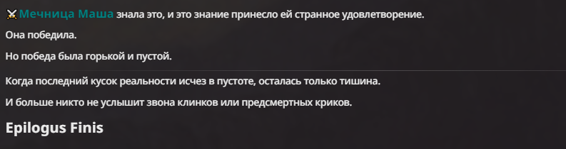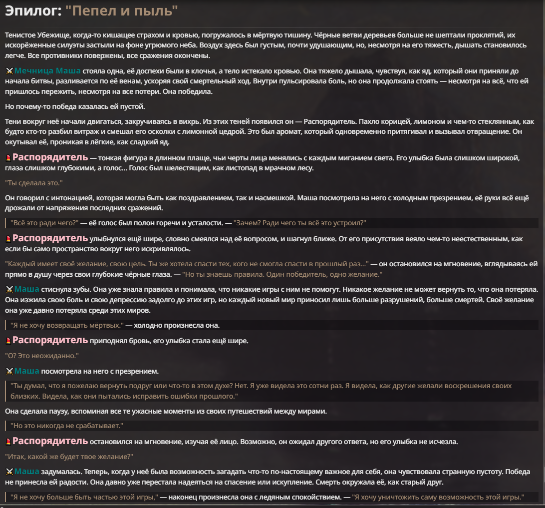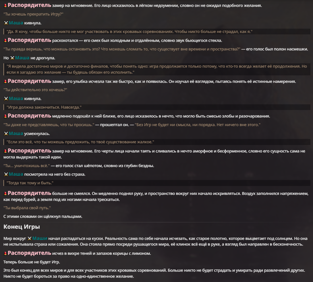 Мечница Маша Когда то была девочкой волшебницей, участвовавшей в демонических войнах. На войне она потеряла много своих подруг, оказалась единственной выжившей из роты, что по итогу негативно повлияло на её психику, сделав её опустившимся алкоголиком в депрессии. Однако все изменилось после участие в кровавых играх организованными неким Распорядителем. В этих играх она чудом смогла победить и дойдя до финала пожелала у Распорядителя стереть из истории демоническое вторжение и вернуть к жизни её боевых подруг. Её желание было исполнено, но Маша не смогла долго наслаждаться мирной жизнью, так как даже без демонов на её родной мир все равно напали страшные чудовища, однако в этот раз ни у кого не было магических сил чтобы им противостоять, включая саму Машу. В пике отчаяния, когда земля раскололась а сама Маша падала в пропасть, она внезапно для себя переместилась в другой мир. Оказалось у неё появилась способность ходить между мирами. Она путешествовала по мирам, видела последствия кровавых игрищ, видела как рушились жизни победителей или как они рушили жизни всех вокруг. Она не старела и проживала сотни лет в разных мирах. И в конце концов она решила что сделает все возможное чтобы не дать заполучить право загадать желание злым тварям и что она спасет невинных, которые попали в эту игру. За годы путешествия по мирам повидала много историй, людей и даже в какой-то момент ей это приелось из-за чего у неё развился сарказм и ирония. Её раздражает пафосный тон с которым часто говорят сильные противники, считающие себя непобедимыми, поэтому не упускает возможность подшутить над ними. Путешествуя между мирами смогла излечиться от депрессии, но от алкоголизма не смогла избавиться даже спустя столетия. Часто ловит себя на мысли что она сама чья-то марионетка и на данный момент подозревает во всем распорядителя. Искренне ненавидит Гюнтера и надеется когда-нибудь набить ему морду.
