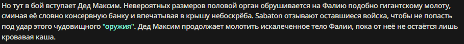 >>1561575 Дед Максим. Воскресший из мертвых старик с огромным(более километра в длину) хуем. Мастерски орудет хуем, используя его как страшное дробящее оружие. Является ветераном гражданской войны. Кроме того он святой. Его считают русским супергероем. У него соответствующие супергеройские силы управления хуем. Хуй отлично изгибает и может уменьшаться по желанию Деда Максима