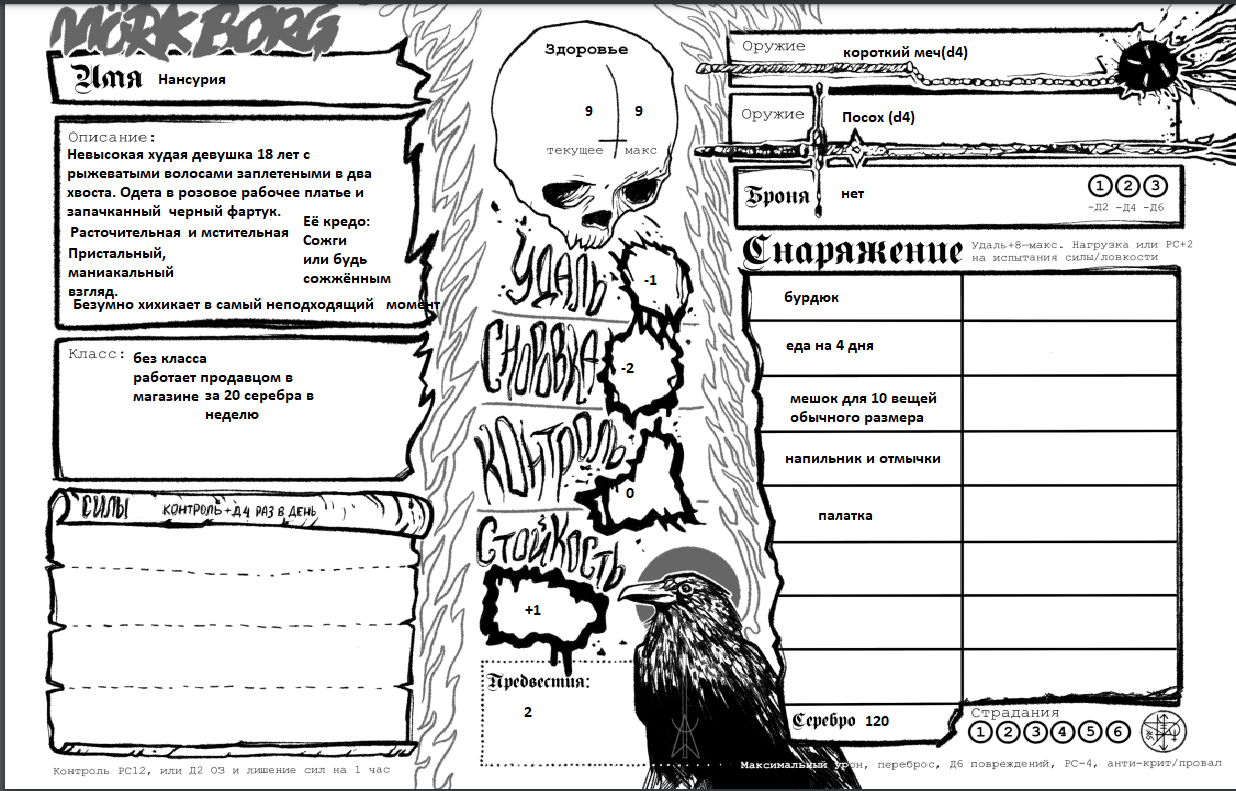Снаряга: Мешок, красный яд, духи, запас еды на 2 дня, бурдюк с водой, крыса (-8с), спальник (-3с), огниво (-4с), вино (2с) Оружие: Короткий меч (d4), Боевой топор (d8) (-35с)