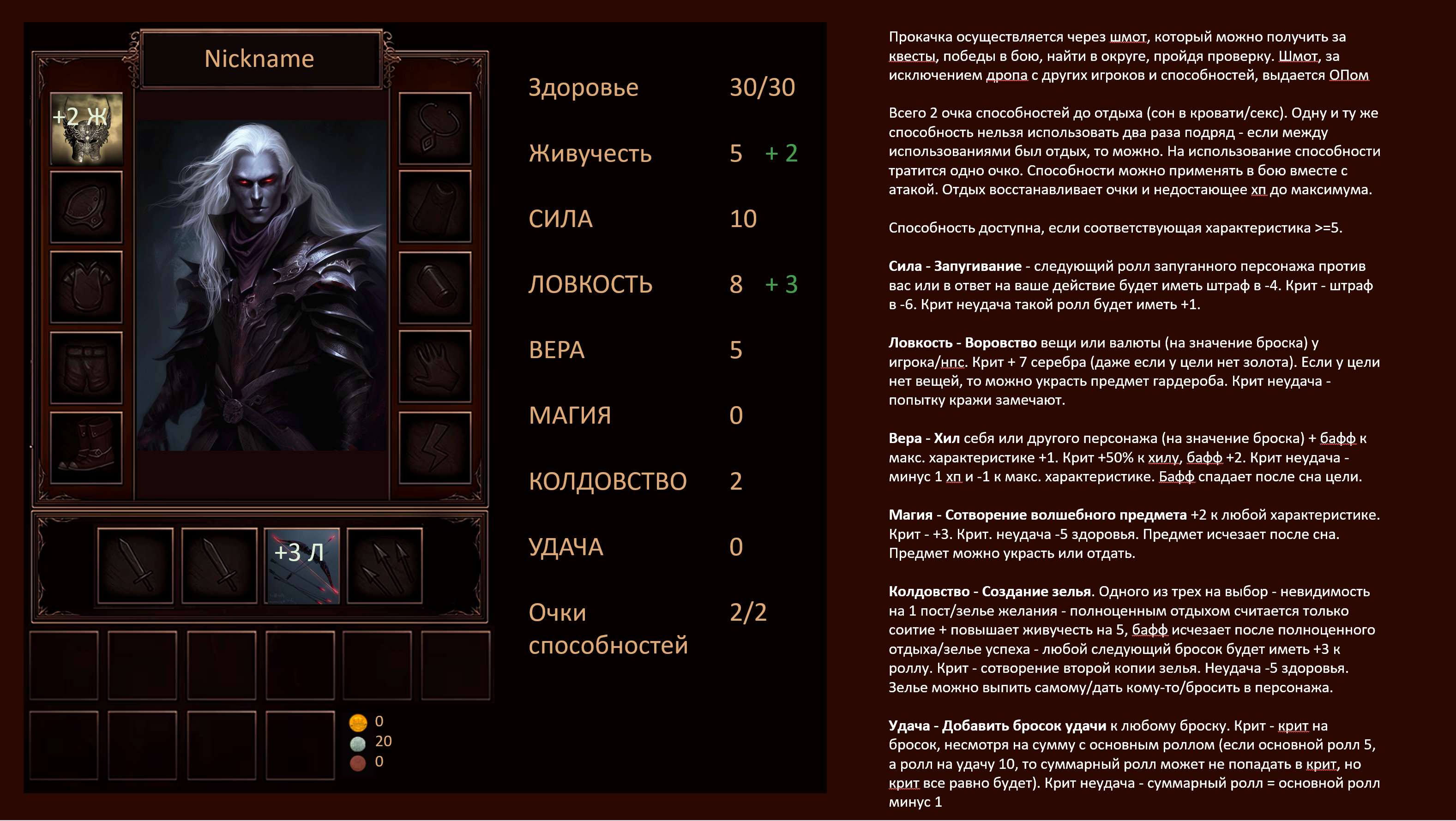 Пока можно ознакомиться с системой характеристик и роллов. Играть можно прикрепляя к посту худ - я его дам, возможно, в формате гугл-презы, чтобы игроки могли сами вбивать себе статы. Можно с укороченным худом - только статы без шмота. Можно совсем без худа - прописав статы в посте или вовсе не раскидывать их и оставить средние по умолчанию.