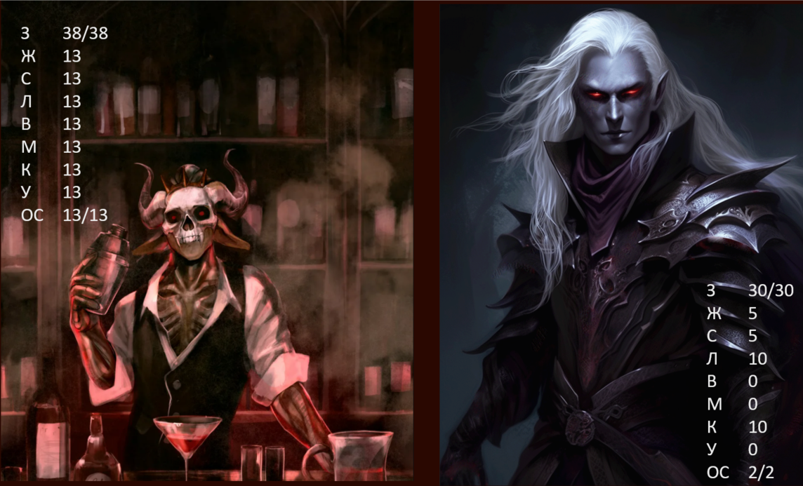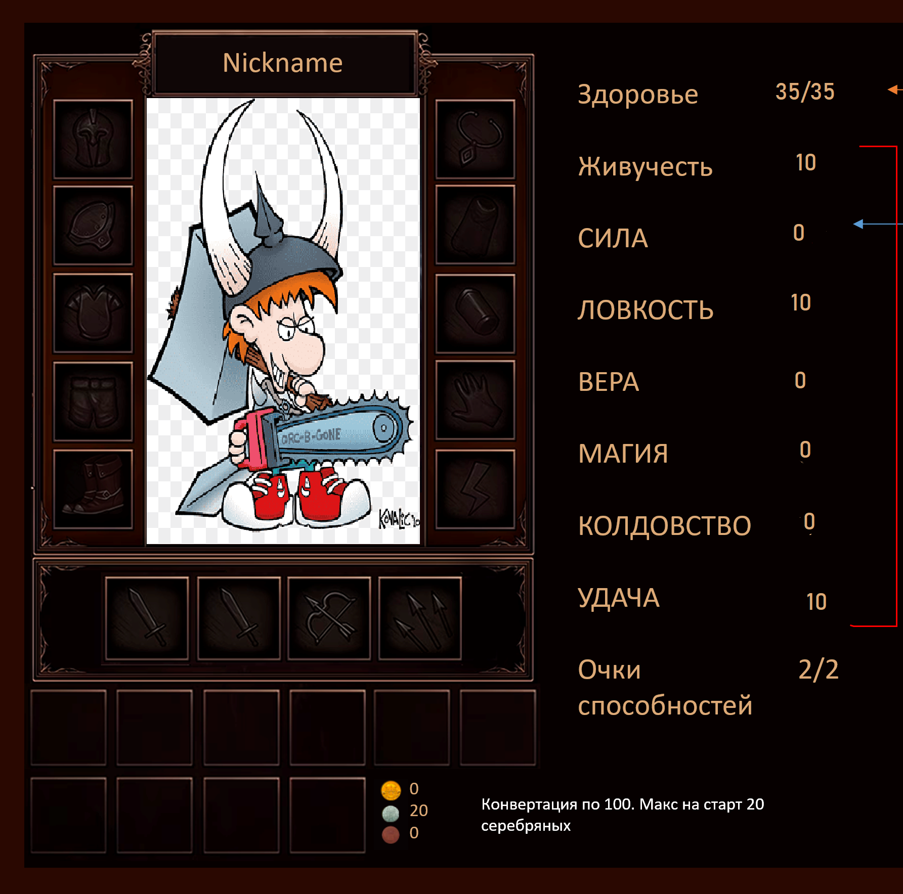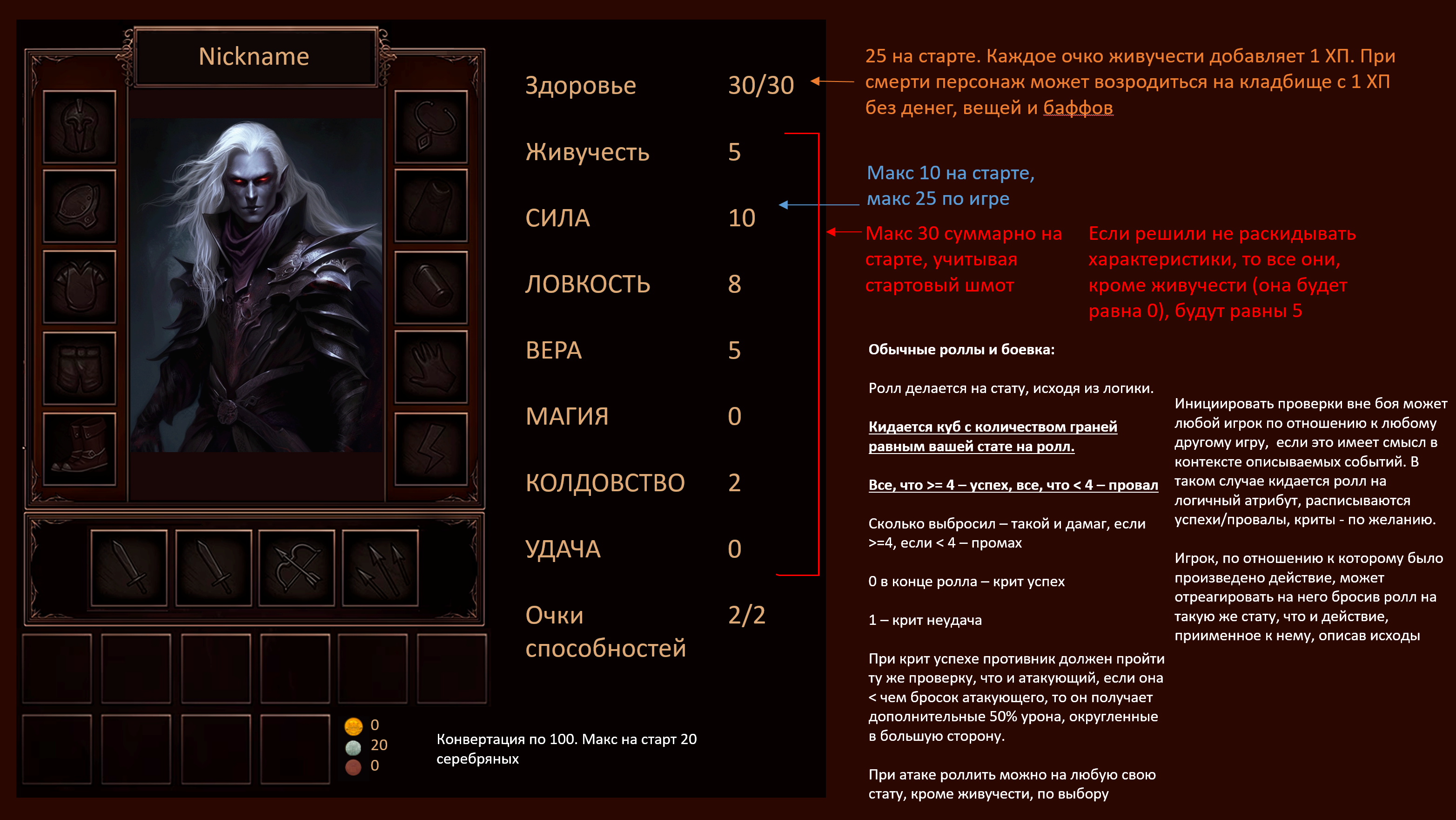 Если вы не хотите ничего распределять, то ваш персонаж начинает с 25 здоровья, и всеми характеристиками (кроме живучести) равными 5, что позволяет успешно роллить с шансом 40% на любую характеристику, использовать любые описанные способности, но не может критовать и наносить высокий урон в бою.