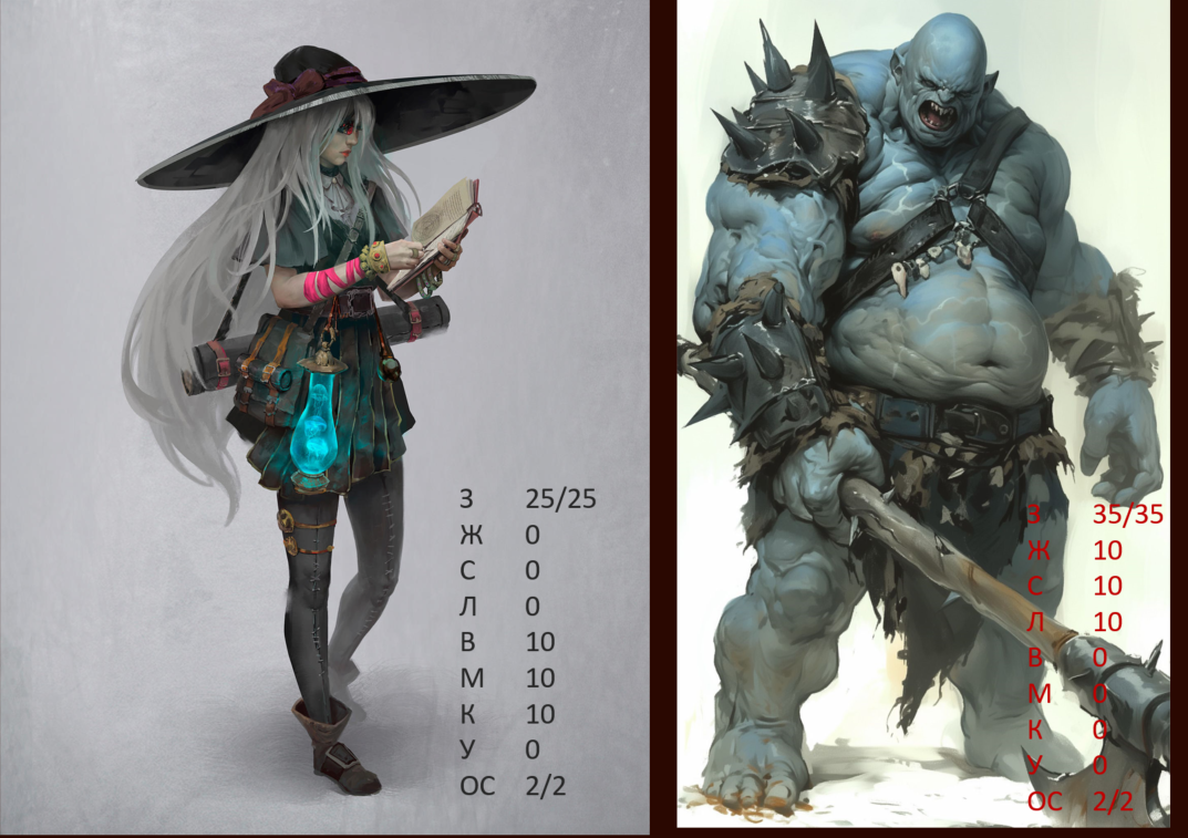 Я отписываюсь скорее для того, чтобы показать свой интерес к игре. Сама идея с количеством граней, соответствующим значению статы, мне кажется довольно любопытной. Но хотелось бы понять, например, чем магия от колдовства отличается. Как будто не хватает характеристики "телосложение", ну или другого стата который отвечает за прокачку хп.
