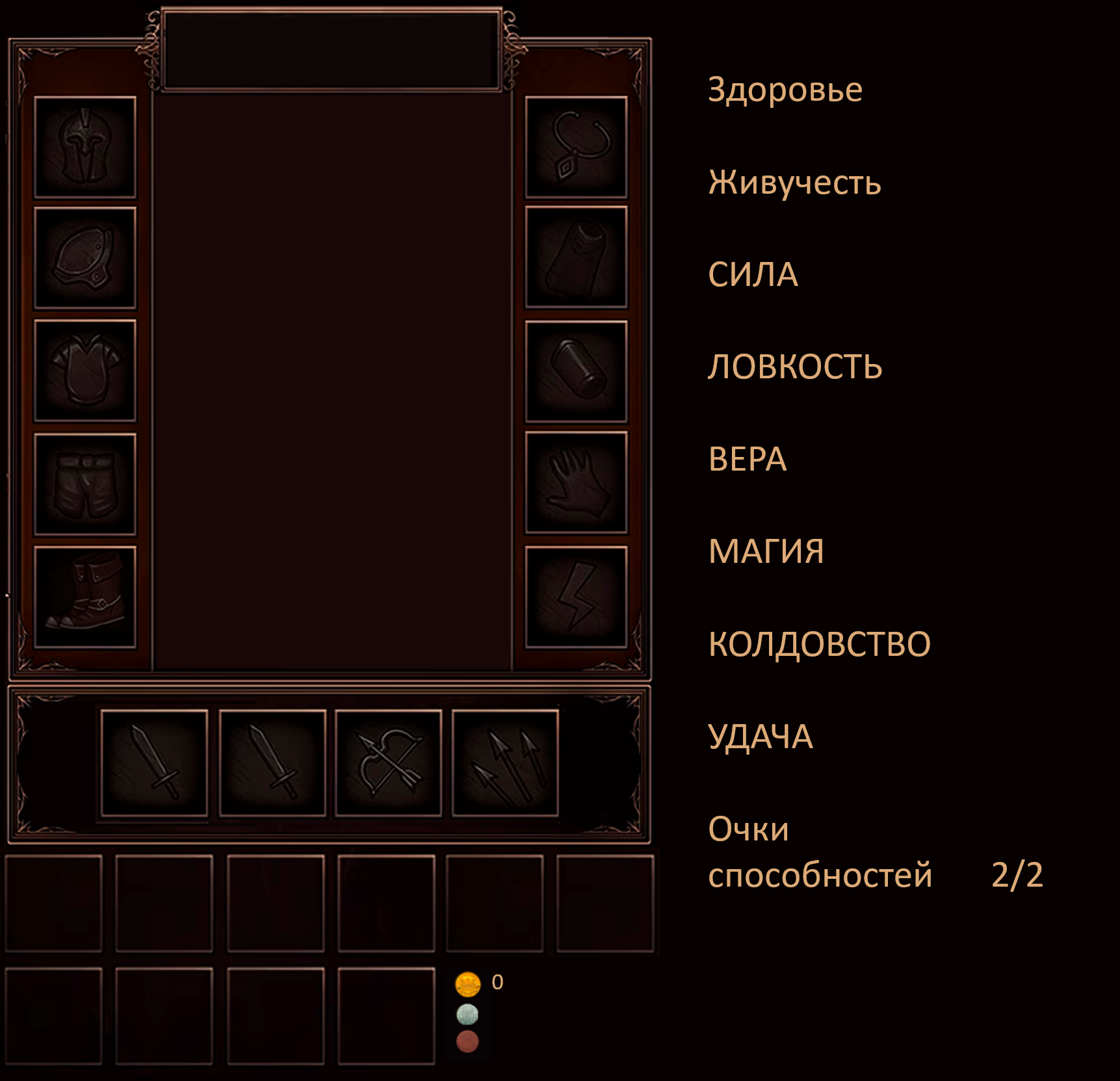 Удача - отвечает за действия, в которых персонажу не на что больше положиться, кроме как на судьбу, например, подброс монетки или выбор верного пути в лабиринте