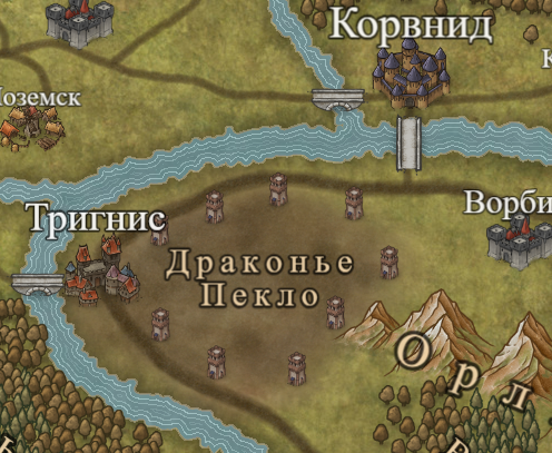 Драконье Пекло Некогда здесь стоял великий город Колсол, столица королевства и сердце альцирантсва. Но теперь в этих местах раскинулась выжженная магией пустошь. Тонкий слой сухой и безжизненной почвы скрывает под собой огромный пласт базальта и обсидиана, в который превратилось всё, что здесь когда-то было. Иногда из той почвы торчат мелкие, не больше пары метров, обсидиановые пики и скалы. Колоссальной силы магия, сотворившая всё это, не исчезла полностью и спустя почти семь веков. Её проявления до сих пор можно встретить в этом месте — блуждающие элементали и духи огня, големы из полурасплавленных камня и стекла, потоки пламени, вырывающиеся из-под земли, ползущие по земле облака удушающего дыма, ручейки и лужи никогда не остывающей лавы и попросту горящая сама по себе земля. Чем ближе к центру пустоши, тем проявлений больше. Всё это делает Драконье Пекло местом крайне неприветливым и весьма опасным. Однако помимо опасностей, магия породила ценные виды обсидиана, камней и кристаллов. Шахтёры-смельчаки нередко идут на риск, поглубже в Пекло, пытаясь отыскать и добыть эти ценные ископаемые. Шахтёры же поосторожнее ограничиваются добычей обсидиана на окраинах пустоши, который пусть и не настолько, но всё же ценнее обычного обсидиана из других мест. На окраинах располагаются и базальтовые каменоломни. Также ходят слухи, что здесь можно отыскать и сокровища в виде оплавленных кусков и глыб золота и серебра, и артефакты в виде различных вещей, чудом уцелевших и впитавших магию. Но главной легендой является таковая о Золотом Котле — большом пруде где-то в центре пустоши. Пруд тот наполнен смесью из бурлящей лавы и кипящего золота. Если бросить туда золотую монету и сказать "голова, дай мне...", то из пруда вынырнет голова дракона и исполнит любое желание. Правда это или вымысел — достоверно неизвестно. Со времён второй войны с Нок, Драконье Пекло окружено сторожевыми башнями, служащими в основном для того, чтобы не пускать в пустошь кого попало, и чтобы ценные ископаемые не оказывались в чьих попало руках. Связано это с тем, что во время второй войны выяснилось, что ноковцы используют добытые из пустоши материалы для изготовления мощного магического оружия. Тайна его создания до сих пор остаётся неразгаданной, и единственное, что смогла сделать Диосолия — это ограничить доступ Нок к добыче и покупке этих материалов. Таким образом, в Пекло не пускают тех, у кого нет разрешения из Тригниса, а без разрешения из Корвнида запрещено выносить из пустоши определённые материалы. Однако авантюристов и искателей наживы это не всегда останавливает, и они порой умудряются добыть что-либо и ускользнуть от когтей закона.