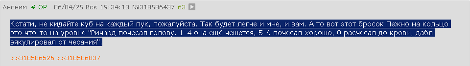 >Как роллить? В /b/ роллинг посредством ID поста по системе ЧН0Д, в /brg/ - с помощью кубов. (Пишите ##XdY## где вместо X - кол-во костей, вместо Y - кол-во граней) Паритет держат две ролл-системы - d10 и ЧДН0.
