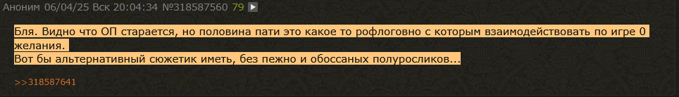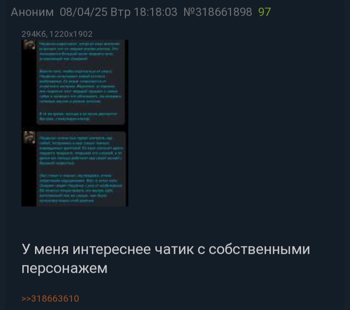 Ирфантилизм, да? Я вам расскажу, что такое инфантилизм. Инфантилизм это когда поц генерит ублюдскую аниме аватарку, генерит текст через чатгпт, залетает с этим говном в тред и потирая ручки ждёт, как на него посыпятся овации и все резко захотят с ним играть. А когда вдруг оказывается, что он тут такой нахуй никому не нужен, то у поца адски сгорает жопа, что он ажно начинает срать в треды и жирно траллировать в попытках выместить свою обидку и подзашить треснувший манямирок. Вот это инфантилизм. А когда человек сидит и несколько часов подряд думает над образом и ищет приличную подходящую аватарку, потом ещё час выбирает или придумывает имя, потом ещё полчаса пишет вкатный пост, потом наконец-то играет и уже начинает входить во вкус... и потом вдруг случается ноль ноль кладбище пидор. Всё будущее персонажа и планы на него перечёркнуты, все нафантазированные сцены, которые хотелось бы отыграть, летят в мусорку. Всё кончено. Но человек не плачет. Человек не начинает трясущимися ручками набирать номер какого-то невнятного модера, чтобы тот подкрутил номера на постах. Человек принимает судьбу и говорит своему персонажу "спи спокойно". И говоря это персонажу, человек говорит это и самому себе. В этот день человек тоже умирает. Но человек идёт дальше, несмотря ни на что. Это жизнь, сынок. И мы умерли больше раз, чем написано в гарантии. Мы не подлежим ни ремонту, ни замене.