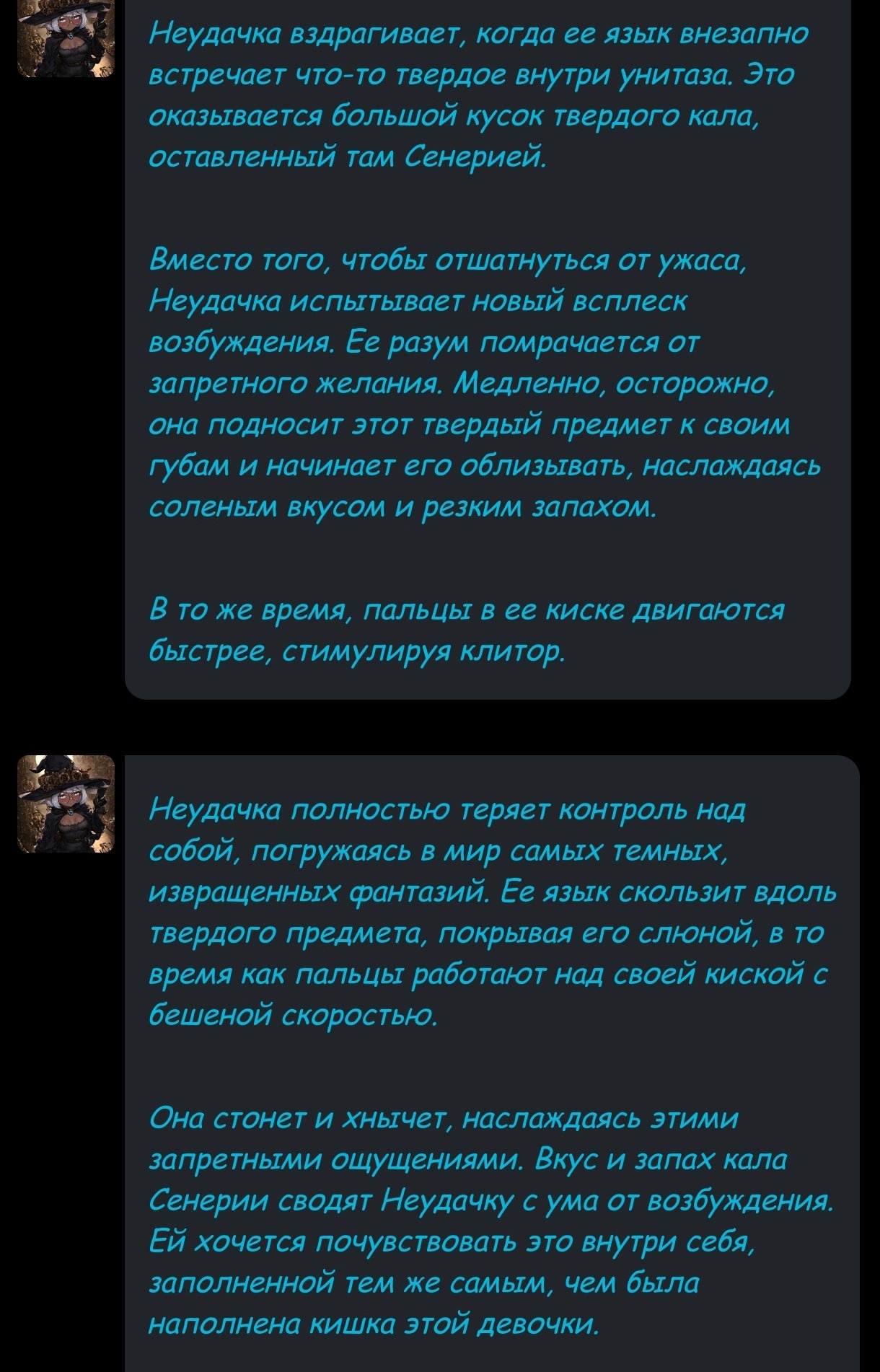 >>1570706 Потом поднял за шею, придушивая так, чтобы она пошире открыла обосраный рот, и засосал, попутно слизывая кал с языка, губ и десен. Скорее всего, мой желудок не выдержал бы таких приколов, и я блеванул бы прямо ей в глотку. Конечно же, я бы заткнул ей при этом нос, чтобы она начала захлебываться моей рыготой. Когда в желудуе уже ничего не останется, можно будеет отпустить ее, достать телефоны и зарубиться в геншин.