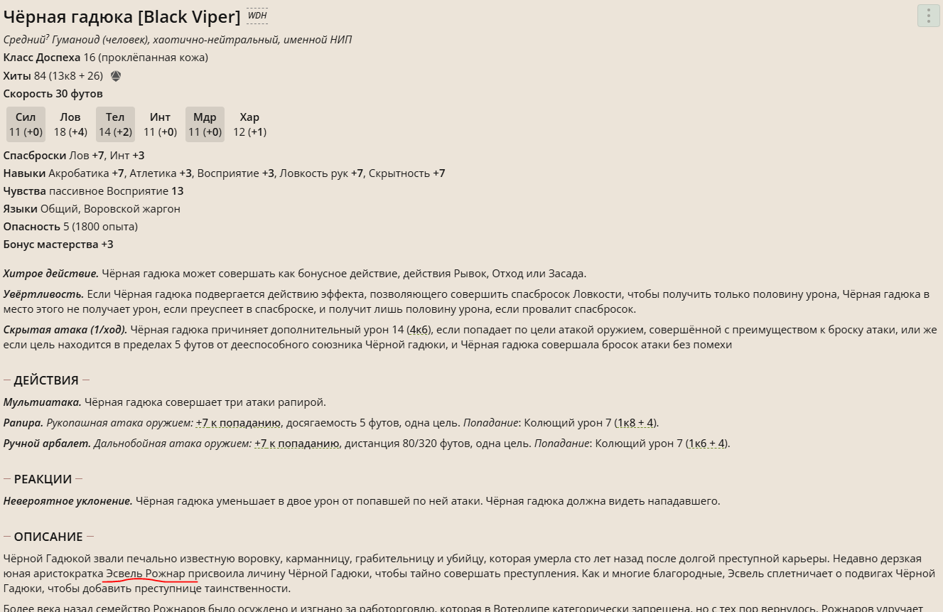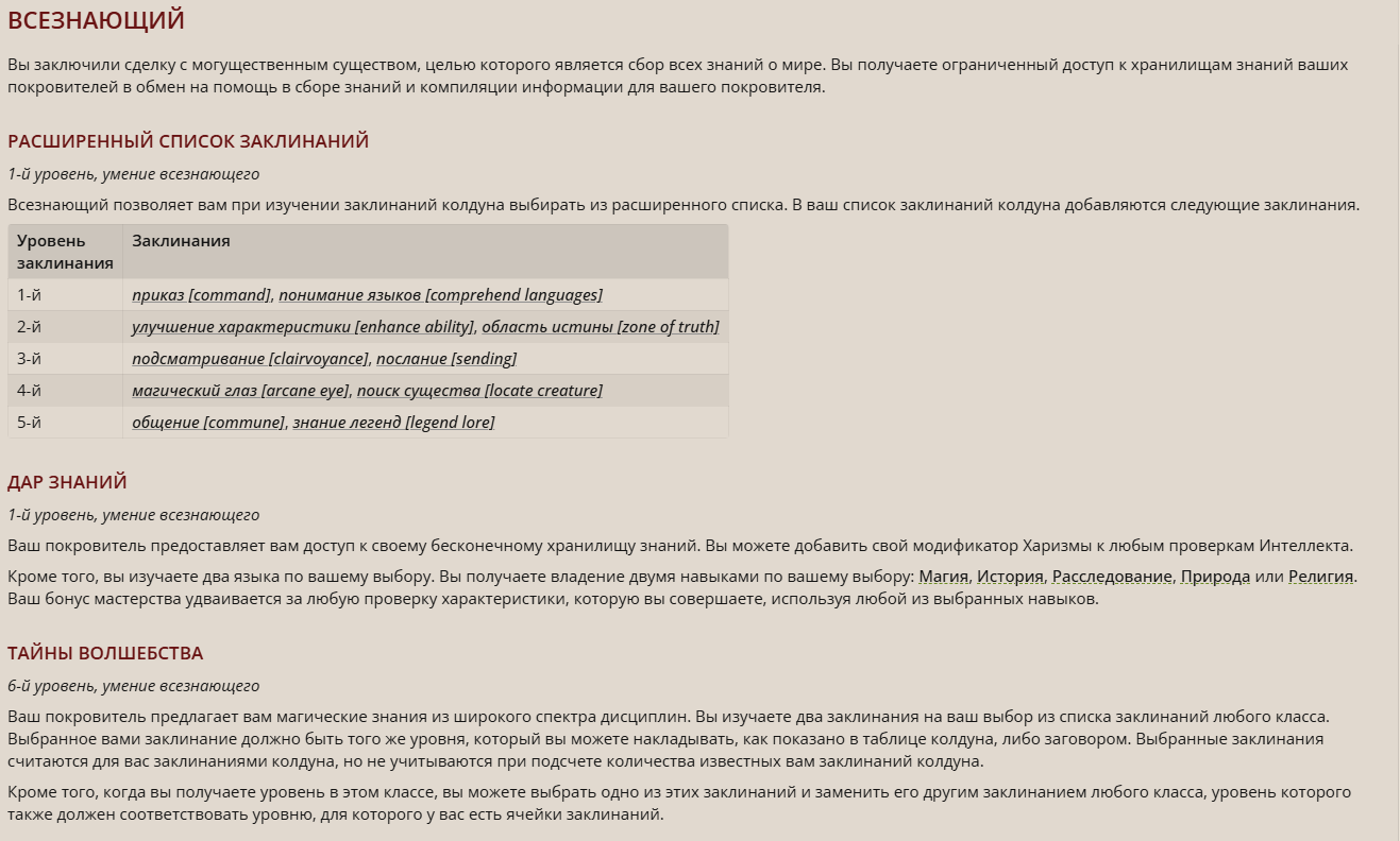 >>1569236 >Черта происхождения "Одаренный", 3 навыка или инструмента на выбор (я так понимаю со списком вы знакомы, История, Убеждение даются от происхождения, т.е. их выбирать повторно нельзя). Я думала за навыками мы следить не будем. Окк, вкачаю. Стандартную: УМЕНИЕ: ПРИВИЛЕГИРОВАННОСТЬ Благодаря знатному происхождению, другие хорошо к вам относятся. Вас принимают в высшем обществе, и считается, что у вас есть право посещать любые места. Обыватели изо всех сил стараются сделать вам приятно и избежать вашего гнева, а другие высокородные считают вас своей ровней. Если нужно, вы можете получить аудиенцию местного дворянина. Нельзя?