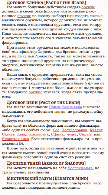 По умолчанию даю Пакт клинка и стандартные заклинания.