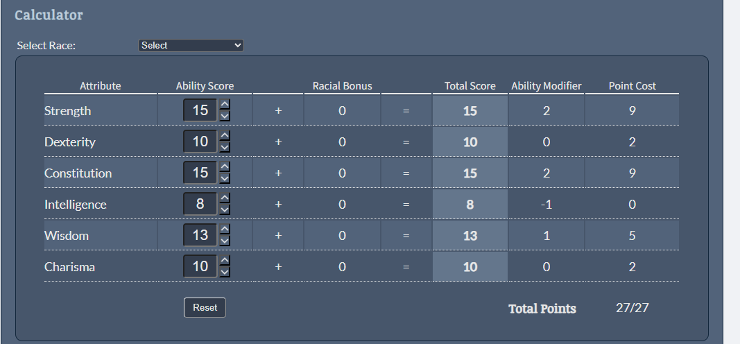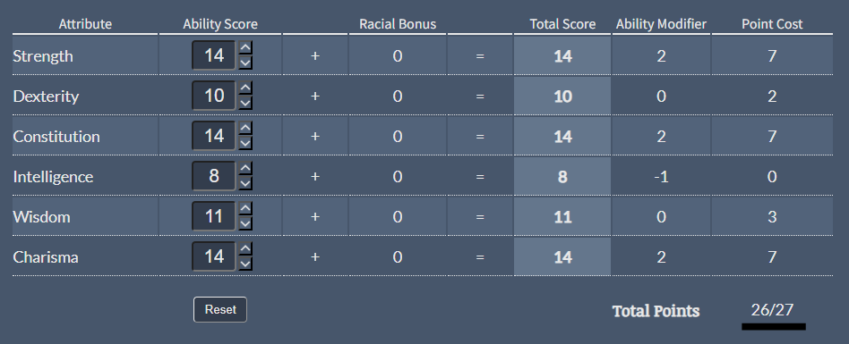 4) Очки способностей: Проклятые статы, нужно взять 15, 14, 13, 12, 10, 8 и подставить их в любом порядке к каждому из статов (для колдуна самый важный это Харизма). Либо если прям очень-очень хочется, то можешь воспользоваться поинтбаем, но тогда открой https://chicken-dinner.com/5e/5e-point-buy.html и следи, чтобы внизу число "купленных" статов не превышало 27/27.