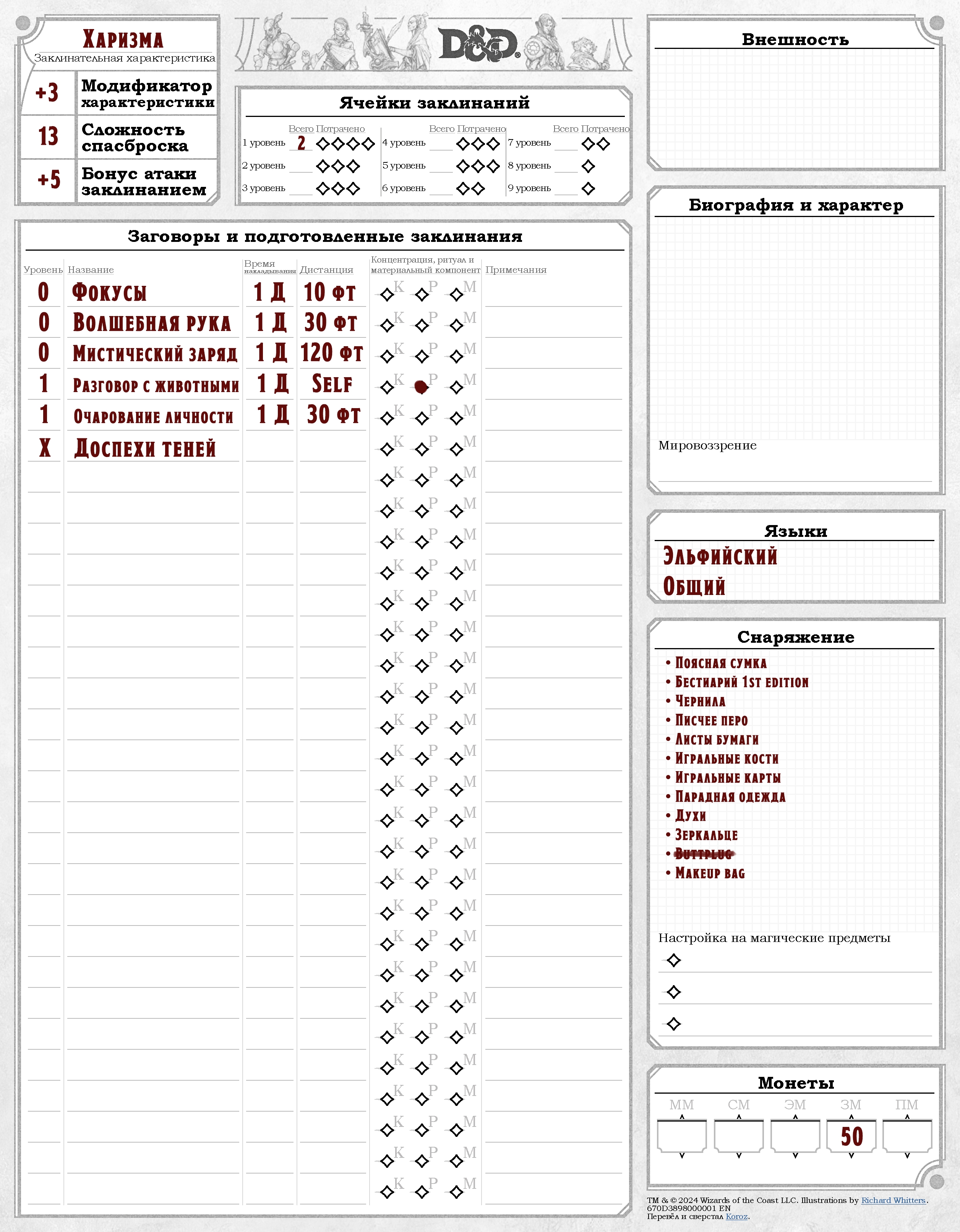 Человек-Бард ур. 11 ранения ●● Сил 11 Лвк 19 Тел 15 Инт 17 Мдр 16 Хар 22* временные щиты ●●● Легендарная защита (+10 против первых трех заклинания контроля в день)